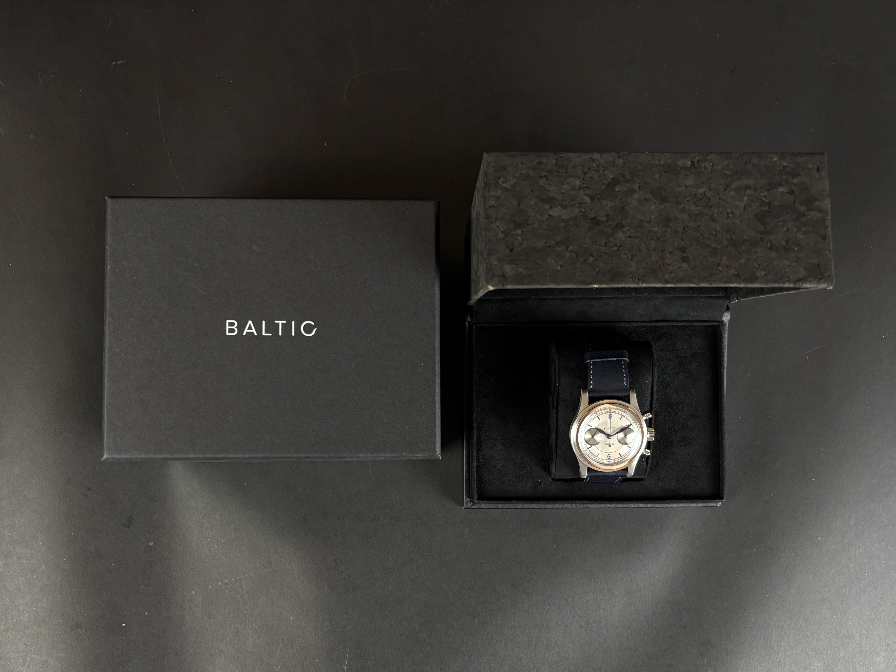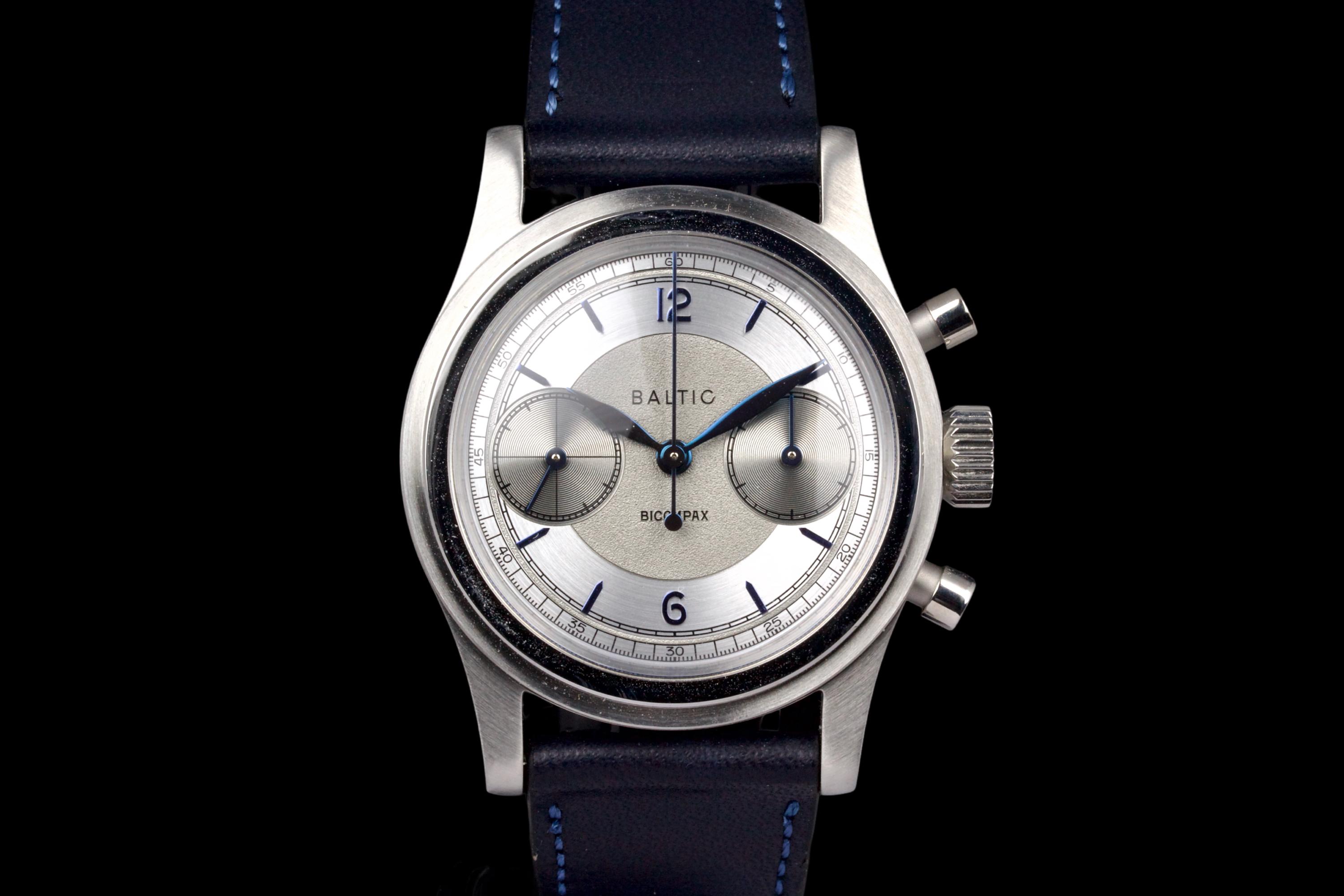 A beautiful example of the Baltic Bicompax 003 “Silver Blue,” presented in like-new condition. Featuring a 36.5 mm stainless steel case, this hand-wound chronograph combines a brushed silver dial with blue subdials and accents, offering a refined vintage-inspired look. Powered by the reliable Seagull ST1901 movement and fitted on a leather strap, it delivers both charm and precision. A stylish and elegant modern chronograph that perfectly blends 1940s aesthetics with contemporary craftsmanship.