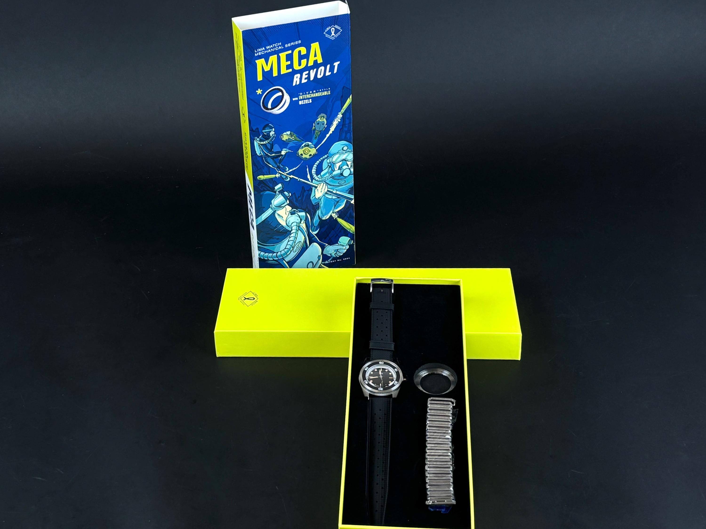 A playful collaboration piece paying tribute to Marlon Brando’s legendary GMT 1675 “U No Brando.” This special edition is presented in like-new condition, showing virtually no signs of wear. Housed in a 38 mm 316L stainless steel case (45.6 mm lug-to-lug, 11 mm thick / 12.8 mm including crystal), the watch is fitted with two interchangeable fixed bezels, a double-domed sapphire crystal, and a screw-down crown ensuring 200 m water resistance. The dial features Japanese luminova and the signature Seconde/Seconde/ modified seconds hand, giving a rebellious twist to the piece’s tool-watch character. Powered by the automatic Miyota 82S0 with hacking seconds, known for its reliability and ease of maintenance. Delivered with both the quick-release tropic-style rubber strap and quick-release Bonklip bracelet for versatile wear. Complete with its original box, warranty card, and accessories. A rare and highly collectible collaboration piece, combining independent watchmaking, playful design, and impressive technical specs in a compact 38 mm format.