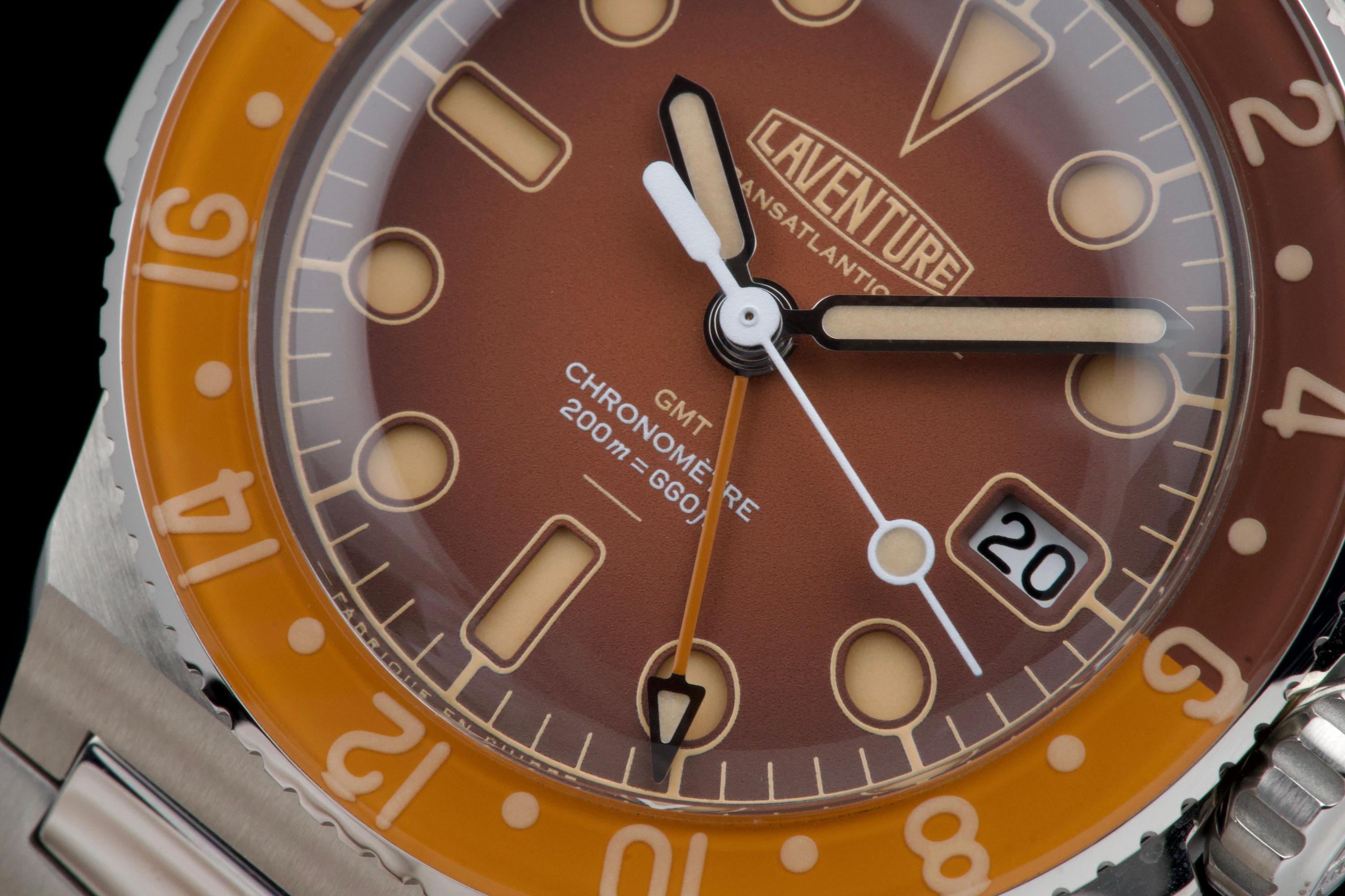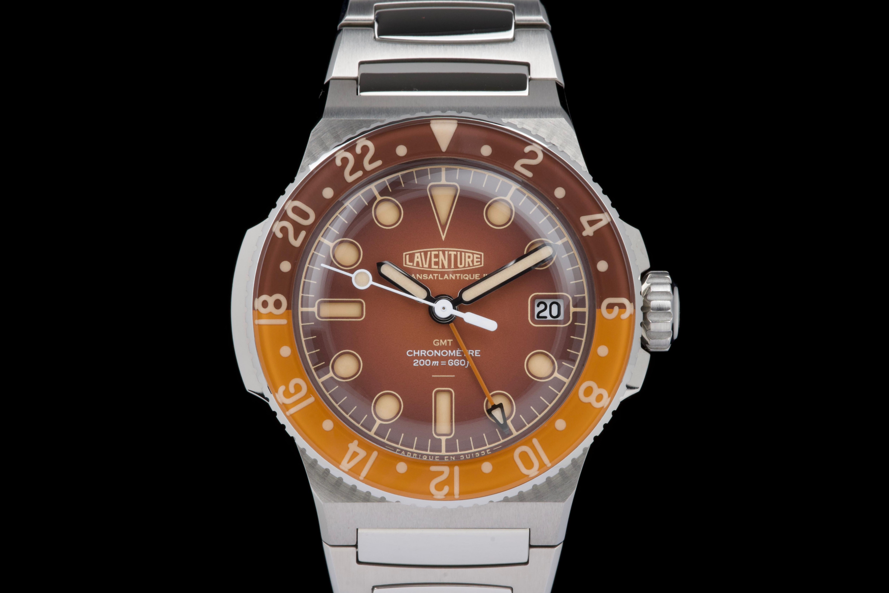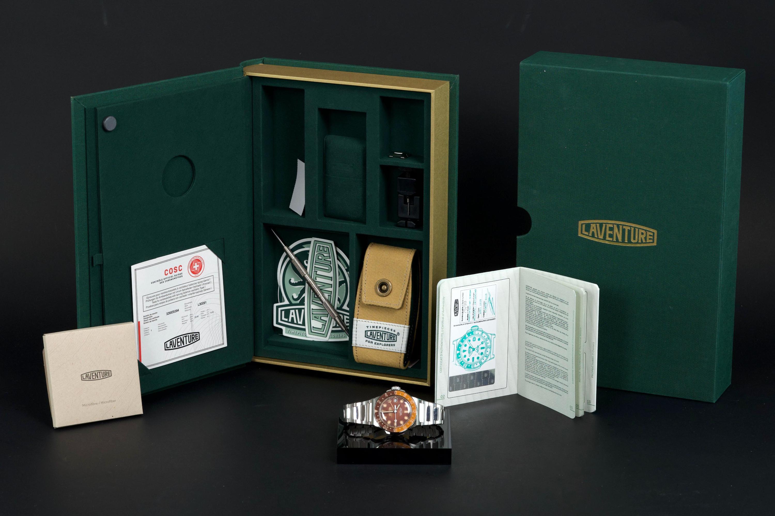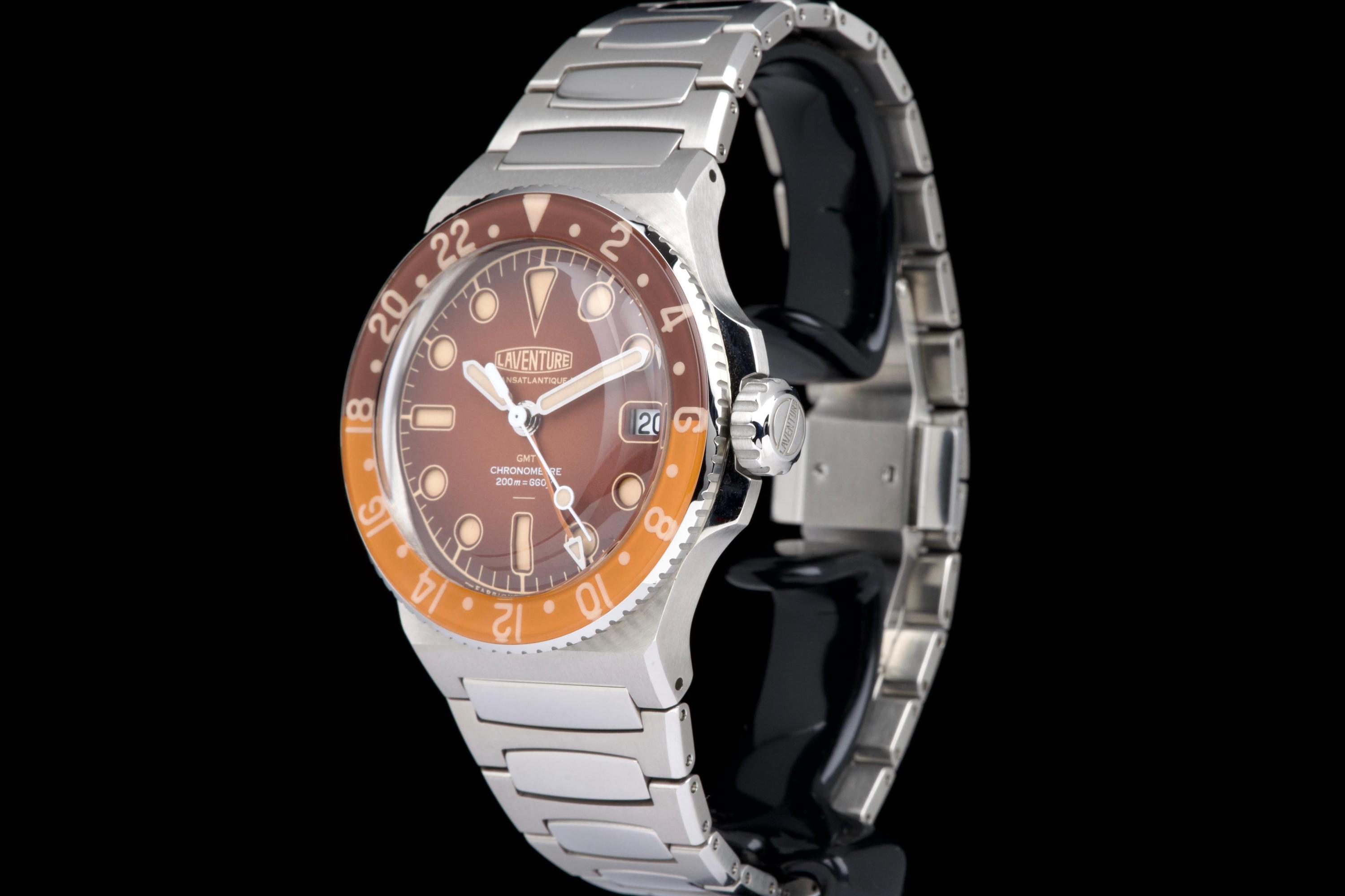 The present Laventure Transatlantique II GMT in brown, dating to 2024, is offered here as a complete full set and is preserved in near-new condition. Measuring 39.80 mm in diameter, the watch combines compact, well-balanced proportions with a distinctly utilitarian and adventurous aesthetic, true to Laventure’s design philosophy. The stainless-steel case presents flawlessly, showing no visible signs of wear. The brown dial configuration adds warmth and depth, reinforcing the model’s vintage-inspired character while remaining highly legible. The watch is fitted with a plexiglass crystal, chosen deliberately to evoke the spirit of mid-century tool watches and to enhance the overall visual softness and charm of the piece. Powering the watch is an automatic Sellita movement, offering reliable GMT functionality for tracking a second time zone, making the Transatlantique II both practical and travel-ready. The watch is delivered as a full set from 2024 and remains in essentially new condition. Modern, thoughtfully designed, and increasingly sought after, this Laventure Transatlantique II GMT represents an excellent opportunity to acquire a contemporary independent watch in outstanding, collector-grade condition.