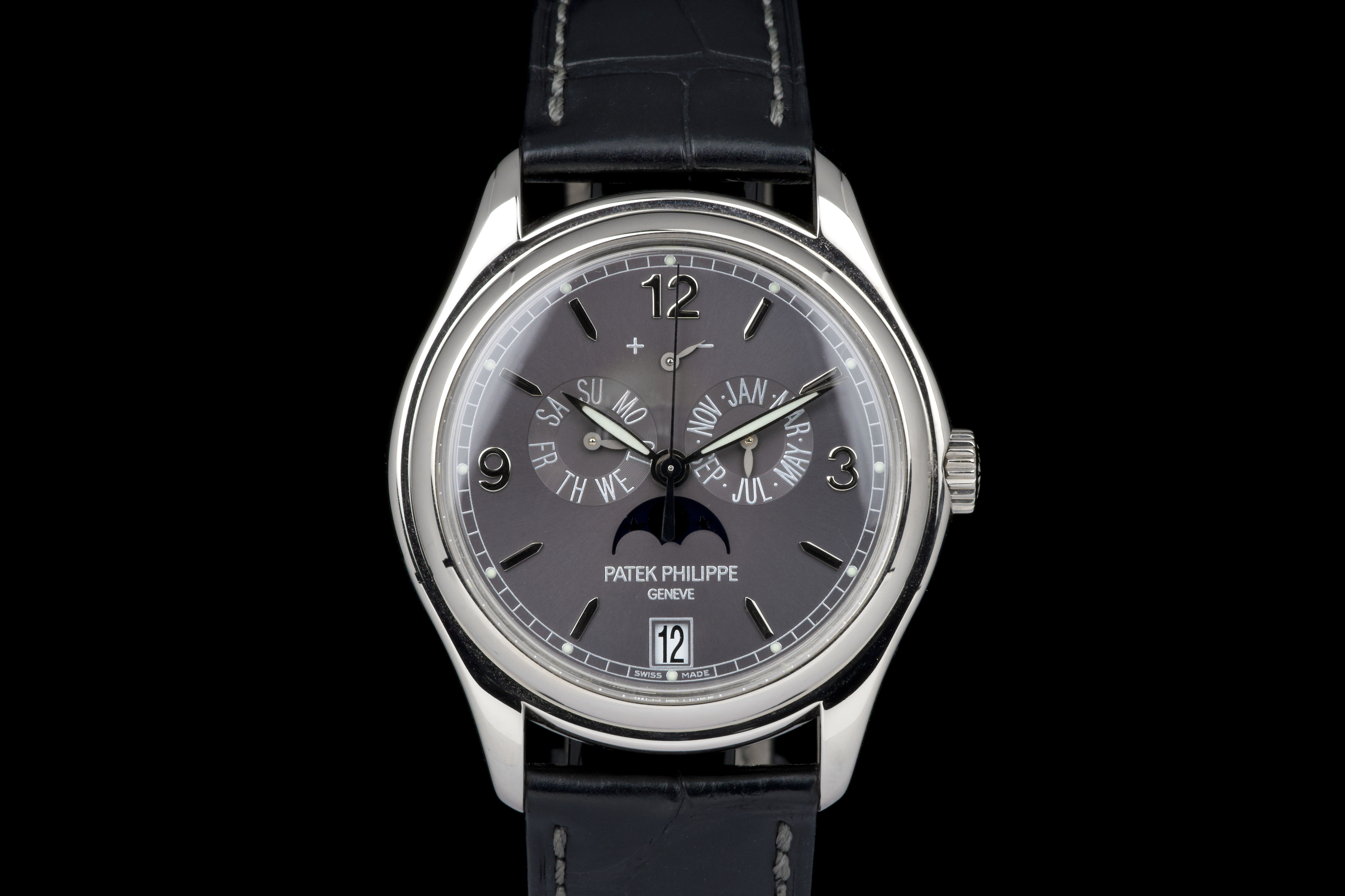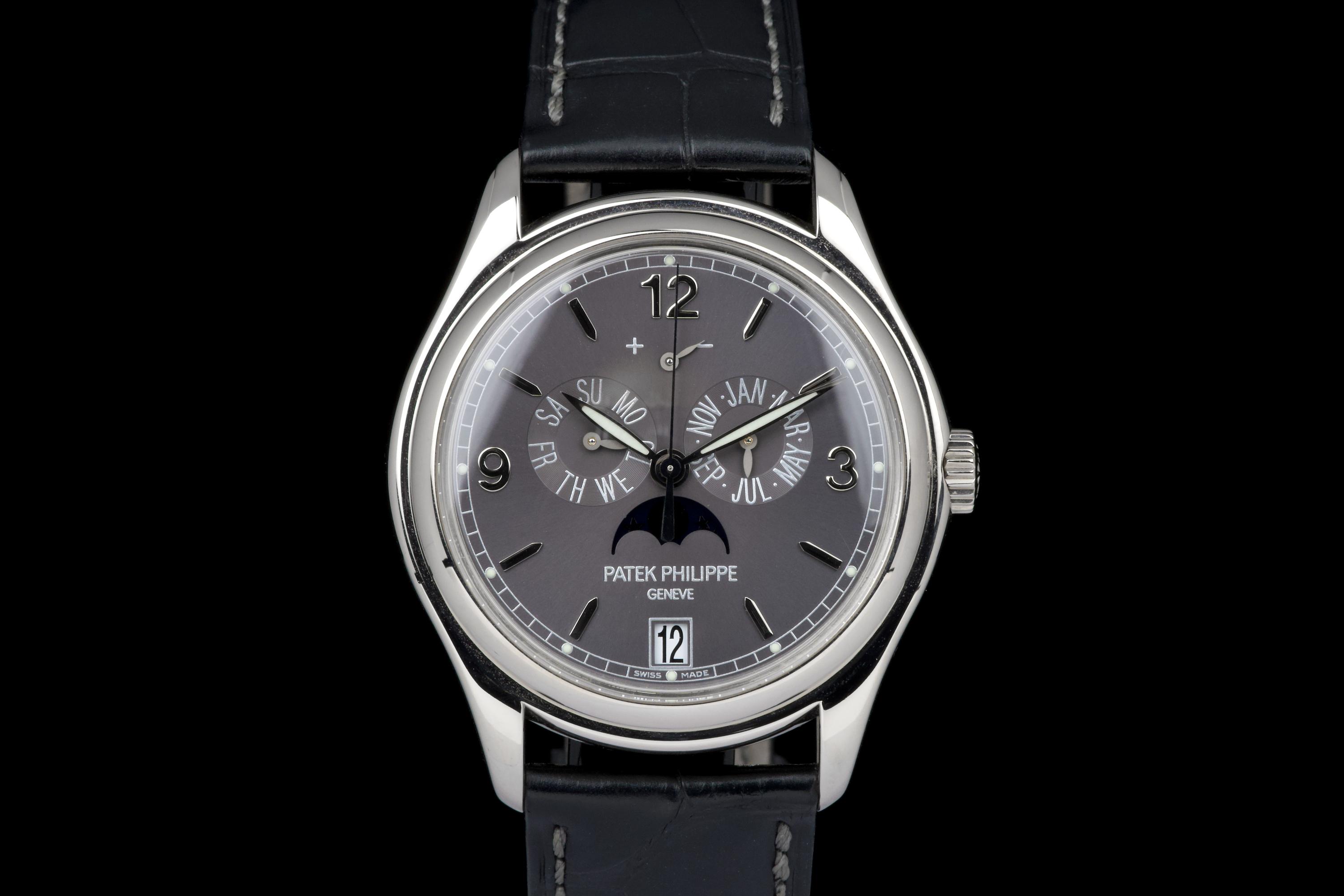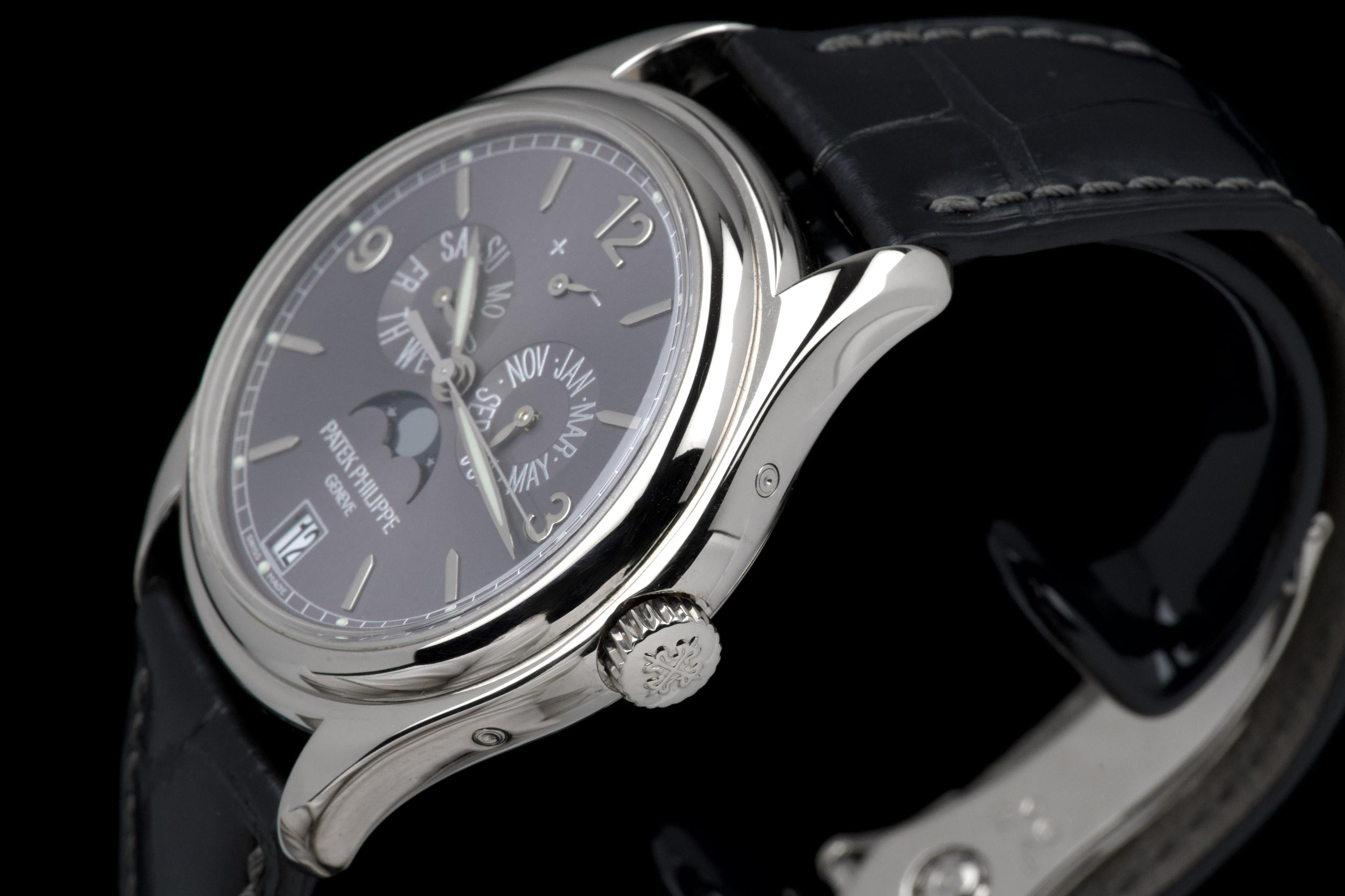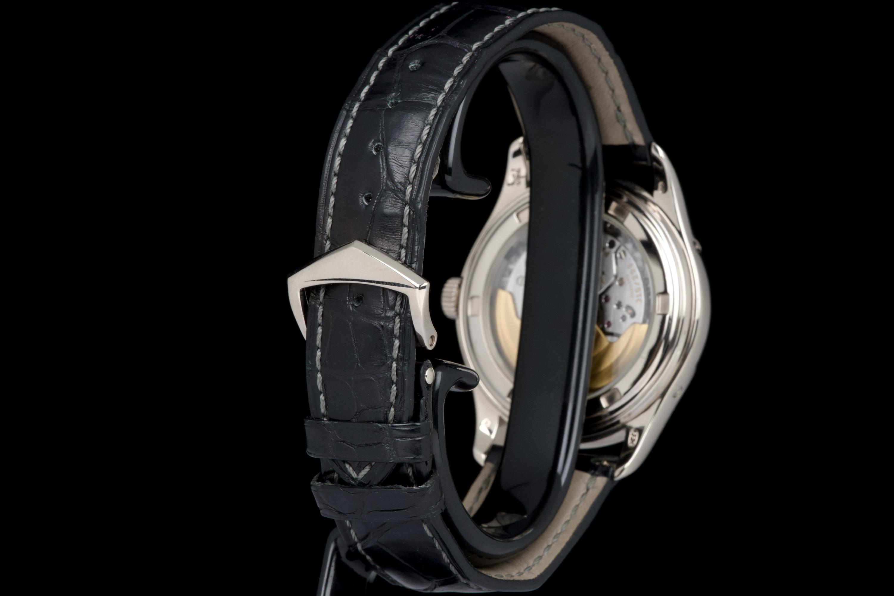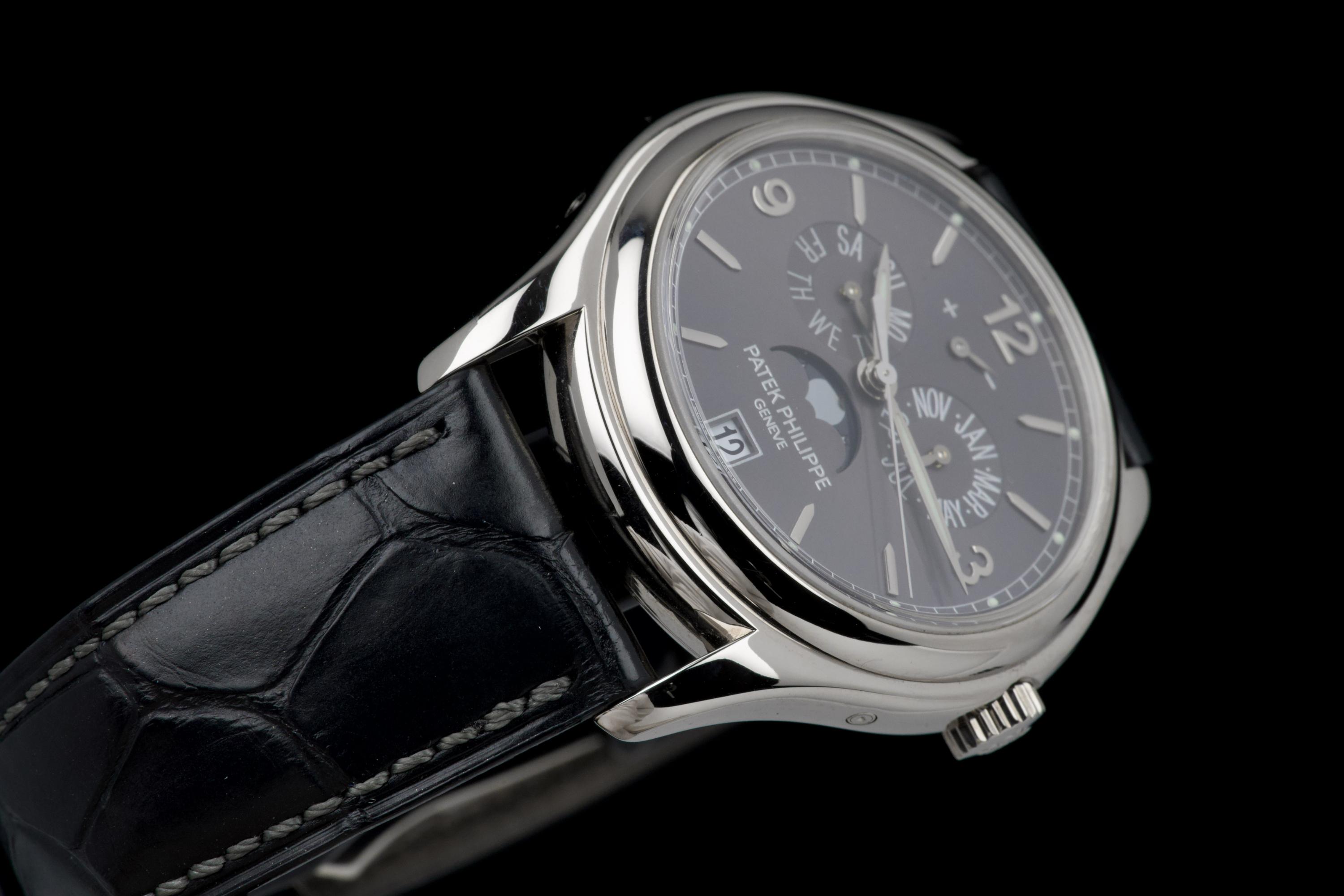The present Patek Philippe Annual Calendar reference 5146/1G-010, dating to 2006, is an elegant and technically refined example of the manufacture’s modern calendar watches, offered with its original papers. Originally sold new in Arizona in 2006, this watch represents a desirable early execution of the reference in white gold. The 39 mm white-gold case has been polished in the past and shows light wear consistent with careful use, while retaining balanced proportions and an elegant overall presence. The watch was originally delivered on a white-gold bracelet; it is now fitted with a black Patek Philippe crocodile leather strap, paired with a period-correct white-gold deployant clasp, offering a more understated and versatile aesthetic while remaining coherent with the reference. The dial displays the signature layout of the 5146, combining day and month apertures, a moon-phase with date, and a power-reserve indicator, all arranged in a harmonious and highly legible composition. Powering the watch is the automatic Patek Philippe calibre 315 S IRM QA LU, a refined movement specifically developed for this reference. It features an annual calendar complication requiring correction only once per year at the end of February, as well as a power-reserve indication, combining everyday practicality with traditional Patek Philippe finishing standards. While no service history accompanies the watch, it is running well at the time of cataloguing.