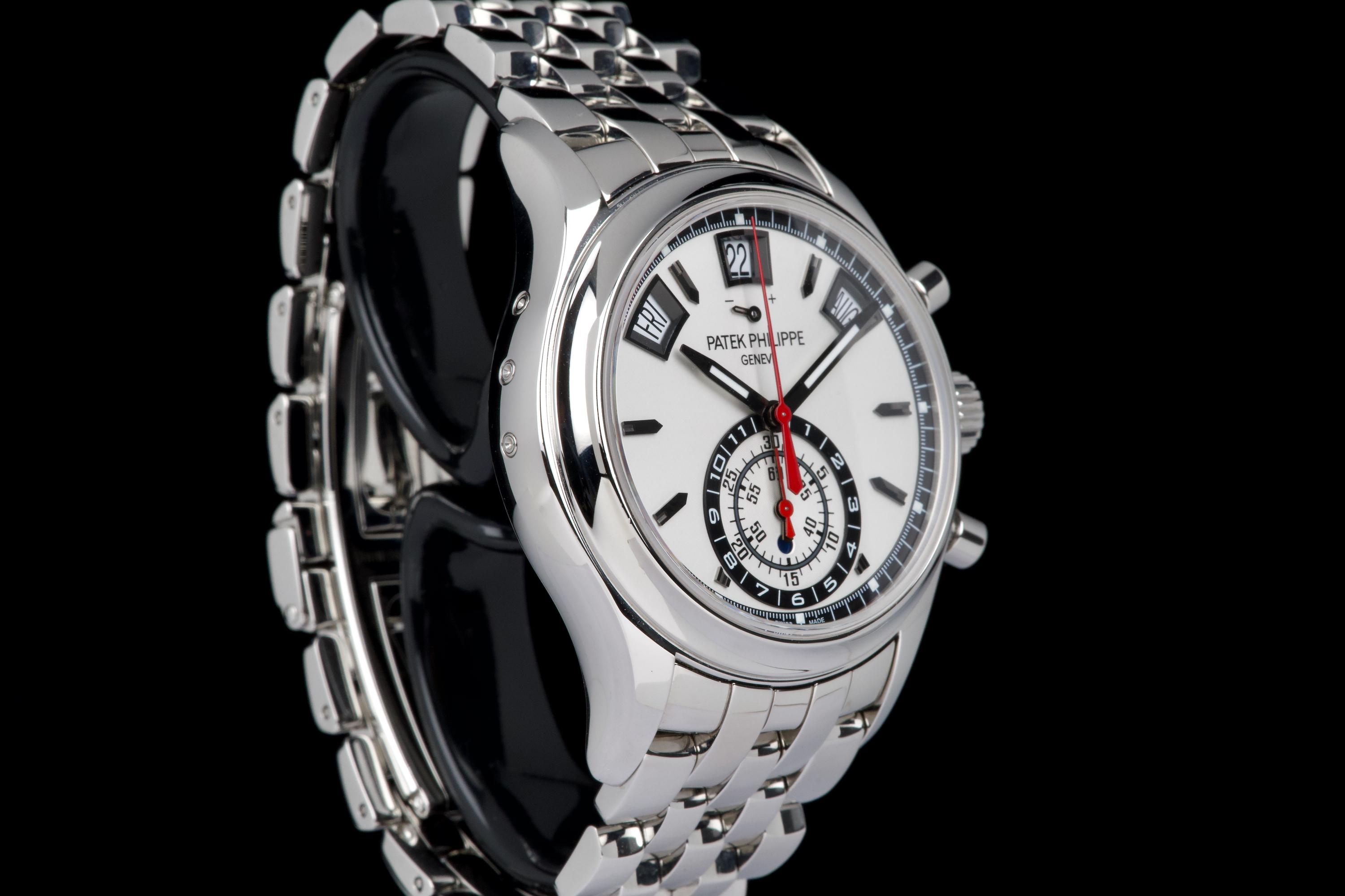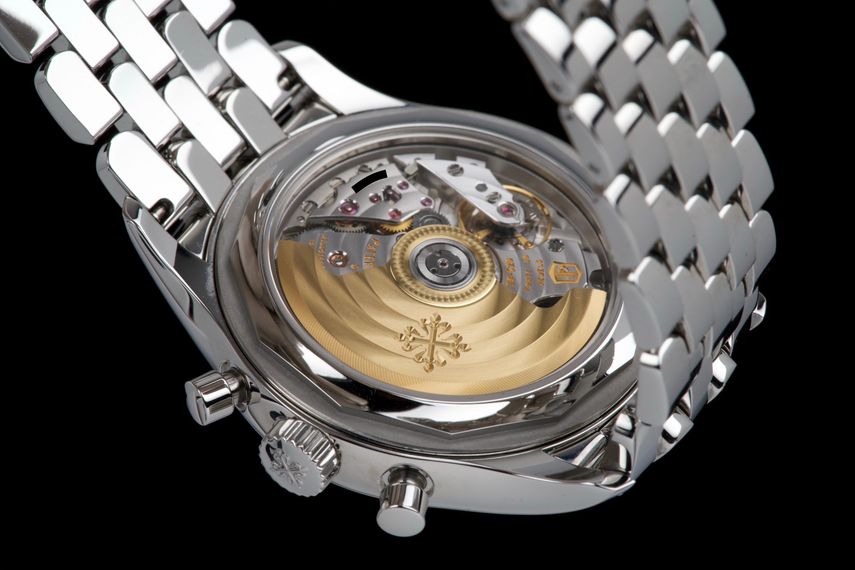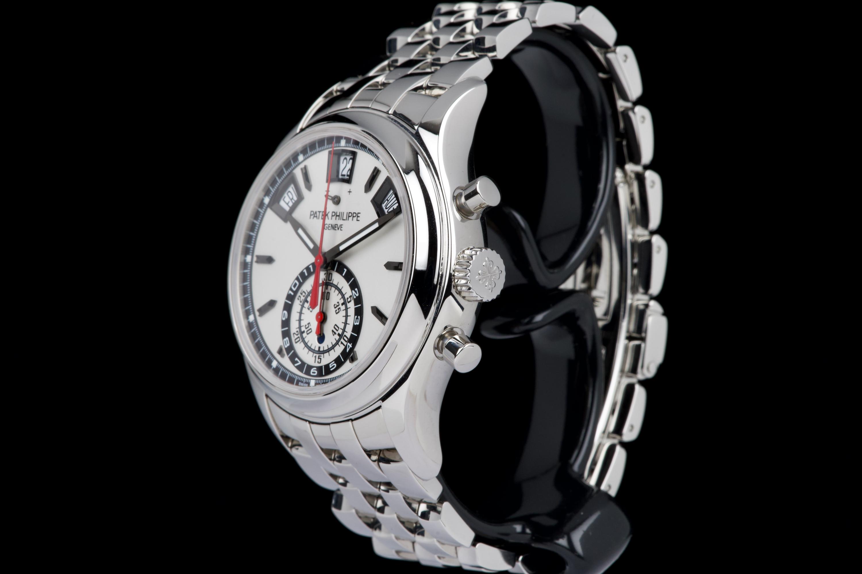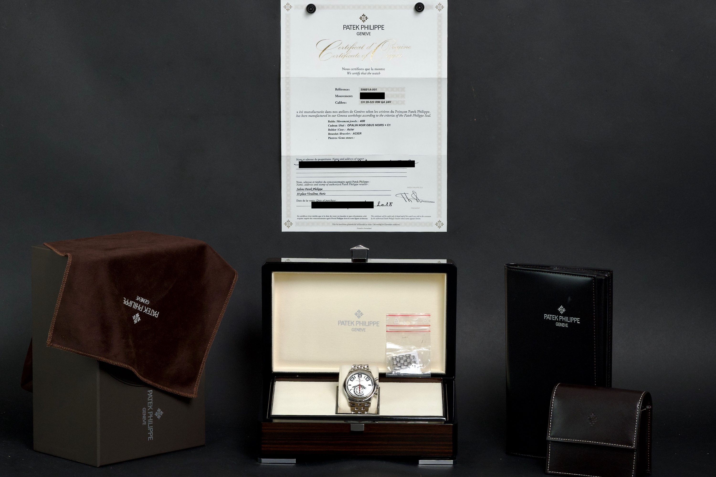 A highly attractive example of the stainless steel 5960/1A, coming from its first and only owner. The case appears unpolished and shows only minimal wear, with a couple of very small marks on the bezel between 8 and 9 o’clock. All bracelet links are present. The watch features the elegant white “opaline” dial with applied hour markers, annual calendar apertures at 10, 12 and 2 o’clock, and chronograph functions displayed via the monocounter at 6 o’clock. Powered by the automatic caliber CH 28-520 IRM QA 24H, combining chronograph, annual calendar, day/night indication and power reserve. There is no service history, but the movement has been checked and is running in perfect working condition. Complete with its original box, certificate of origin and accessories. A superb one-owner example of the discontinued steel 5960/1A — a complication watch that combines rarity, functionality and collectability.