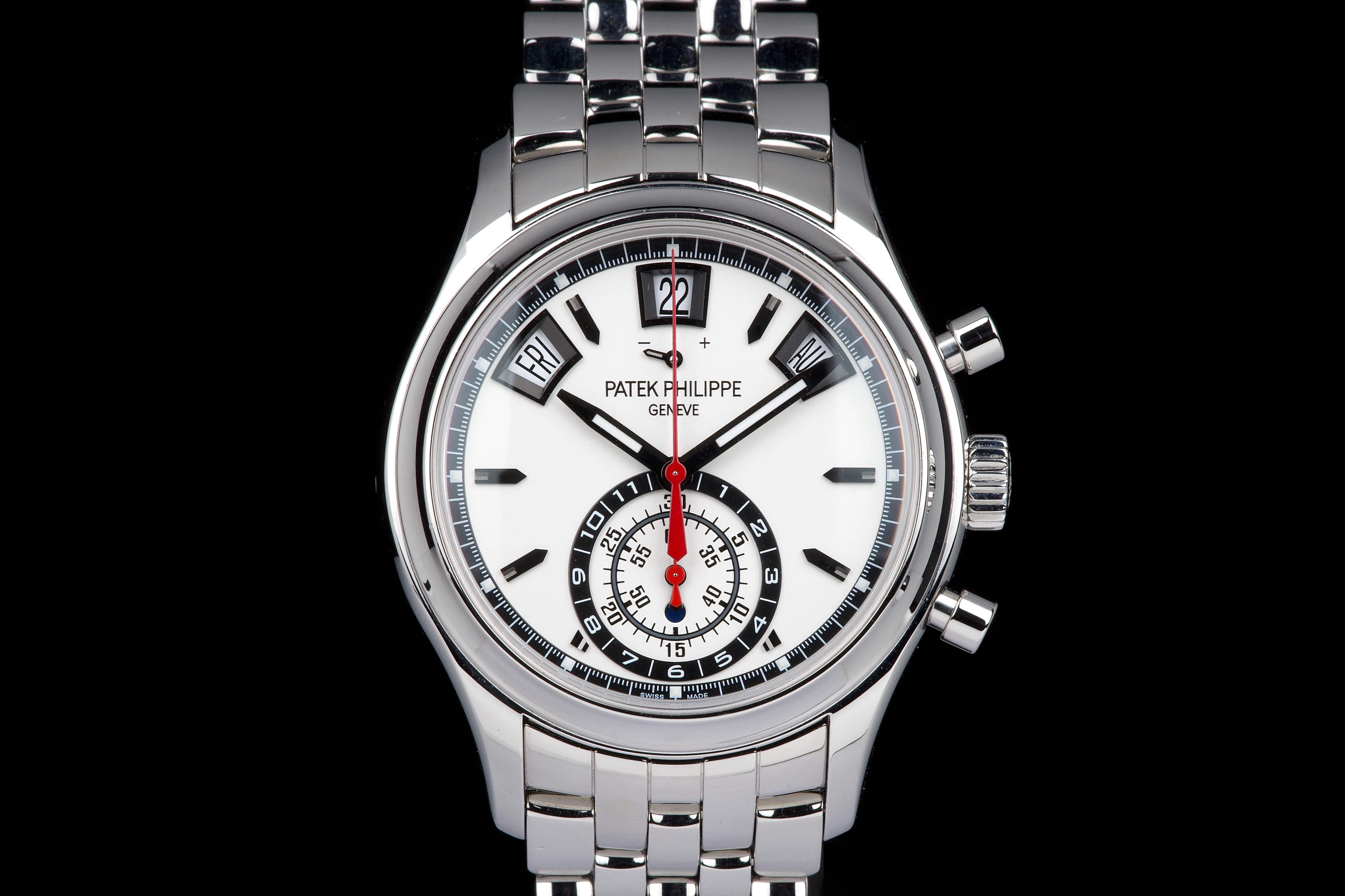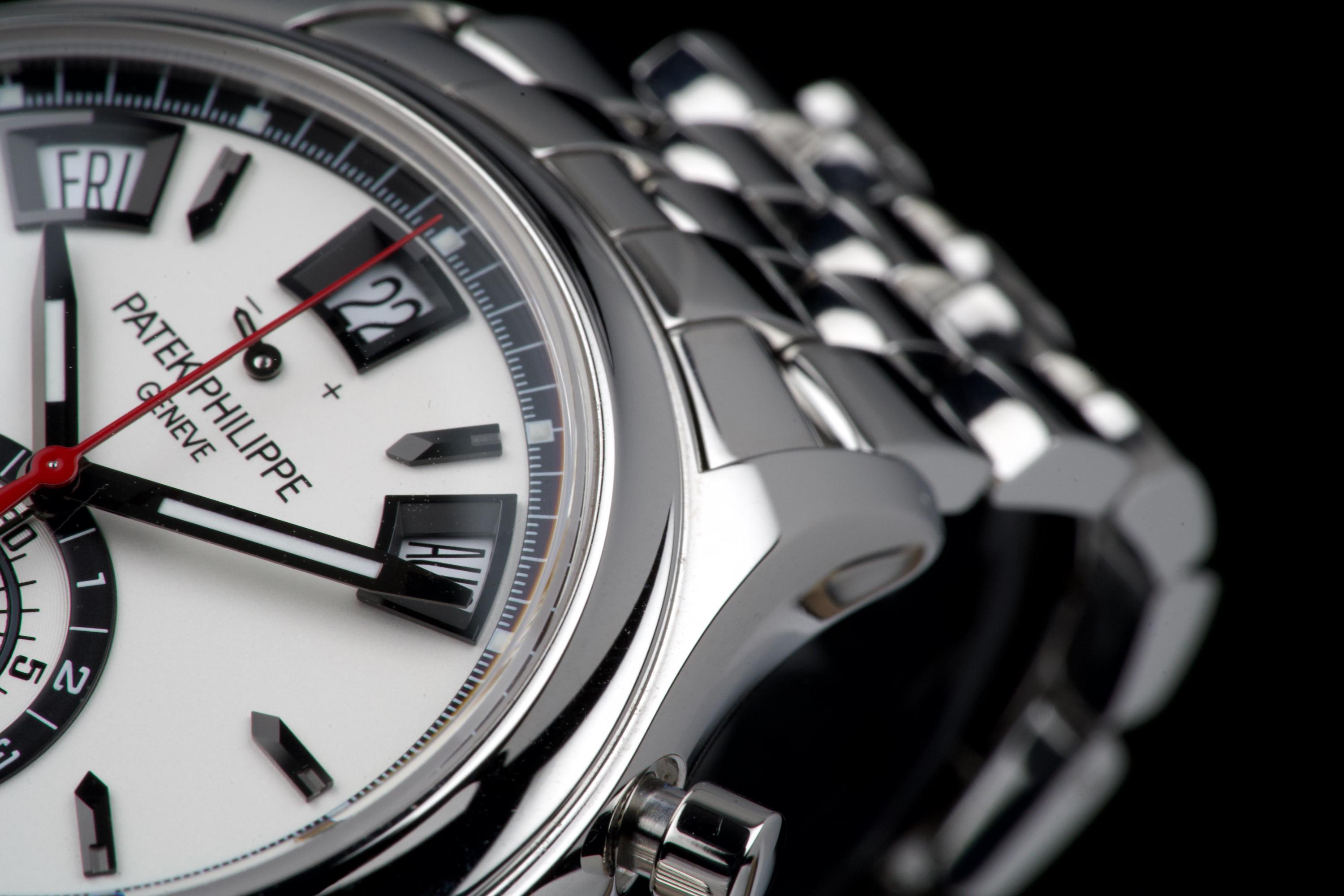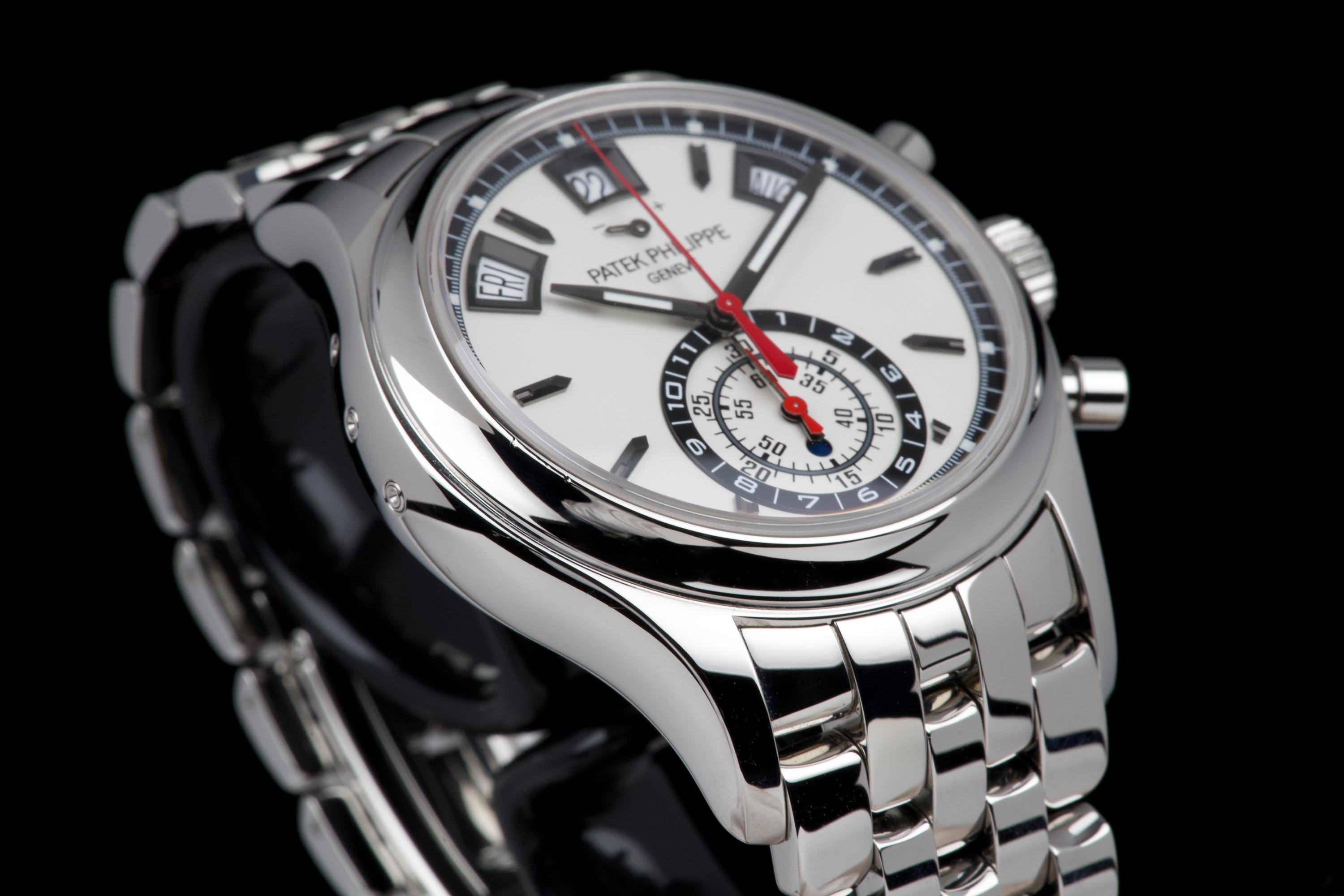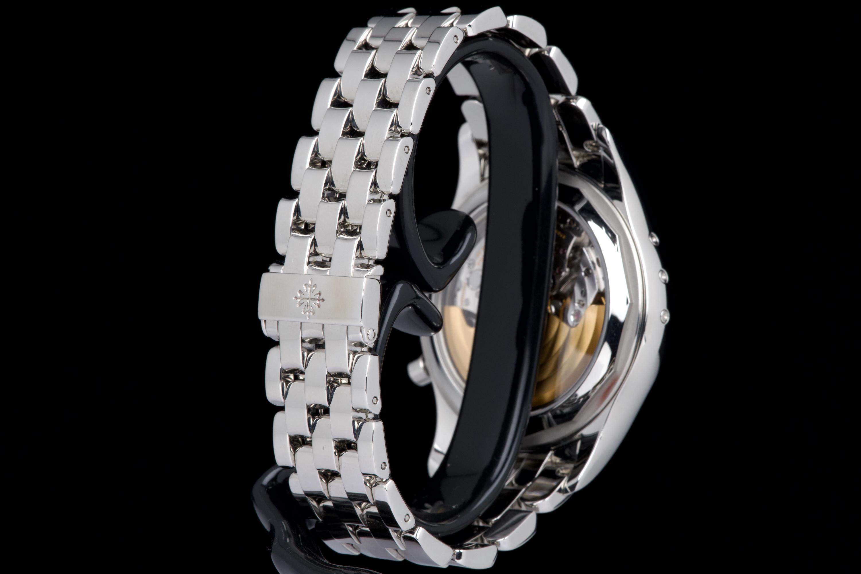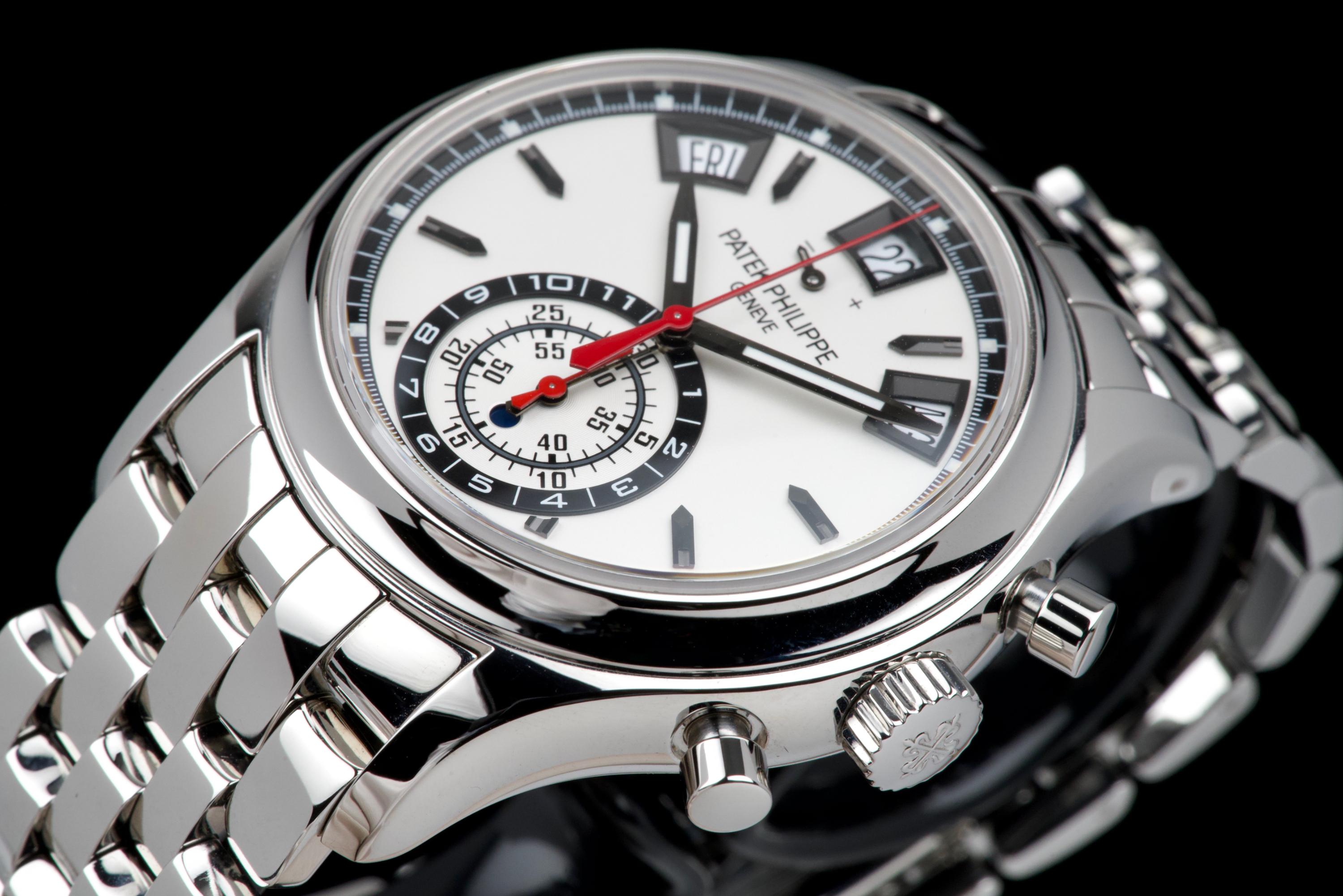 A highly attractive example of the stainless steel 5960/1A, coming from its first and only owner. The case appears unpolished and shows only minimal wear, with a couple of very small marks on the bezel between 8 and 9 o’clock. All bracelet links are present. The watch features the elegant white “opaline” dial with applied hour markers, annual calendar apertures at 10, 12 and 2 o’clock, and chronograph functions displayed via the monocounter at 6 o’clock. Powered by the automatic caliber CH 28-520 IRM QA 24H, combining chronograph, annual calendar, day/night indication and power reserve. There is no service history, but the movement has been checked and is running in perfect working condition. Complete with its original box, certificate of origin and accessories. A superb one-owner example of the discontinued steel 5960/1A — a complication watch that combines rarity, functionality and collectability.