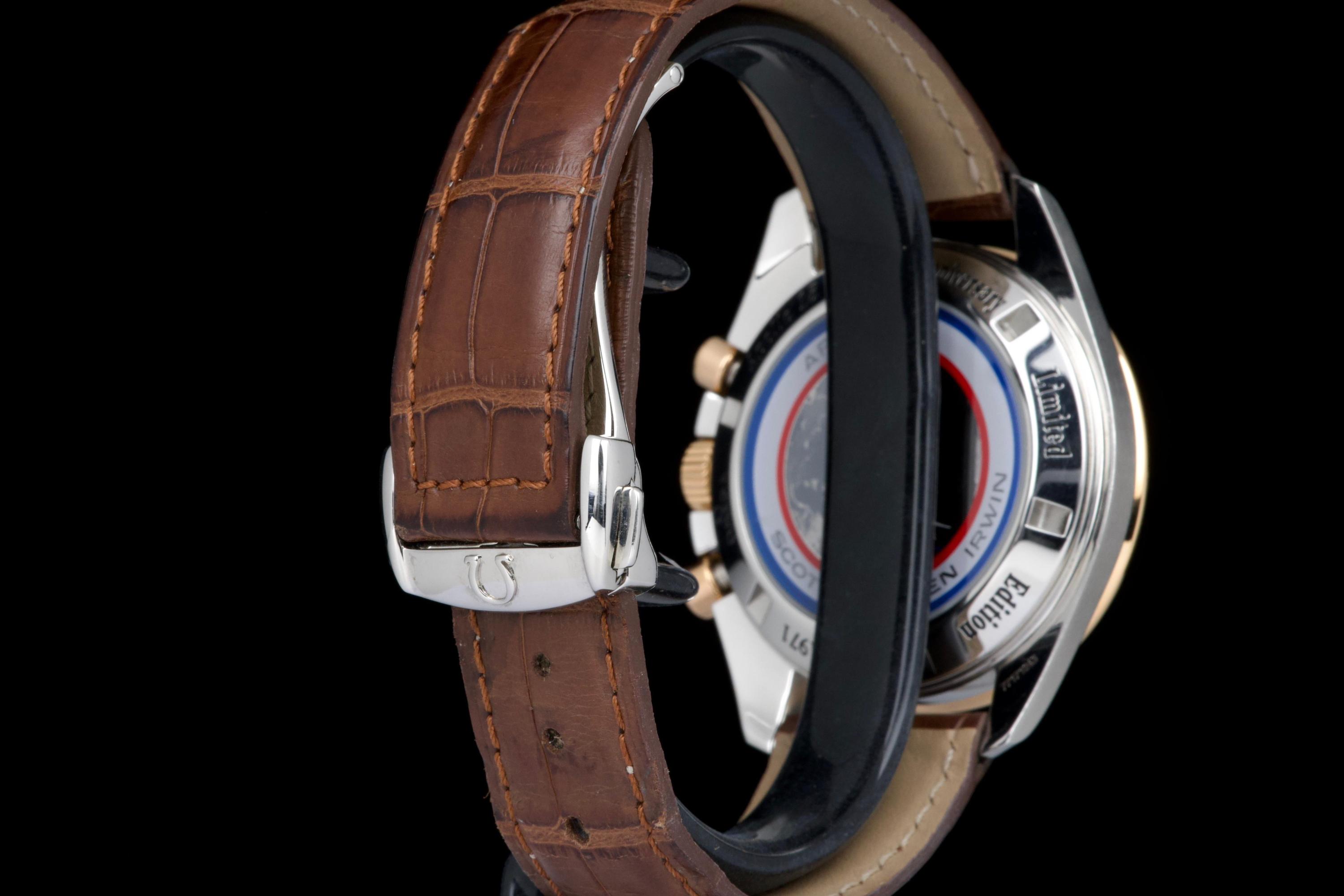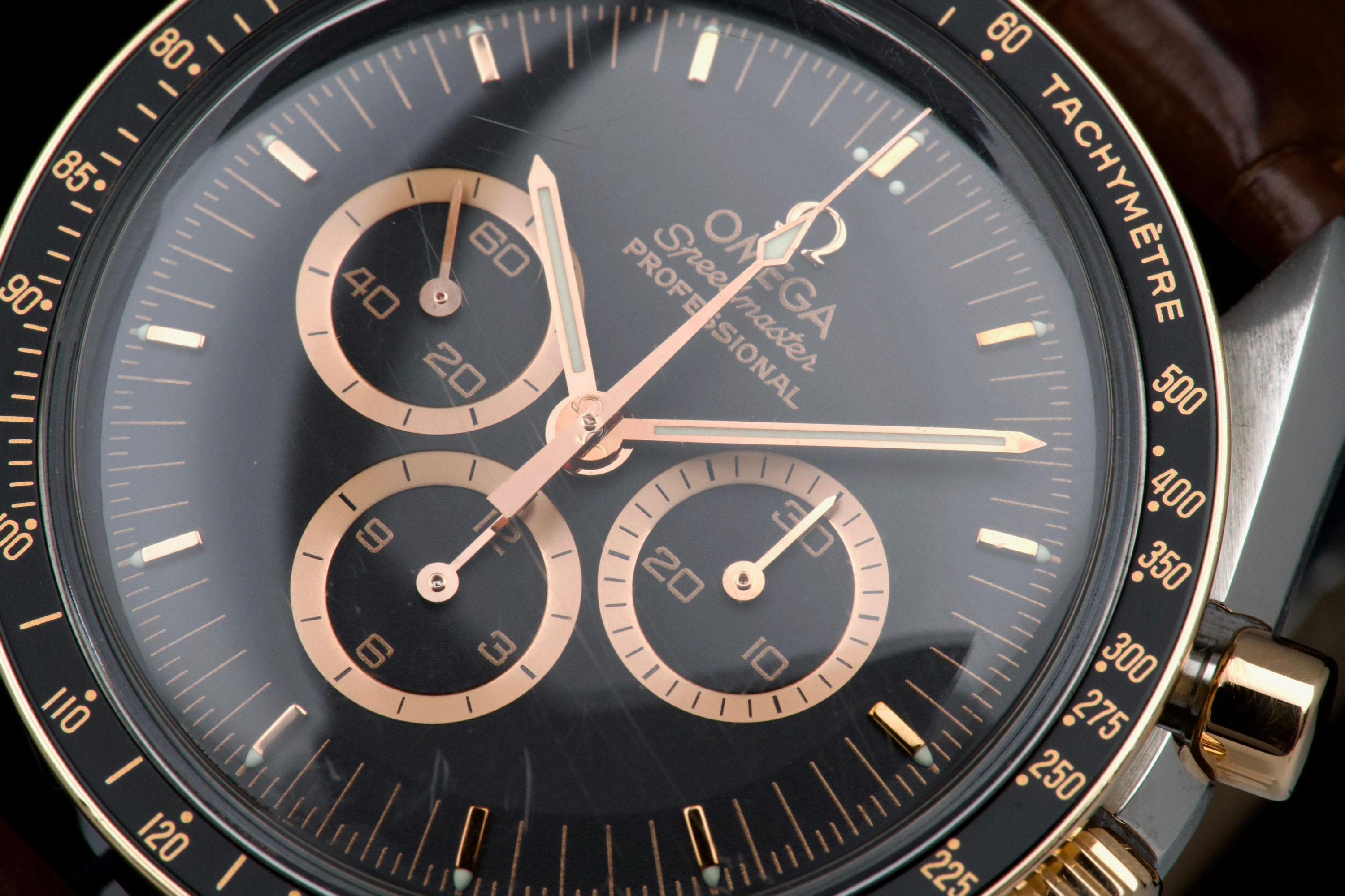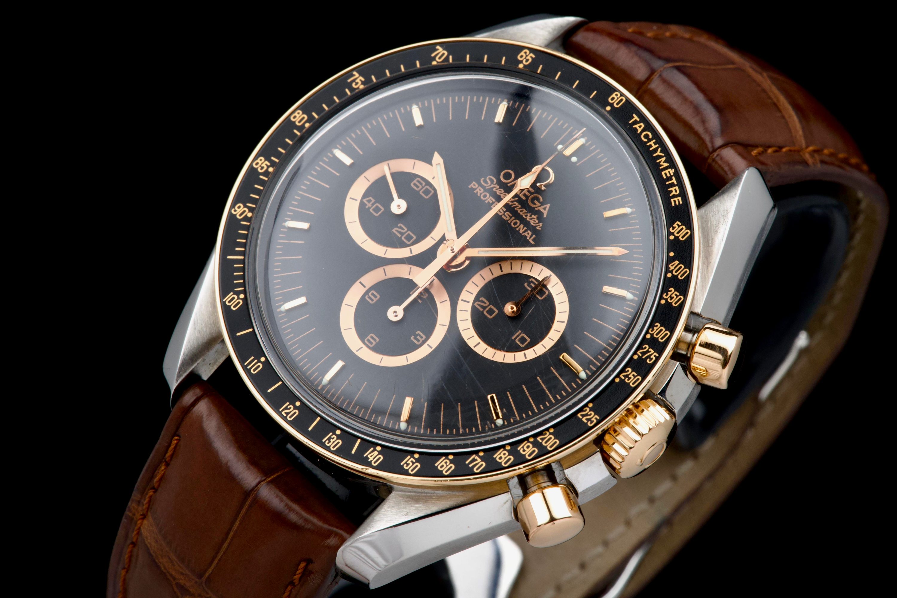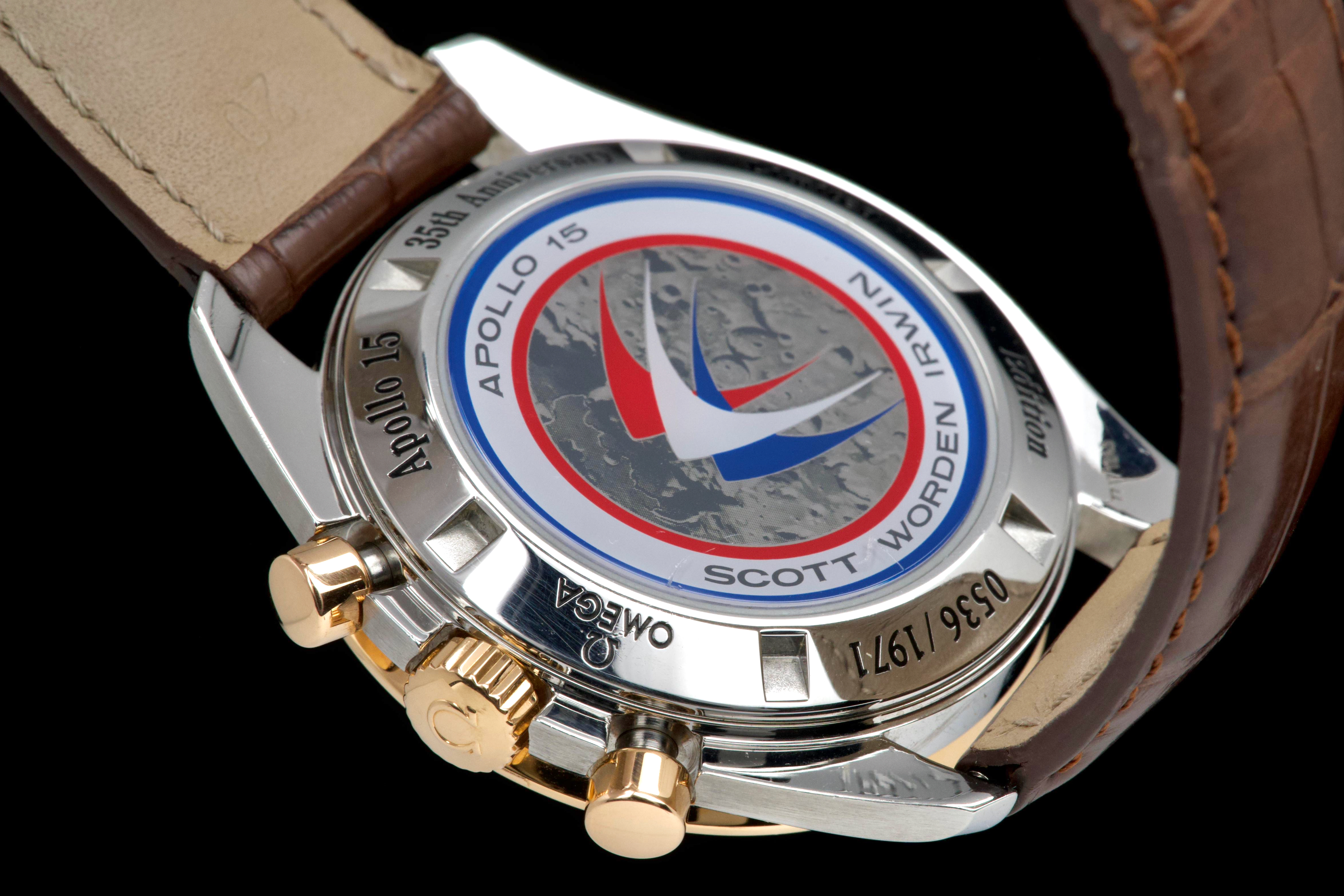 The present Omega Speedmaster Apollo 15 35th Anniversary “Scott–Worden–Irwin”, dating to 2007, is a highly collectible limited-edition tribute to the historic Apollo 15 mission, offered here with its original box and papers. Produced in a series of 1,971 pieces, a reference to the year of the mission, this model celebrates one of NASA’s most significant lunar expeditions and the first to employ the Lunar Roving Vehicle. The stainless-steel case is preserved in excellent overall condition and appears to have been lightly polished in the past. It shows only very light wear consistent with careful use. The hesalite (plexiglass) crystal displays minor surface scratches, which may be easily polished upon request. The dial remains in superb condition, faithfully echoing the classic Speedmaster Professional aesthetic while incorporating commemorative elements specific to the Apollo 15 edition. The watch is fitted with a brown crocodile leather strap paired with an Omega deployant clasp. No metal bracelet accompanies the watch. While no service history is recorded, the watch is running correctly at the time of cataloguing. Delivered with its original box and warranty papers dated 2007 in Germany, this Apollo 15 35th Anniversary Speedmaster represents a compelling opportunity to acquire a historically significant limited-edition Moonwatch, combining strong condition, desirable provenance, and enduring connection to one of mankind’s greatest achievements.