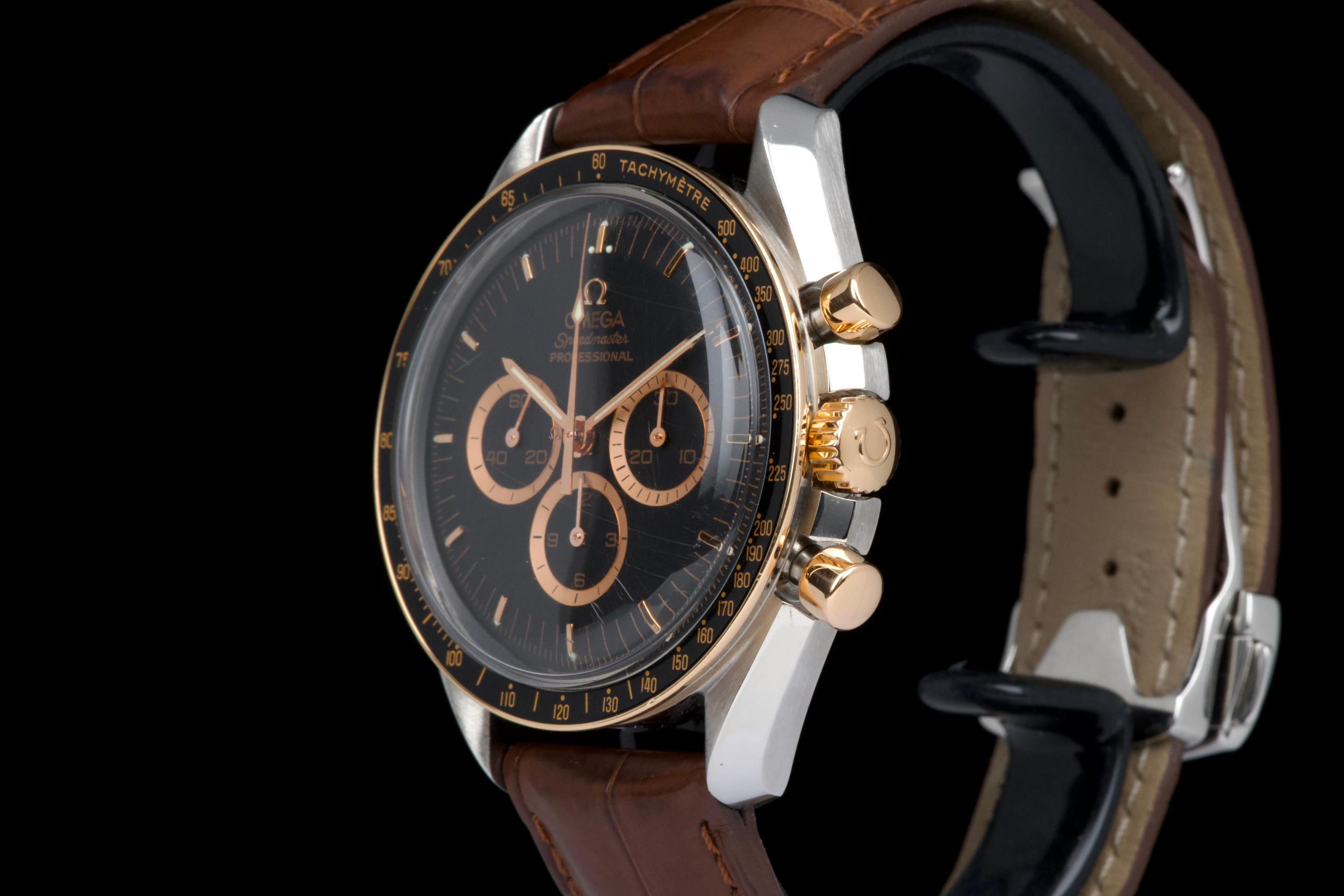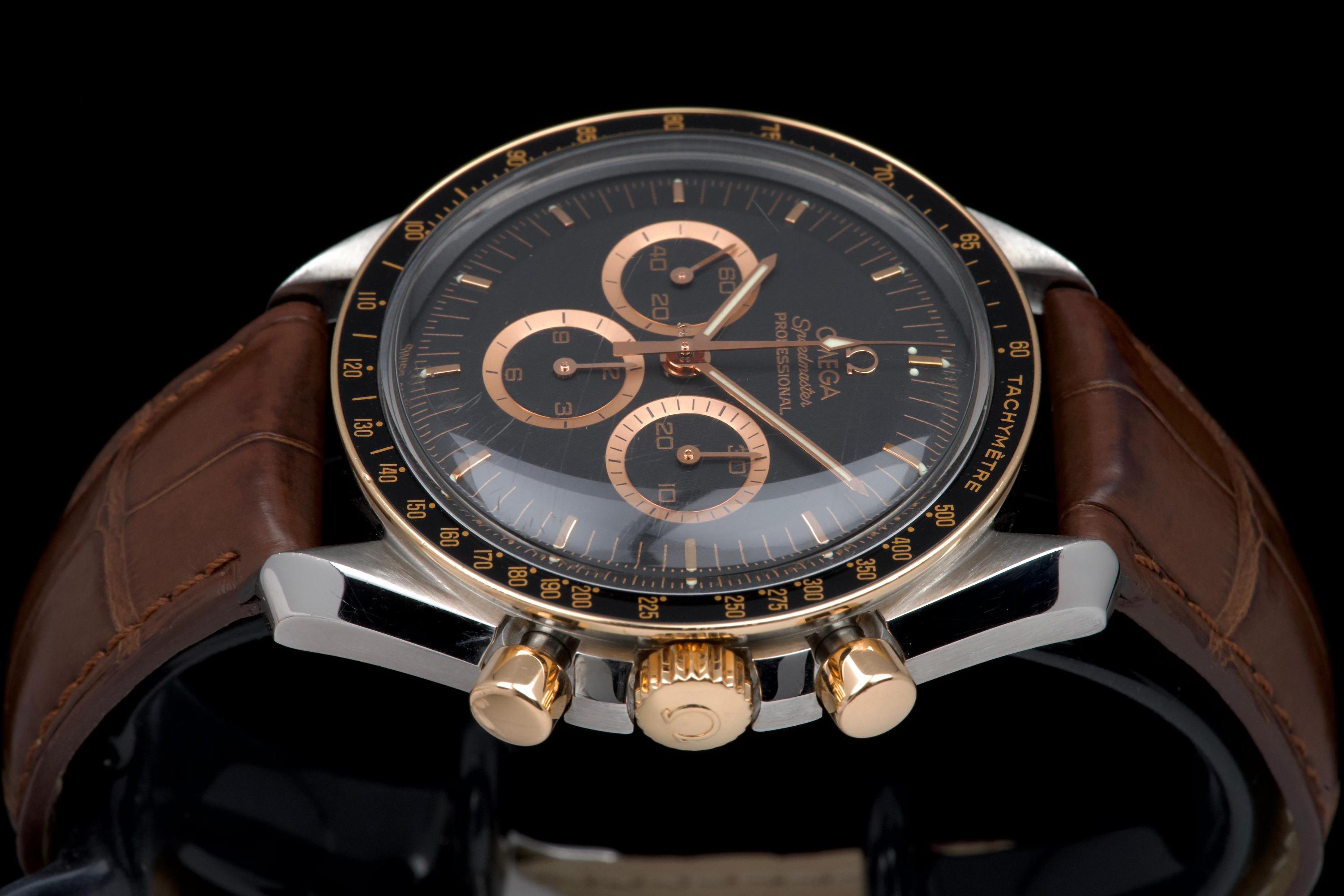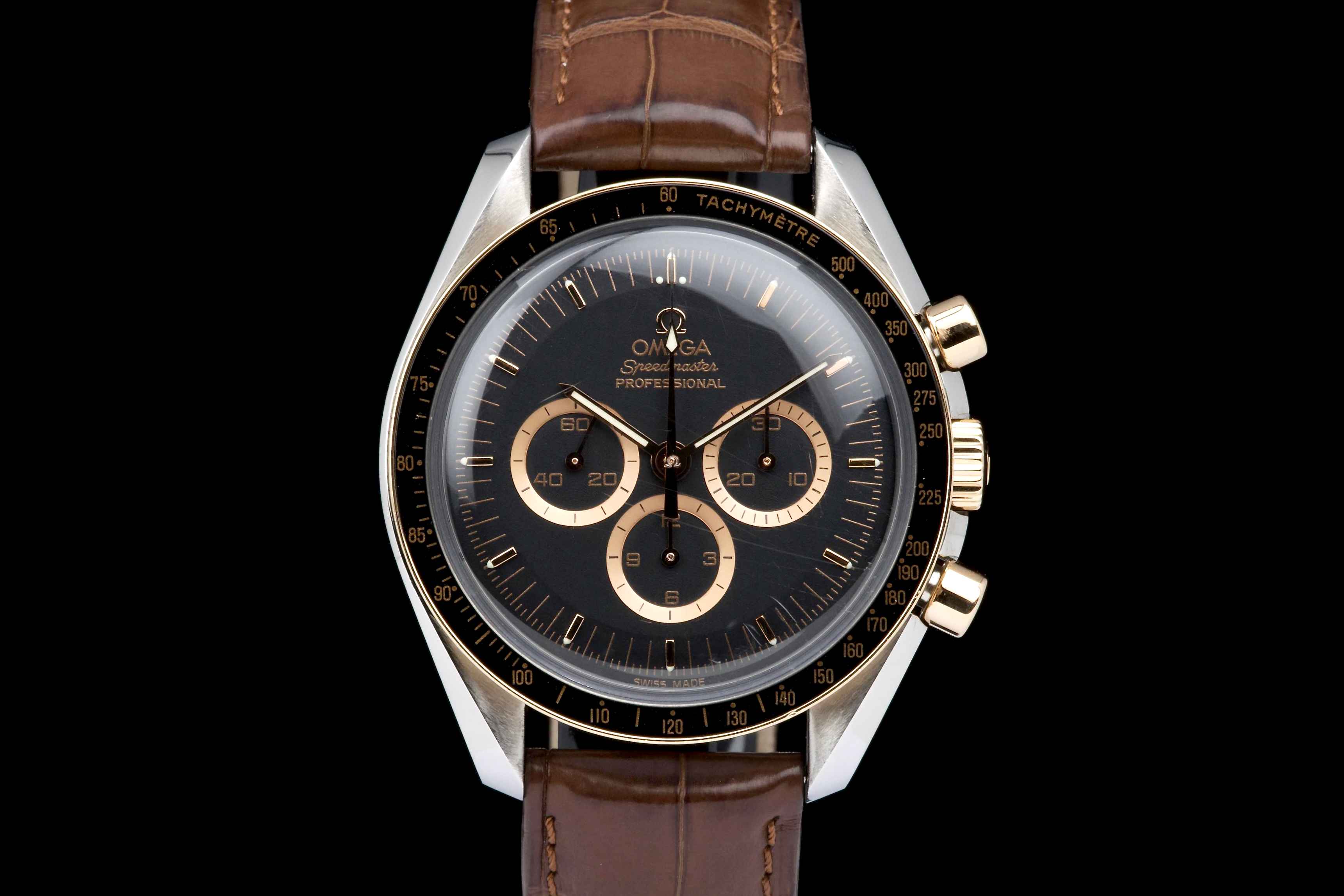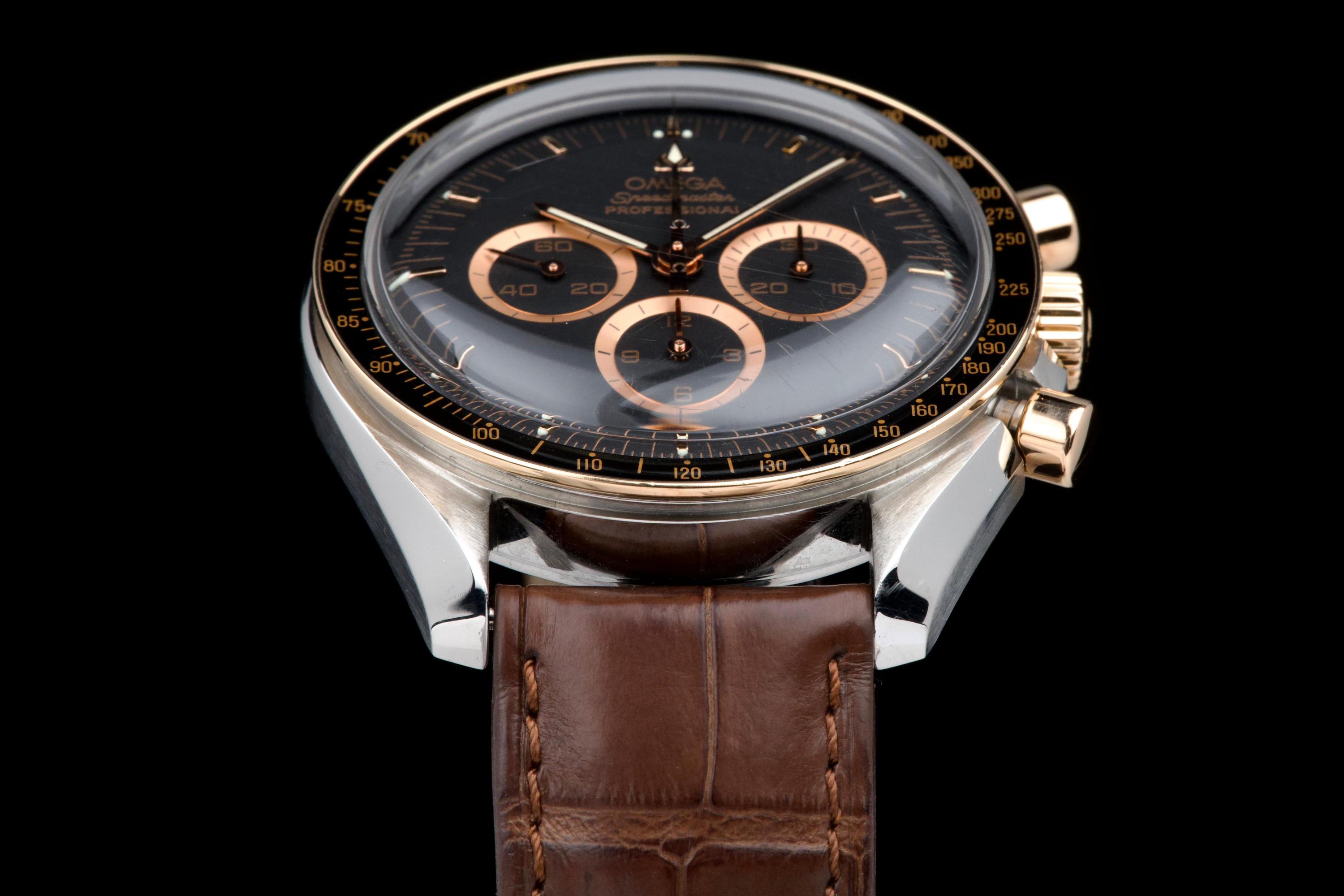 The present Omega Speedmaster Apollo 15 35th Anniversary “Scott–Worden–Irwin”, dating to 2007, is a highly collectible limited-edition tribute to the historic Apollo 15 mission, offered here with its original box and papers. Produced in a series of 1,971 pieces, a reference to the year of the mission, this model celebrates one of NASA’s most significant lunar expeditions and the first to employ the Lunar Roving Vehicle. The stainless-steel case is preserved in excellent overall condition and appears to have been lightly polished in the past. It shows only very light wear consistent with careful use. The hesalite (plexiglass) crystal displays minor surface scratches, which may be easily polished upon request. The dial remains in superb condition, faithfully echoing the classic Speedmaster Professional aesthetic while incorporating commemorative elements specific to the Apollo 15 edition. The watch is fitted with a brown crocodile leather strap paired with an Omega deployant clasp. No metal bracelet accompanies the watch. While no service history is recorded, the watch is running correctly at the time of cataloguing. Delivered with its original box and warranty papers dated 2007 in Germany, this Apollo 15 35th Anniversary Speedmaster represents a compelling opportunity to acquire a historically significant limited-edition Moonwatch, combining strong condition, desirable provenance, and enduring connection to one of mankind’s greatest achievements.