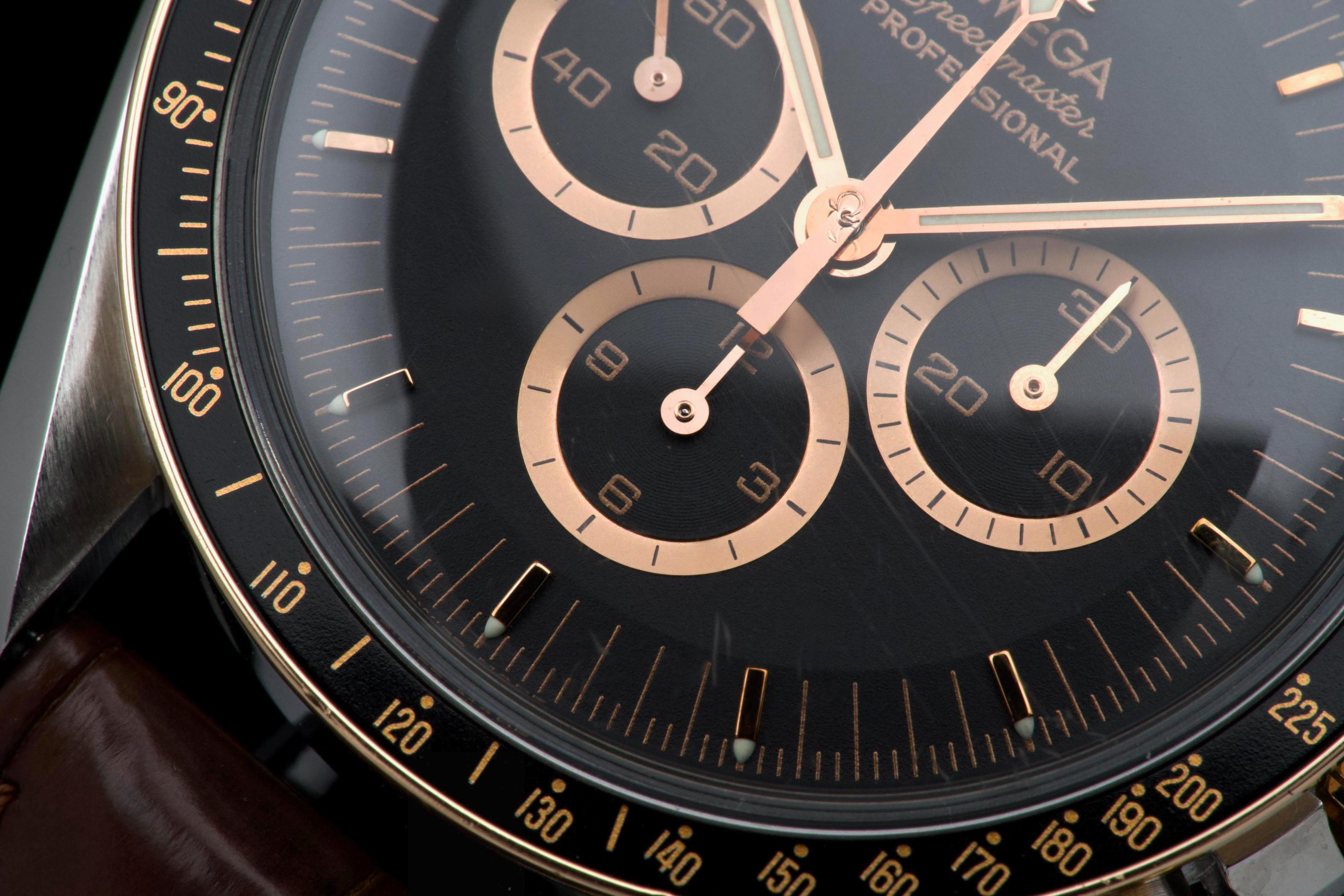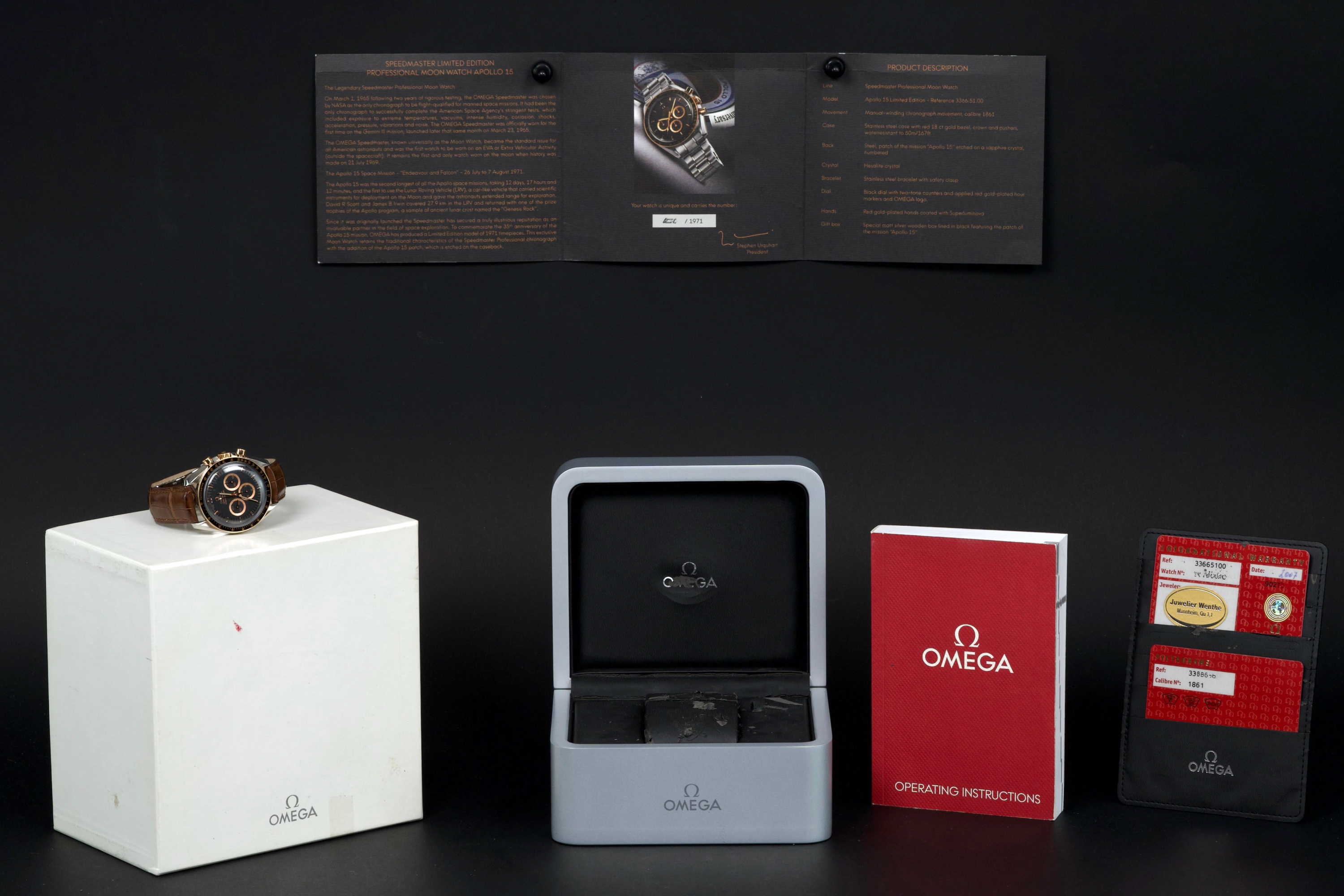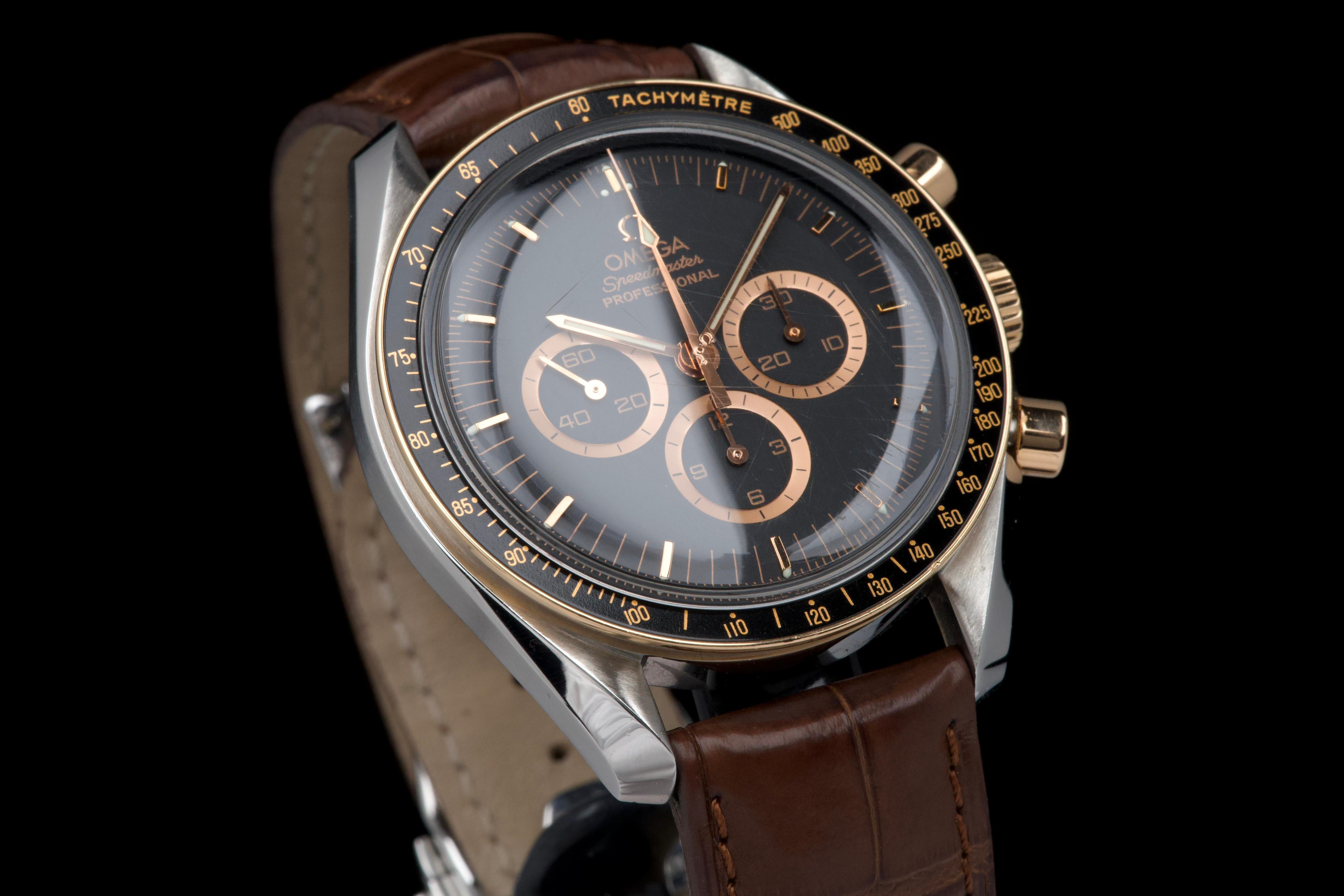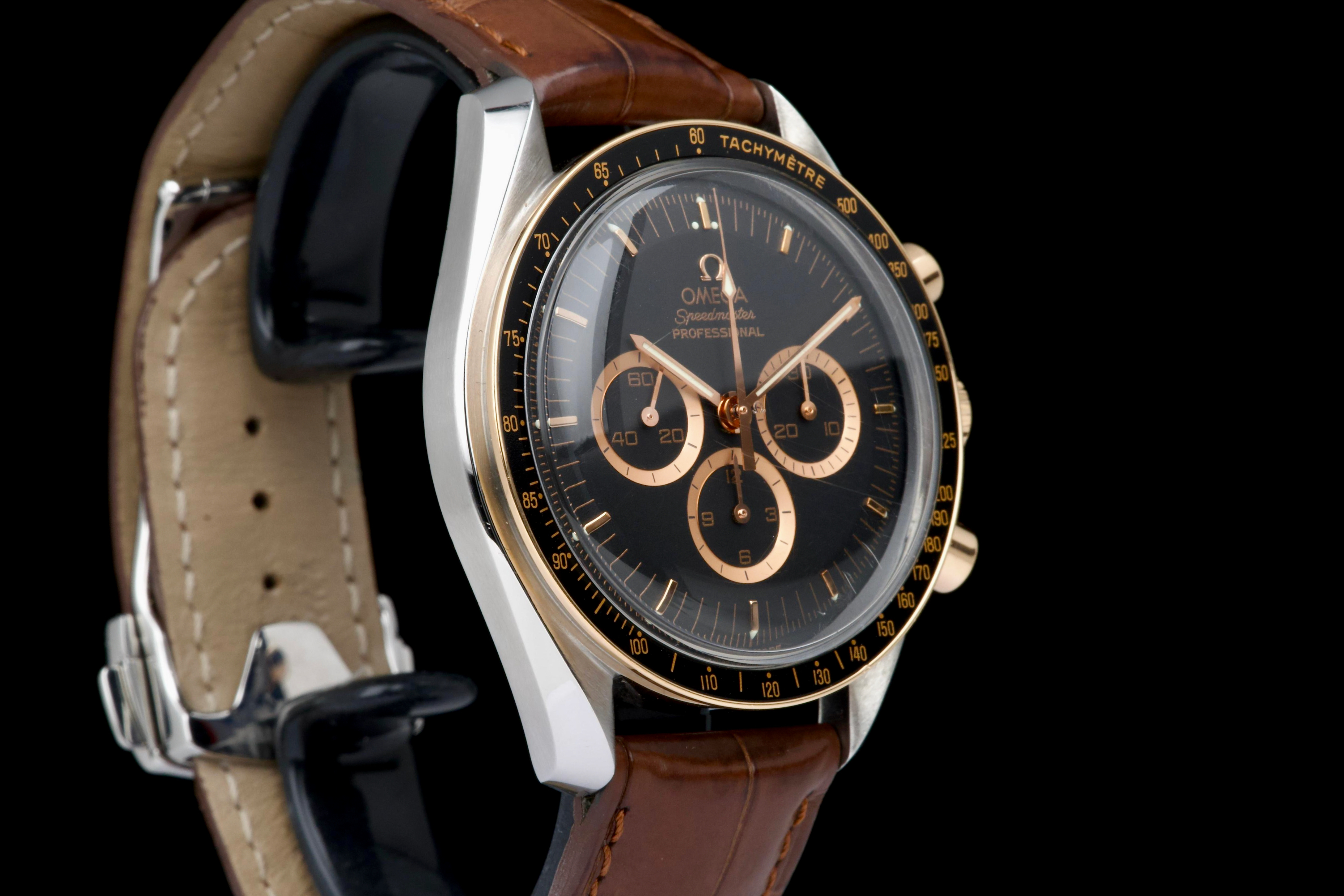 The present Omega Speedmaster Apollo 15 35th Anniversary “Scott–Worden–Irwin”, dating to 2007, is a highly collectible limited-edition tribute to the historic Apollo 15 mission, offered here with its original box and papers. Produced in a series of 1,971 pieces, a reference to the year of the mission, this model celebrates one of NASA’s most significant lunar expeditions and the first to employ the Lunar Roving Vehicle. The stainless-steel case is preserved in excellent overall condition and appears to have been lightly polished in the past. It shows only very light wear consistent with careful use. The hesalite (plexiglass) crystal displays minor surface scratches, which may be easily polished upon request. The dial remains in superb condition, faithfully echoing the classic Speedmaster Professional aesthetic while incorporating commemorative elements specific to the Apollo 15 edition. The watch is fitted with a brown crocodile leather strap paired with an Omega deployant clasp. No metal bracelet accompanies the watch. While no service history is recorded, the watch is running correctly at the time of cataloguing. Delivered with its original box and warranty papers dated 2007 in Germany, this Apollo 15 35th Anniversary Speedmaster represents a compelling opportunity to acquire a historically significant limited-edition Moonwatch, combining strong condition, desirable provenance, and enduring connection to one of mankind’s greatest achievements.