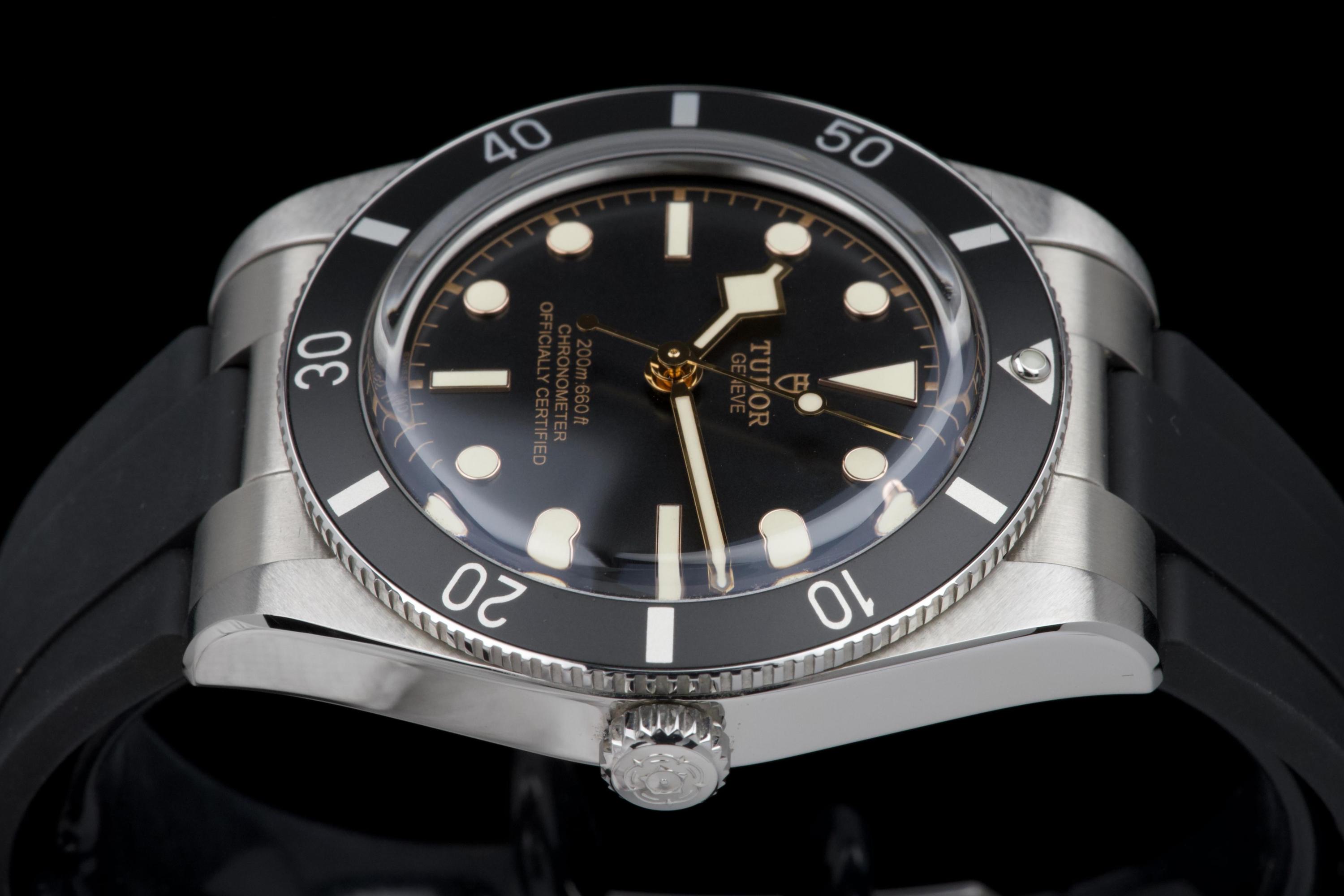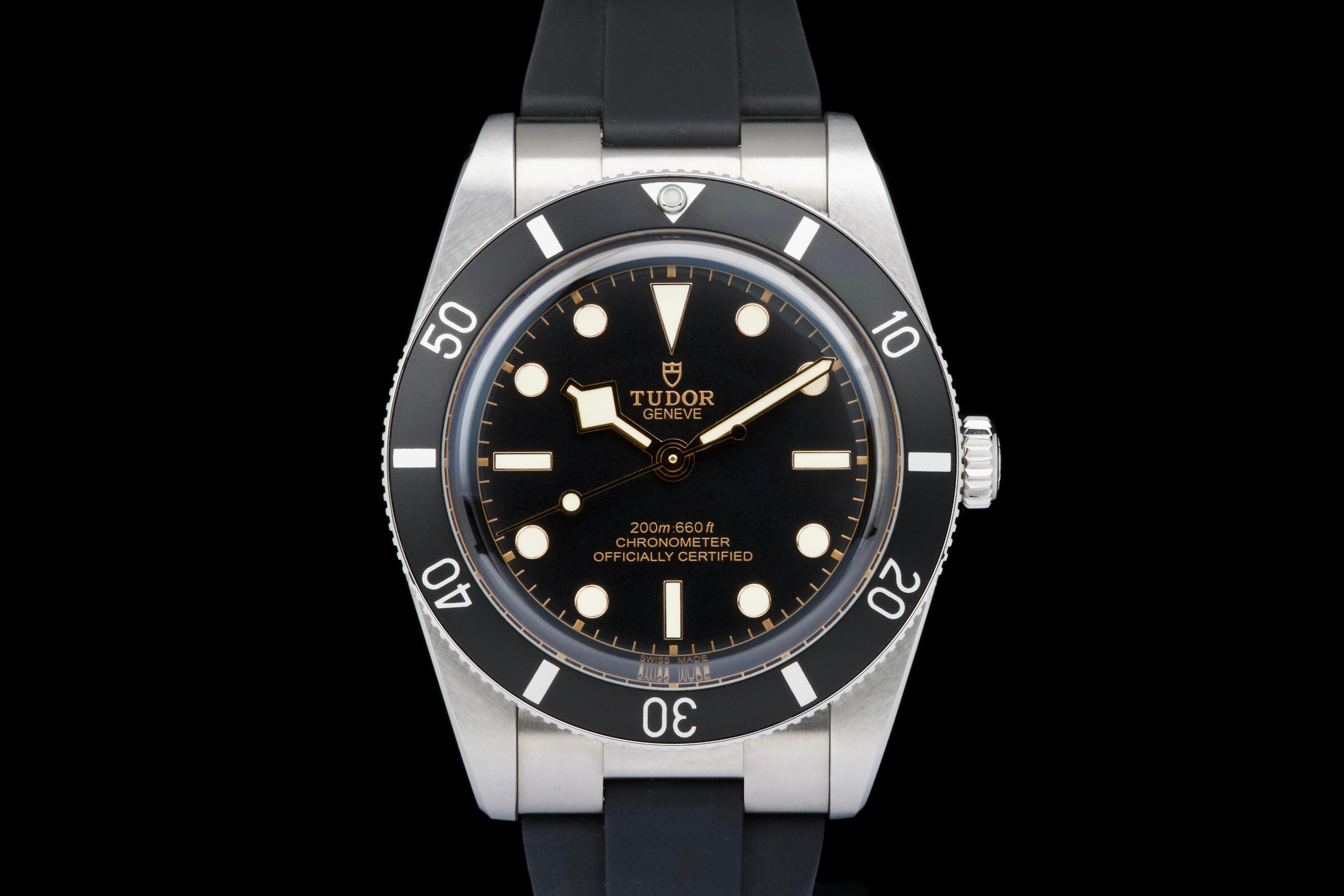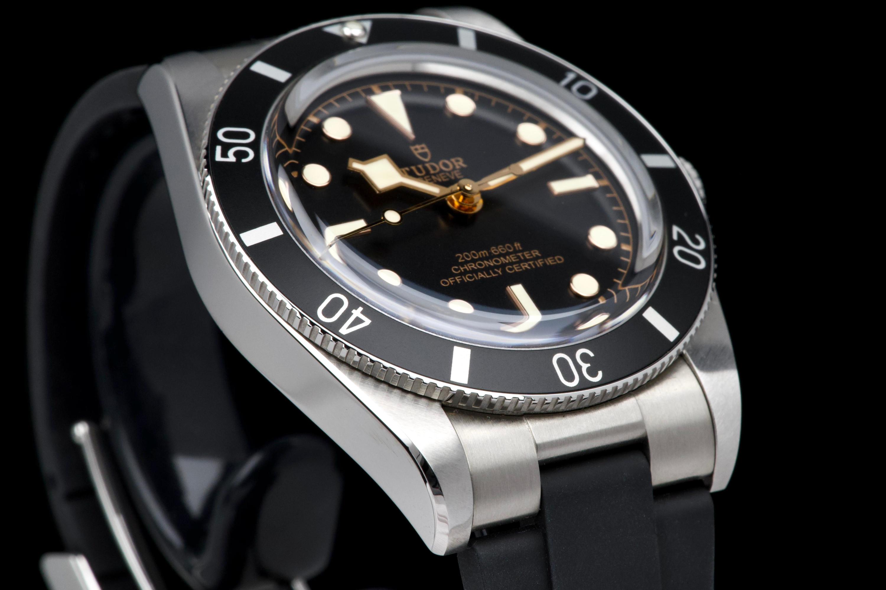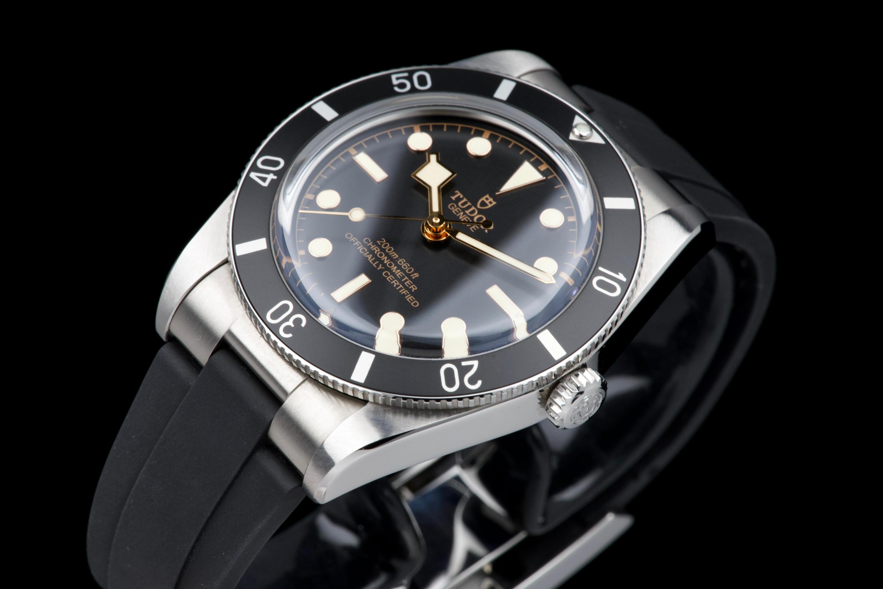 The present Tudor Black Bay 54, dating to 2023 and offered as a complete full set, is a superb modern interpretation of Tudor’s earliest dive watches, combining vintage-inspired proportions with contemporary performance. Measuring 37 mm in diameter, the Black Bay 54 pays direct homage to the original Tudor Submariner references of the 1950s while incorporating modern materials and technical reliability. This example is preserved in mint condition and appears to be unworn, retaining a virtually untouched overall presentation. The watch is fitted with its black rubber strap, providing a clean and versatile aesthetic well suited to everyday wear. The matte black dial and gilt accents offer excellent legibility and a warm, vintage-inspired character, while the unidirectional bezel completes the classic diver configuration. Powered by Tudor’s in-house automatic movement, the Black Bay 54 delivers robust performance and modern precision in a compact and highly wearable format. Delivered as a full set from 2023, this example represents an appealing opportunity to acquire a near-new piece from one of Tudor’s most celebrated contemporary collections.