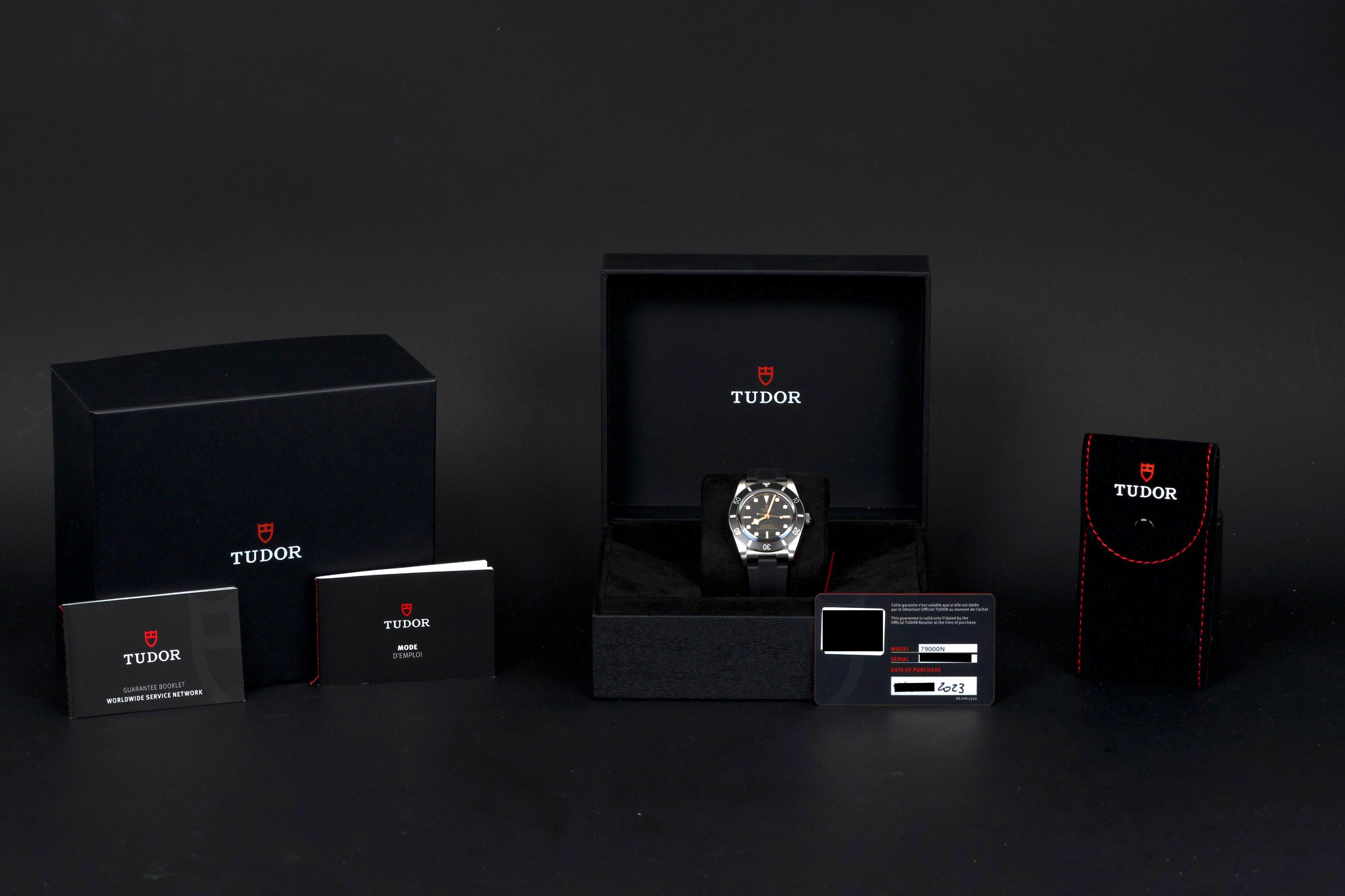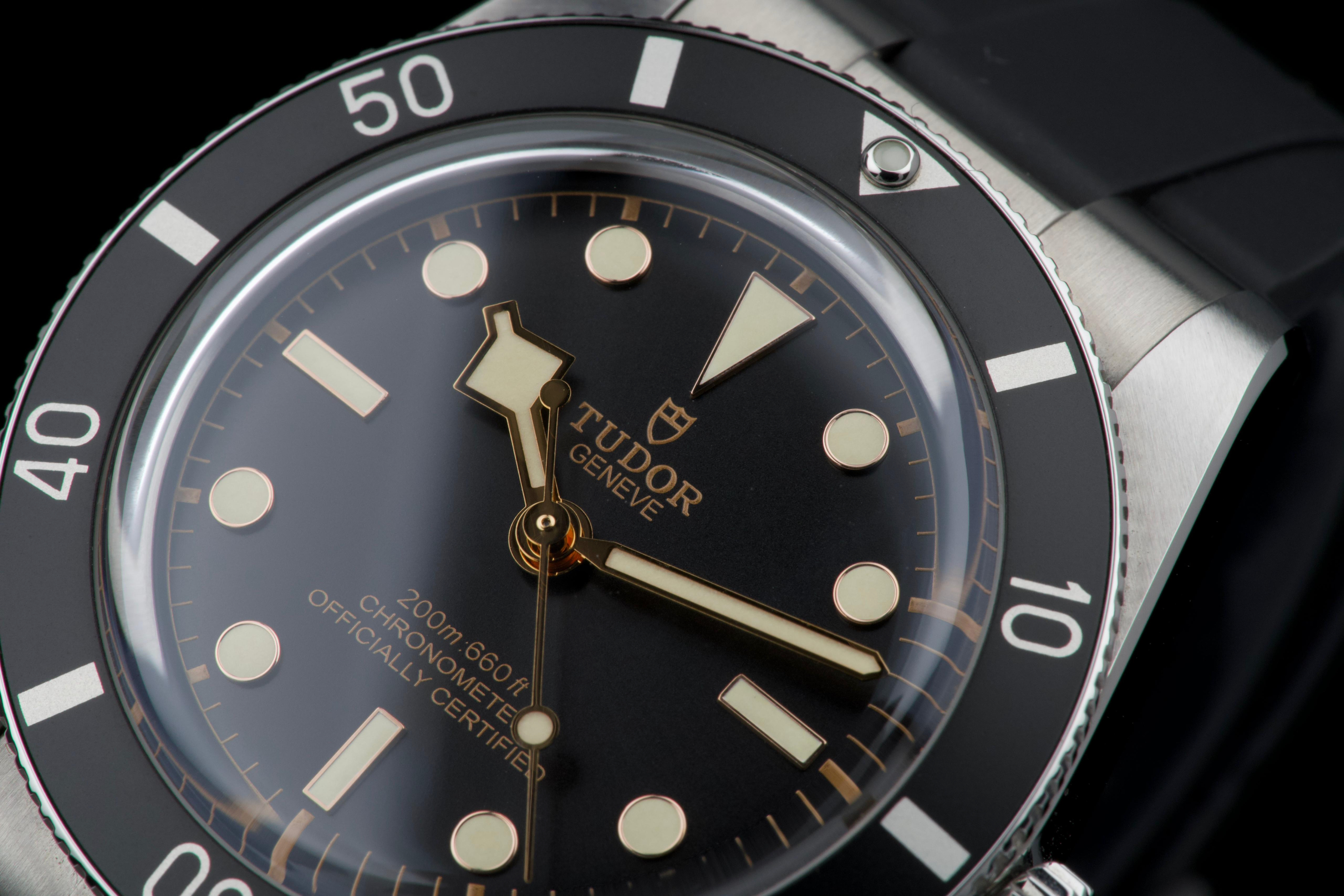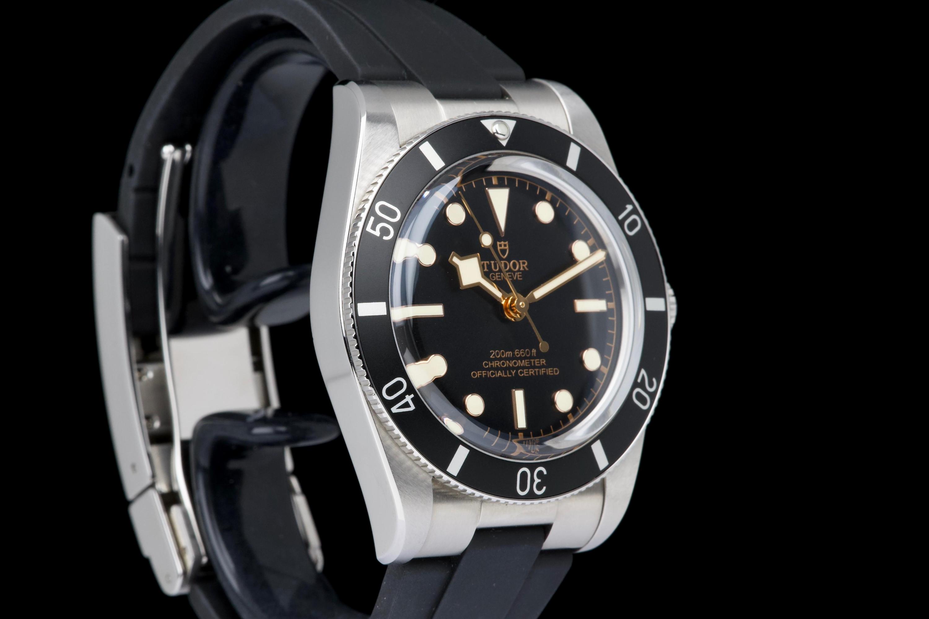 The present Tudor Black Bay 54, dating to 2023 and offered as a complete full set, is a superb modern interpretation of Tudor’s earliest dive watches, combining vintage-inspired proportions with contemporary performance. Measuring 37 mm in diameter, the Black Bay 54 pays direct homage to the original Tudor Submariner references of the 1950s while incorporating modern materials and technical reliability. This example is preserved in mint condition and appears to be unworn, retaining a virtually untouched overall presentation. The watch is fitted with its black rubber strap, providing a clean and versatile aesthetic well suited to everyday wear. The matte black dial and gilt accents offer excellent legibility and a warm, vintage-inspired character, while the unidirectional bezel completes the classic diver configuration. Powered by Tudor’s in-house automatic movement, the Black Bay 54 delivers robust performance and modern precision in a compact and highly wearable format. Delivered as a full set from 2023, this example represents an appealing opportunity to acquire a near-new piece from one of Tudor’s most celebrated contemporary collections.