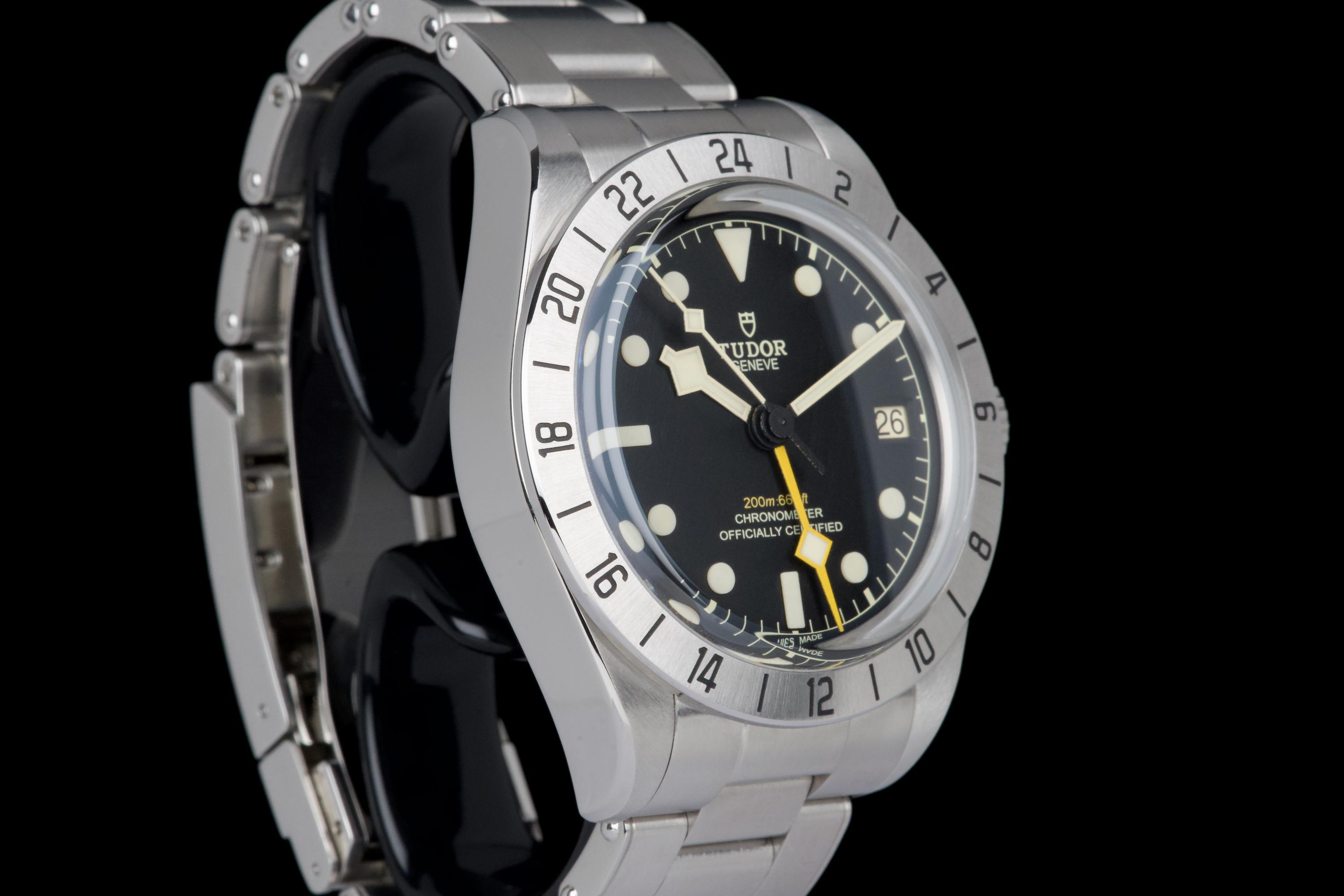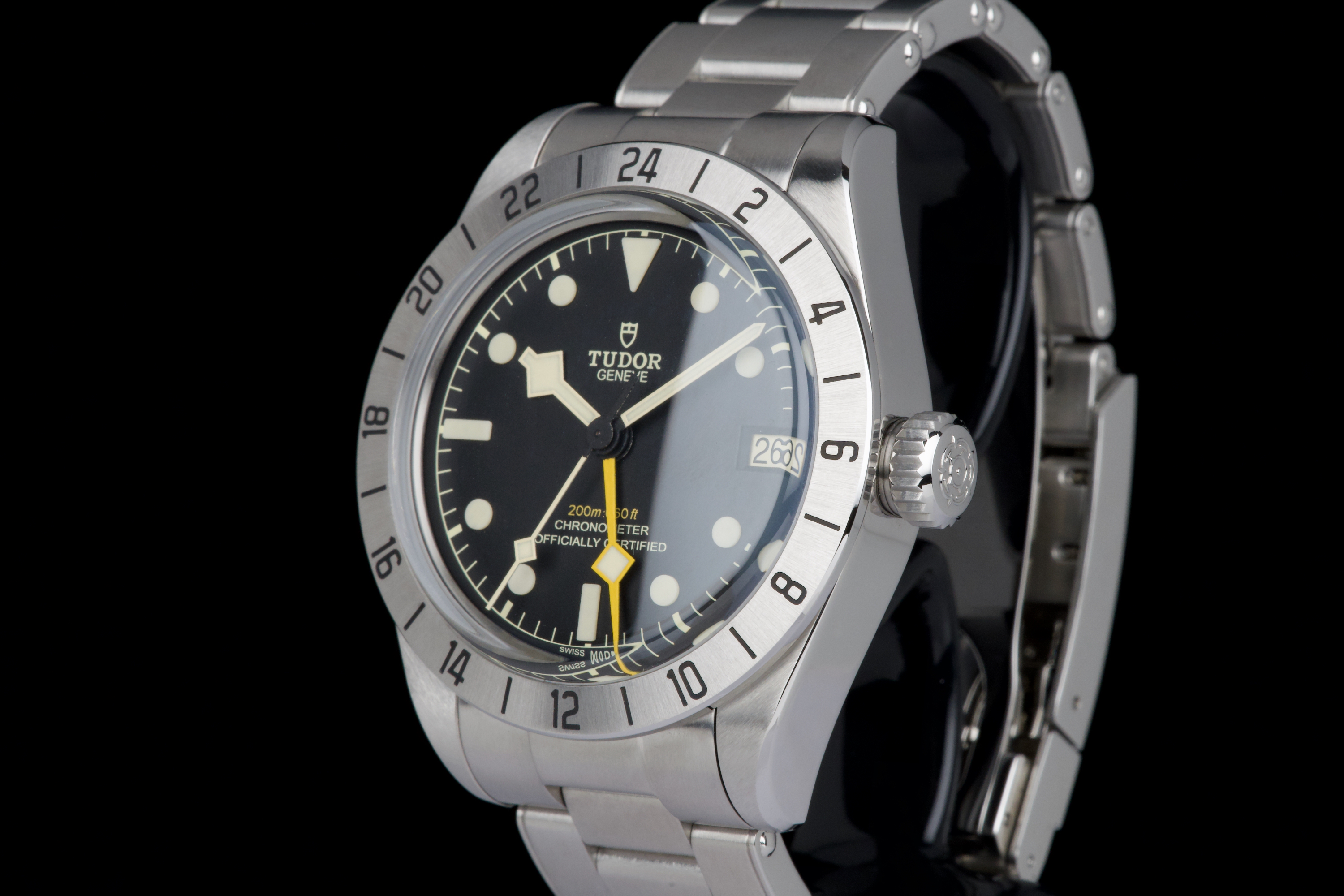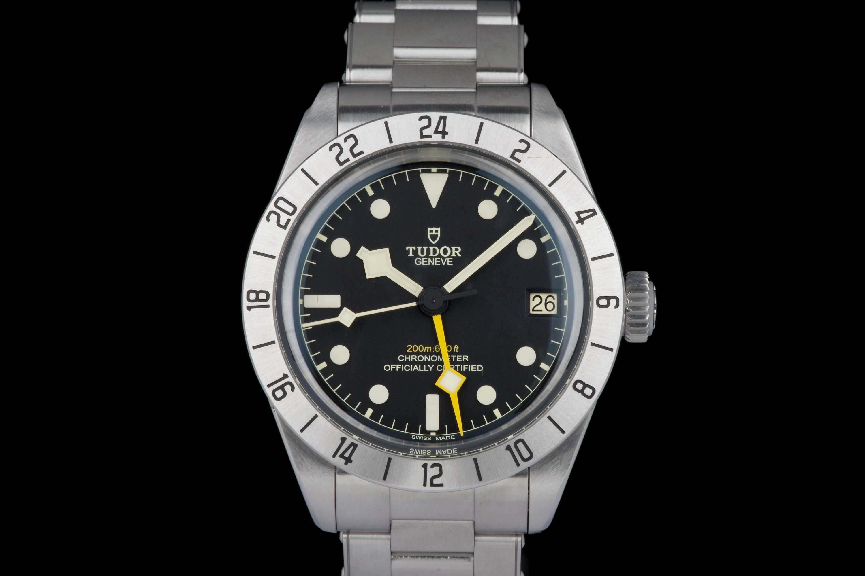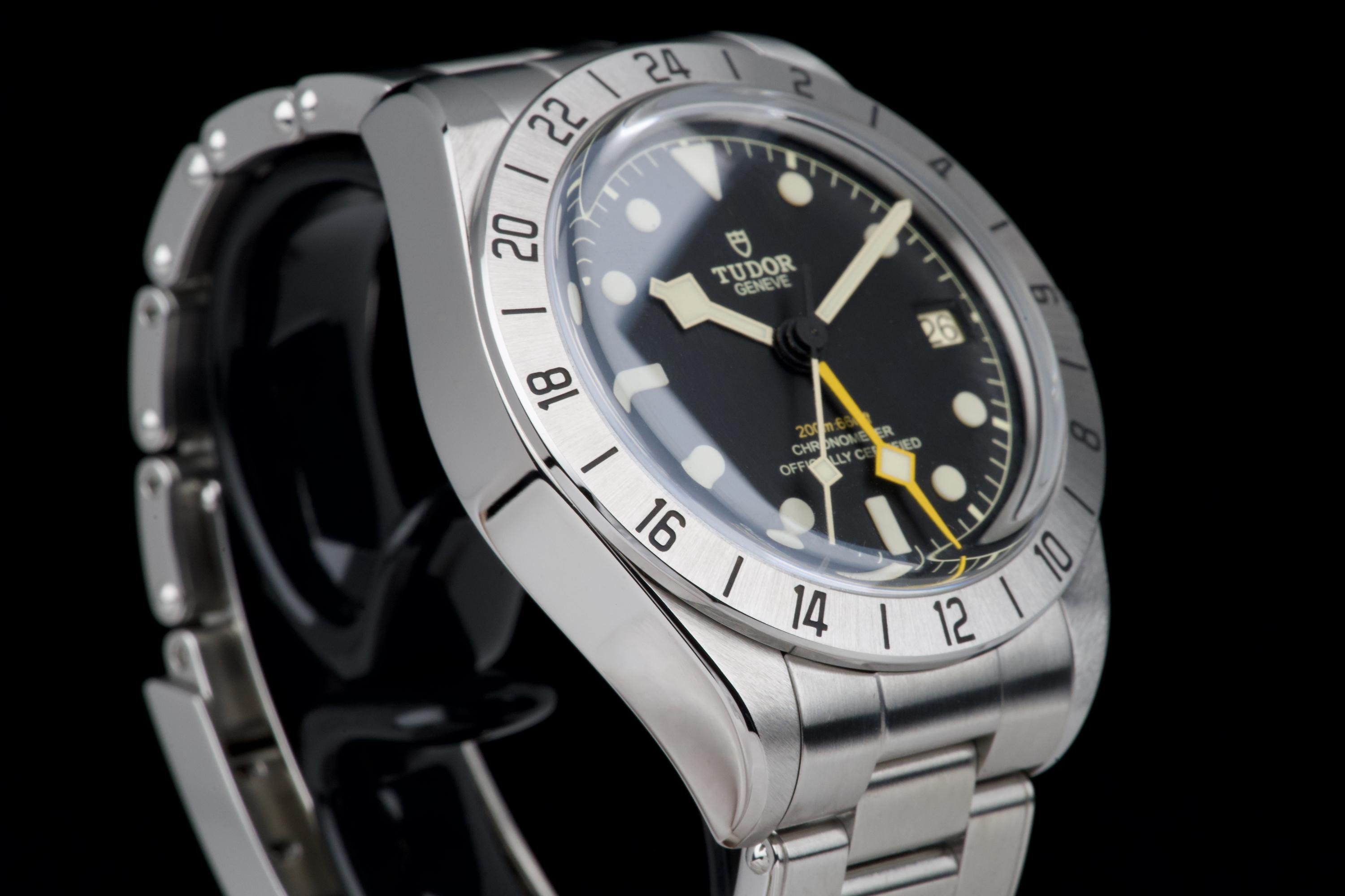 The Tudor Black Bay Pro 79470 is a modern tool watch with vintage soul, featuring a 39 mm steel case, fixed steel bezel, and an integrated GMT function powered by the in-house MT5652 movement. With its rugged design and compact proportions, it draws inspiration from iconic explorer watches of the past. This example was sold in 2023 and comes as a complete full set. The watch is unpolished and remains in excellent condition, showing only minimal signs of wear if no wear. A robust and versatile GMT with strong vintage character and modern reliability—ideal for daily wear or adventure.