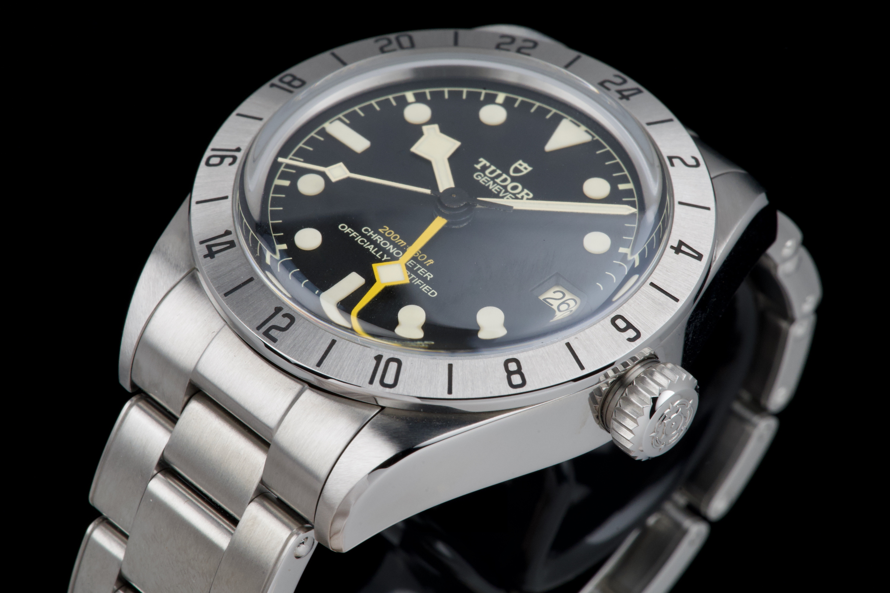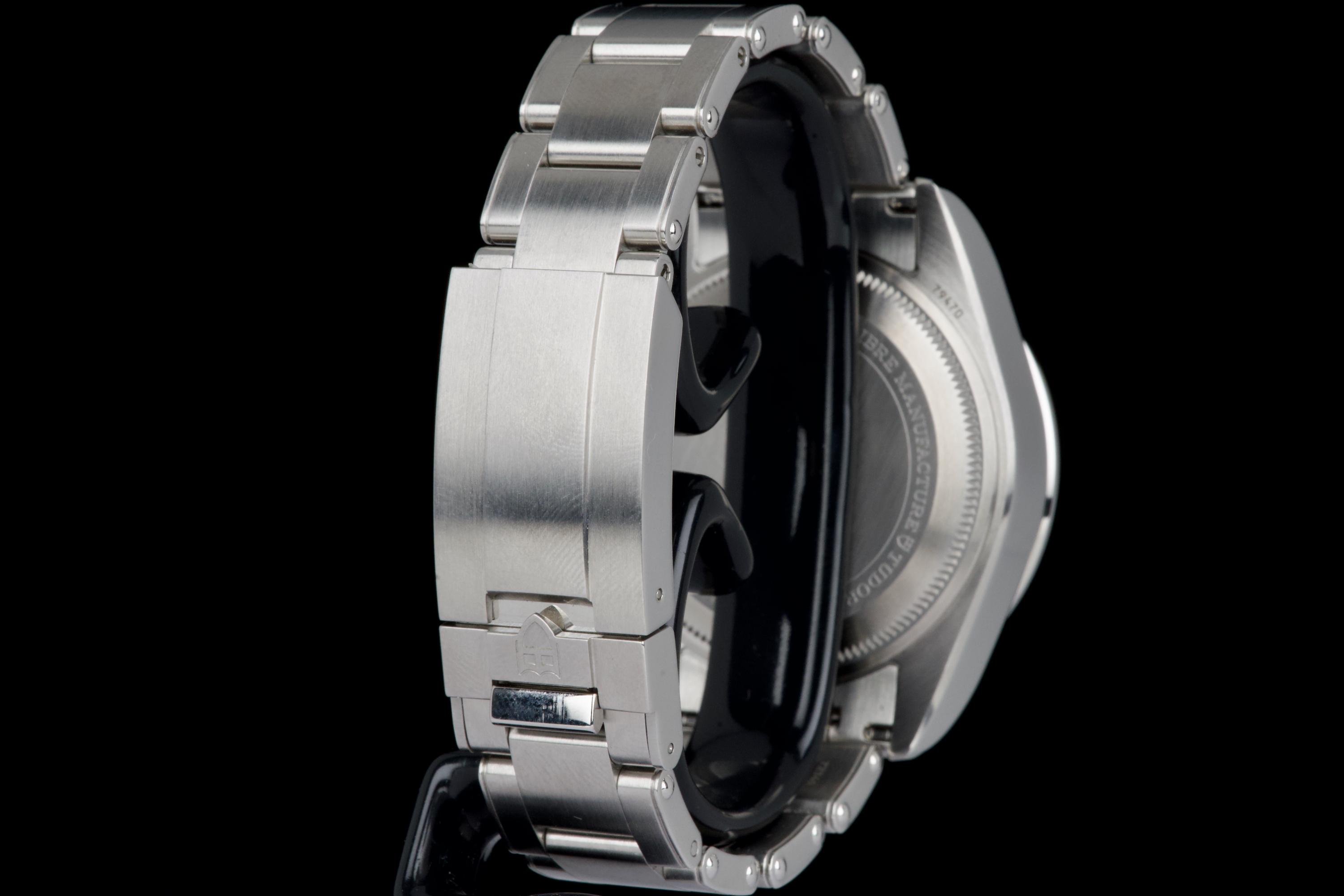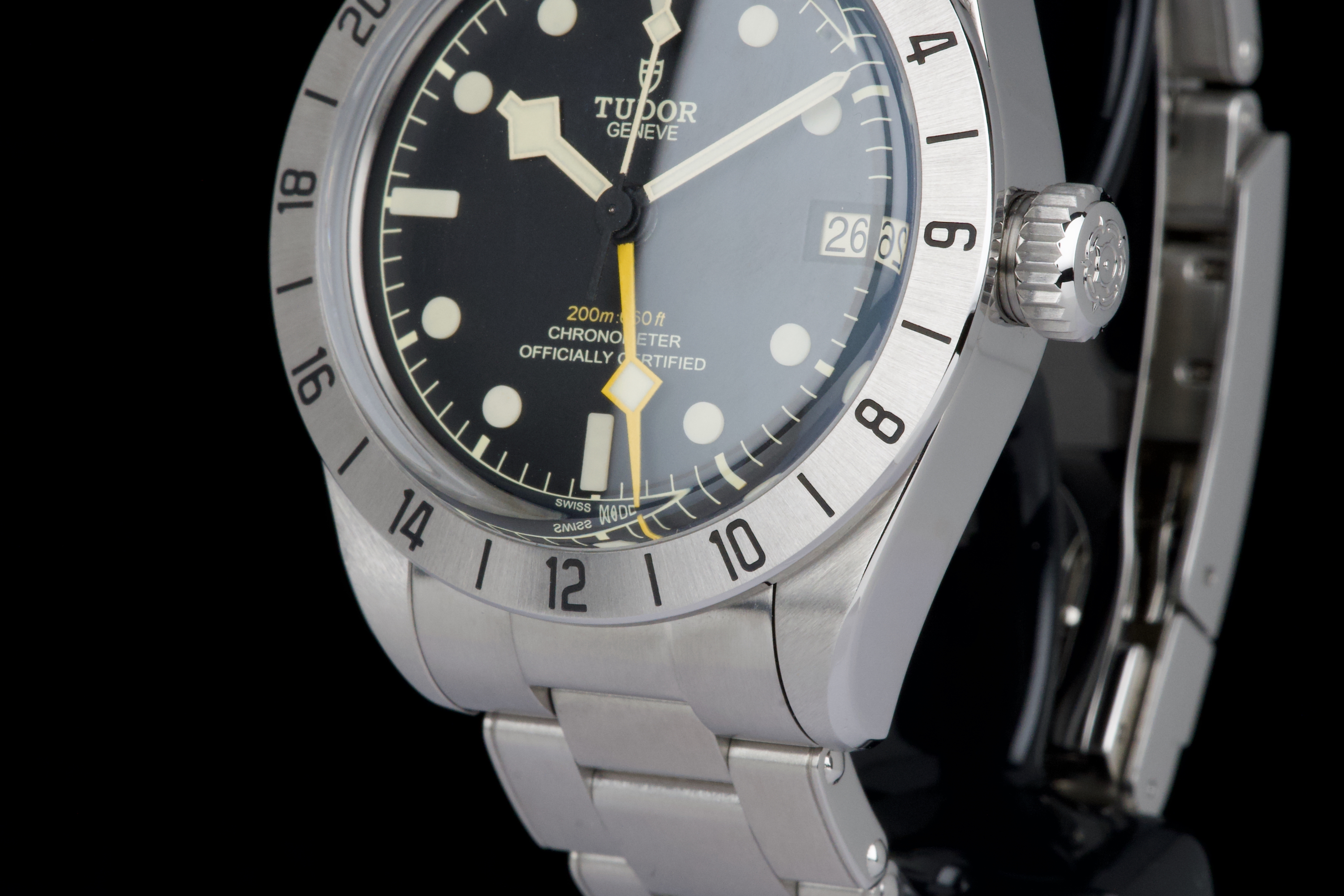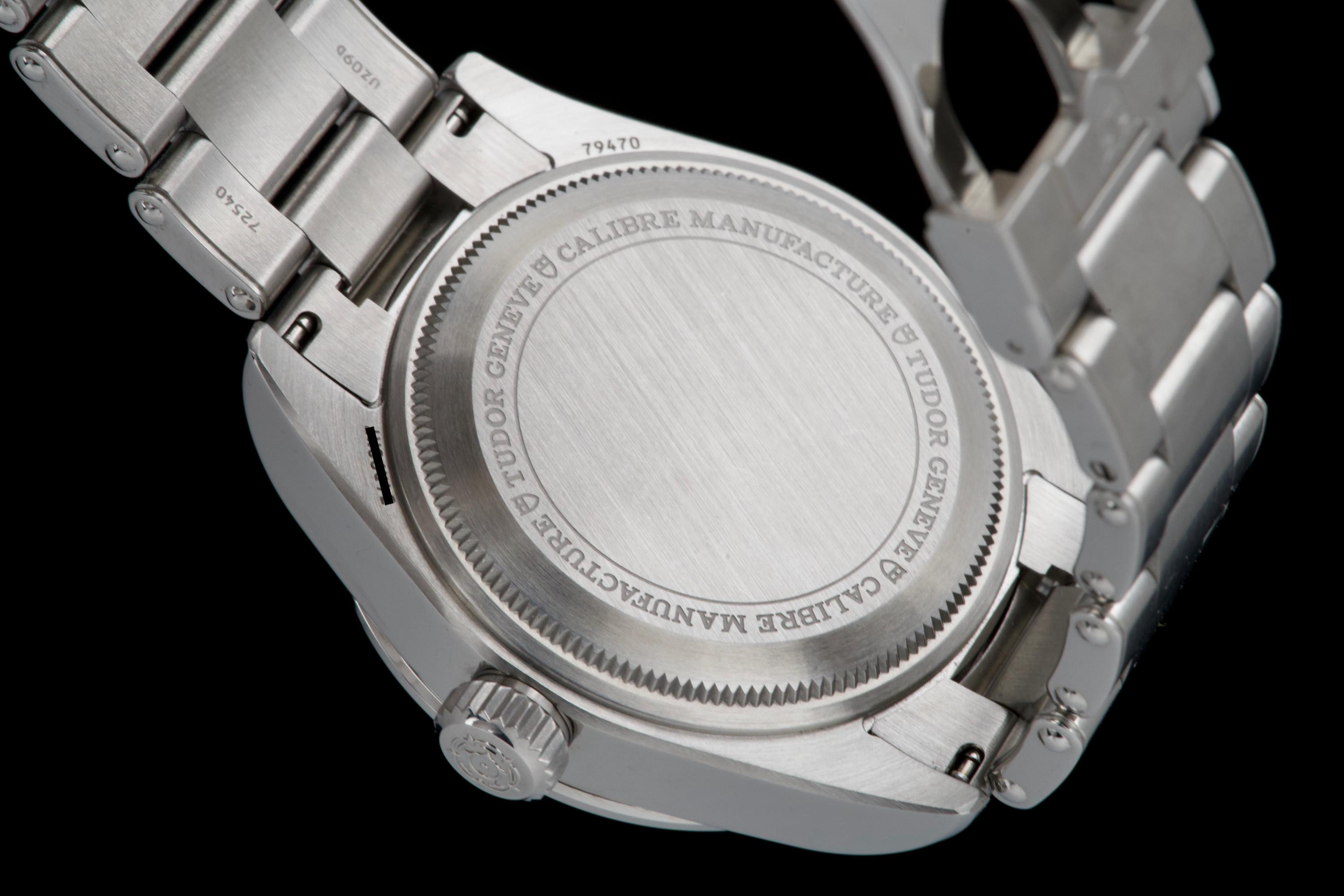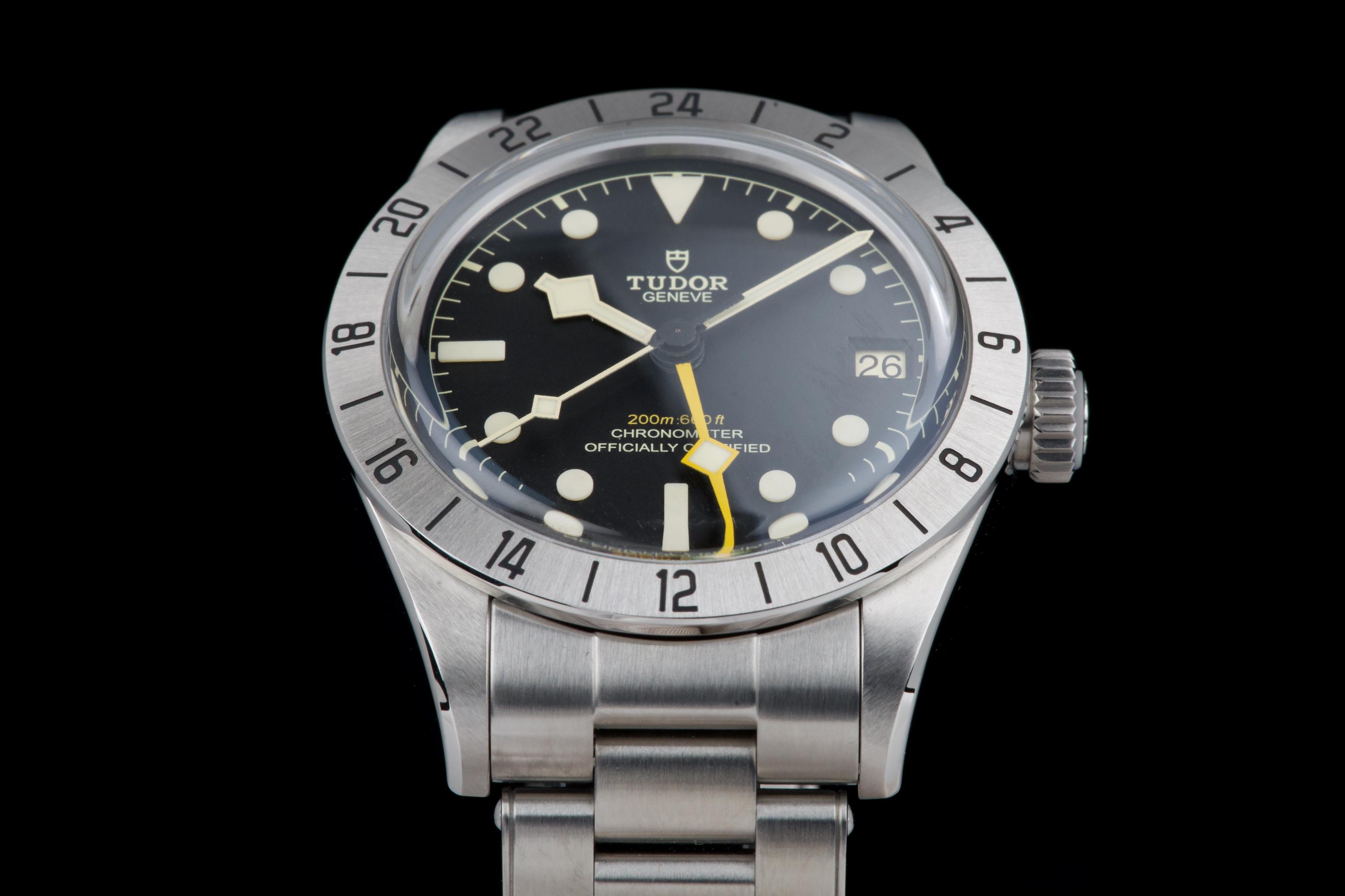 The Tudor Black Bay Pro 79470 is a modern tool watch with vintage soul, featuring a 39 mm steel case, fixed steel bezel, and an integrated GMT function powered by the in-house MT5652 movement. With its rugged design and compact proportions, it draws inspiration from iconic explorer watches of the past. This example was sold in 2023 and comes as a complete full set. The watch is unpolished and remains in excellent condition, showing only minimal signs of wear if no wear. A robust and versatile GMT with strong vintage character and modern reliability—ideal for daily wear or adventure.