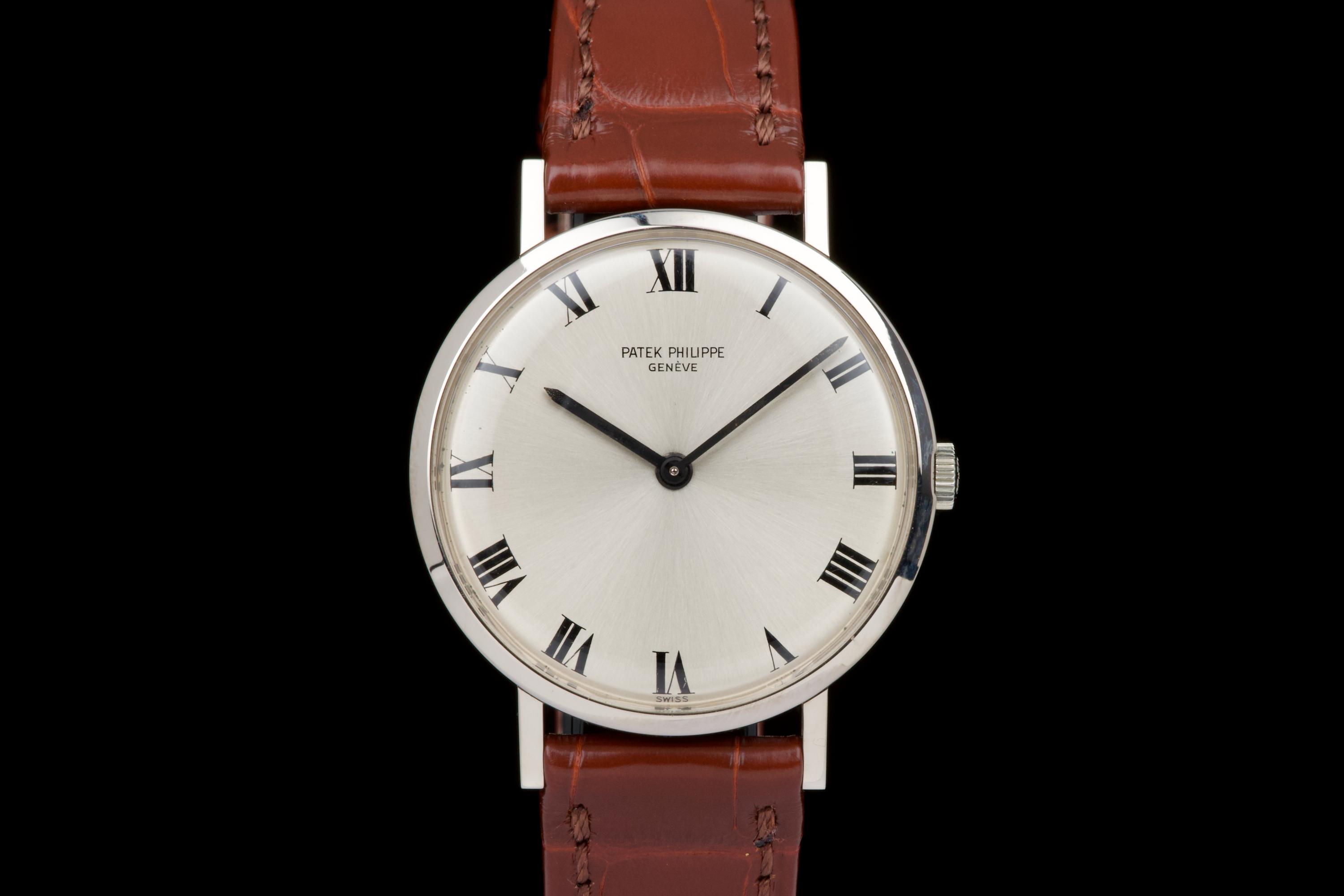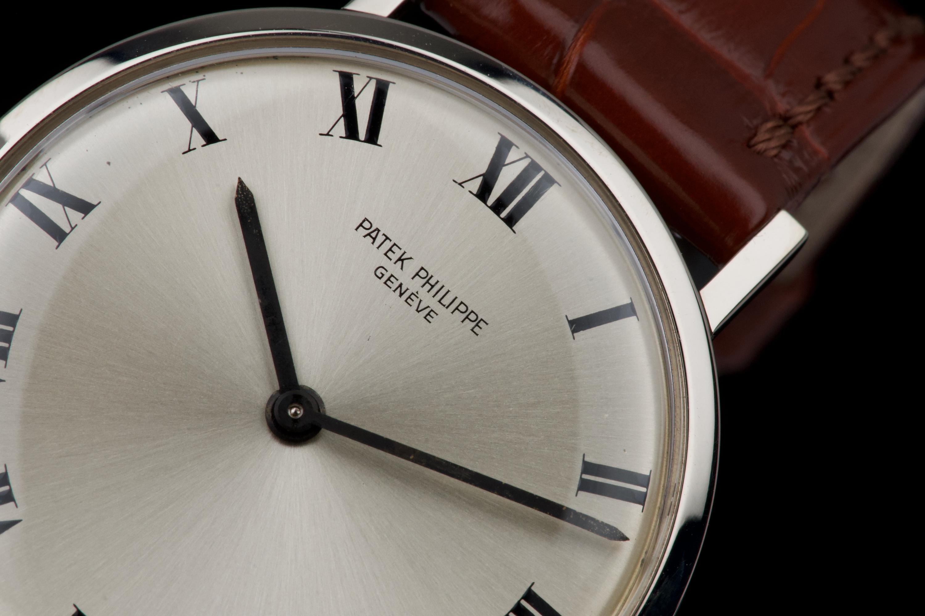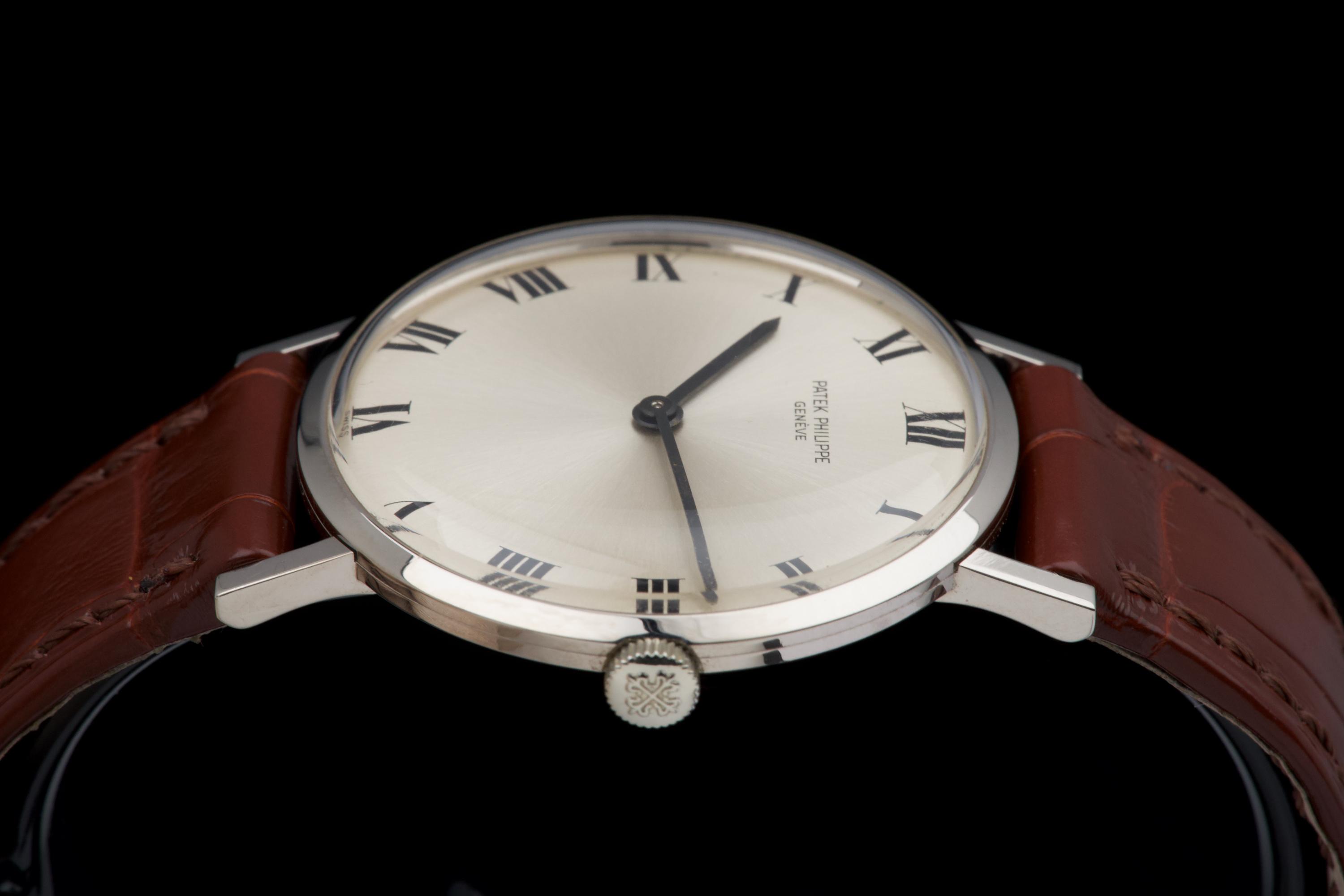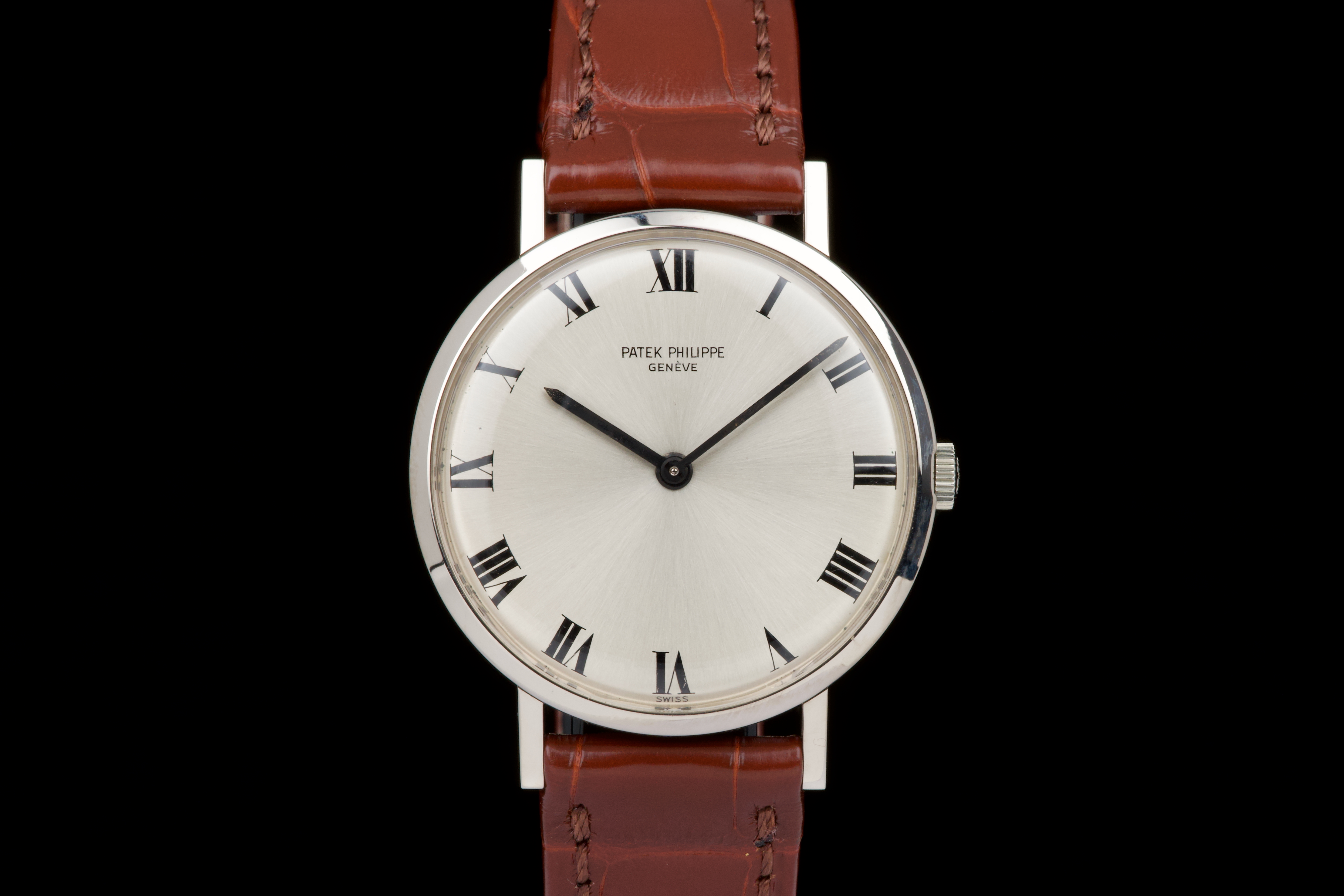 A beautiful vintage Patek Philippe Calatrava reference 3537G in 18K white gold, presented in excellent overall condition. The case shows very light signs of polishing and retains its original sharp profile. The original grey dial with Roman numerals is well preserved, showing only a few small and discreet dark spots on the right side. The hands are original and matching, completing the elegant vintage aesthetic. Fitted with its original white gold Patek Philippe tang buckle and a brand-new brown crocodile strap. The watch was recently serviced by an independent watchmaker and runs perfectly. A refined and timeless 1970s Calatrava — understated, elegant, and beautifully preserved.