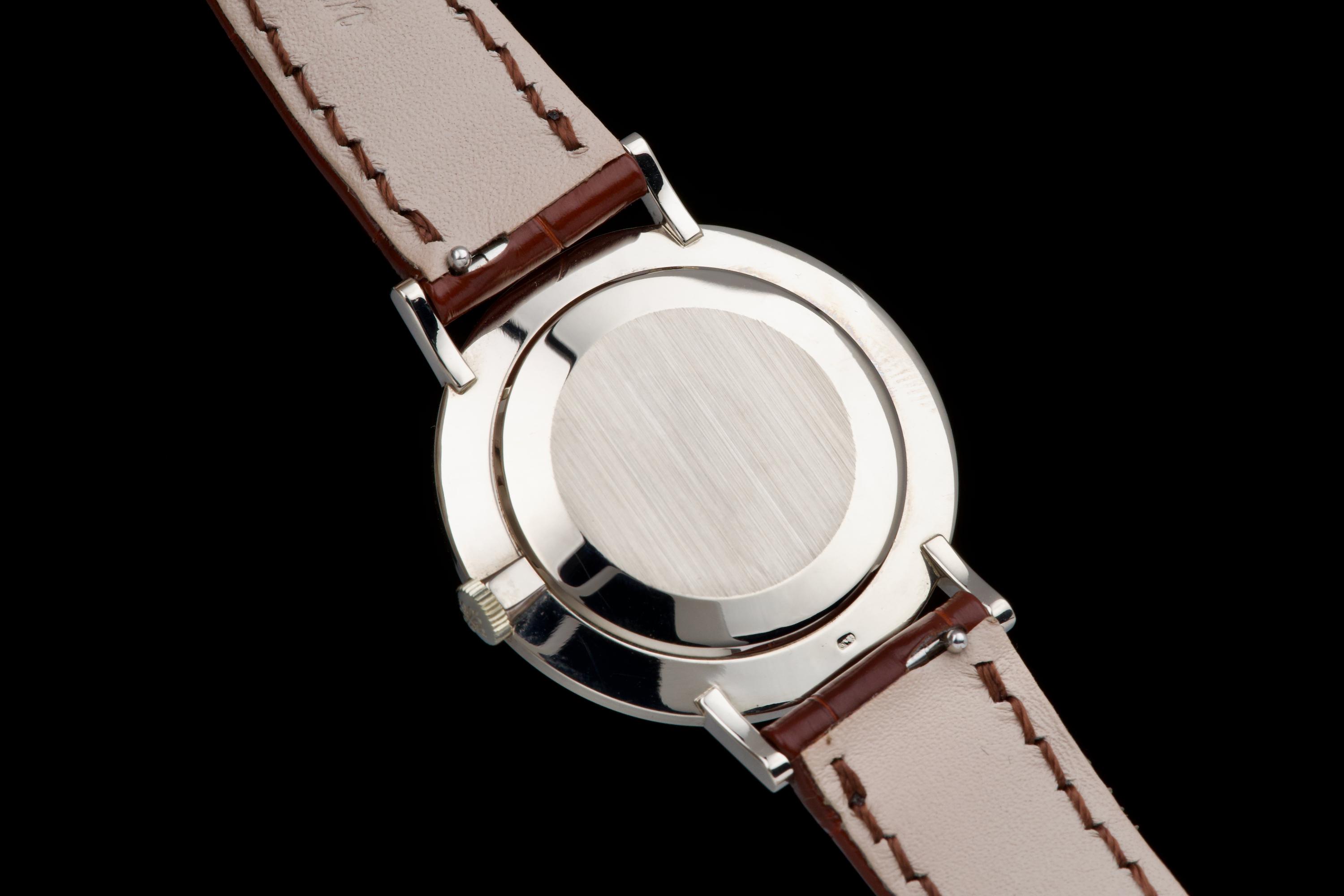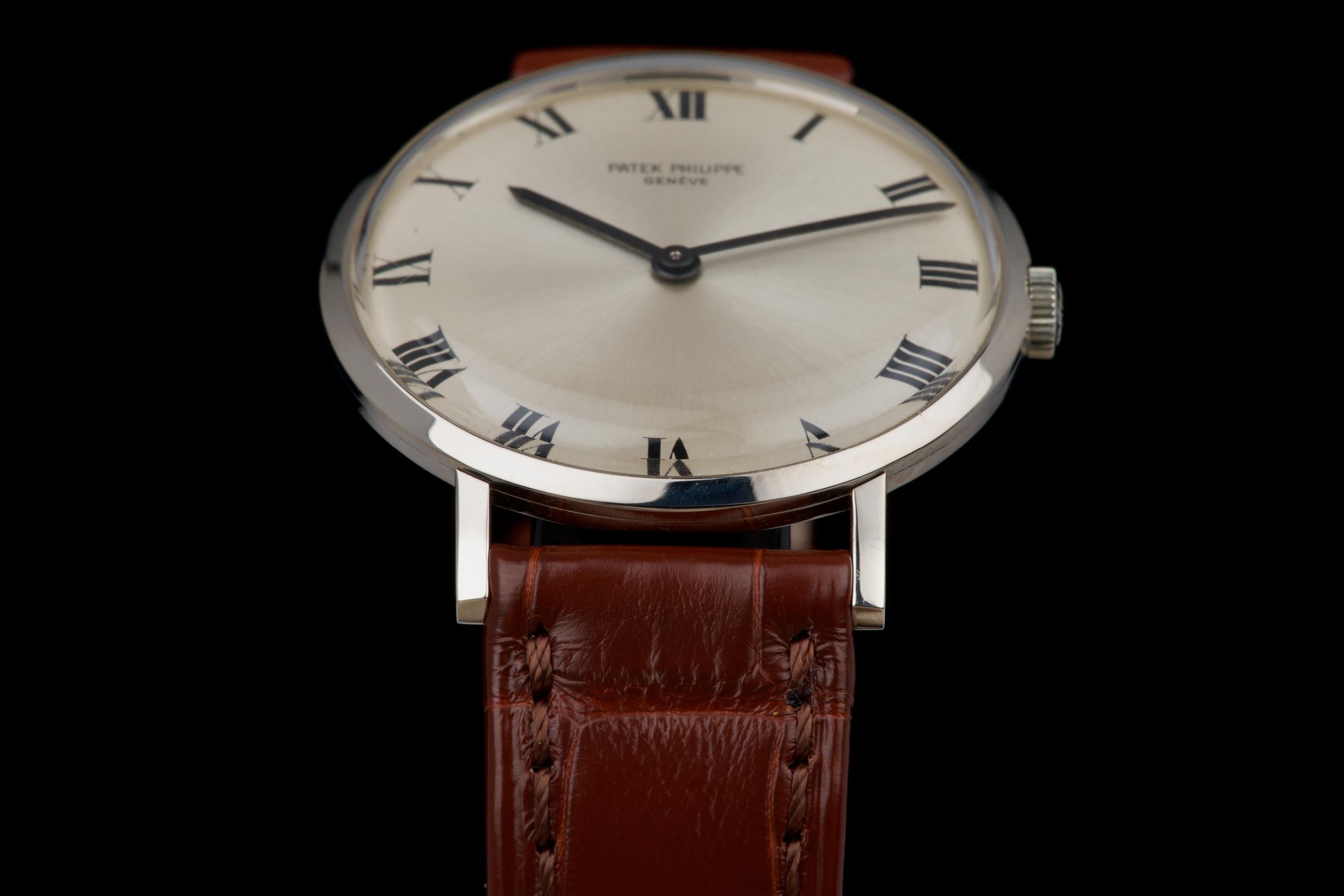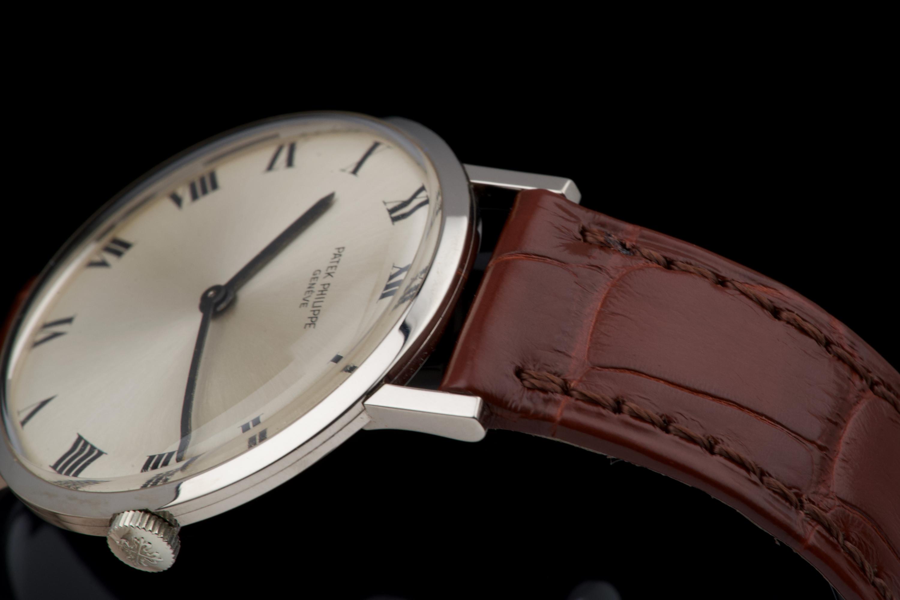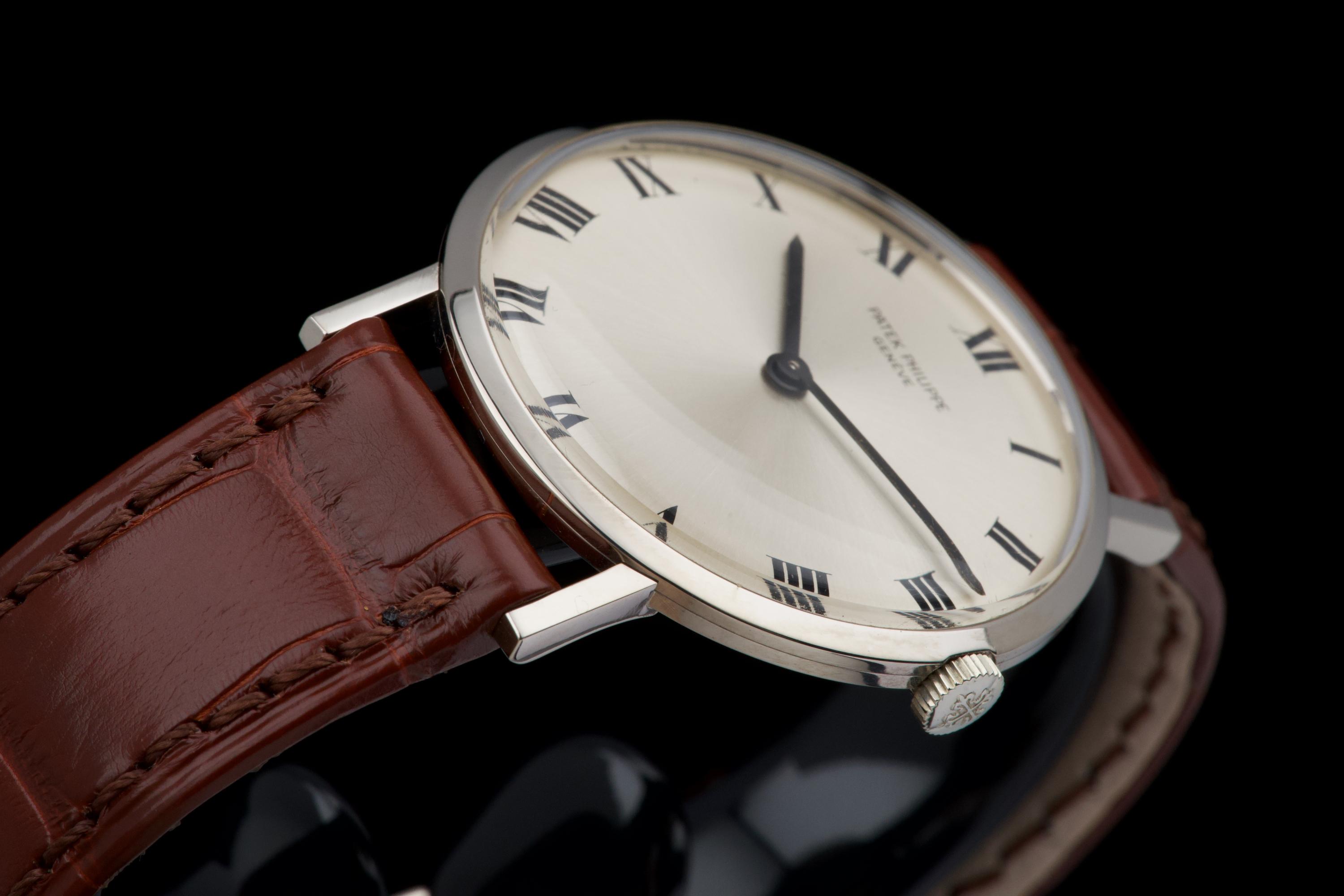 A beautiful vintage Patek Philippe Calatrava reference 3537G in 18K white gold, presented in excellent overall condition. The case shows very light signs of polishing and retains its original sharp profile. The original grey dial with Roman numerals is well preserved, showing only a few small and discreet dark spots on the right side. The hands are original and matching, completing the elegant vintage aesthetic. Fitted with its original white gold Patek Philippe tang buckle and a brand-new brown crocodile strap. The watch was recently serviced by an independent watchmaker and runs perfectly. A refined and timeless 1970s Calatrava — understated, elegant, and beautifully preserved.