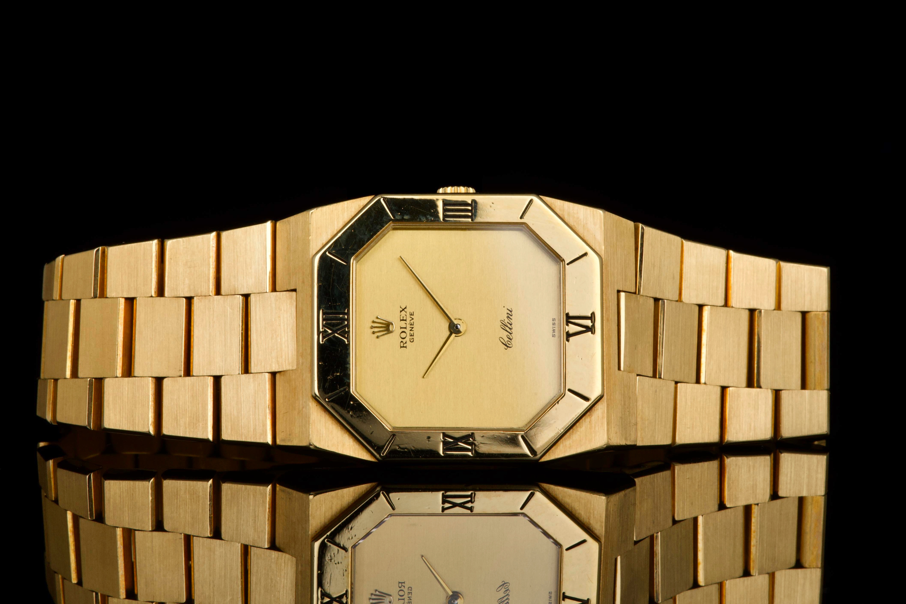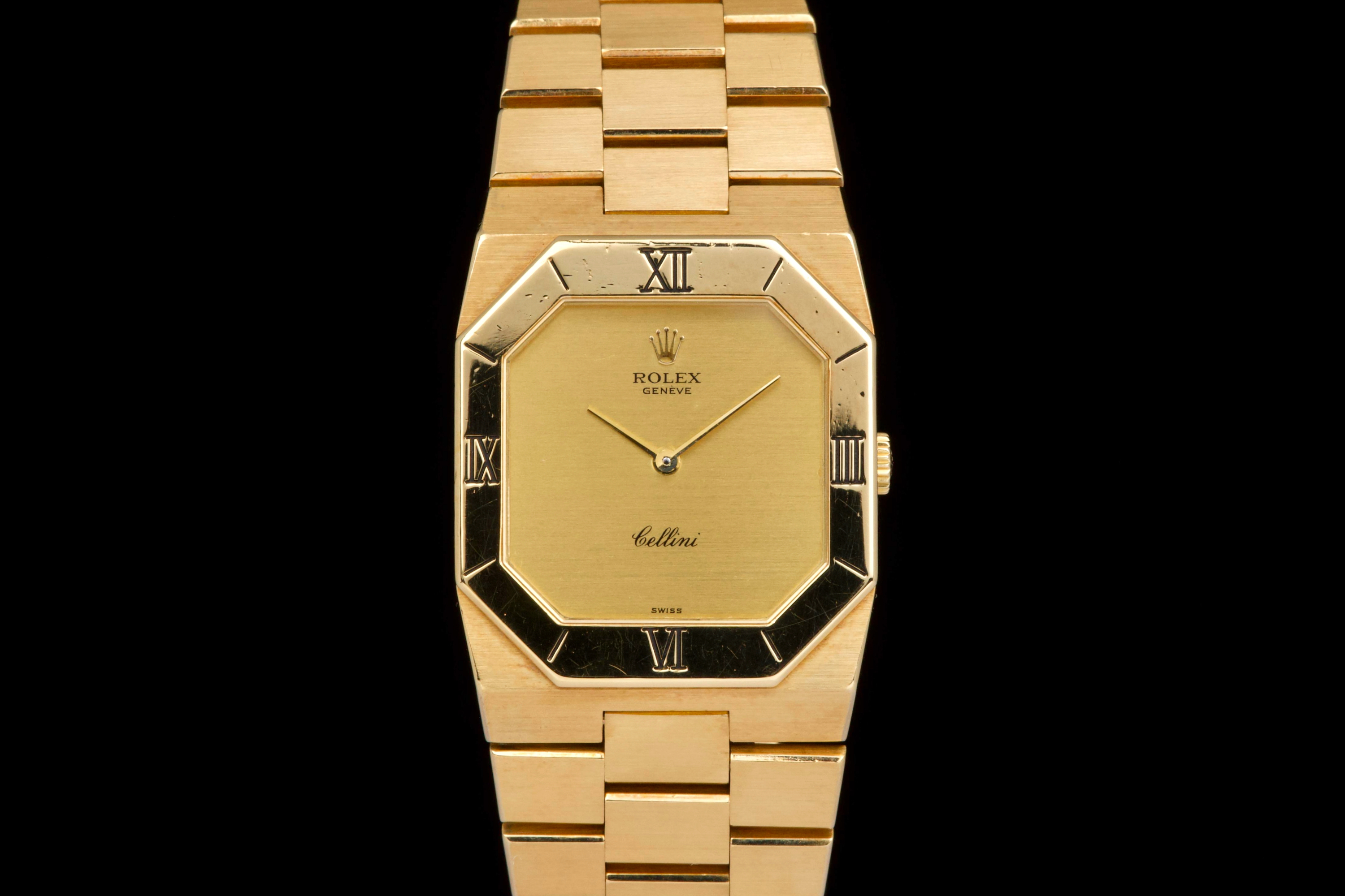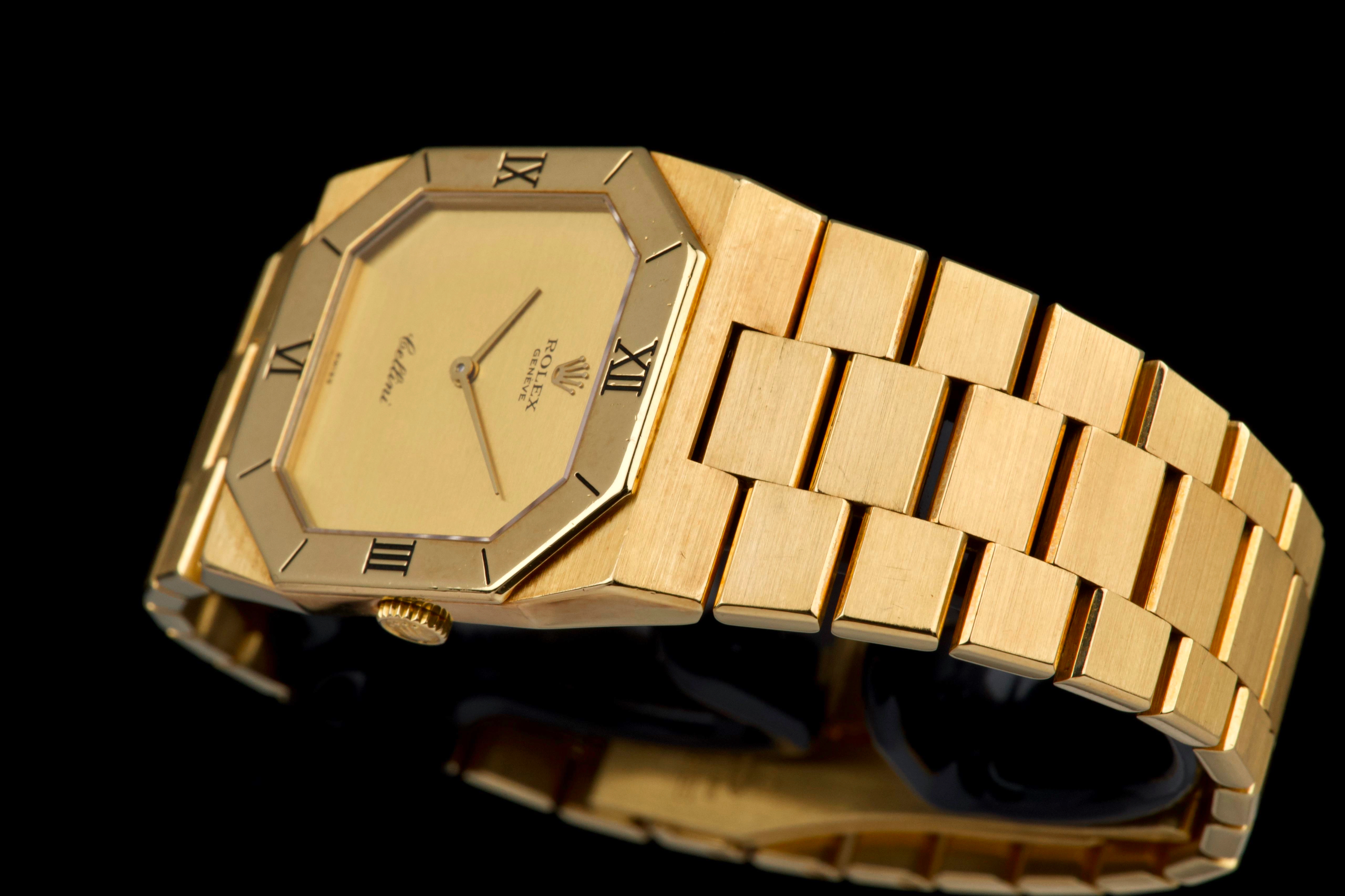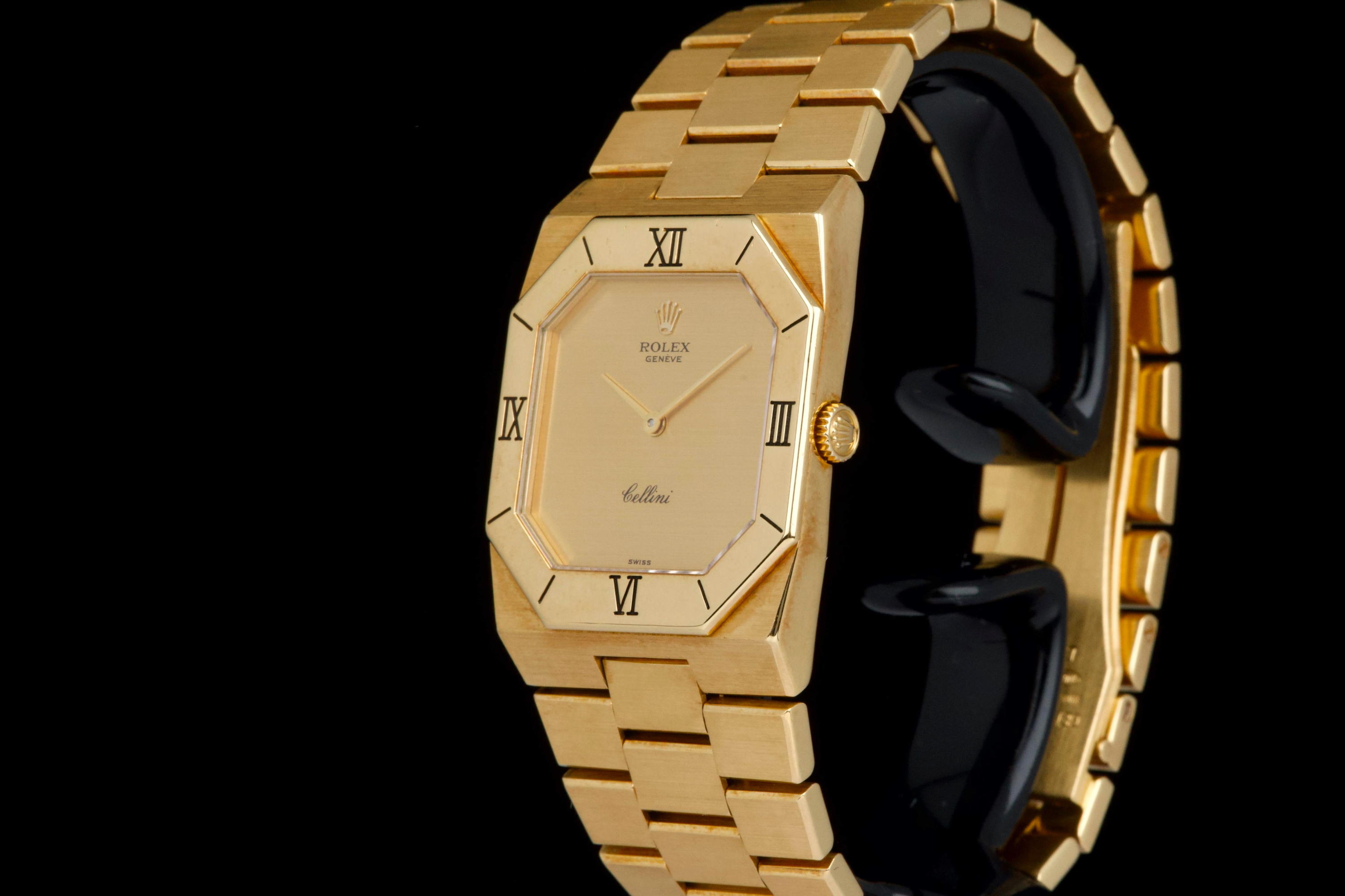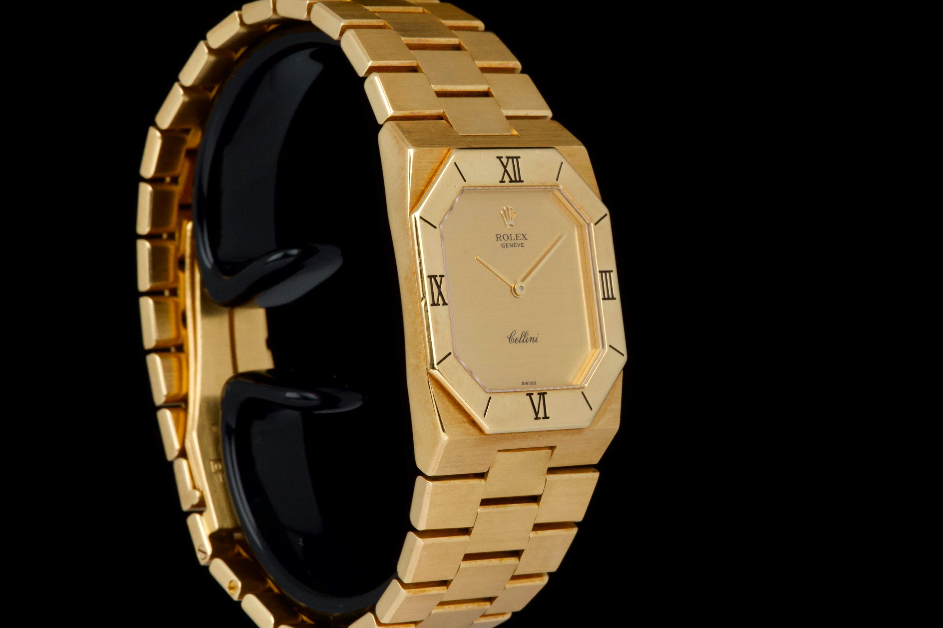 An elegant vintage Rolex Cellini reference 4350/8 in 18k yellow gold, dating to approximately 1981 (serial 69*****). This refined dress watch embodies the understated and classic aesthetic of the Cellini line. The case and bezel show visible wear, including light scratches and small marks, fully consistent with the age of the watch and adding to its vintage character. The watch has not been recently refinished. The champagne dial is in perfect condition, clean and well preserved, offering a timeless and minimalist look. Powered by a manual-winding movement, the watch has been maintained and comes with a Rolex service card dated 2019, providing reassurance regarding its functionality. The watch is fitted with its original bracelet, showing some stretch as expected for its age, and completed by a clasp stamped D. A charming and honest vintage Cellini in yellow gold, combining classic Rolex elegance with a well-preserved dial and desirable vintage appeal.