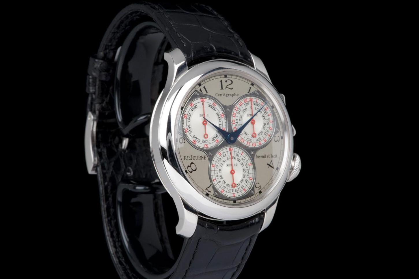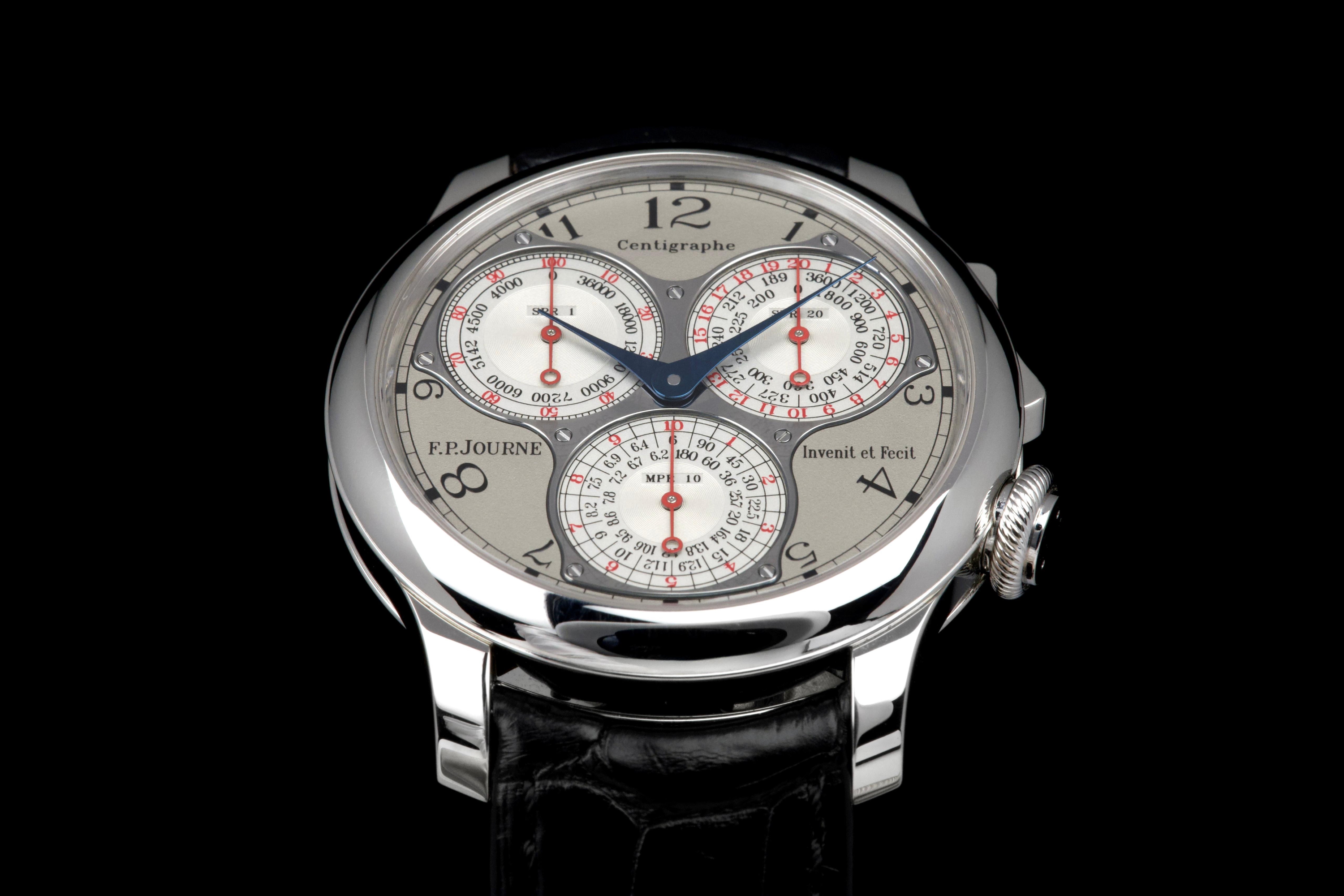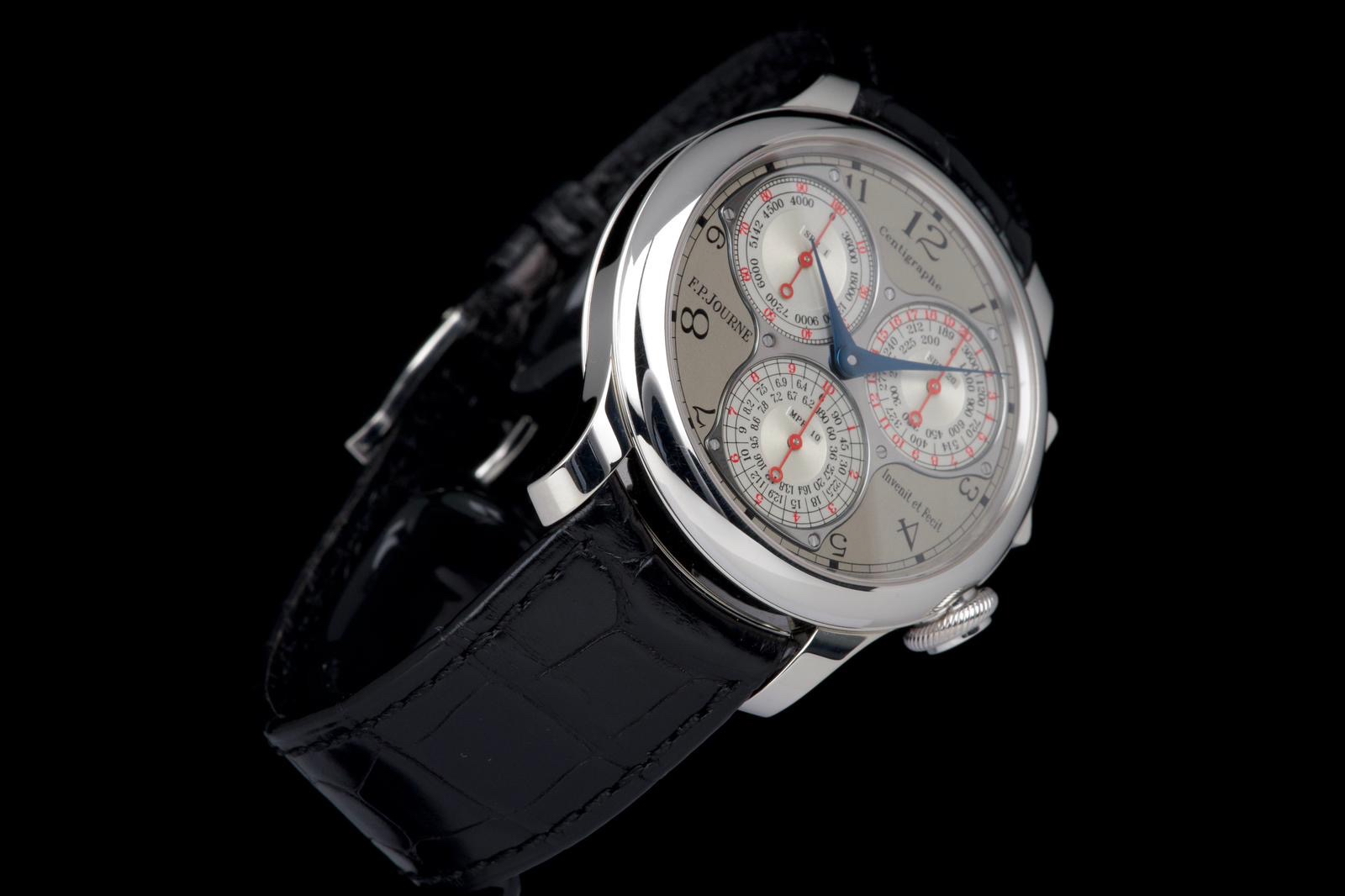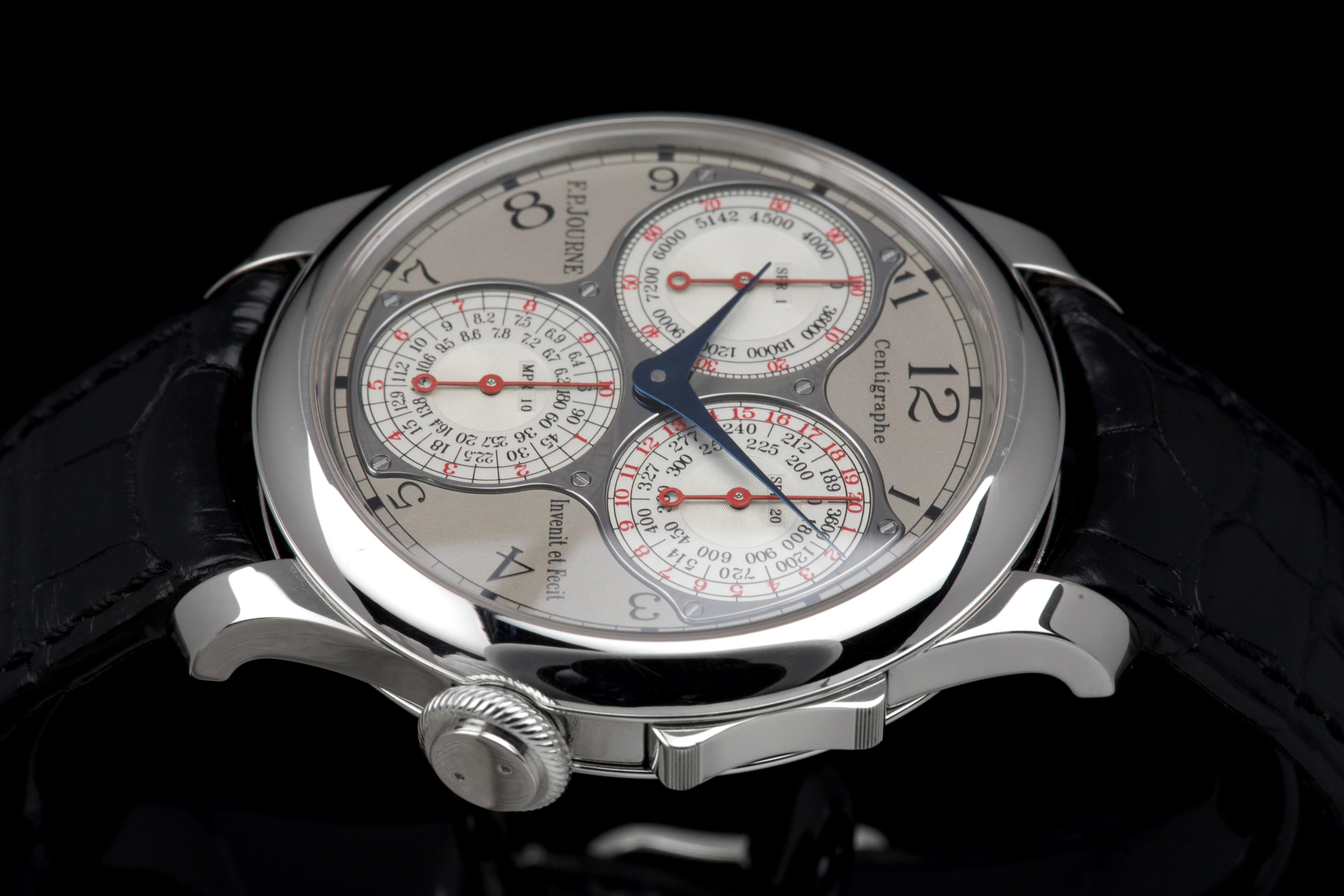 The present François-Paul Journe Centigraphe in platinum, dating to circa 2013, is a highly compelling example of the independent watchmaker’s most technically innovative and intellectually engaging creations. Executed in platinum, the watch perfectly reflects Journe’s uncompromising approach to haute horlogerie, combining mechanical originality with restrained and timeless elegance. The watch appears to have never been polished and is preserved in excellent overall condition, retaining crisp case lines and a strong, well-defined presence on the wrist. It is in excellent working order at the time of cataloguing. While no service history accompanies the watch, its mechanical performance is sound and consistent. The Centigraphe complication is one of François-Paul Journe’s signature inventions, offering a unique chronograph architecture with independent one-second, twenty-second, and ten-minute counters, each driven directly by the movement. This unconventional construction allows for exceptional precision and clarity while showcasing Journe’s distinctive horological philosophy and technical creativity. The watch is fitted with a black alligator leather strap and a platinum ardillon buckle, completing the ensemble with understated coherence and elegance. It is delivered with its original presentation box only; the original papers are not present. Rare, mechanically fascinating, and preserved in honest, seemingly unpolished condition, this platinum Centigraphe from circa 2013 represents a significant opportunity to acquire an important and highly respected work from one of the most influential independent watchmakers of the modern era