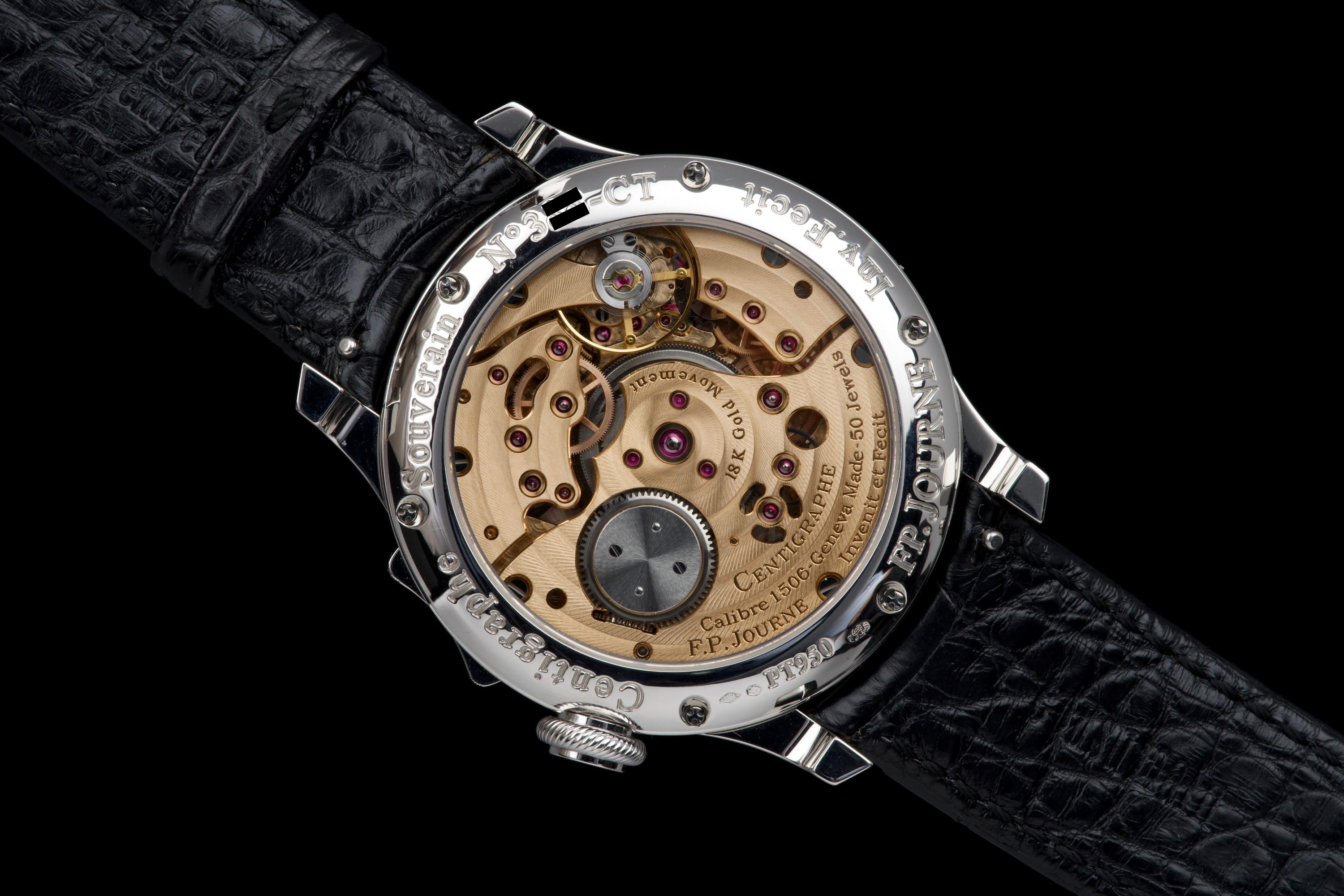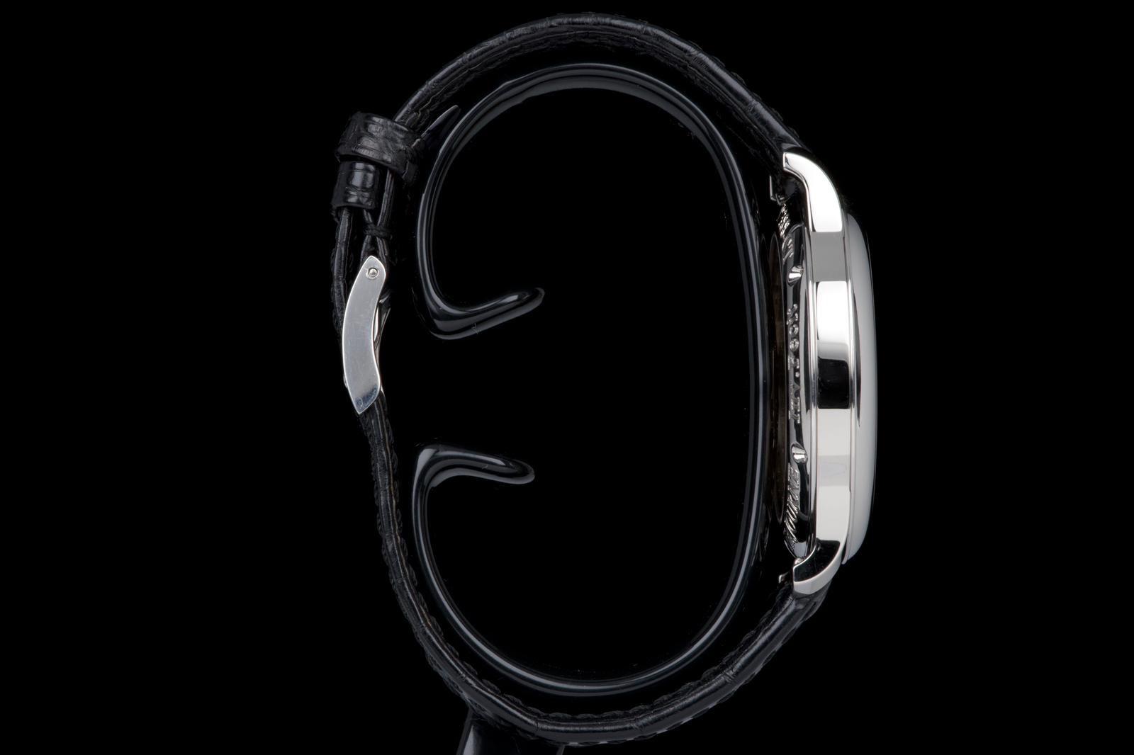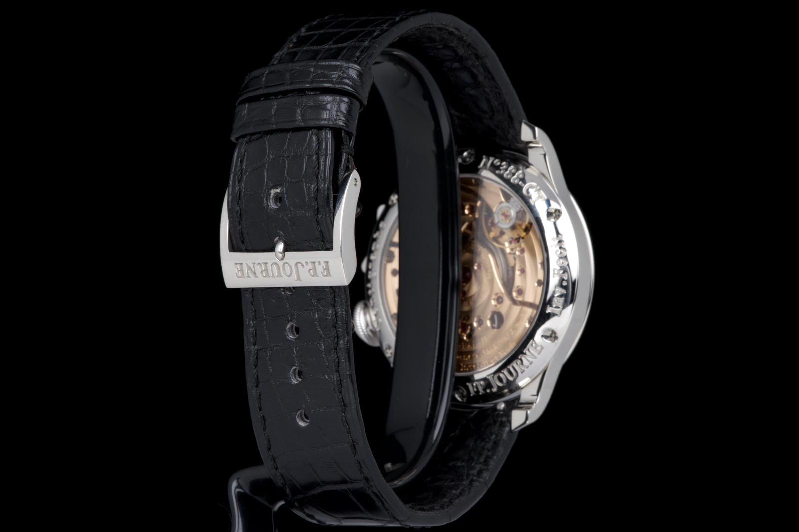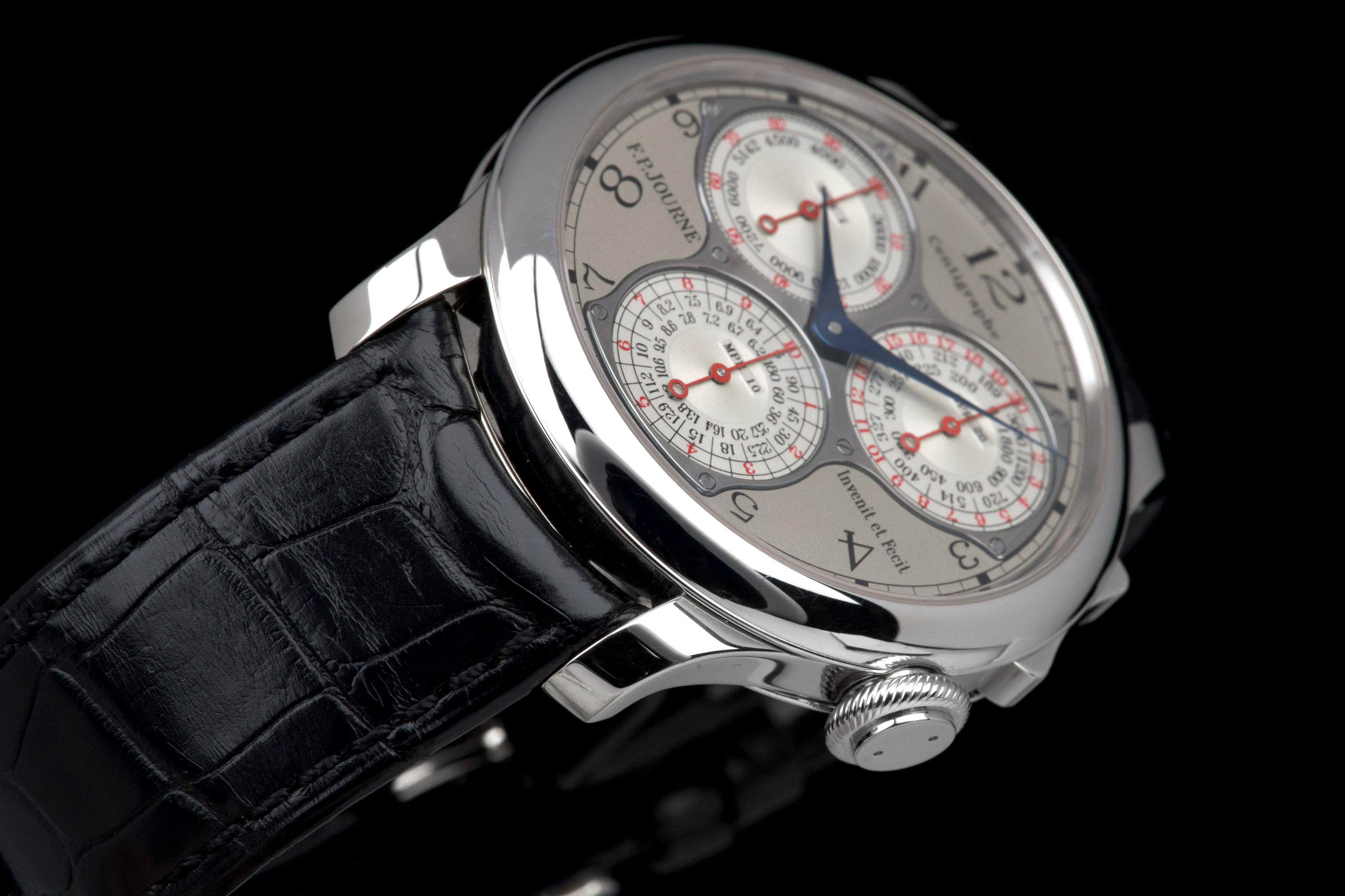 The present François-Paul Journe Centigraphe in platinum, dating to circa 2013, is a highly compelling example of the independent watchmaker’s most technically innovative and intellectually engaging creations. Executed in platinum, the watch perfectly reflects Journe’s uncompromising approach to haute horlogerie, combining mechanical originality with restrained and timeless elegance. The watch appears to have never been polished and is preserved in excellent overall condition, retaining crisp case lines and a strong, well-defined presence on the wrist. It is in excellent working order at the time of cataloguing. While no service history accompanies the watch, its mechanical performance is sound and consistent. The Centigraphe complication is one of François-Paul Journe’s signature inventions, offering a unique chronograph architecture with independent one-second, twenty-second, and ten-minute counters, each driven directly by the movement. This unconventional construction allows for exceptional precision and clarity while showcasing Journe’s distinctive horological philosophy and technical creativity. The watch is fitted with a black alligator leather strap and a platinum ardillon buckle, completing the ensemble with understated coherence and elegance. It is delivered with its original presentation box only; the original papers are not present. Rare, mechanically fascinating, and preserved in honest, seemingly unpolished condition, this platinum Centigraphe from circa 2013 represents a significant opportunity to acquire an important and highly respected work from one of the most influential independent watchmakers of the modern era