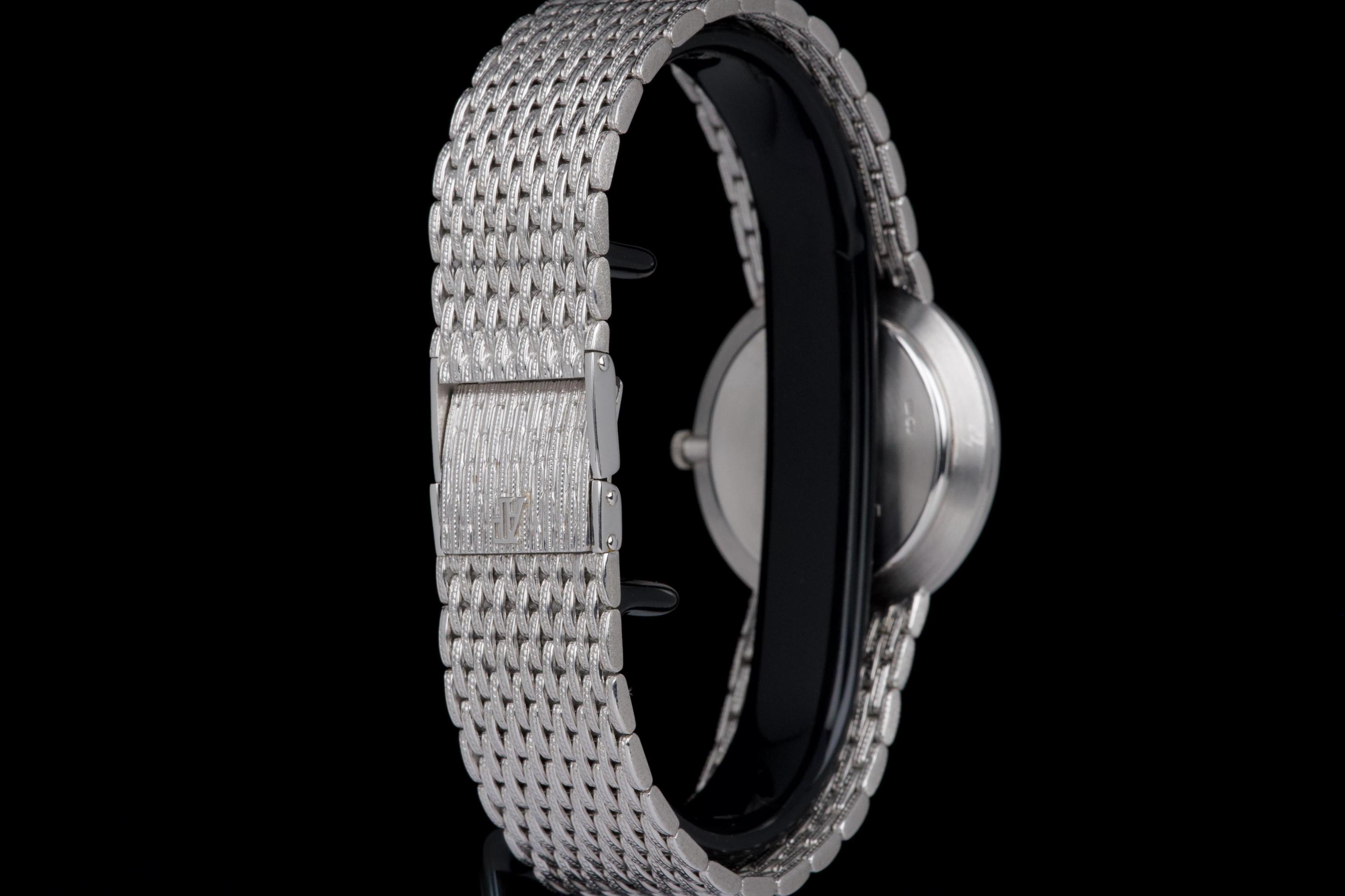The present Audemars Piguet Classic reference 14549BC, dating to the 1970s, is an exceptionally rare and striking white-gold bracelet watch that perfectly reflects the bold and luxurious aesthetic of the era. Executed entirely in 18K white gold, the watch features a 31 mm round case set with a brilliant diamond-set bezel and a spectacular pavé diamond dial, creating a dazzling and highly refined appearance. The watch is further distinguished by its integrated “paillasson”-style white-gold bracelet, seamlessly soldered to the case and fully signed Audemars Piguet. The bracelet is generously proportioned and can accommodate wrists of up to approximately 19 cm, making it particularly comfortable despite its jewelry-like construction. The watch is powered by a manual-winding movement, consistent with the elegant, ultra-refined nature of high-jewelry watches produced by the manufacture during this period. It is likely that the watch has been recently serviced and polished by Audemars Piguet, as it is accompanied by a service presentation box, although no service invoice is present. The watch is preserved in excellent overall condition, with the diamonds, case, and bracelet presenting beautifully. Rare, luxurious, and emblematic of the daring design language of the 1970s, this Audemars Piguet reference 14549BC represents a remarkable opportunity to acquire an unusual and highly collectible vintage high-jewelry wristwatch from one of Switzerland’s most prestigious manufactures.