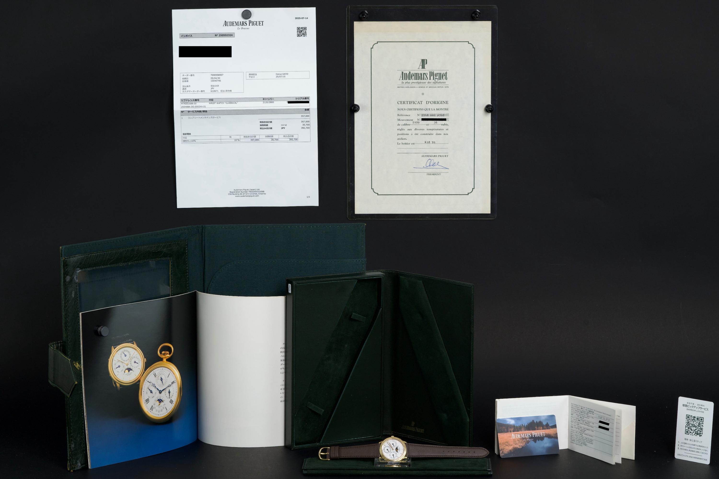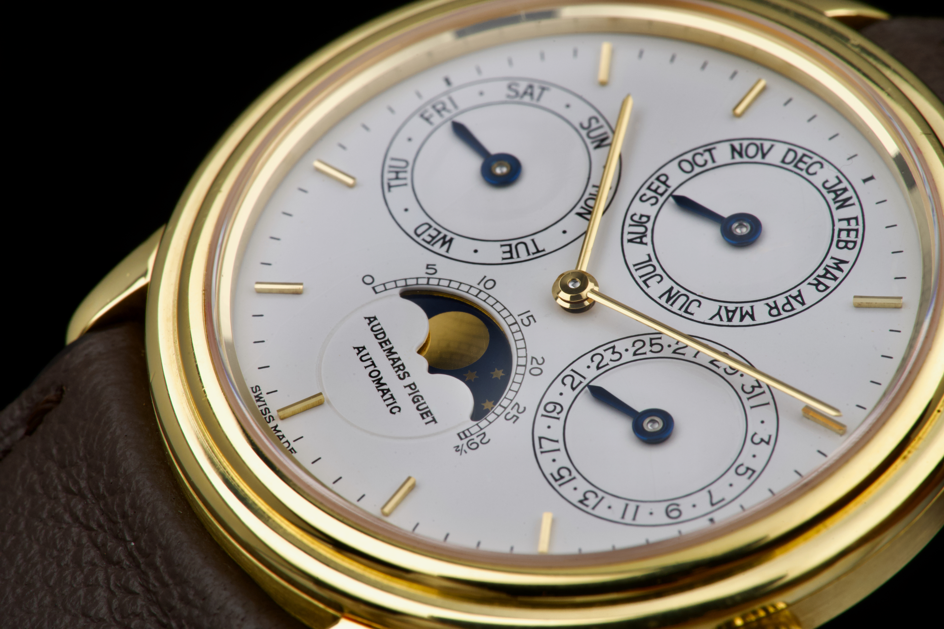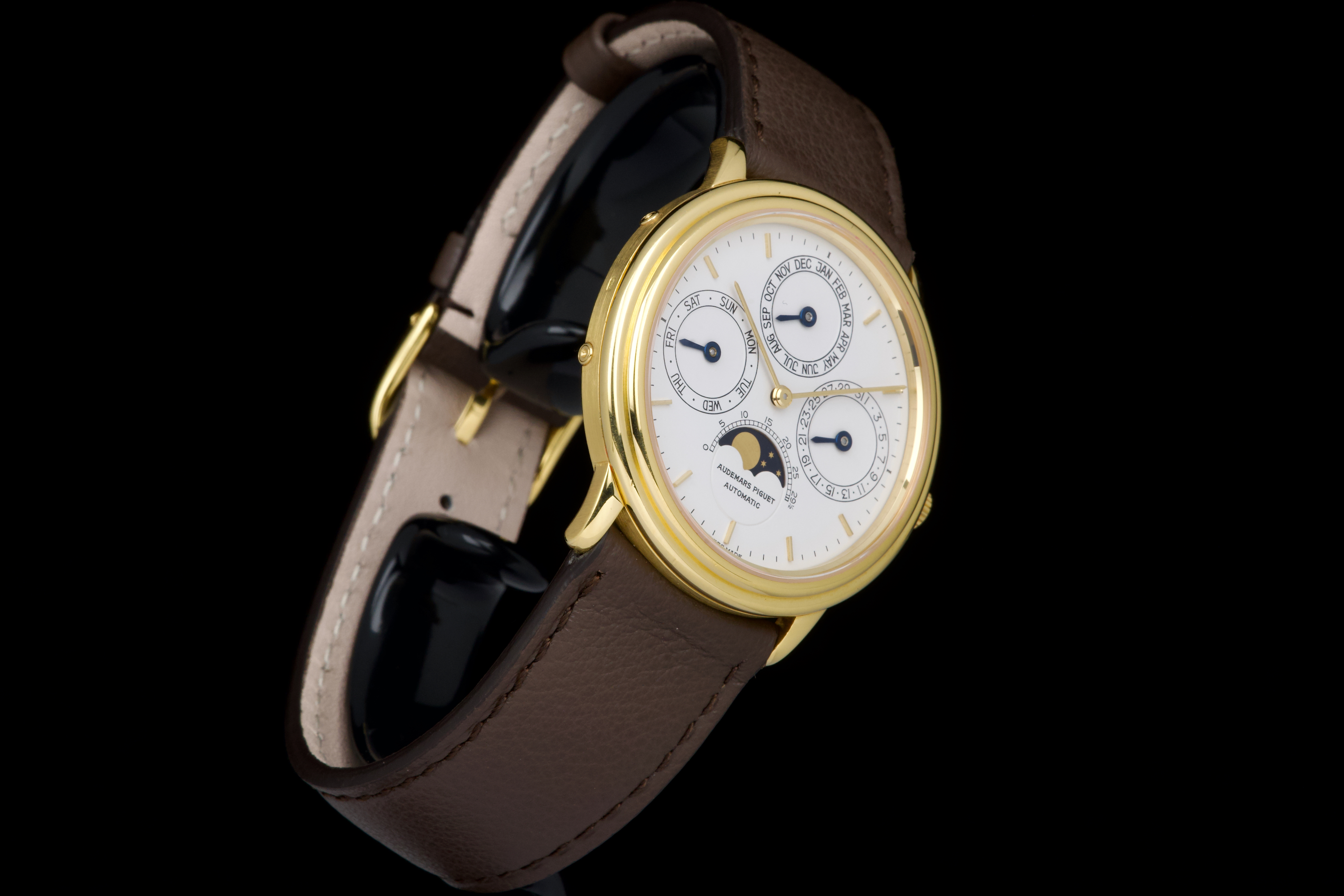An extraordinary and museum-grade example of the Audemars Piguet Perpetual Calendar reference 5548BA, one of the very first automatic perpetual calendar wristwatches ever produced by Audemars Piguet. This piece belongs to the desirable B-series, placing its production in the late 1970s, and is accompanied by an exceptionally complete and historically rich set. Included are the original box, period Japanese catalogue folder, leather document holder, original certificate, and the original warranty (undated). The watch also comes with Audemars Piguet Japan service papers from 2025, confirming a movement service only (no polishing), preserving the original sharp case geometry. The 18k yellow-gold case is in superb condition, with deep and crisp hallmarks. The white enamel dial is exceptional, showing only a few microscopic hairlines invisible to the naked eye — a normal and completely acceptable characteristic of enamel dials from this era. It is fitted with its original yellow-gold AP buckle and a new (non-AP) leather strap. With only 2066 pieces produced in yellow gold across the 5548/25548 family, this model is one of the most important and collectible early AP perpetual calendars, representing the birth of the ultra-thin automatic QP lineage that later defined the brand. A truly outstanding example — unparalleled condition, a phenomenal set, and a historically significant perpetual calendar from the golden age of Audemars Piguet.