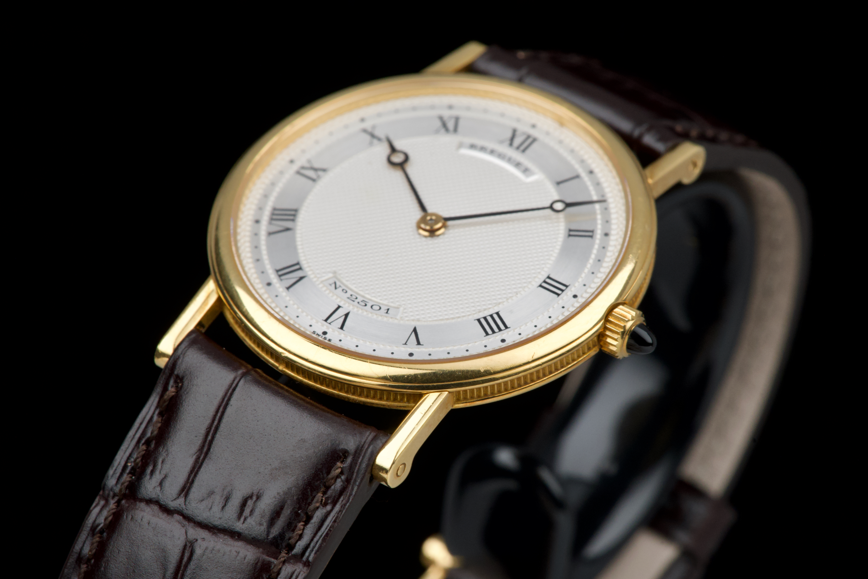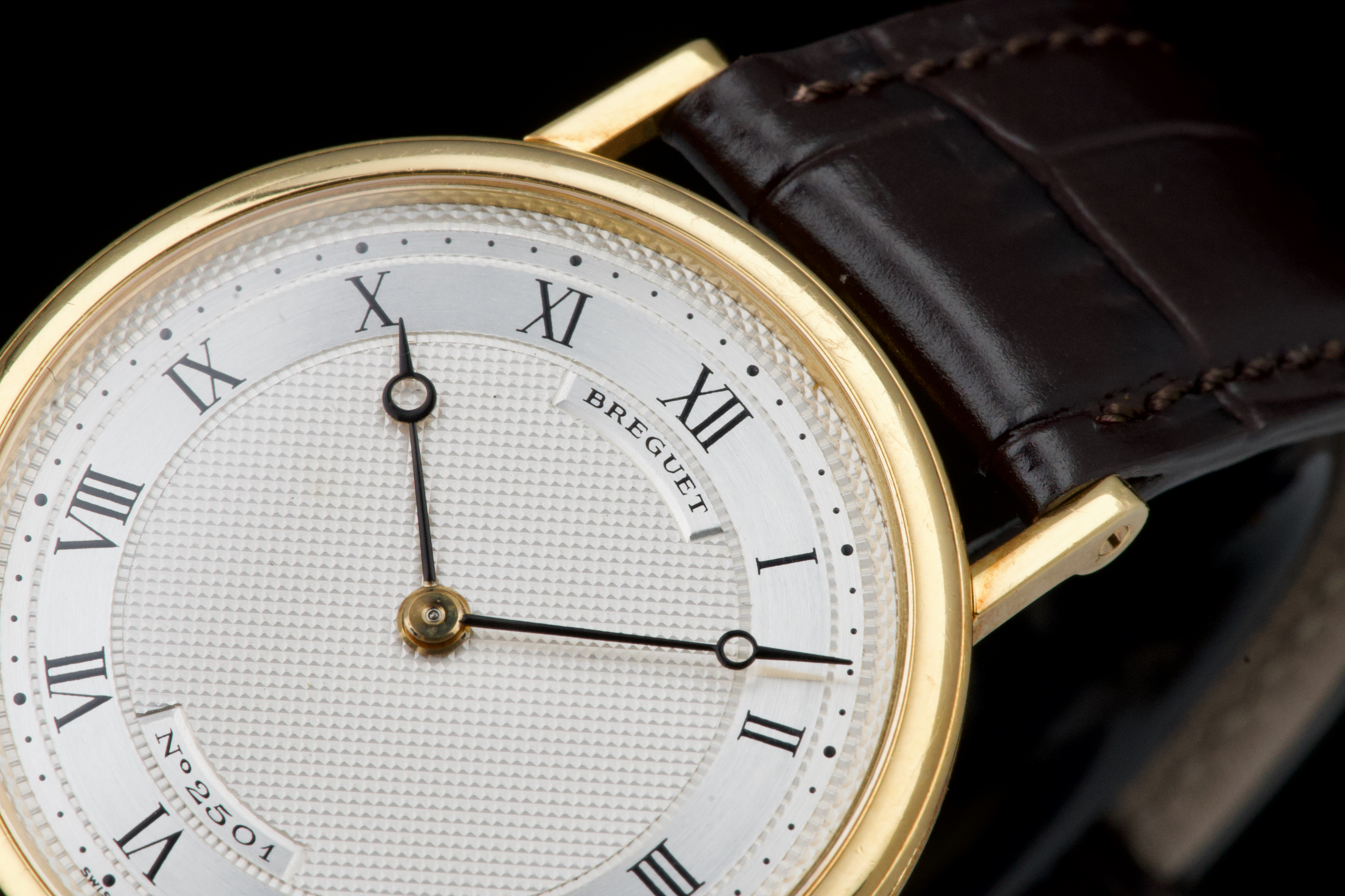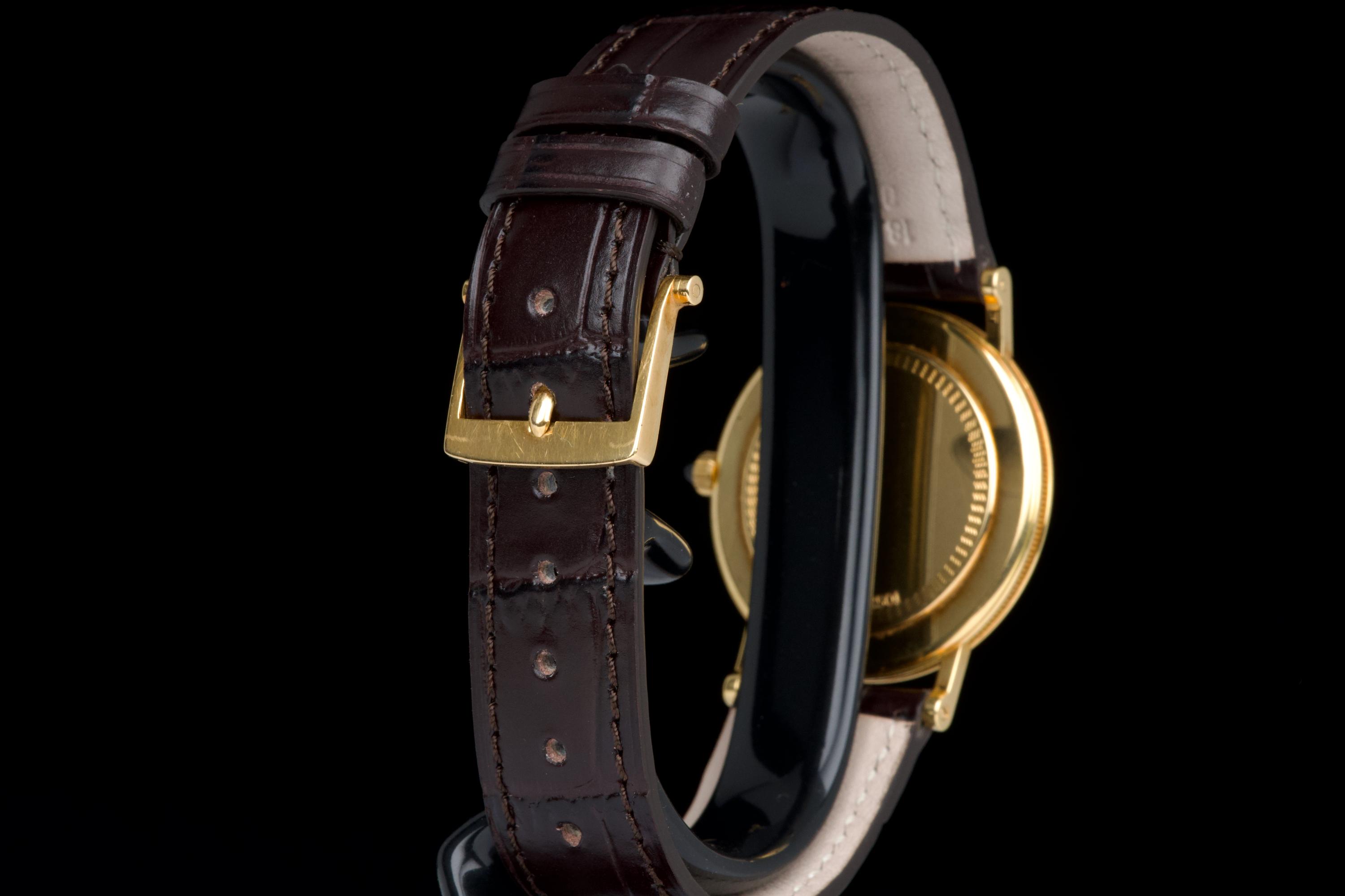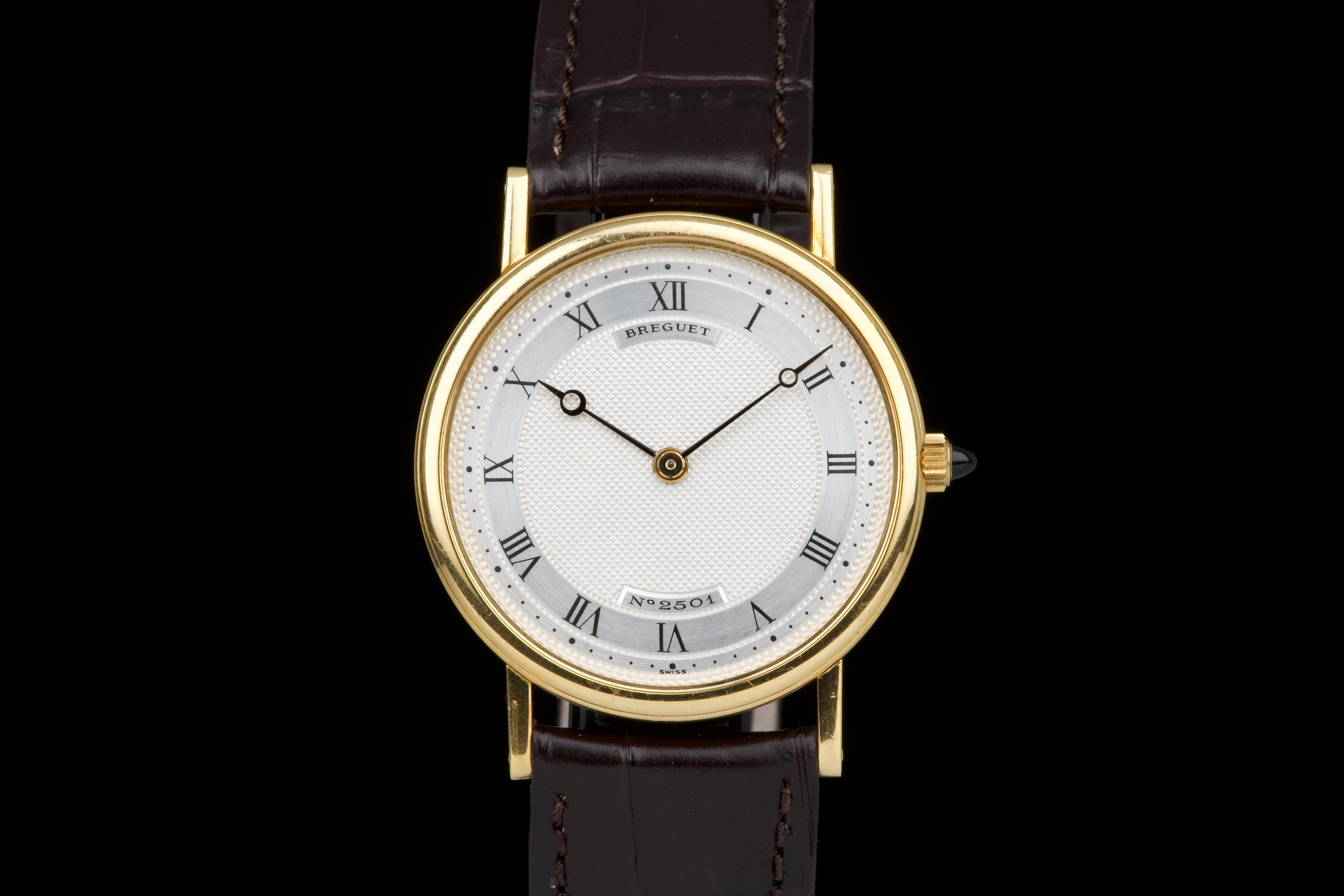 The present Breguet Classique reference 3150, measuring 32.5 mm and dating from the 1980s, is a refined and elegant example of Breguet’s traditional watchmaking, offered with particularly appealing original-owner provenance. The gold case appears to be unpolished and shows light wear consistent with age and careful use, retaining crisp lines and the discreet elegance characteristic of Breguet’s classical proportions from this period. Its modest diameter reflects the era’s aesthetic while offering timeless wearability. The dial is especially attractive, featuring a finely guilloché centre contrasted by brushed metal-style concentric ringsbearing Roman numerals, a layout that beautifully illustrates Breguet’s mastery of texture, depth, and legibility. The overall dial presentation remains in excellent condition, with strong visual balance and classical harmony. The watch is fitted with a brand-new dark brown alligator leather strap (non-Breguet), paired with its original gold tang buckle, maintaining material and period coherence. No service history accompanies the watch. Elegant, understated, and preserved with honest originality, this Breguet Classique 3150 represents a compelling opportunity to acquire a well-preserved 1980s Breguet with strong provenance, refined dial work, and enduring classical appeal.