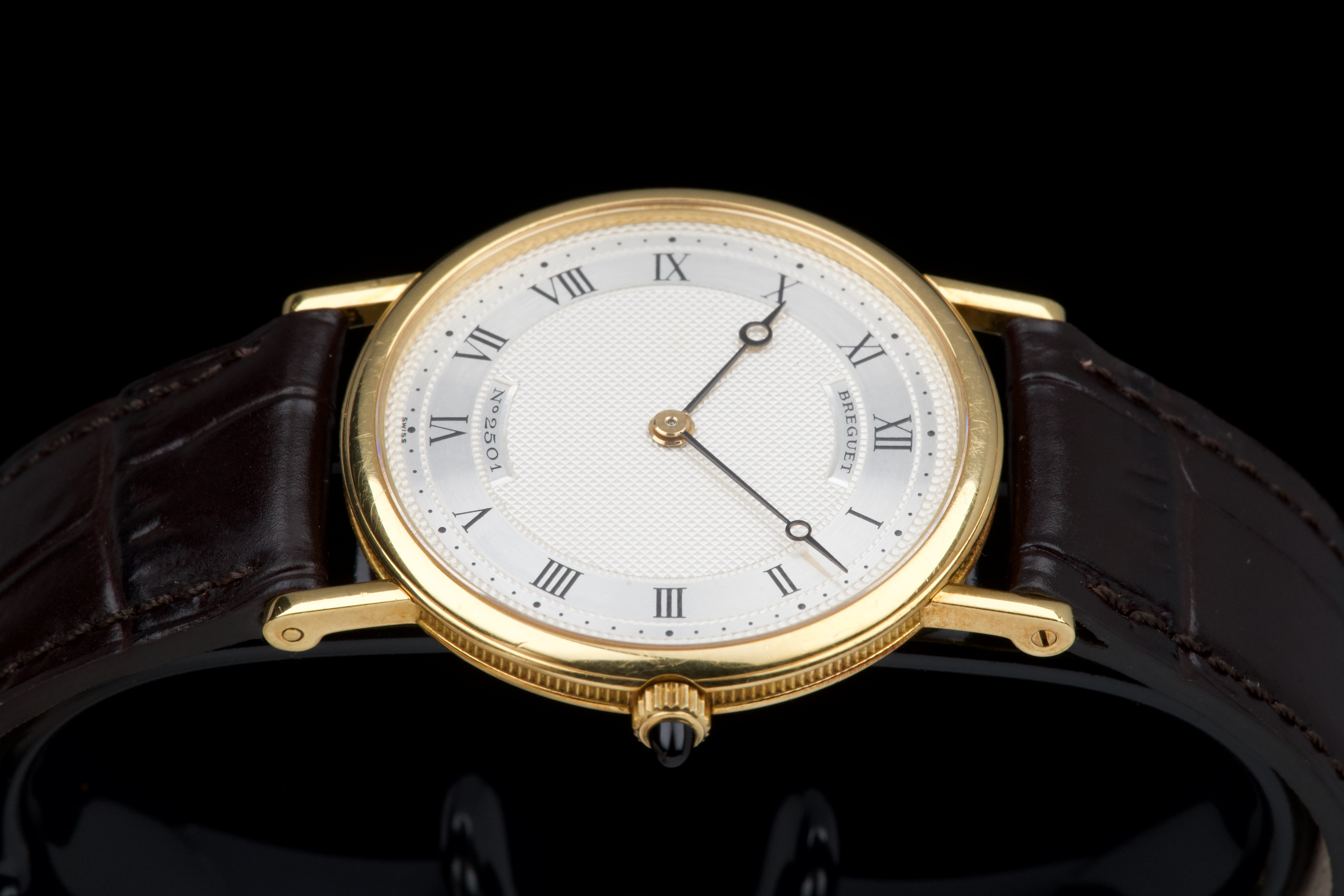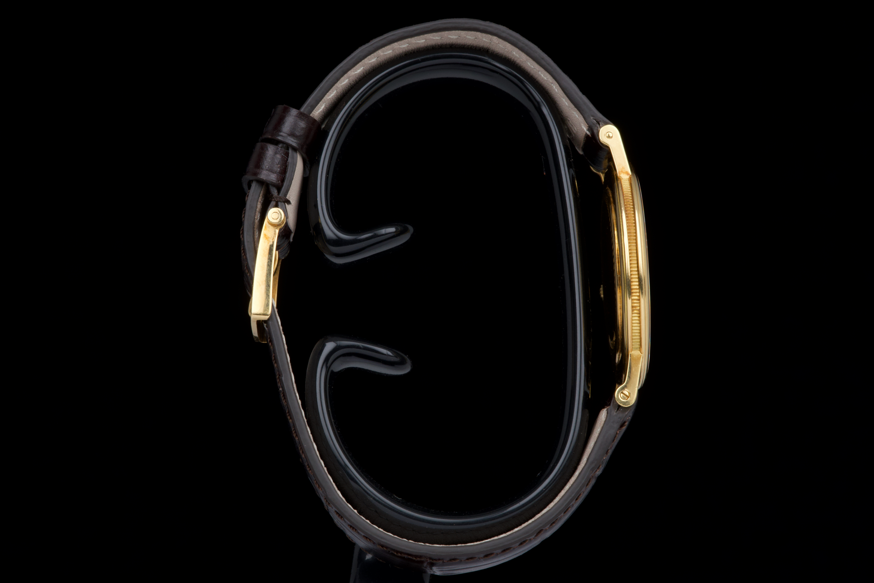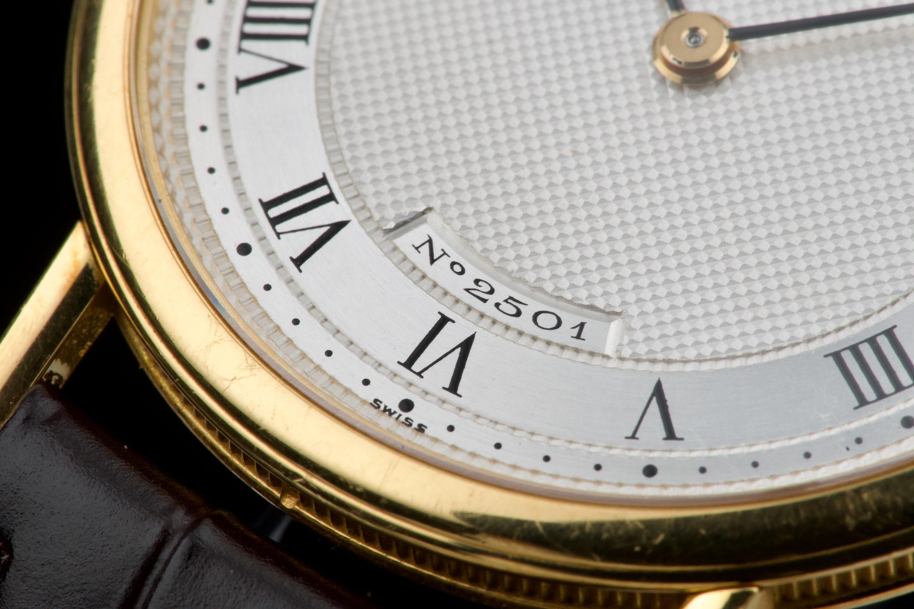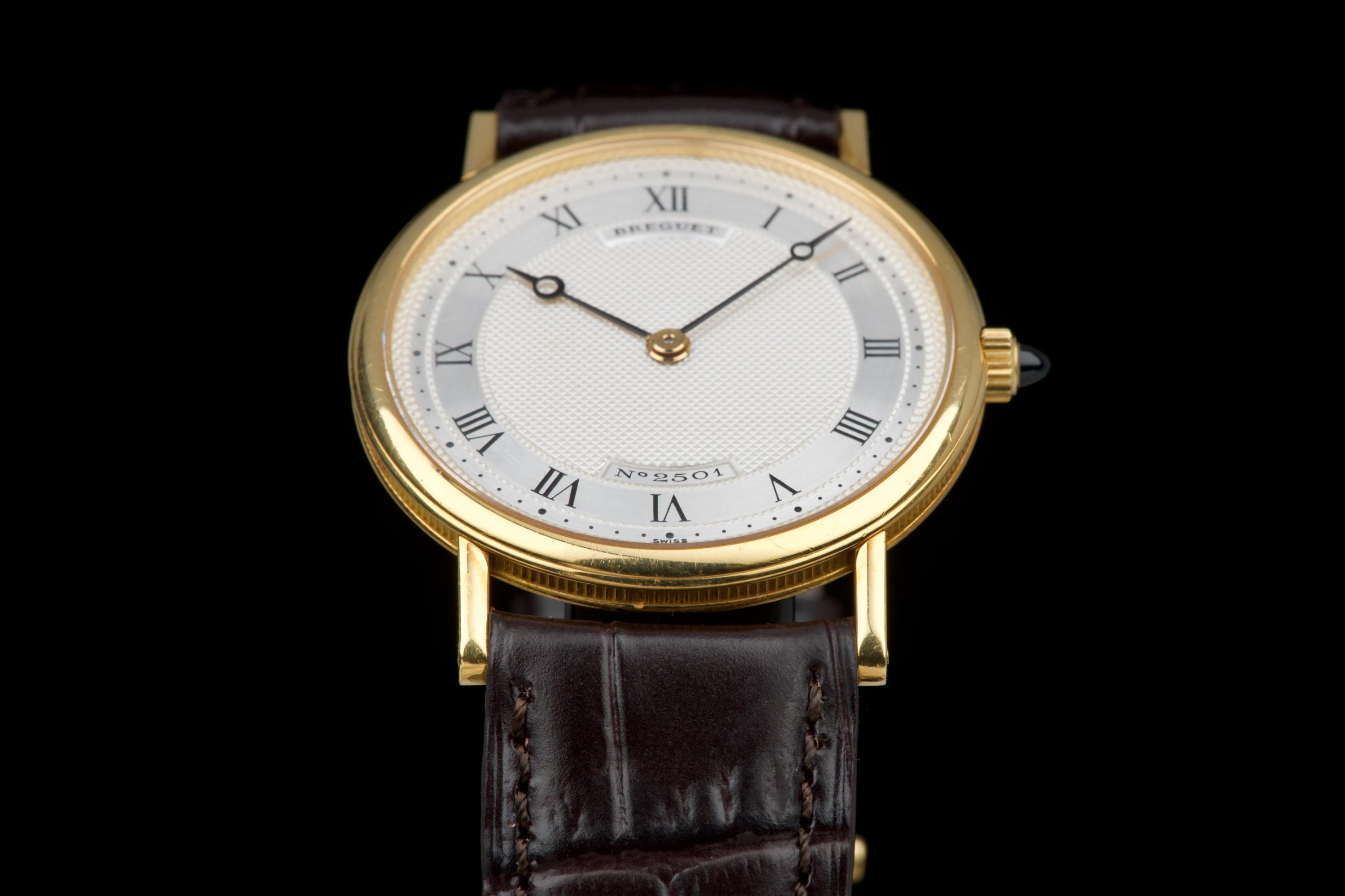 The present Breguet Classique reference 3150, measuring 32.5 mm and dating from the 1980s, is a refined and elegant example of Breguet’s traditional watchmaking, offered with particularly appealing original-owner provenance. The gold case appears to be unpolished and shows light wear consistent with age and careful use, retaining crisp lines and the discreet elegance characteristic of Breguet’s classical proportions from this period. Its modest diameter reflects the era’s aesthetic while offering timeless wearability. The dial is especially attractive, featuring a finely guilloché centre contrasted by brushed metal-style concentric ringsbearing Roman numerals, a layout that beautifully illustrates Breguet’s mastery of texture, depth, and legibility. The overall dial presentation remains in excellent condition, with strong visual balance and classical harmony. The watch is fitted with a brand-new dark brown alligator leather strap (non-Breguet), paired with its original gold tang buckle, maintaining material and period coherence. No service history accompanies the watch. Elegant, understated, and preserved with honest originality, this Breguet Classique 3150 represents a compelling opportunity to acquire a well-preserved 1980s Breguet with strong provenance, refined dial work, and enduring classical appeal.