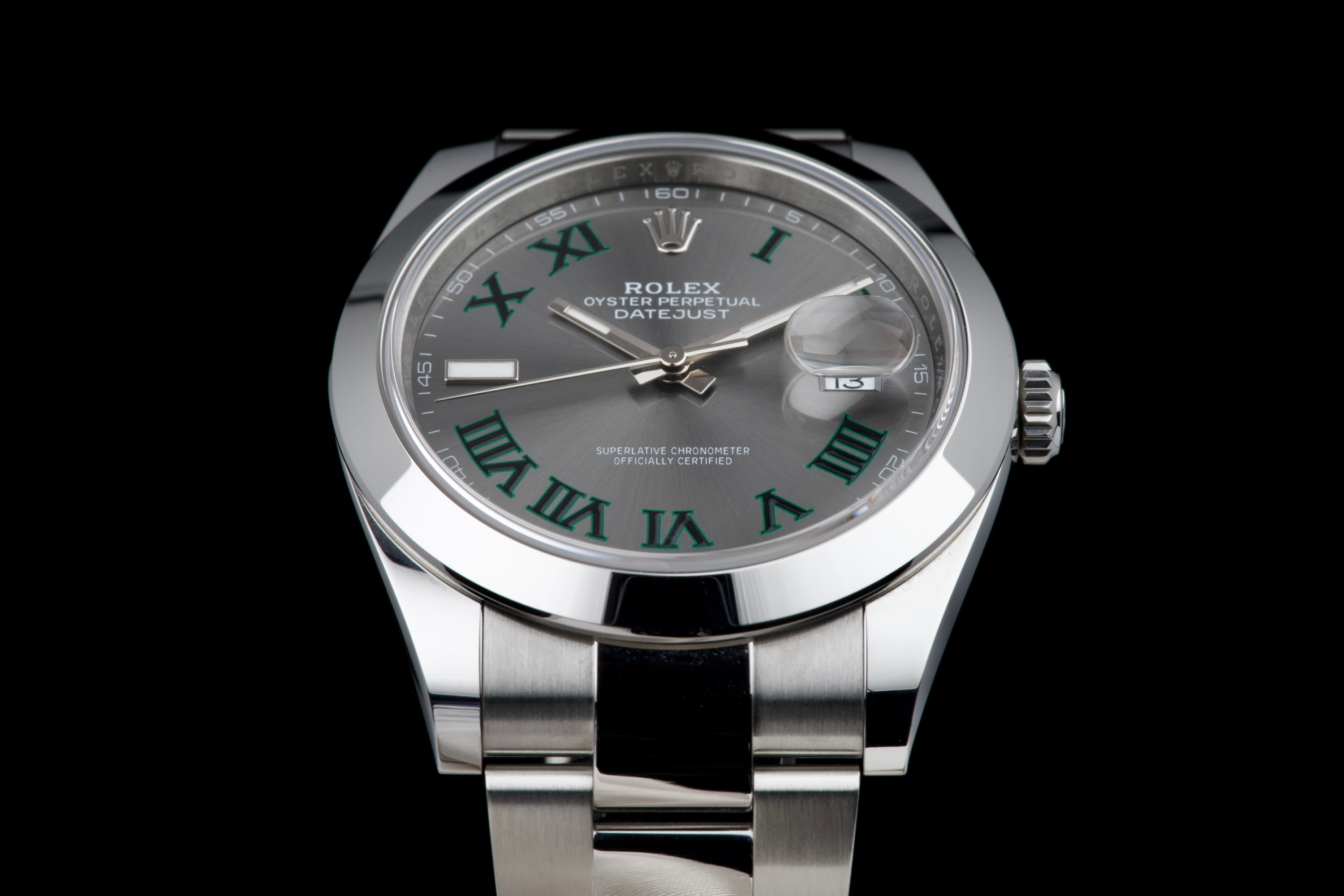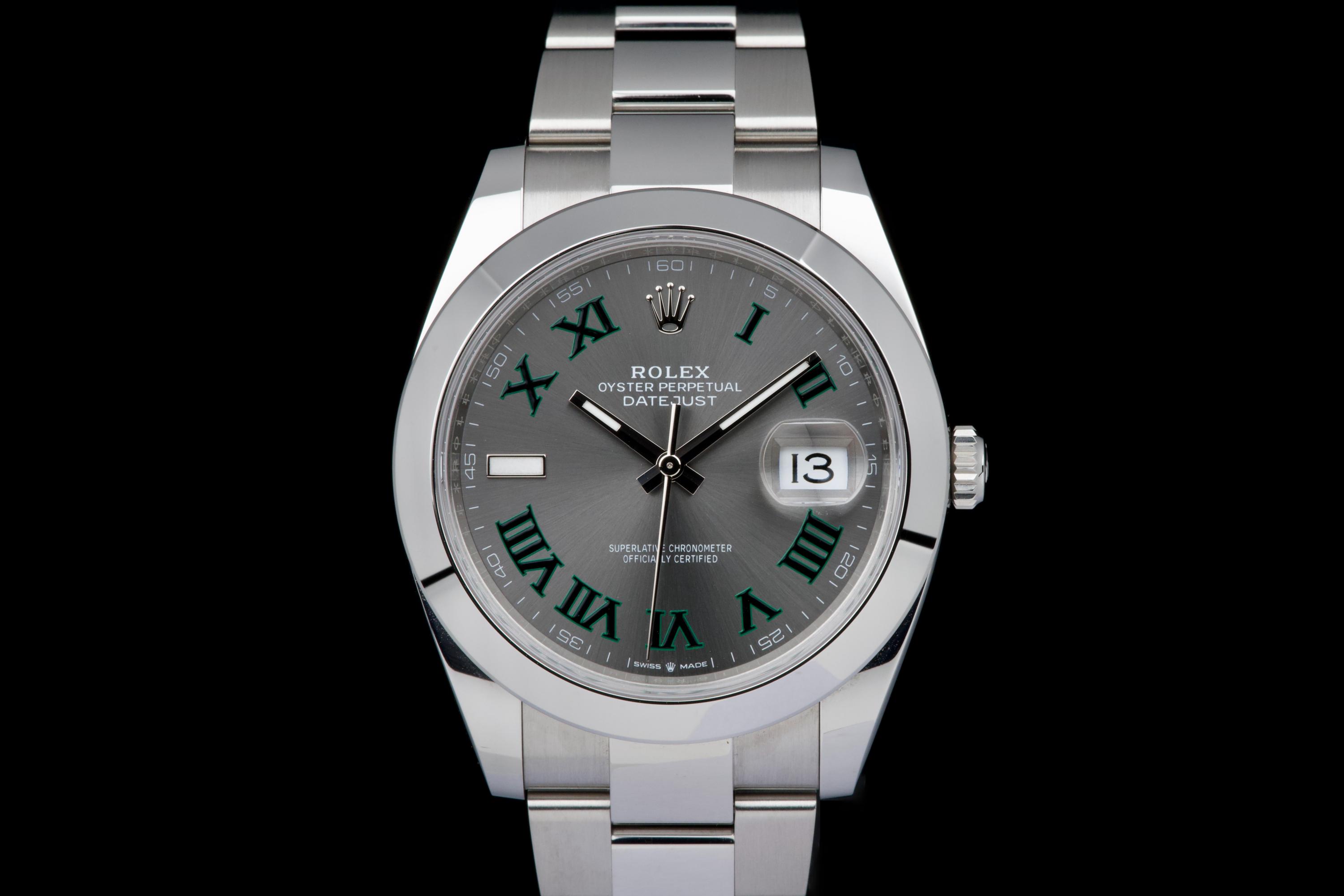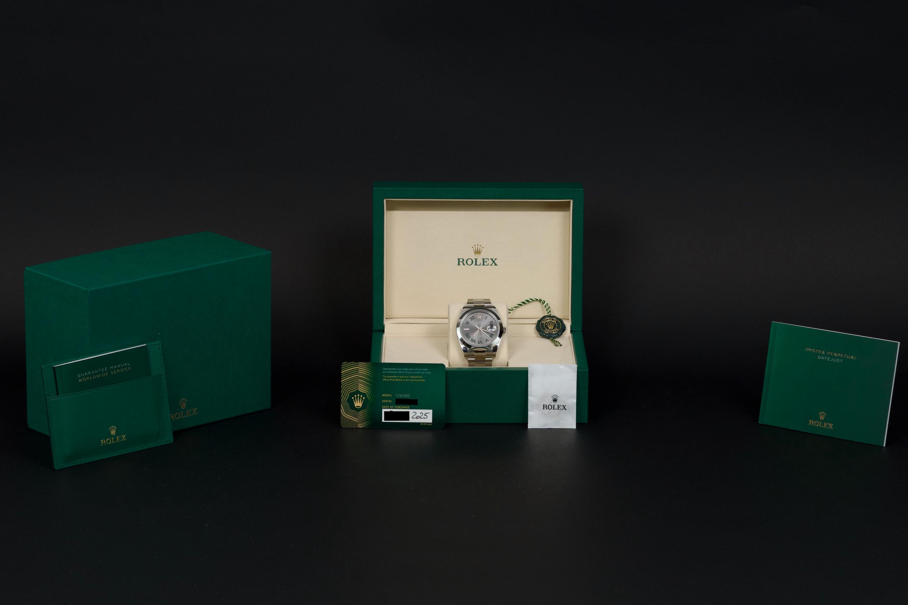 An unworn example of the latest Rolex Datejust 41 “Wimbledon,” featuring the distinctive slate grey dial with green Roman numerals and fitted on the Oyster bracelet. Crafted in stainless steel, this reference combines sporty elegance with one of Rolex’s most recognizable dial designs. Powered by the automatic Rolex caliber 3235 with 70-hour power reserve and Chronergy escapement, ensuring exceptional precision and reliability. Complete with its full 2025 set, including box, warranty card, booklets, and accessories. A brand-new and highly desirable example of the modern Datejust “Wimbledon” in unworn condition.