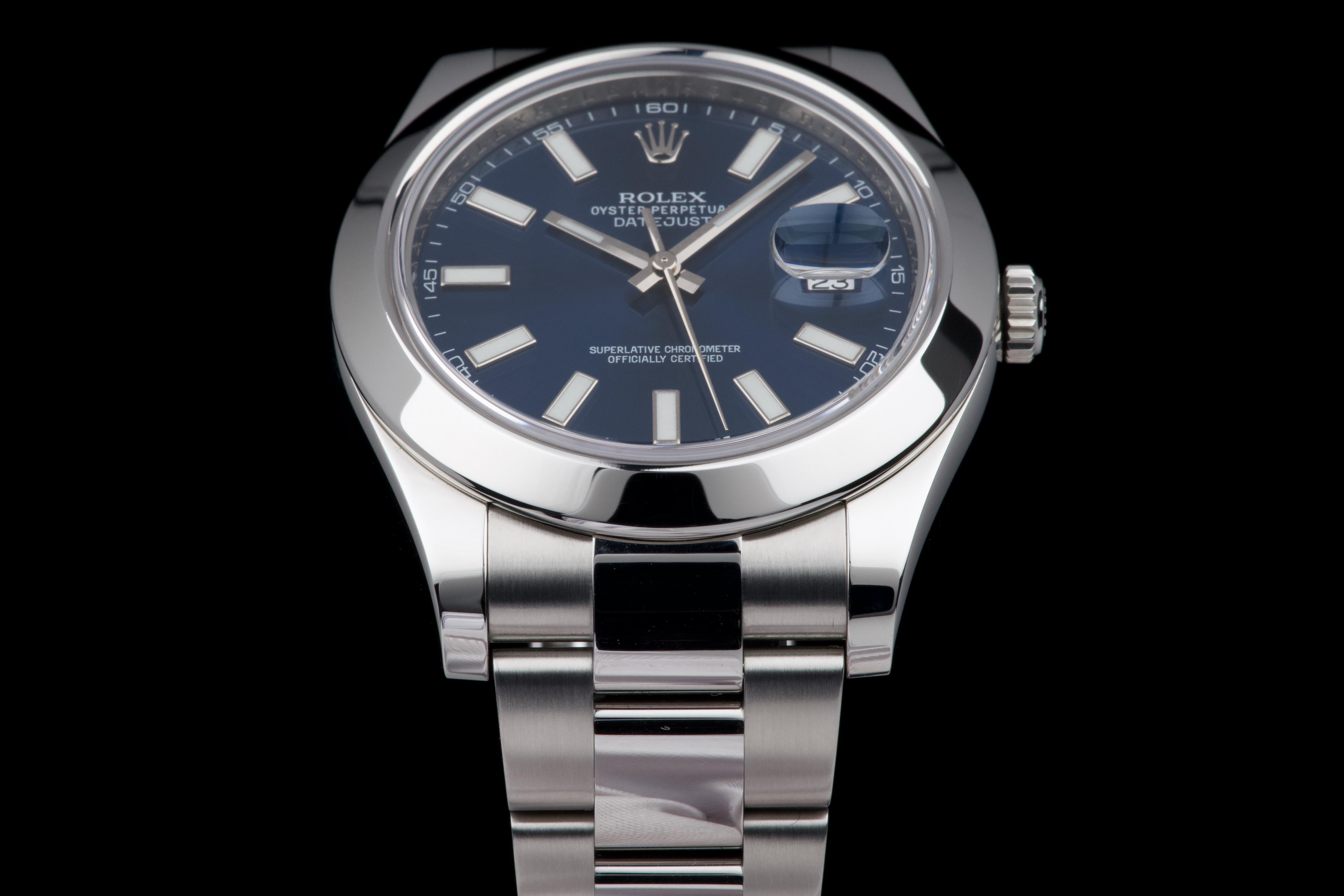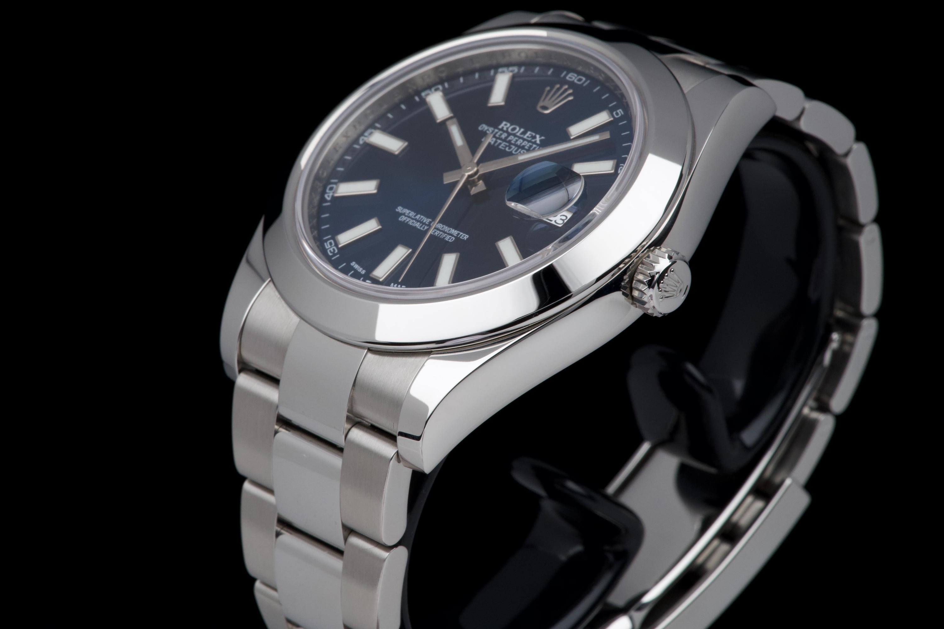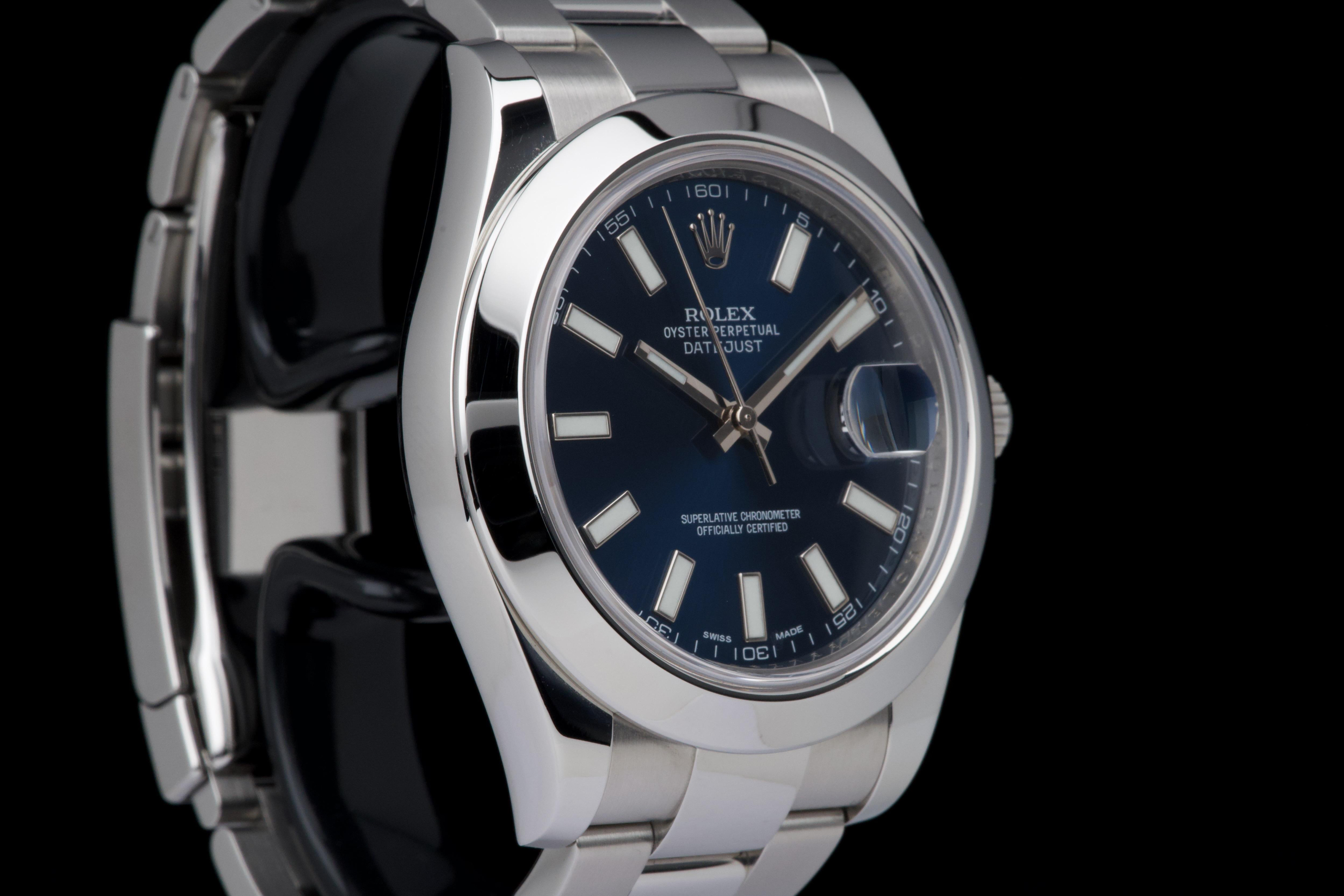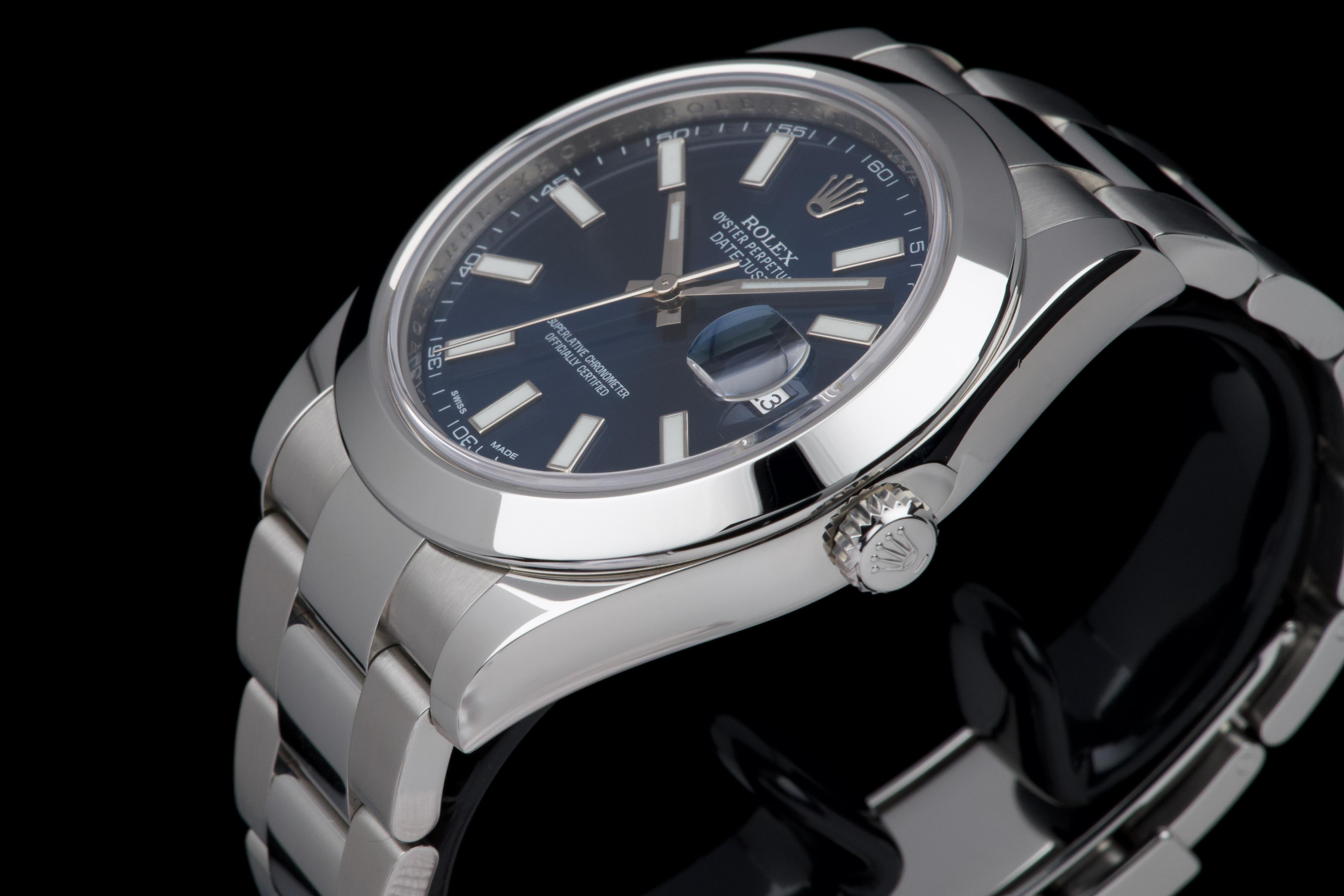 Rolex Datejust II, reference 116300, stainless steel wristwatch with blue dial, date and bracelet, full set, from. A refined example of Rolex’s modern classic, the present Datejust II reference 116300 is offered in excellent condition and accompanied by its complete set. Produced in 2013, this watch features a striking sunburst blue dial, whose rich tone subtly changes under different lighting conditions, lending the watch both depth and contemporary elegance. Housed in a robust 41 mm stainless steel Oyster case with smooth bezel, the watch is fitted with a sapphire crystal and the signature Cyclops magnifier over the date aperture at 3 o’clock. The dial is enhanced by applied baton hour markers and luminous hands, ensuring excellent legibility while maintaining the understated sophistication for which the Datejust line is celebrated. Powering the watch is a reliable automatic Rolex movement, renowned for its precision and durability. The watch is presented on its original stainless steel Oyster bracelet with Oysterclasp, combining comfort with the timeless sport-elegance that defines the model. According to the accompanying documentation, the watch was originally sold new in Athens and has remained in the hands of a single owner since its initial purchase. Recently serviced and carefully polished by our watchmaker, the timepiece is offered in excellent mechanical and aesthetic condition. Delivered as a full set with its original box, warranty card and accessories, this Datejust II represents an excellent opportunity to acquire a well-preserved example of a highly versatile modern Rolex reference.