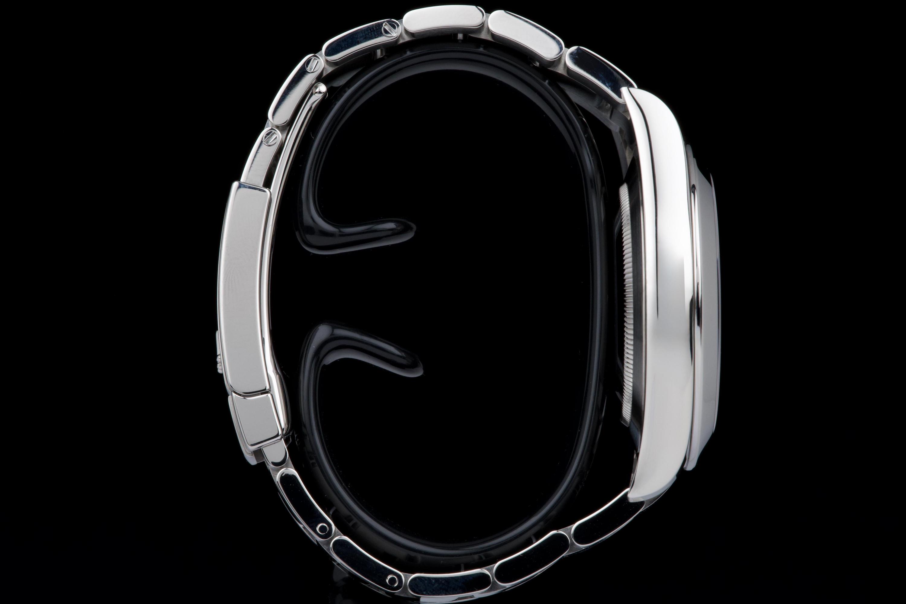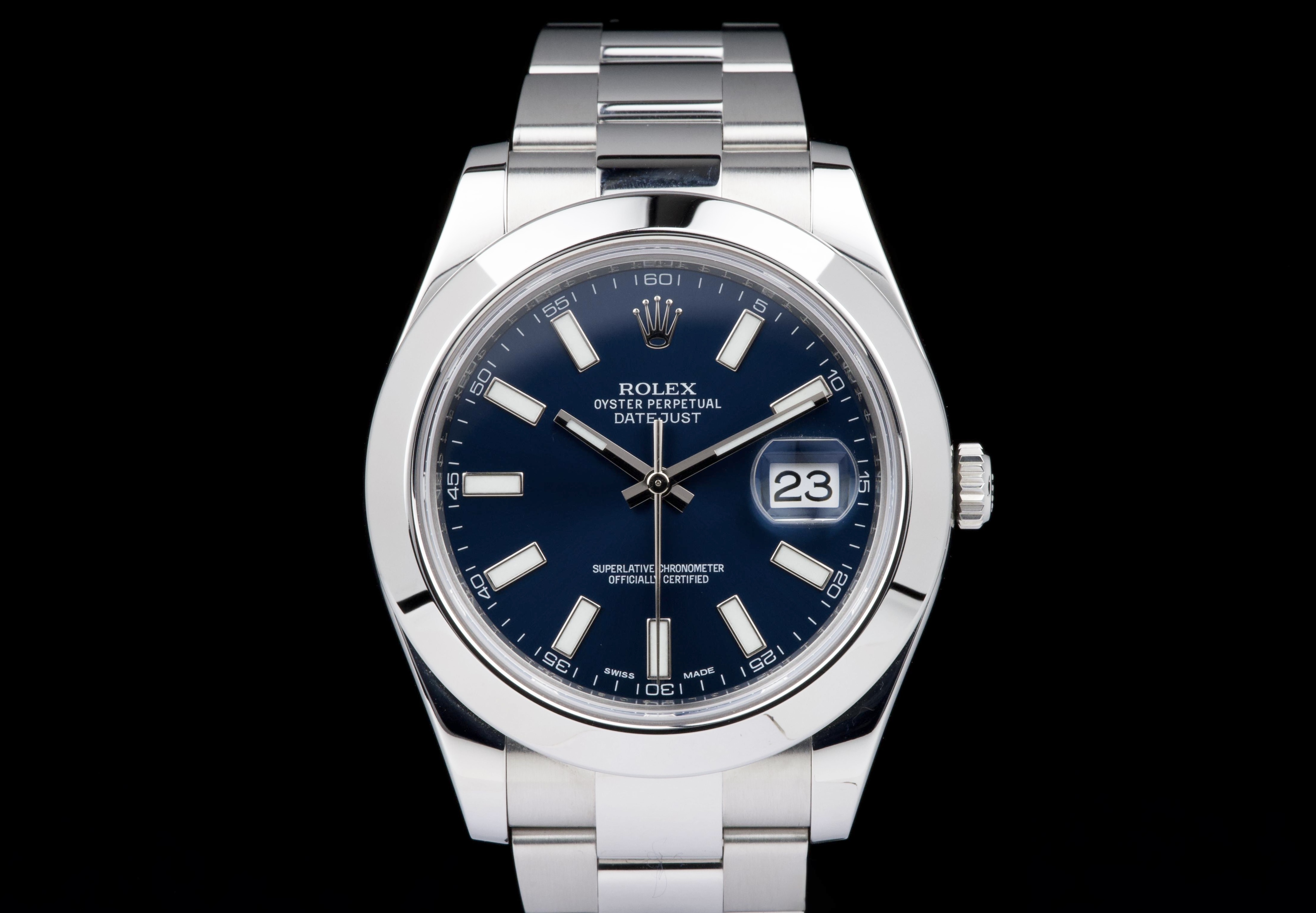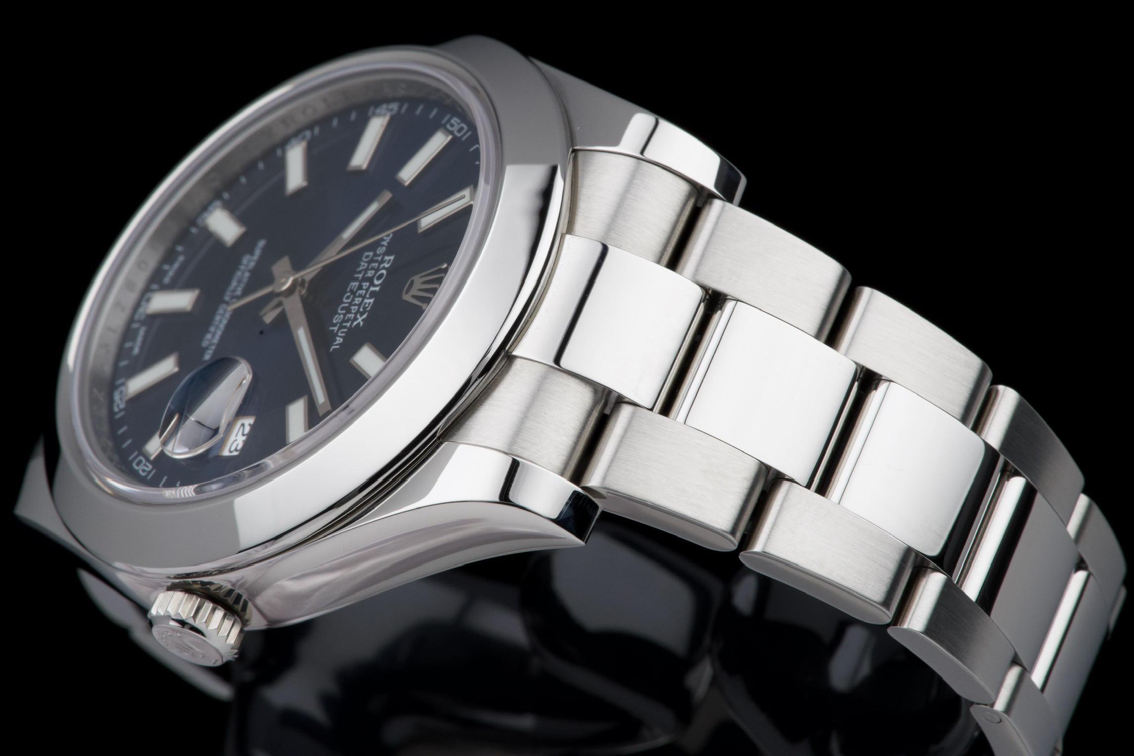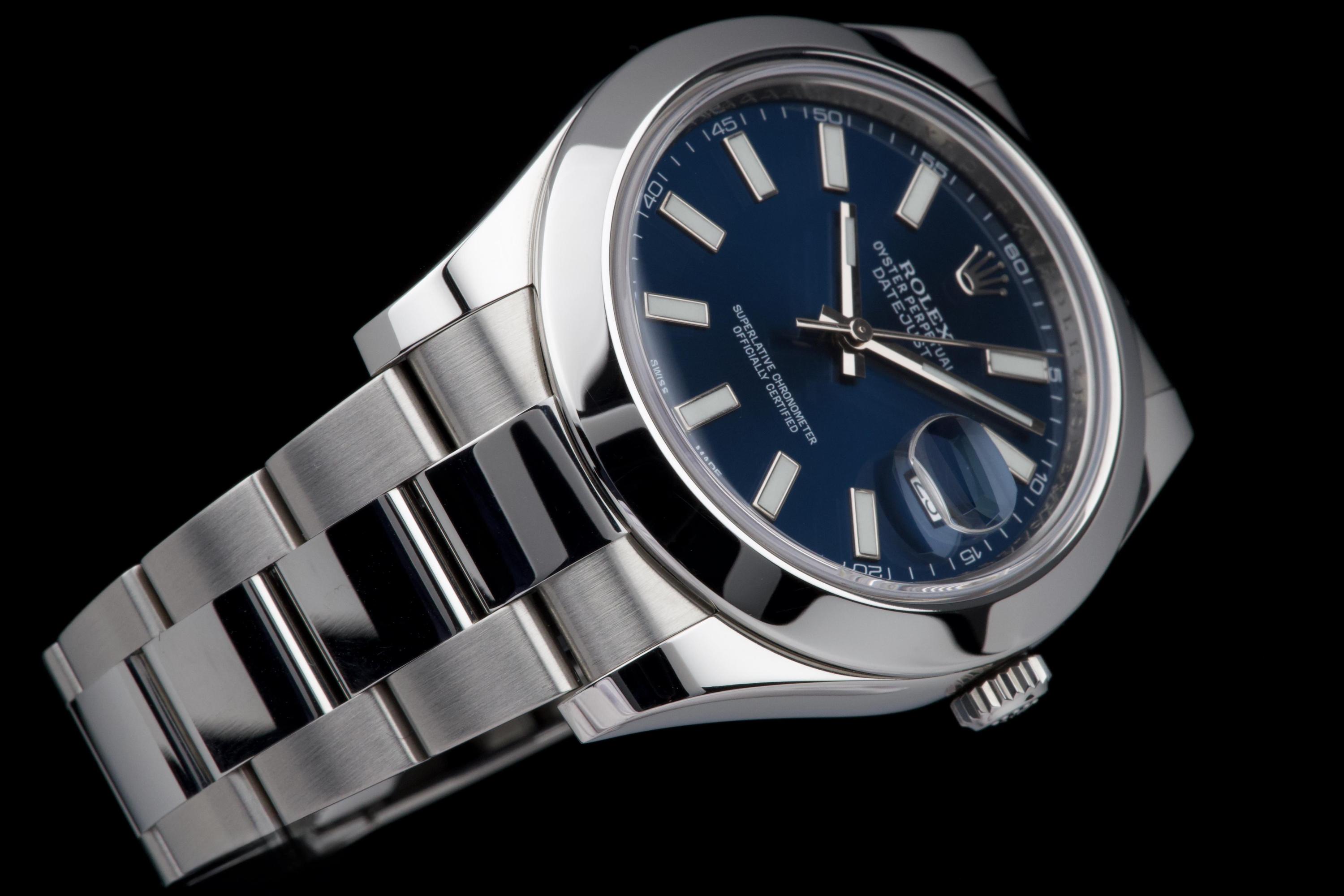 Rolex Datejust II, reference 116300, stainless steel wristwatch with blue dial, date and bracelet, full set, from. A refined example of Rolex’s modern classic, the present Datejust II reference 116300 is offered in excellent condition and accompanied by its complete set. Produced in 2013, this watch features a striking sunburst blue dial, whose rich tone subtly changes under different lighting conditions, lending the watch both depth and contemporary elegance. Housed in a robust 41 mm stainless steel Oyster case with smooth bezel, the watch is fitted with a sapphire crystal and the signature Cyclops magnifier over the date aperture at 3 o’clock. The dial is enhanced by applied baton hour markers and luminous hands, ensuring excellent legibility while maintaining the understated sophistication for which the Datejust line is celebrated. Powering the watch is a reliable automatic Rolex movement, renowned for its precision and durability. The watch is presented on its original stainless steel Oyster bracelet with Oysterclasp, combining comfort with the timeless sport-elegance that defines the model. According to the accompanying documentation, the watch was originally sold new in Athens and has remained in the hands of a single owner since its initial purchase. Recently serviced and carefully polished by our watchmaker, the timepiece is offered in excellent mechanical and aesthetic condition. Delivered as a full set with its original box, warranty card and accessories, this Datejust II represents an excellent opportunity to acquire a well-preserved example of a highly versatile modern Rolex reference.
