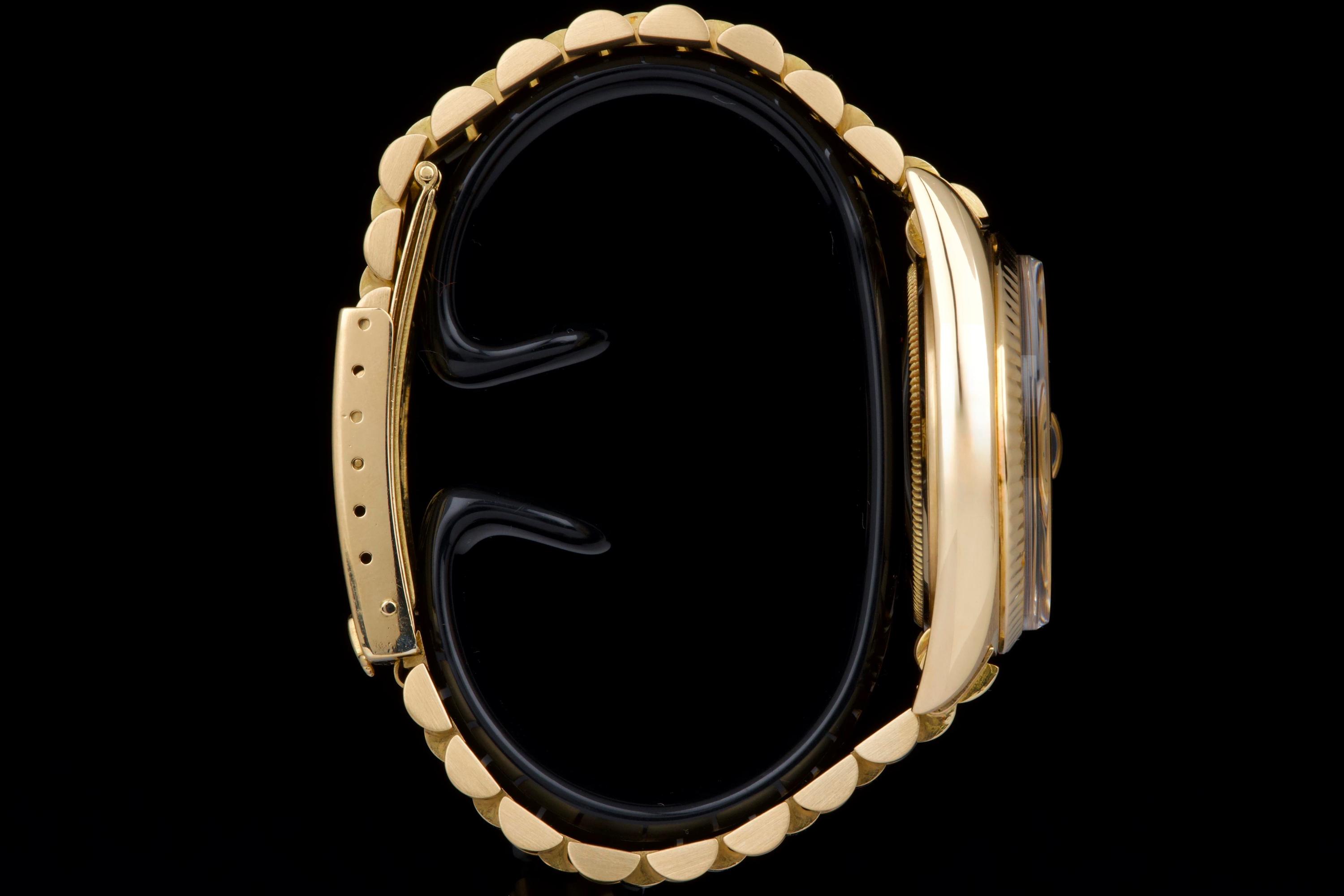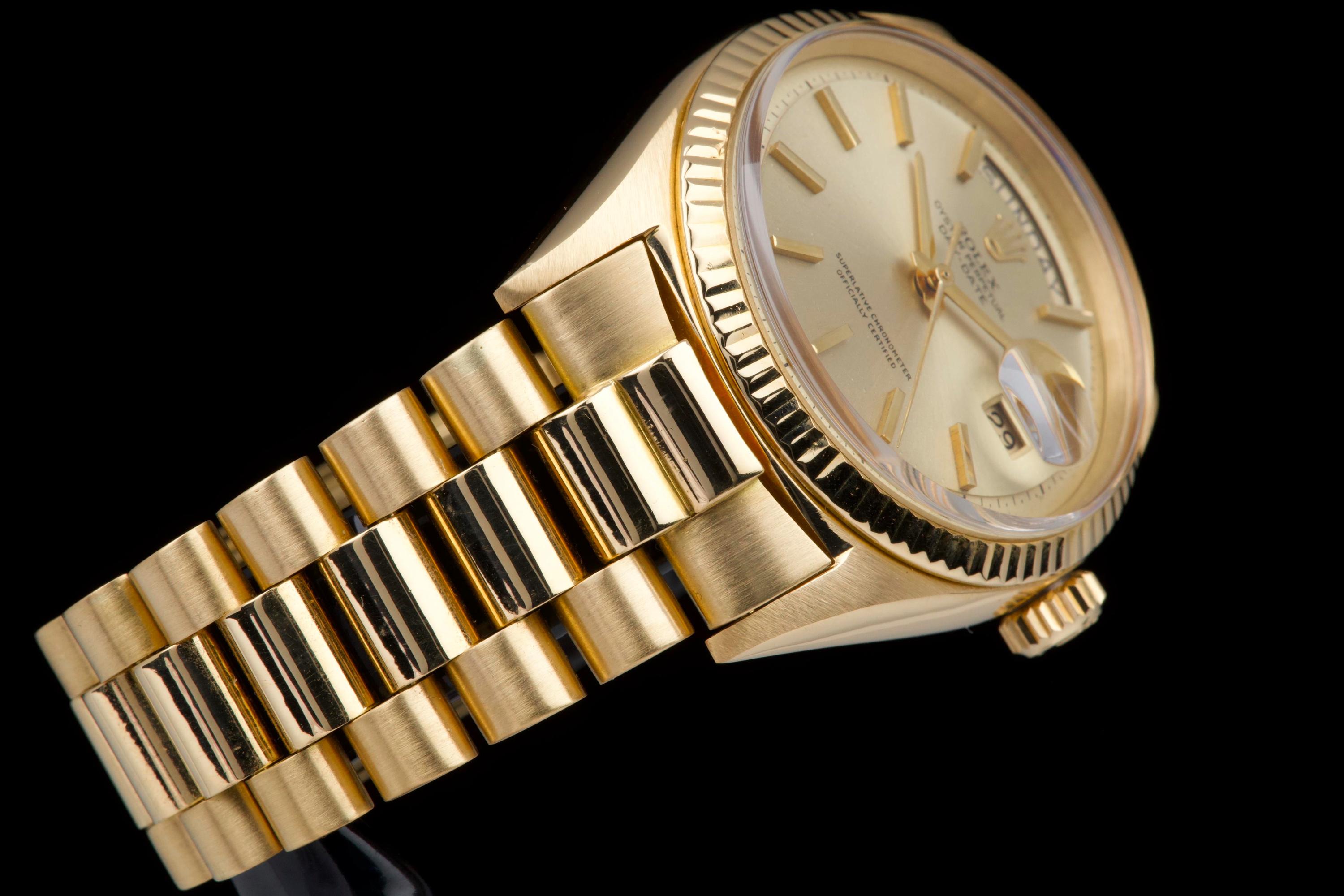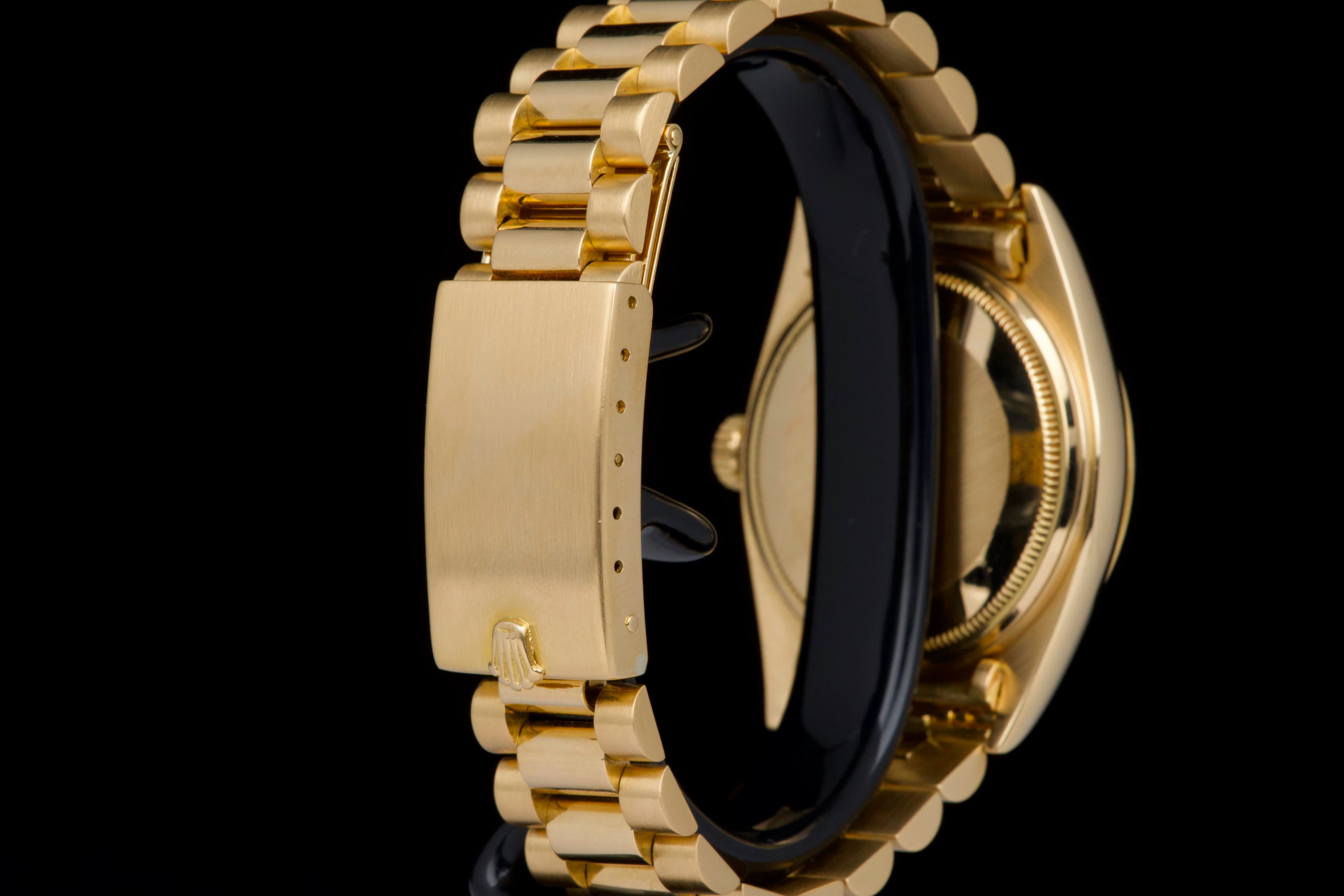 A beautiful vintage Rolex Day-Date reference 1803 in 18k yellow gold, dating to 1964 (serial 1077XXX). This classic 36 mm “President” features an attractive champagne no-lume dial, a configuration appreciated by collectors for its clean and elegant appearance. The dial is in excellent condition, showing a very subtle speckled patina across the surface, consistent with its age. As expected for a no-lume configuration, the dial does not feature luminous plots, giving it a very pure aesthetic. It is fitted with applied yellow gold baton hour markers and matching sword hands, both in excellent condition and showing only light wear. The classic day aperture at 12 o’clock and date window at 3 o’clock with Cyclops magnification complete the iconic Day-Date layout. The 18k yellow gold case has been recently polished and remains in excellent condition, showing only light wear. The fluted bezel is sharp and well defined. The watch is fitted with its original 18k yellow gold President bracelet, composed of 19 links, showing light to moderate stretch consistent with age and fitting wrists up to approximately 7.5 inches. A timeless example of the early Rolex Day-Date, combining the iconic President design with the rare and elegant no-lume champagne dial configuration.