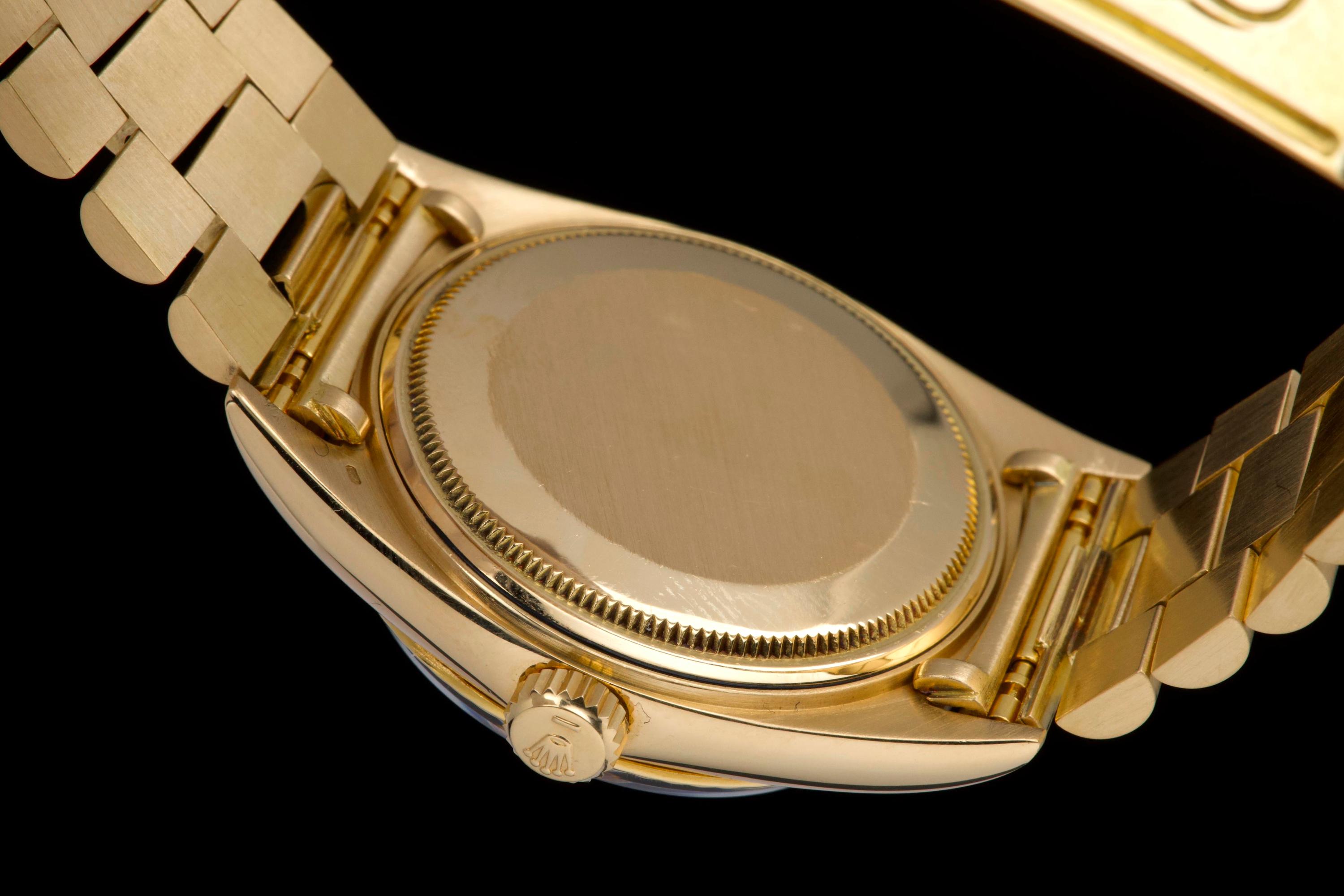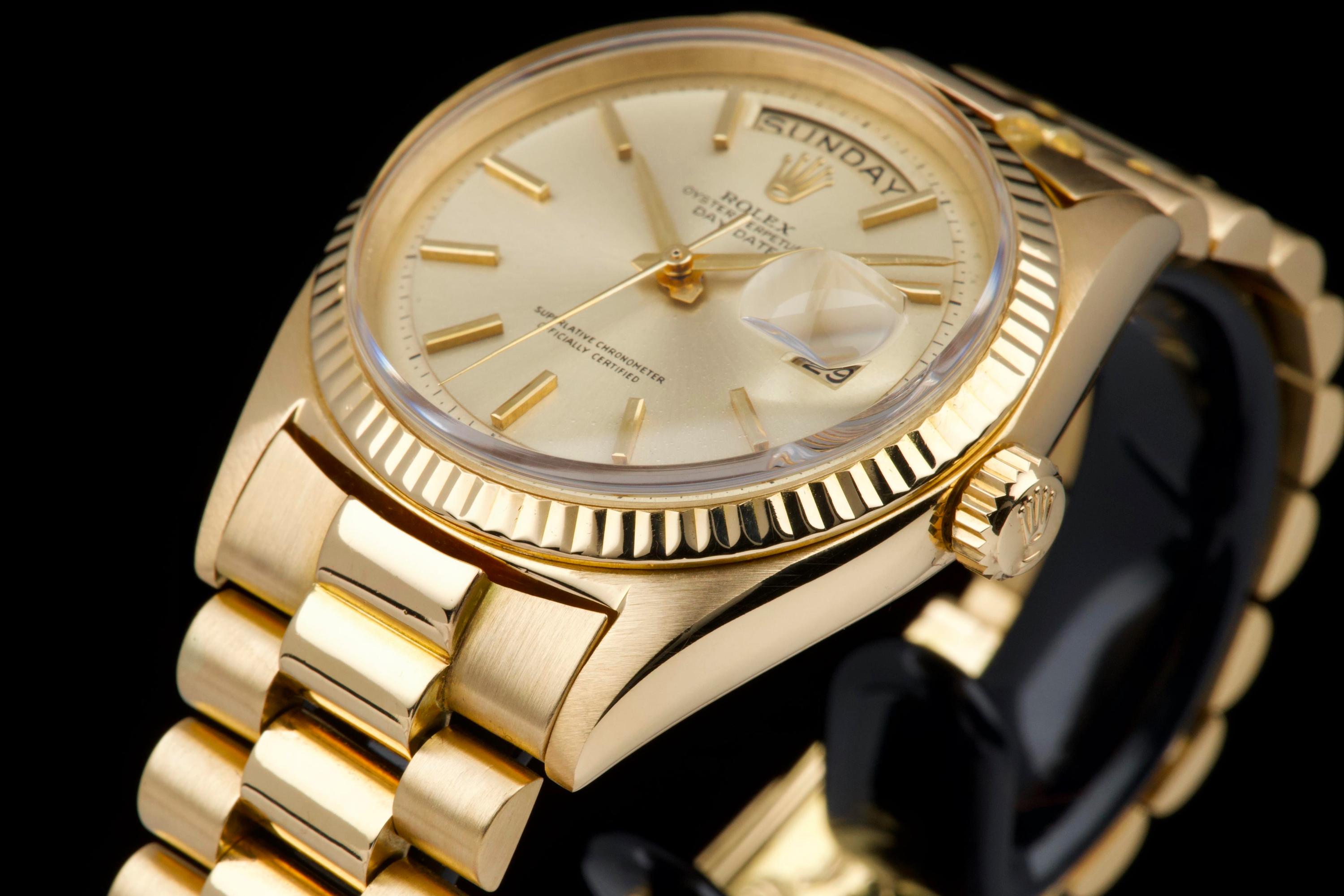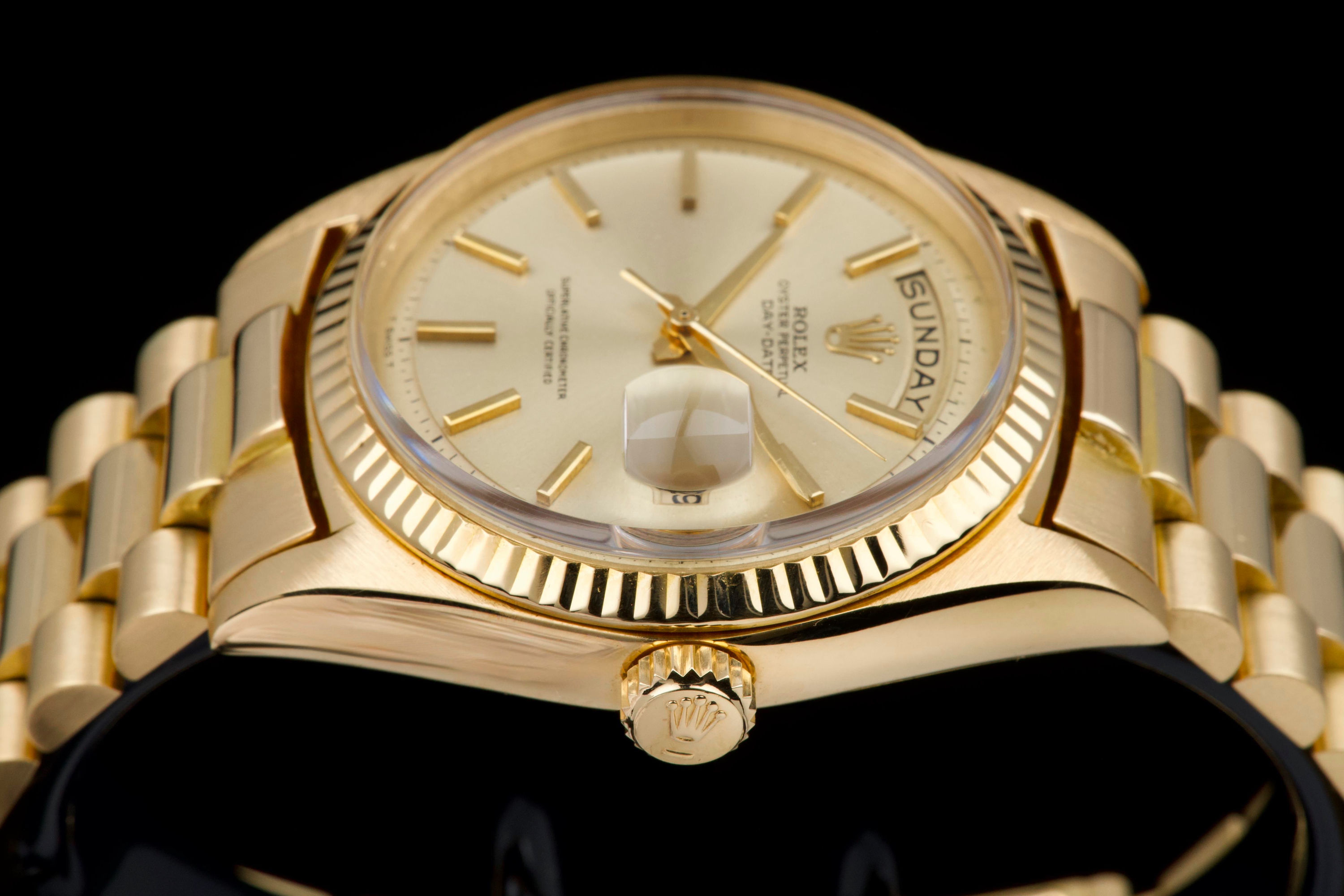 A beautiful vintage Rolex Day-Date reference 1803 in 18k yellow gold, dating to 1964 (serial 1077XXX). This classic 36 mm “President” features an attractive champagne no-lume dial, a configuration appreciated by collectors for its clean and elegant appearance. The dial is in excellent condition, showing a very subtle speckled patina across the surface, consistent with its age. As expected for a no-lume configuration, the dial does not feature luminous plots, giving it a very pure aesthetic. It is fitted with applied yellow gold baton hour markers and matching sword hands, both in excellent condition and showing only light wear. The classic day aperture at 12 o’clock and date window at 3 o’clock with Cyclops magnification complete the iconic Day-Date layout. The 18k yellow gold case has been recently polished and remains in excellent condition, showing only light wear. The fluted bezel is sharp and well defined. The watch is fitted with its original 18k yellow gold President bracelet, composed of 19 links, showing light to moderate stretch consistent with age and fitting wrists up to approximately 7.5 inches. A timeless example of the early Rolex Day-Date, combining the iconic President design with the rare and elegant no-lume champagne dial configuration.
