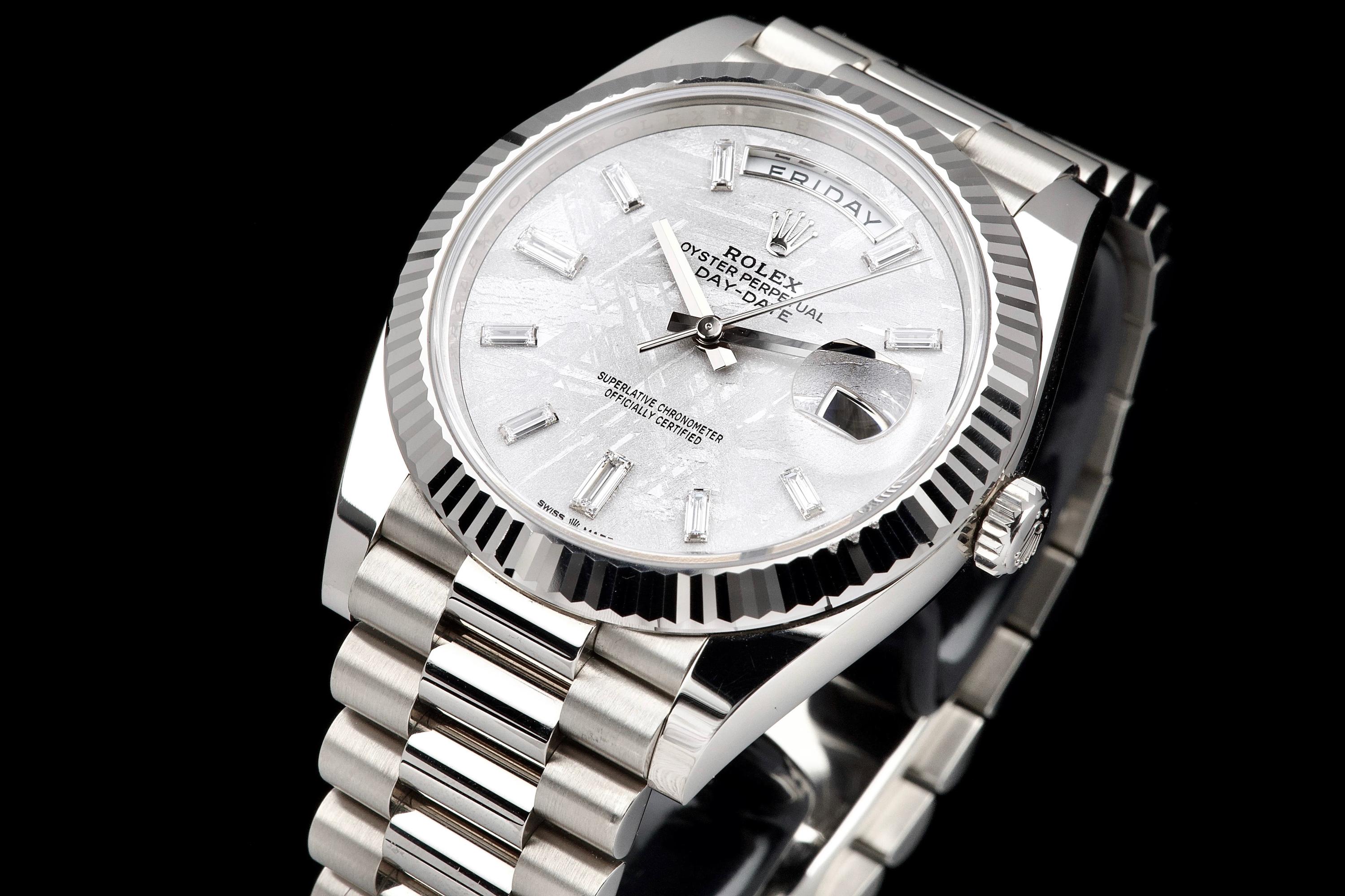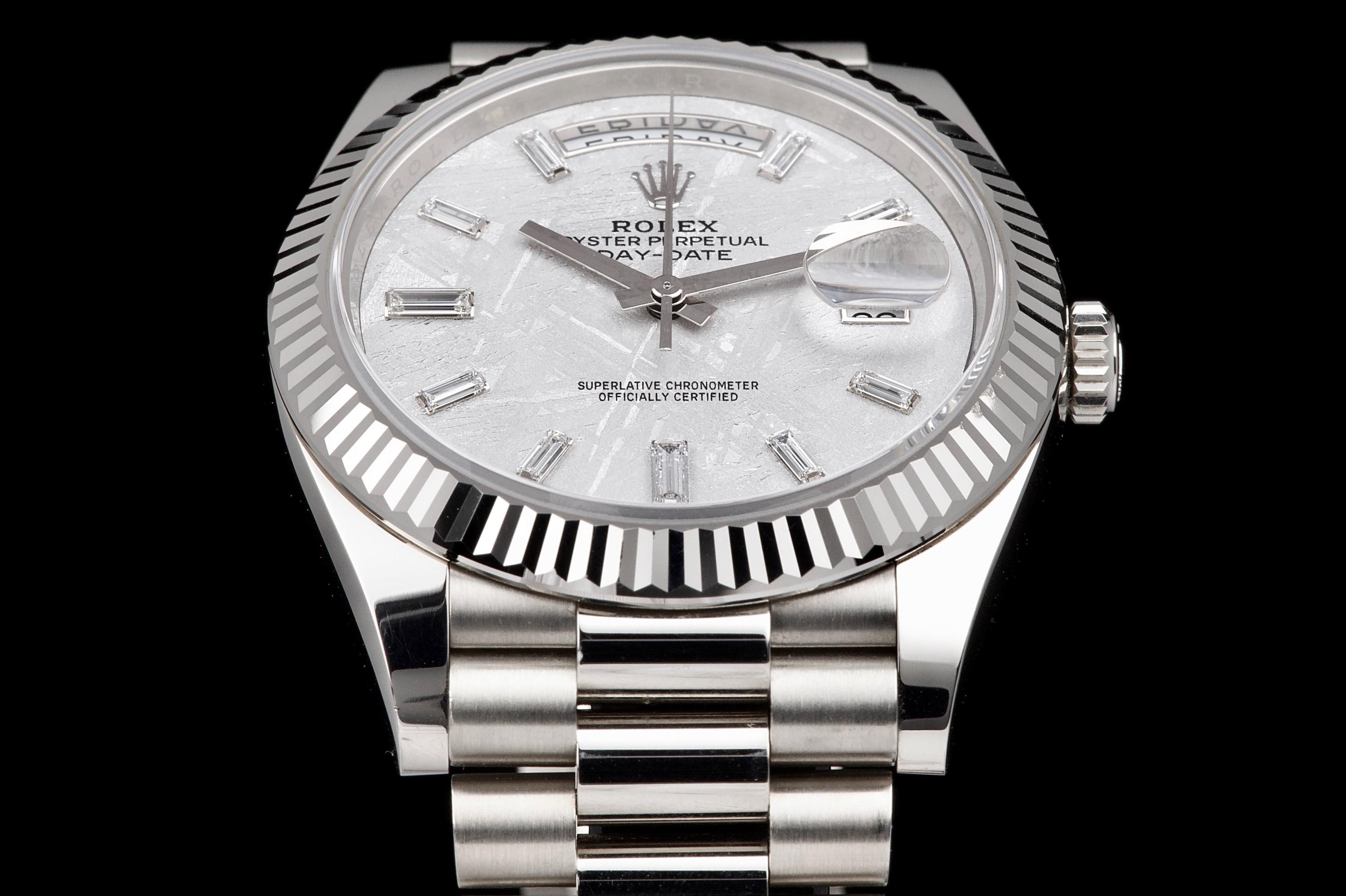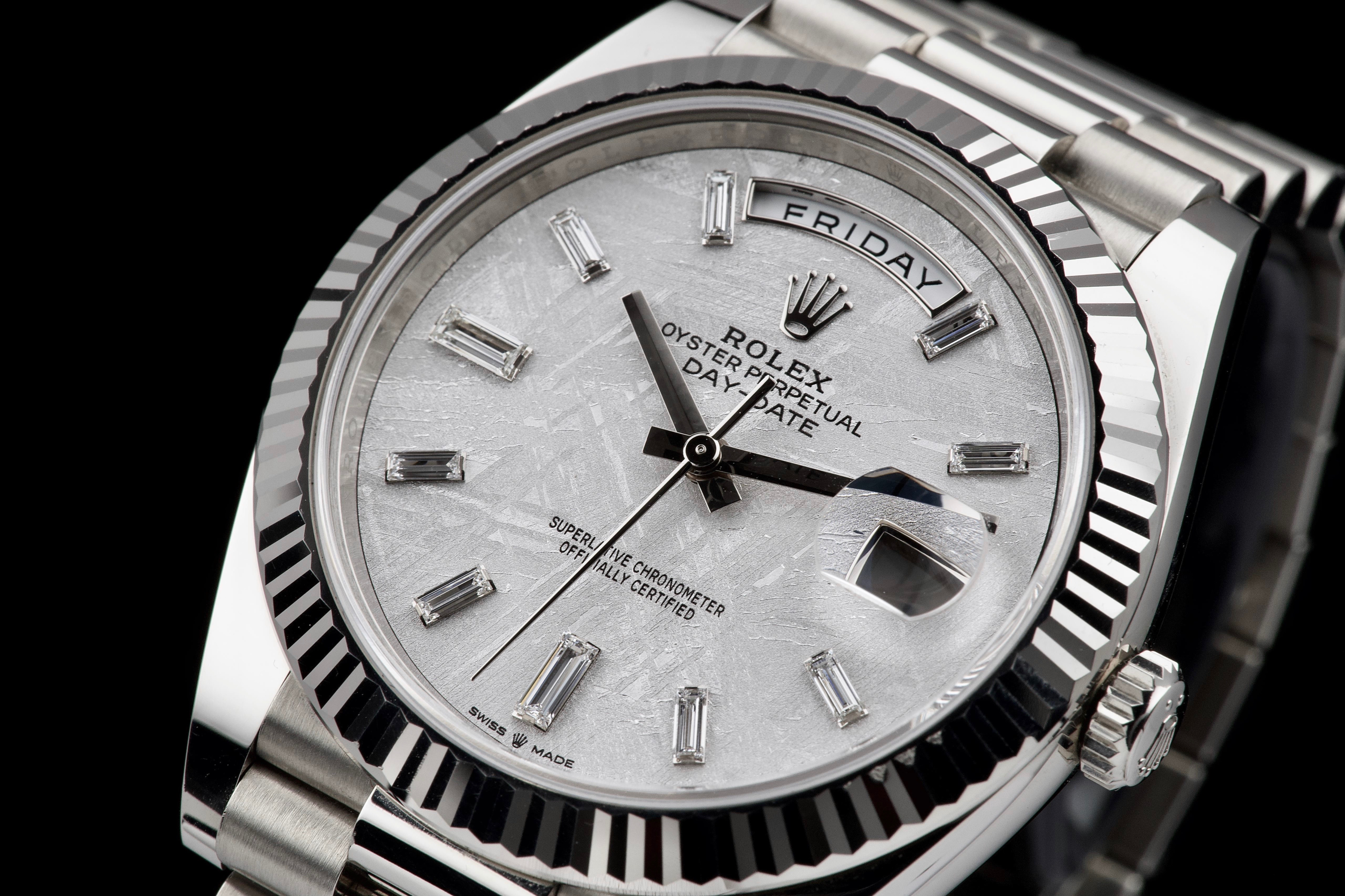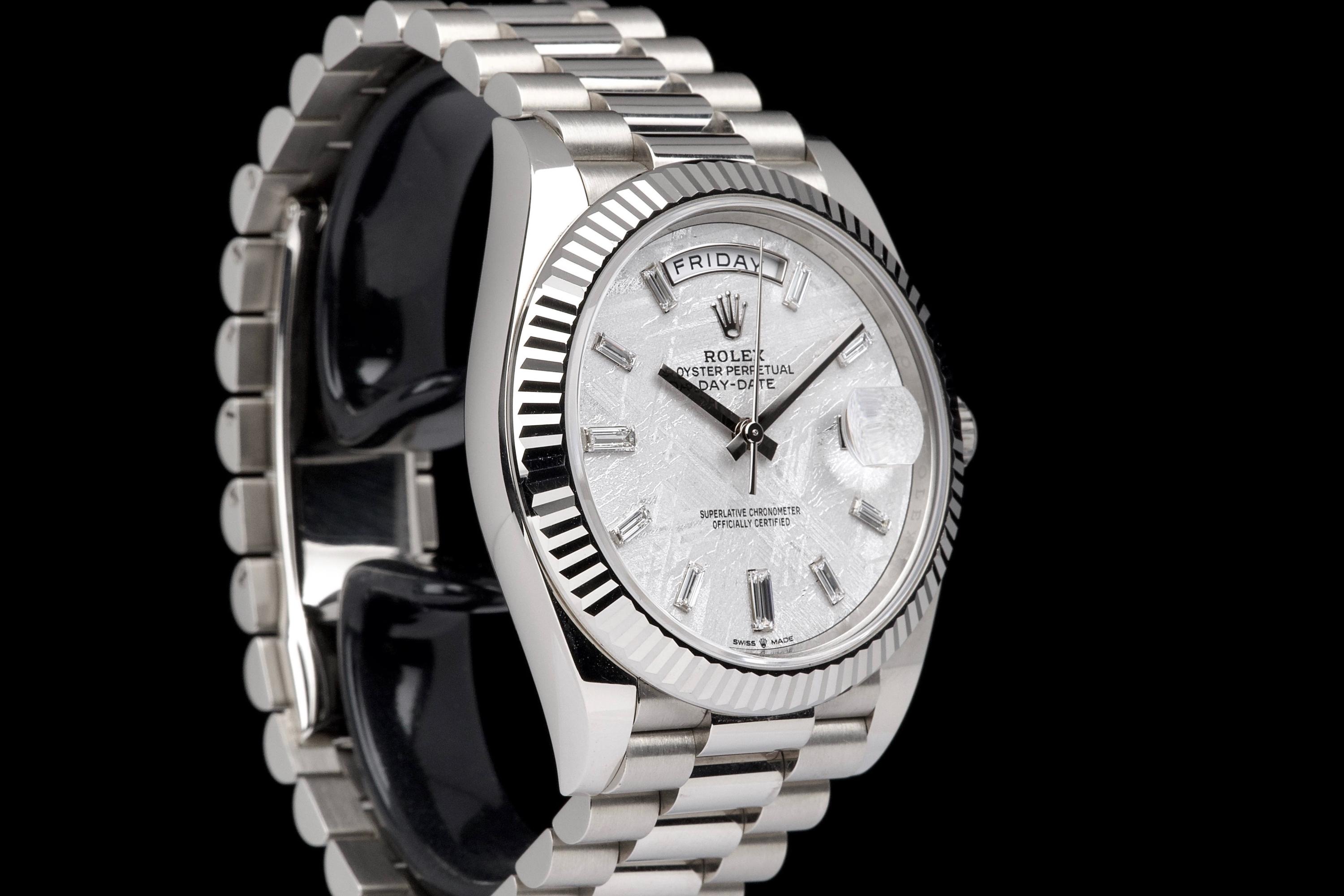 This Rolex Day-Date reference 228239 is presented in 18k white gold and measures 40 mm in diameter, fitted with the iconic President bracelet. The watch features a highly attractive meteorite dial adorned with baguette diamond hour markers, each meteorite pattern naturally unique and lending the piece a distinctive and rare character. Preserved in unpolished condition, the case and bracelet show only light signs of wear, consistent with careful use. Offered by its original owner and accompanied by Swiss provenance, the watch retains all original bracelet links and is delivered as a full set. Overall, the present watch is in very good condition and represents an appealing opportunity to acquire a modern Day-Date in noble metal with one of Rolex’s most striking dial configurations.