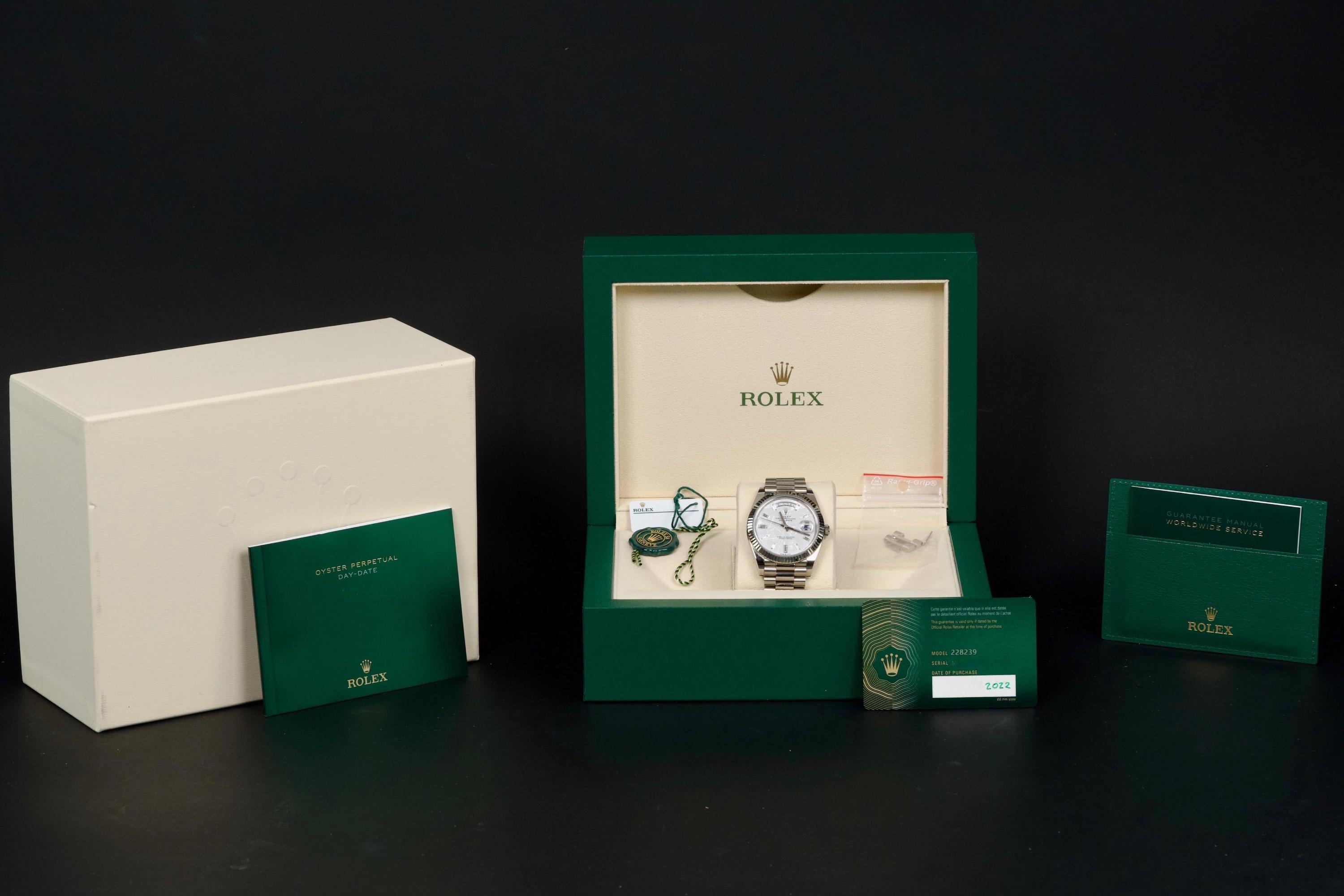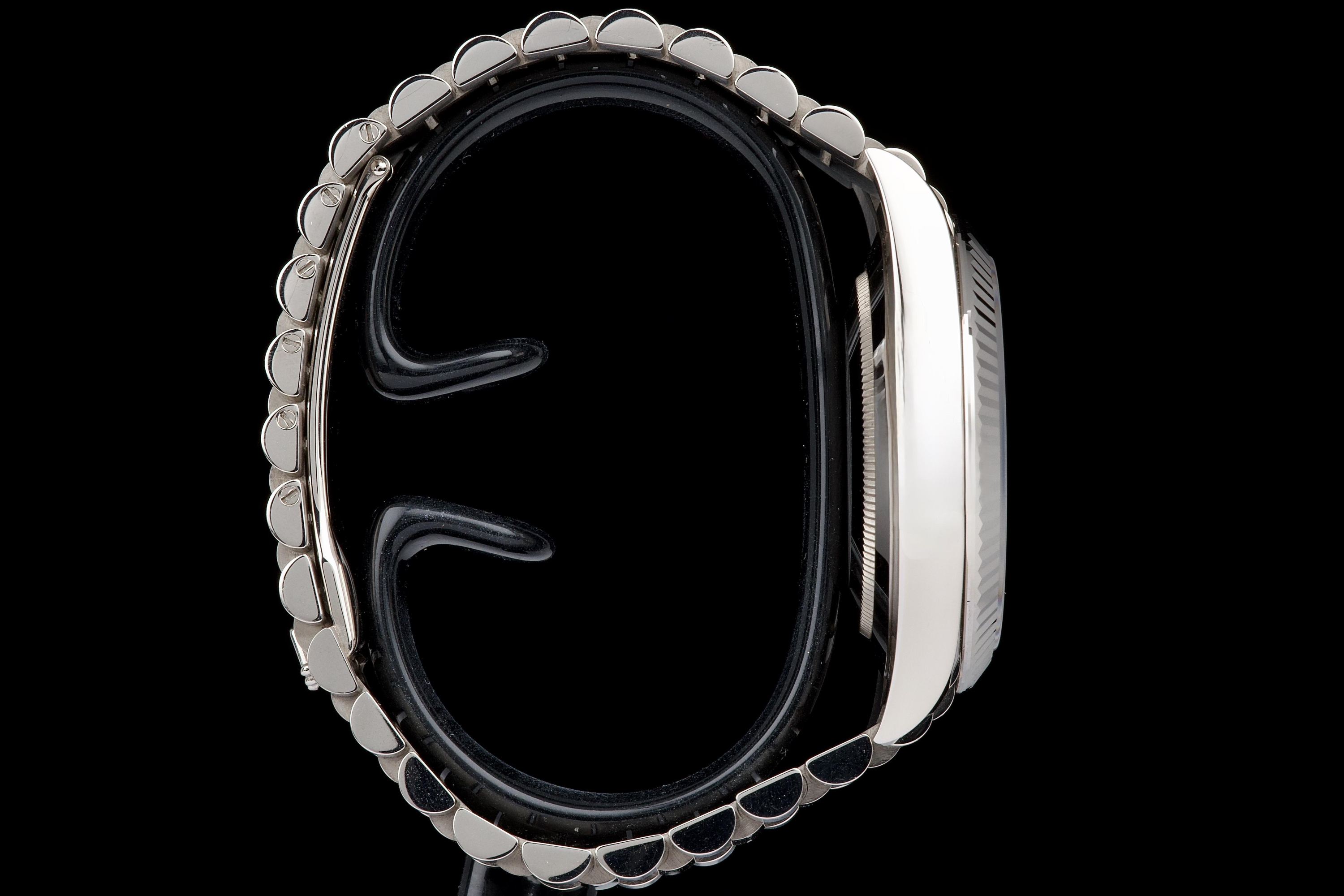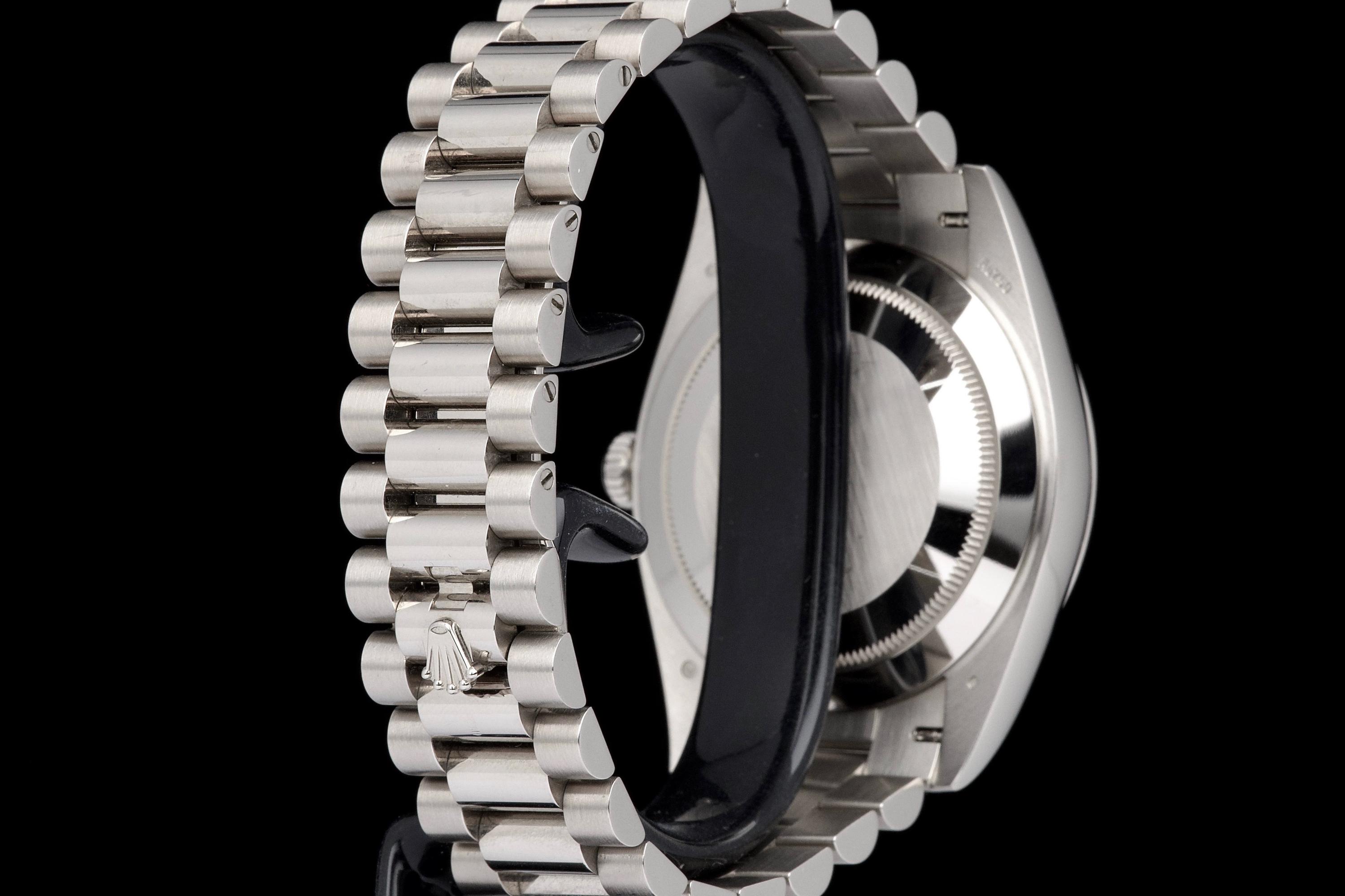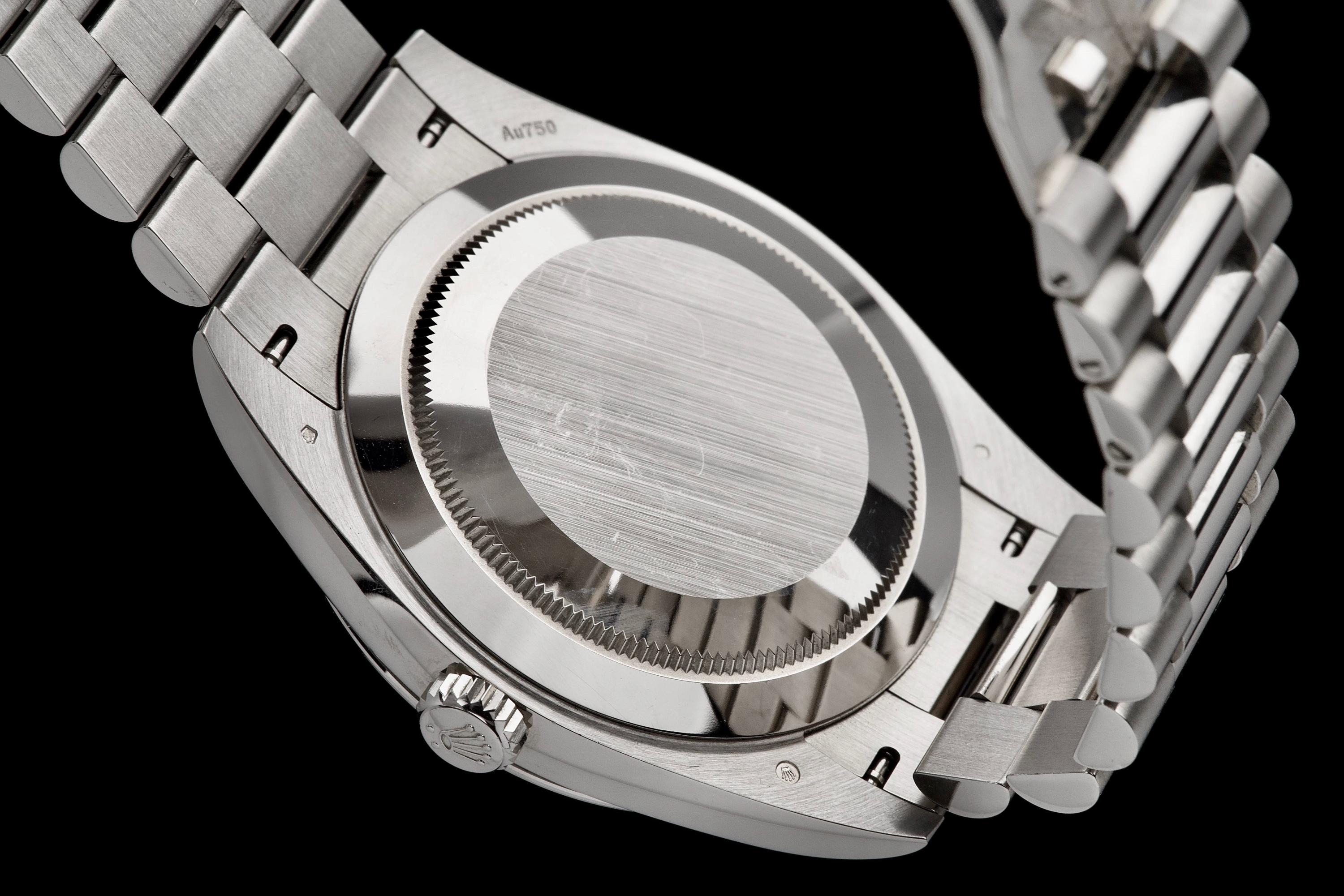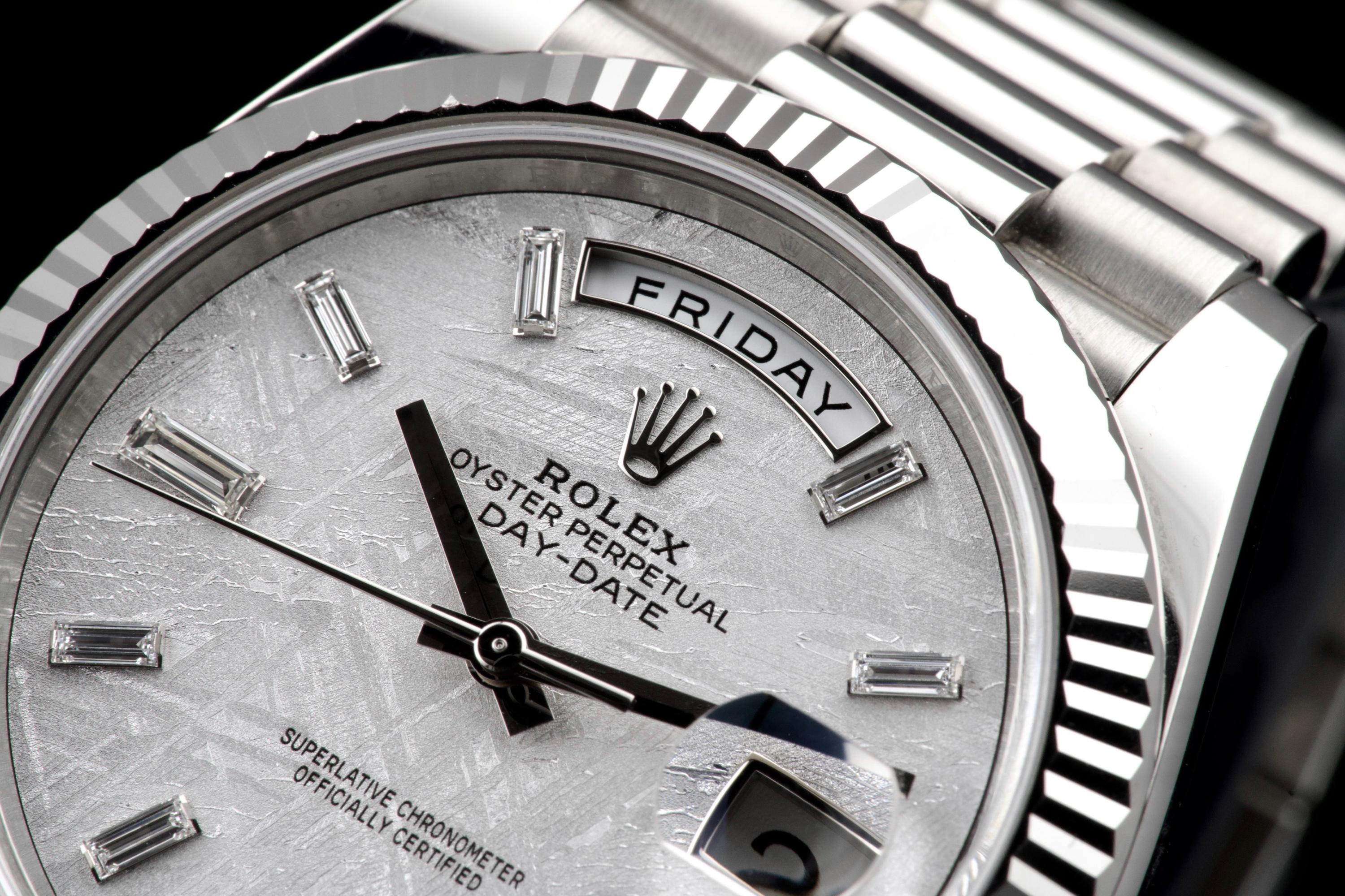 This Rolex Day-Date reference 228239 is presented in 18k white gold and measures 40 mm in diameter, fitted with the iconic President bracelet. The watch features a highly attractive meteorite dial adorned with baguette diamond hour markers, each meteorite pattern naturally unique and lending the piece a distinctive and rare character. Preserved in unpolished condition, the case and bracelet show only light signs of wear, consistent with careful use. Offered by its original owner and accompanied by Swiss provenance, the watch retains all original bracelet links and is delivered as a full set. Overall, the present watch is in very good condition and represents an appealing opportunity to acquire a modern Day-Date in noble metal with one of Rolex’s most striking dial configurations.