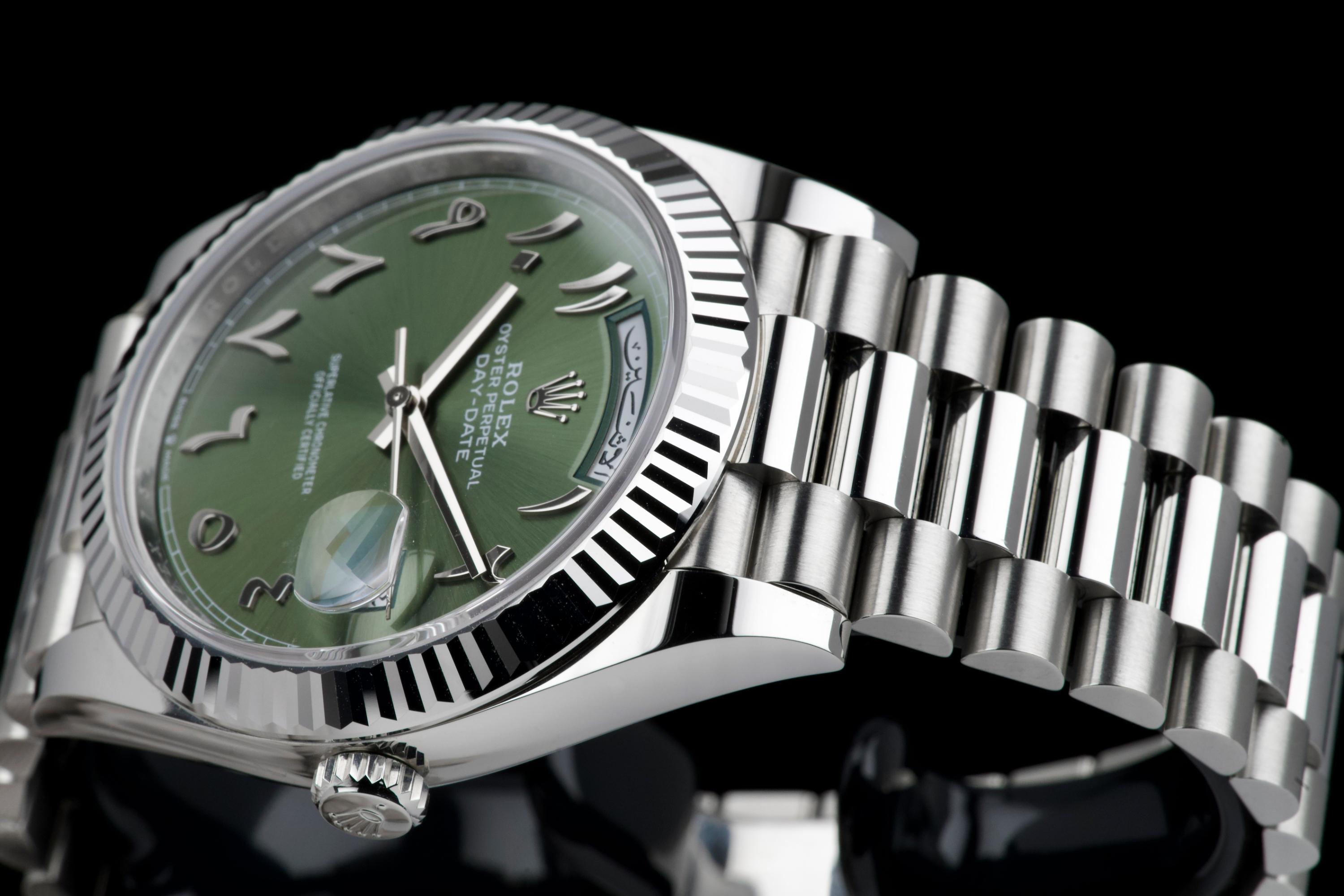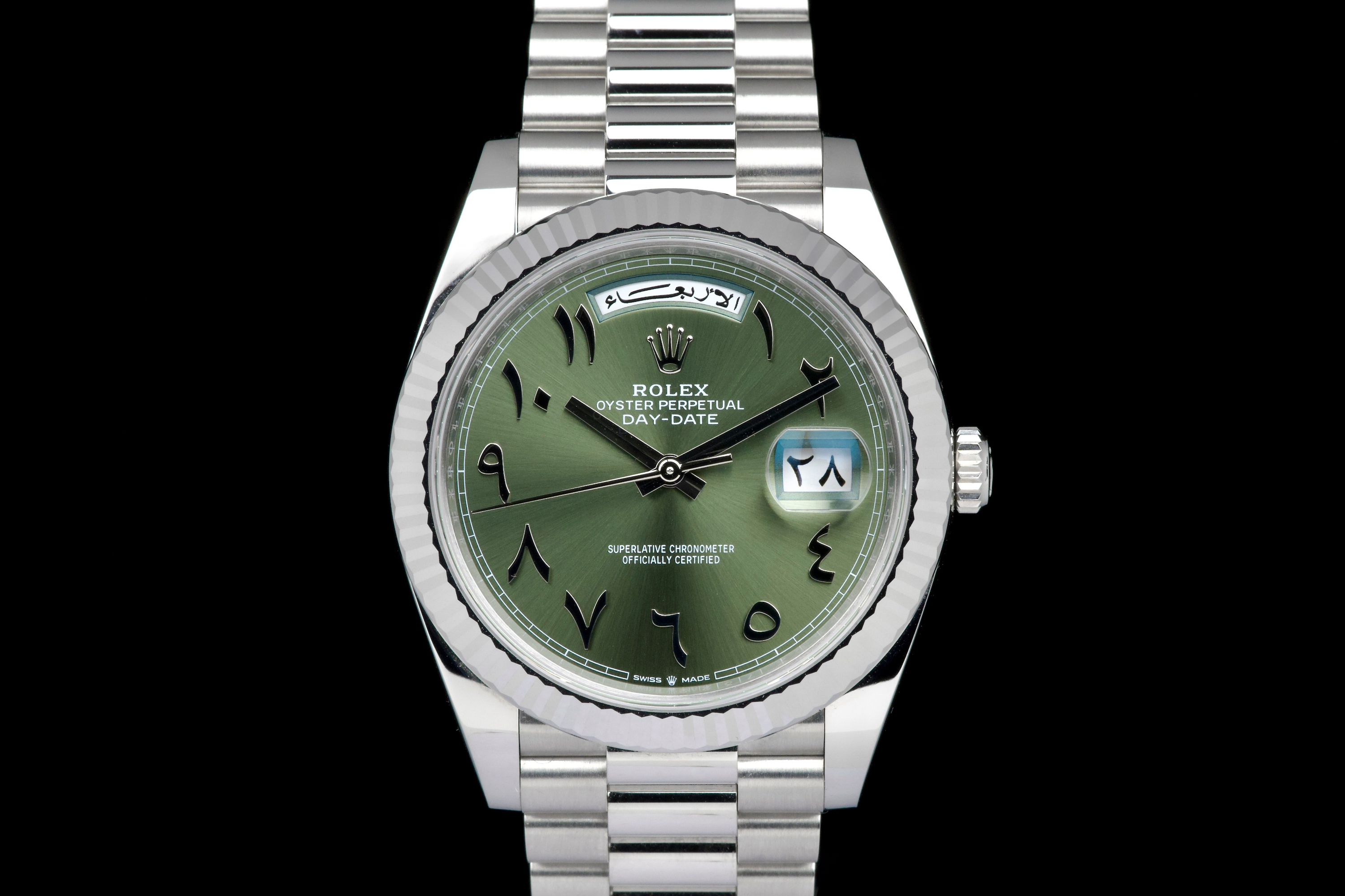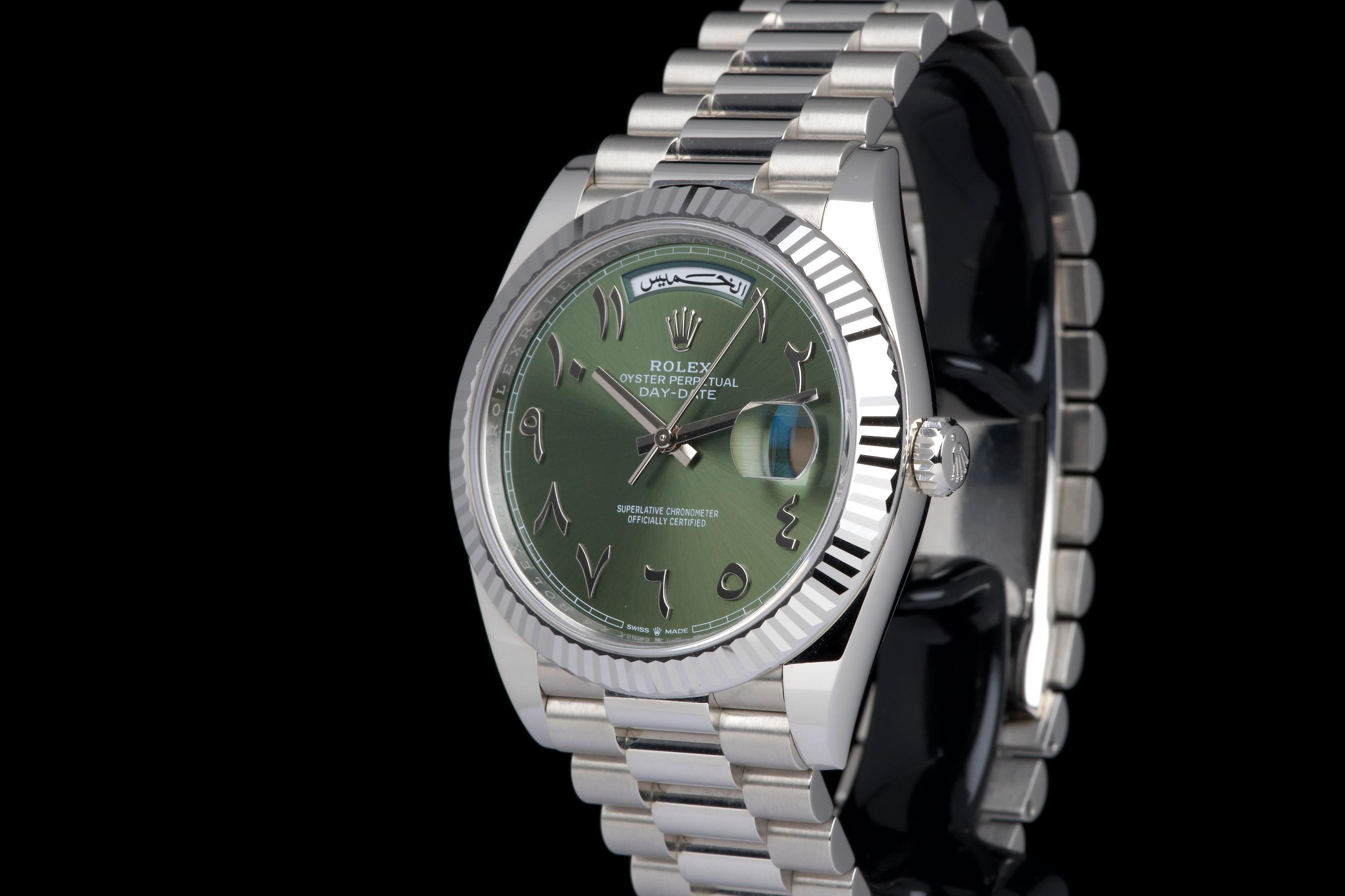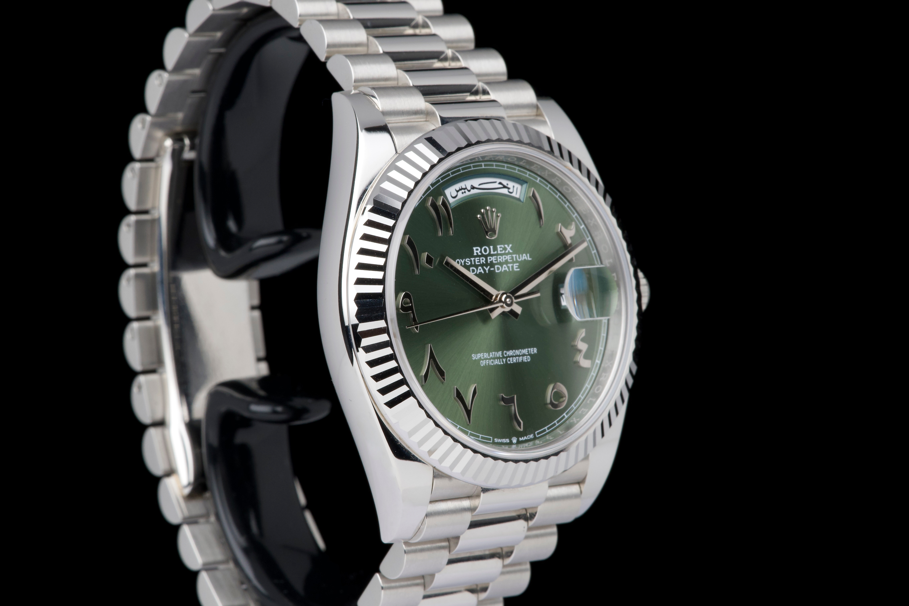 An exceptional and extremely rare platinum Day-Date 40, featuring the striking green dial with Arabic Eastern numerals — a configuration available only in select Middle Eastern markets. This new-generation Day-Date is fitted with the platinum fluted bezel, a feature introduced in 2022. The 40 mm case remains unpolished and in close-to-new condition, showing only the lightest signs of very careful use by its original owner. The platinum President bracelet is complete with all links. Powered by the Rolex caliber 3255, offering a 70-hour power reserve, Chronergy escapement, and Superlative Chronometer precision. Complete with its original box, warranty card, and accessories. A highly collectible modern Rolex, combining platinum construction, exclusive Arabic green dial, and the new-generation fluted bezel — one of the most desirable configurations of the Day-Date 40 and rarely available on the international market.