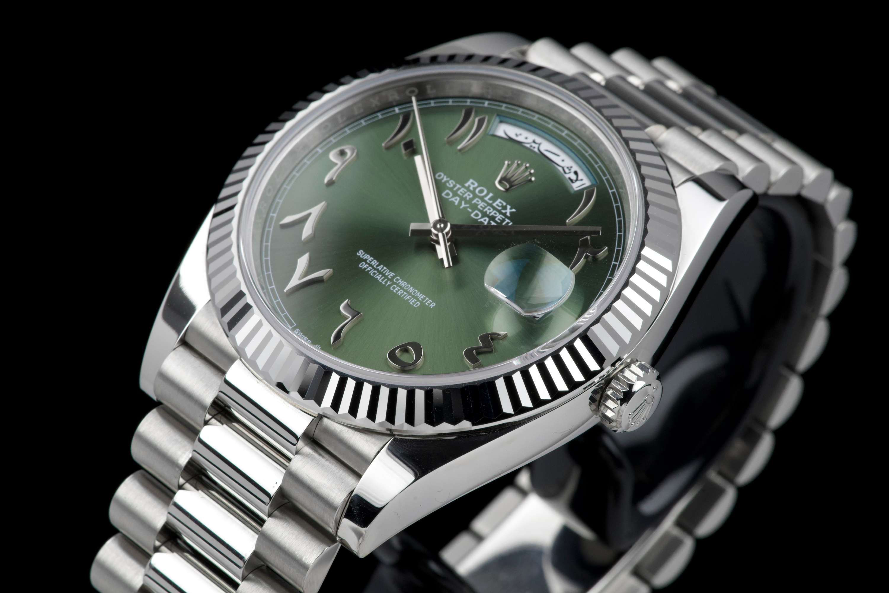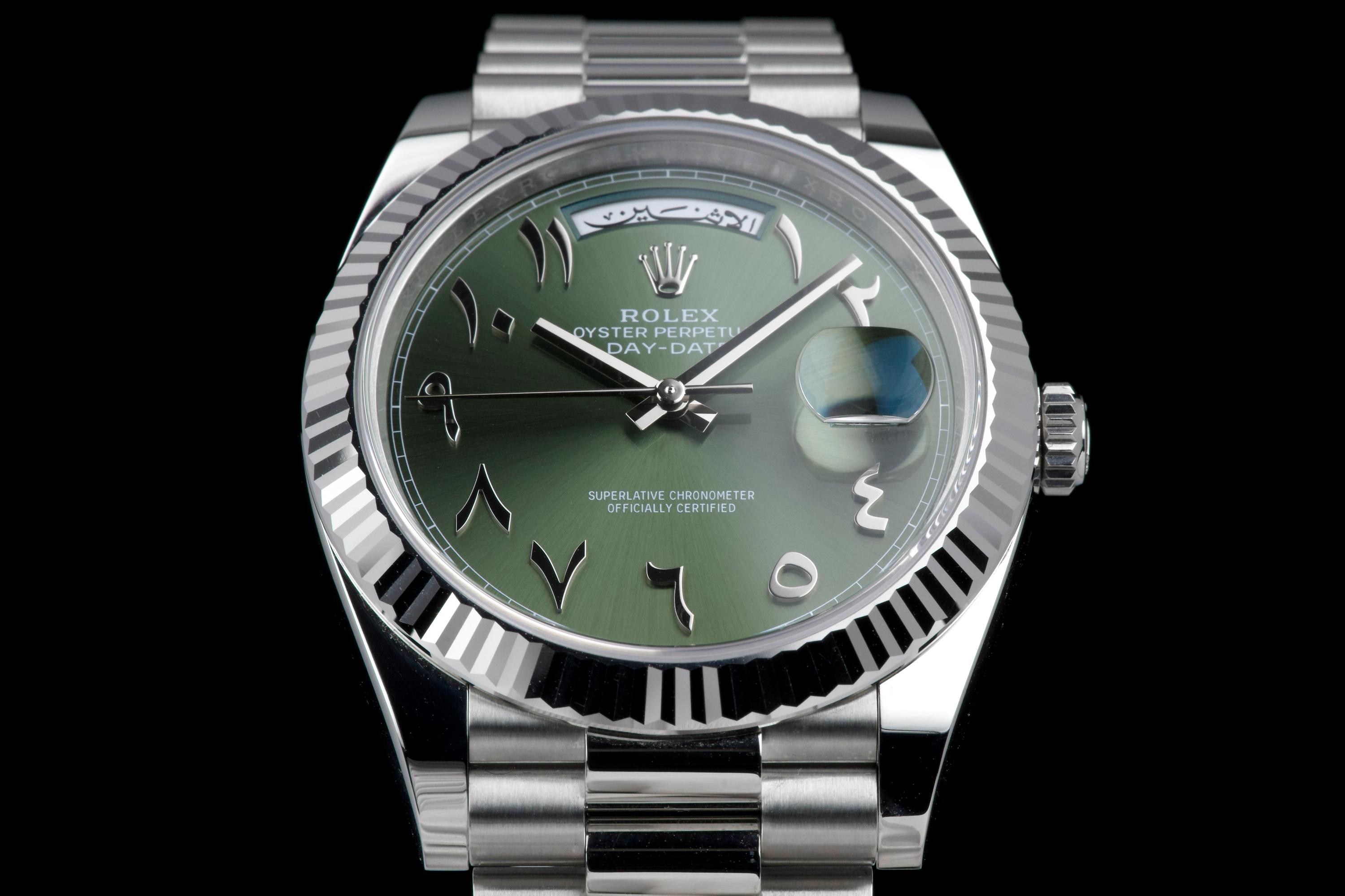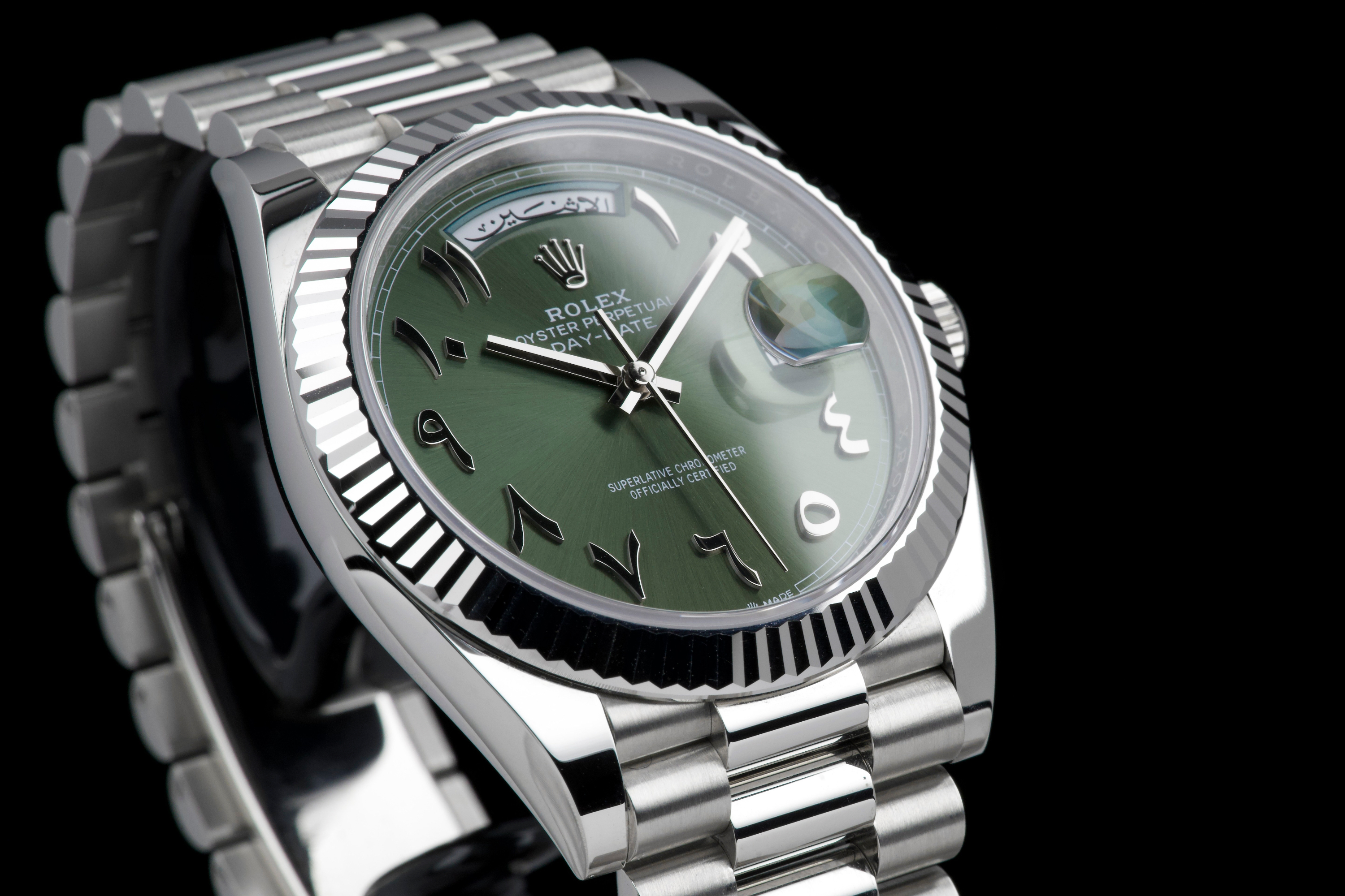 An exceptional and extremely rare platinum Day-Date 40, featuring the striking green dial with Arabic Eastern numerals — a configuration available only in select Middle Eastern markets. This new-generation Day-Date is fitted with the platinum fluted bezel, a feature introduced in 2022. The 40 mm case remains unpolished and in close-to-new condition, showing only the lightest signs of very careful use by its original owner. The platinum President bracelet is complete with all links. Powered by the Rolex caliber 3255, offering a 70-hour power reserve, Chronergy escapement, and Superlative Chronometer precision. Complete with its original box, warranty card, and accessories. A highly collectible modern Rolex, combining platinum construction, exclusive Arabic green dial, and the new-generation fluted bezel — one of the most desirable configurations of the Day-Date 40 and rarely available on the international market.