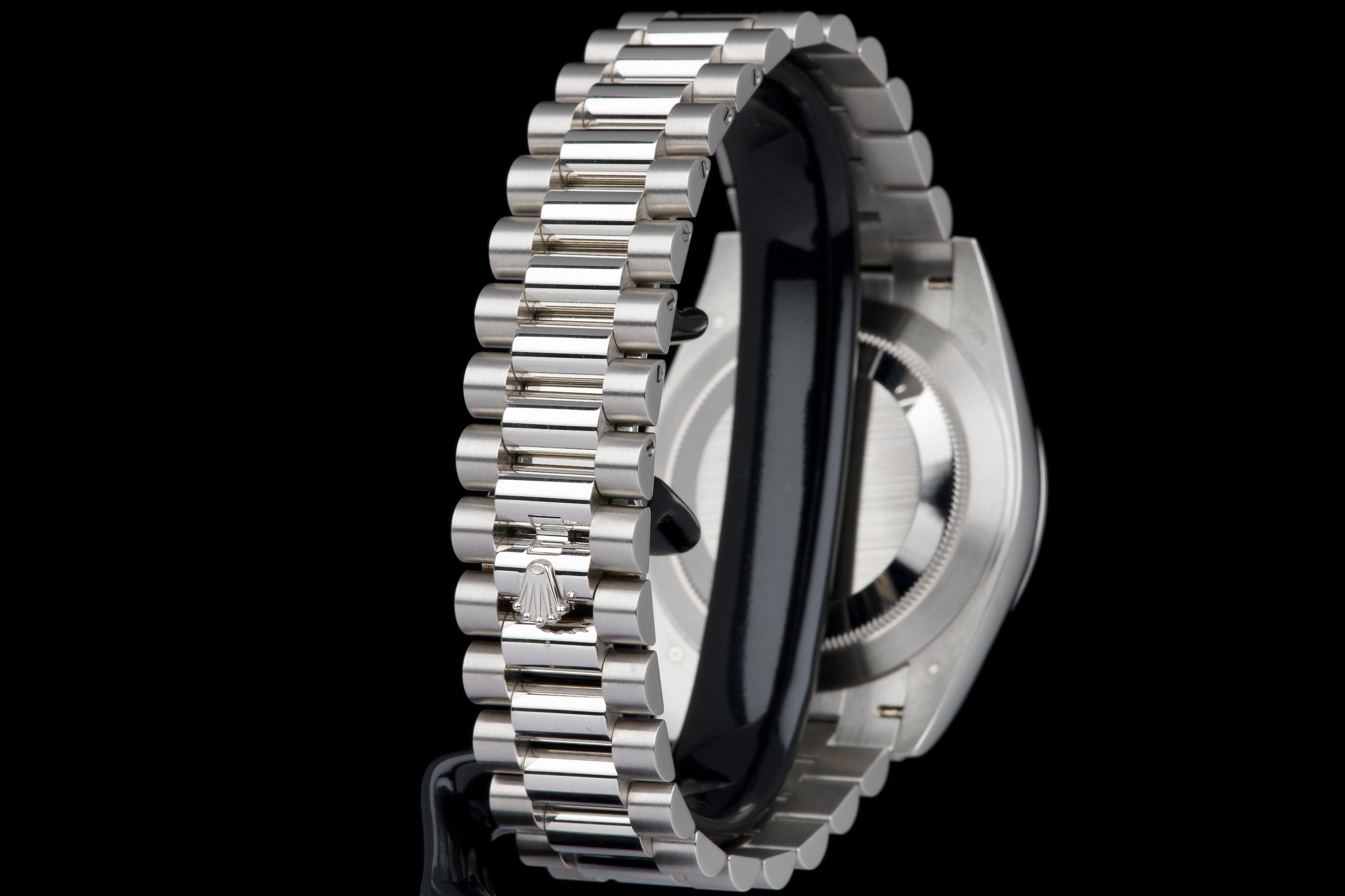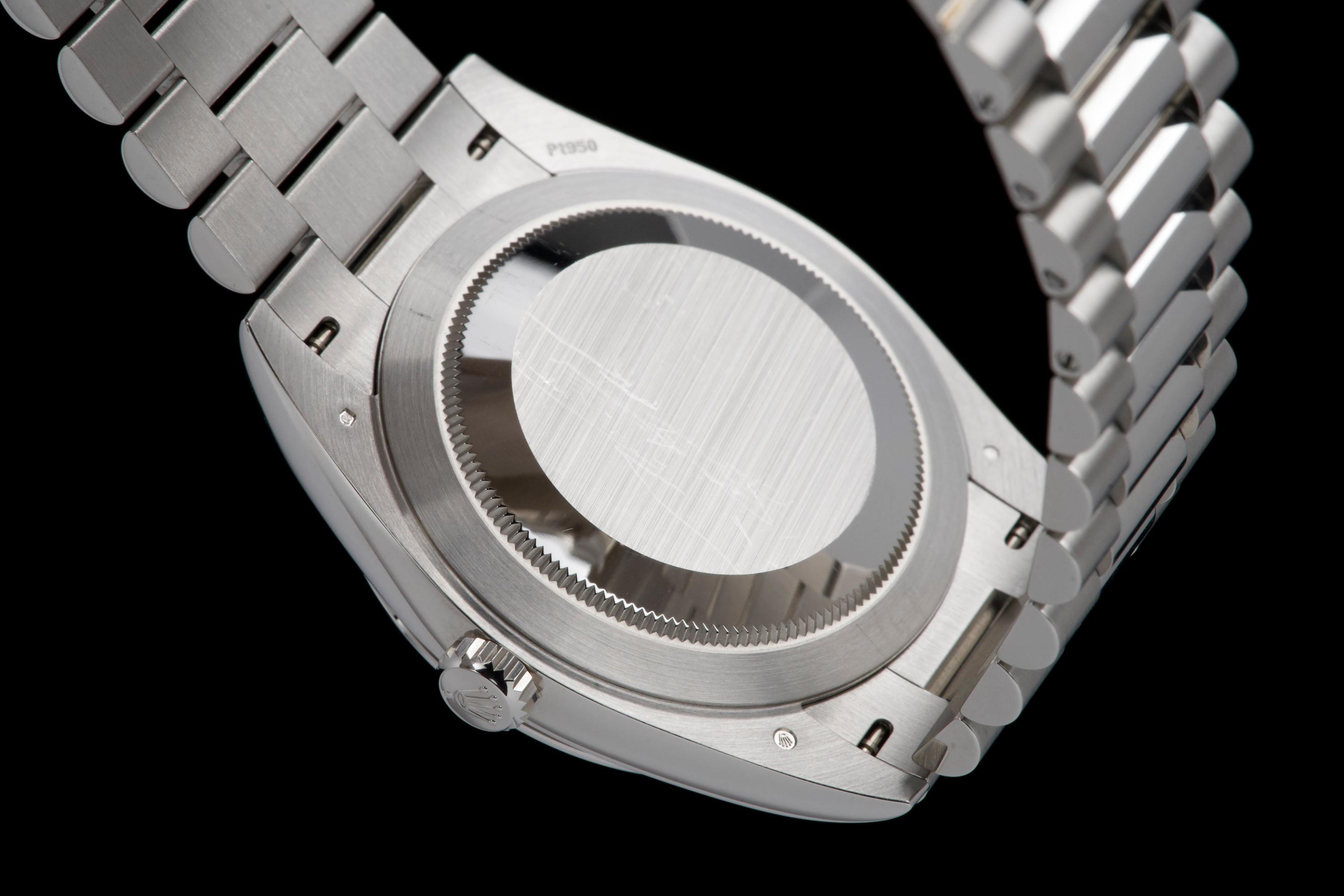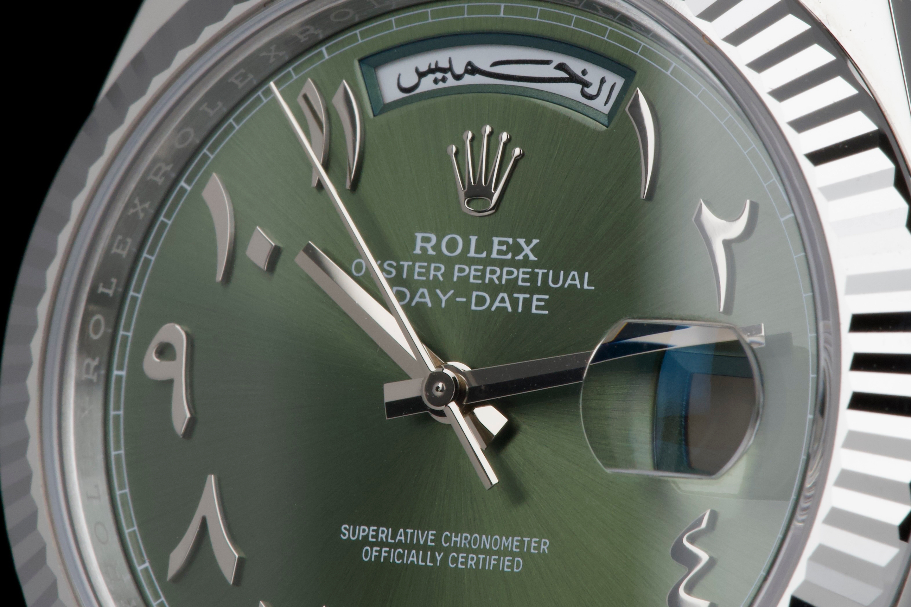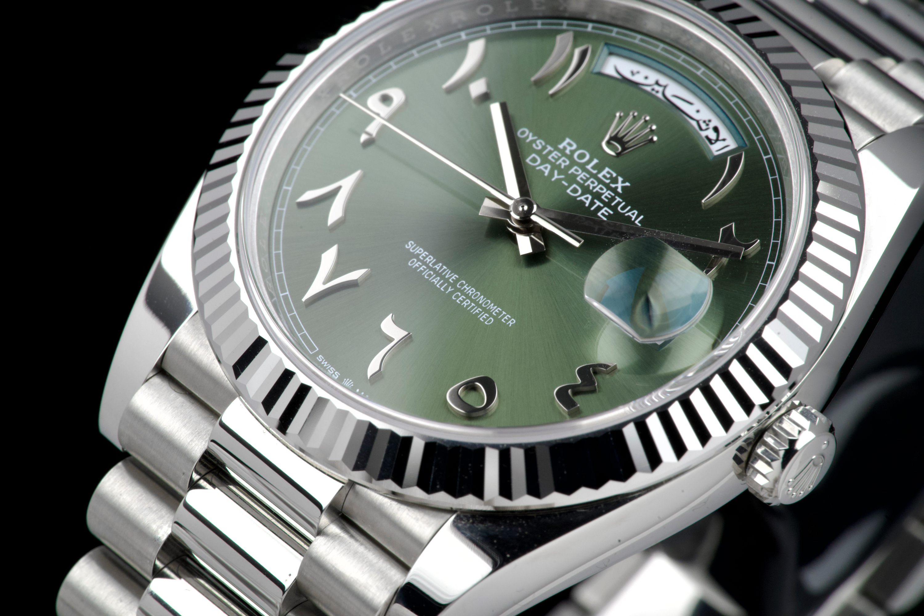 An exceptional and extremely rare platinum Day-Date 40, featuring the striking green dial with Arabic Eastern numerals — a configuration available only in select Middle Eastern markets. This new-generation Day-Date is fitted with the platinum fluted bezel, a feature introduced in 2022. The 40 mm case remains unpolished and in close-to-new condition, showing only the lightest signs of very careful use by its original owner. The platinum President bracelet is complete with all links. Powered by the Rolex caliber 3255, offering a 70-hour power reserve, Chronergy escapement, and Superlative Chronometer precision. Complete with its original box, warranty card, and accessories. A highly collectible modern Rolex, combining platinum construction, exclusive Arabic green dial, and the new-generation fluted bezel — one of the most desirable configurations of the Day-Date 40 and rarely available on the international market.