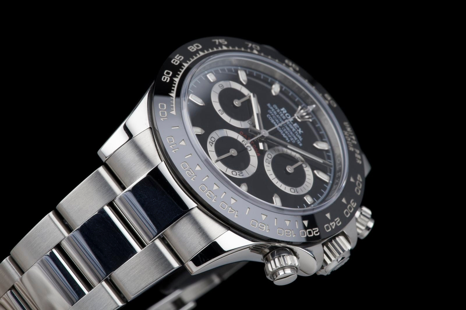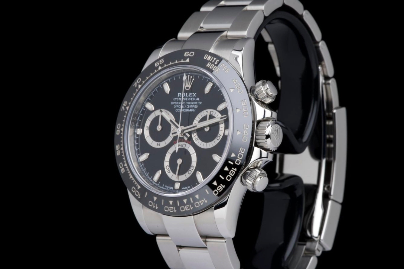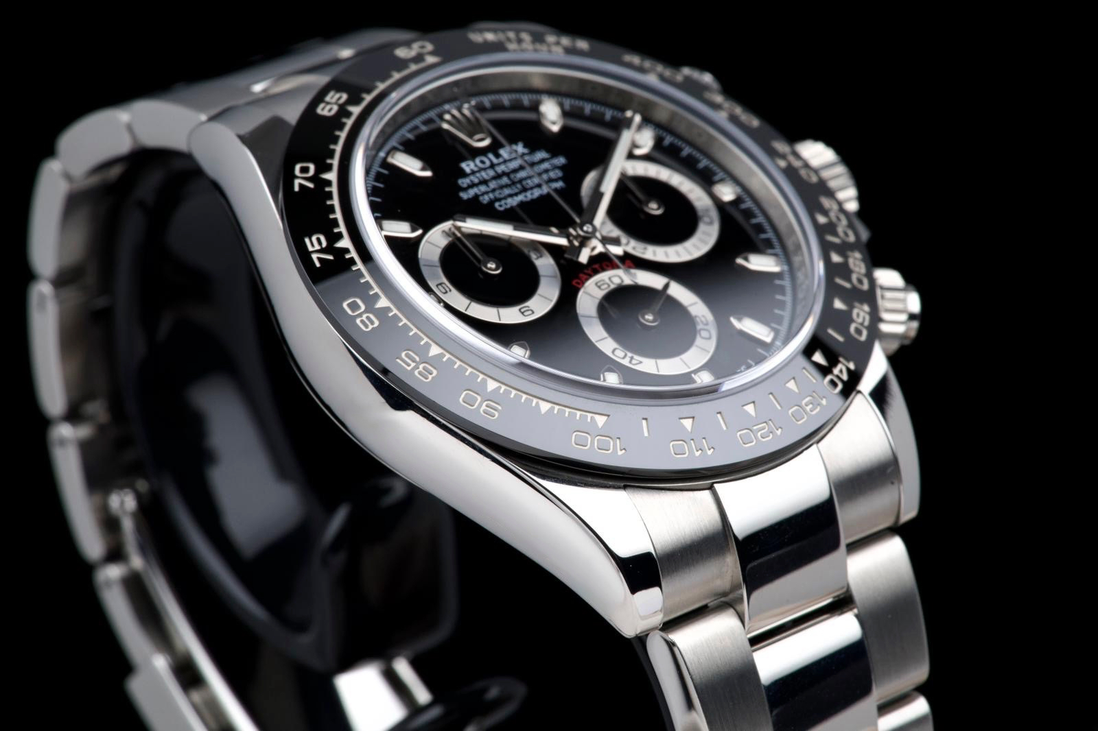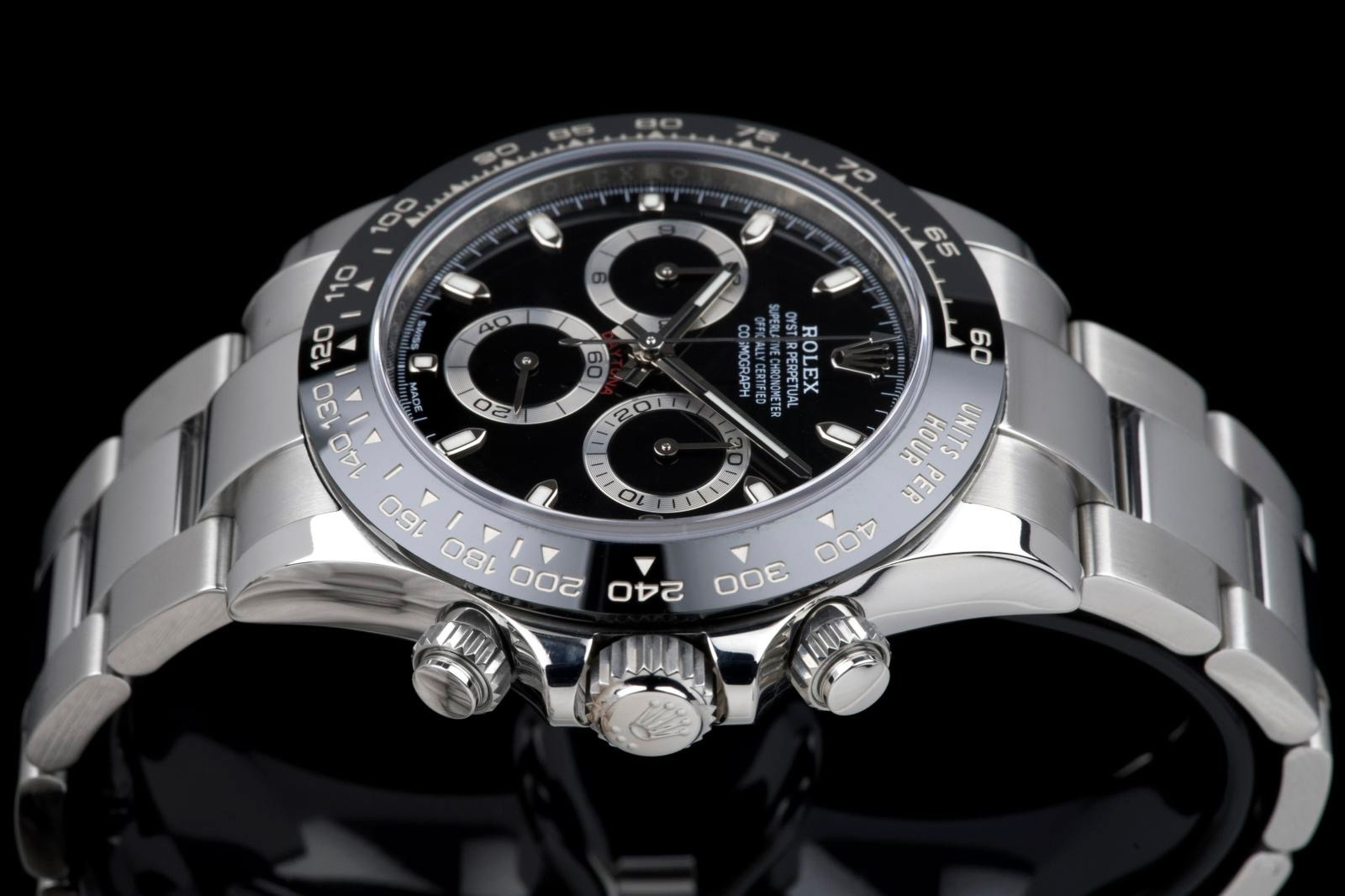 Presented here is a modern icon of Rolex sports chronographs: the Cosmograph Daytona reference 116500LN with black dial. Introduced with a Cerachrom bezel and instantly recognizable for its balanced and highly legible design, this stainless steel Daytona remains one of the most sought-after contemporary Rolex models. This example dates to 2020 and was originally sold in Ontario, Canada, accompanied by the earlier-style warranty card. The watch has recently been professionally polished by our watchmaker and now presents in excellent condition, with clean lines and a refined overall appearance. Offered as a full set with its original box, papers, and accessories, the watch has no recorded service history but is in perfect working order, having been checked by our watchmaker. A well-presented and complete example of a contemporary Daytona, combining strong desirability with immediate wearability.