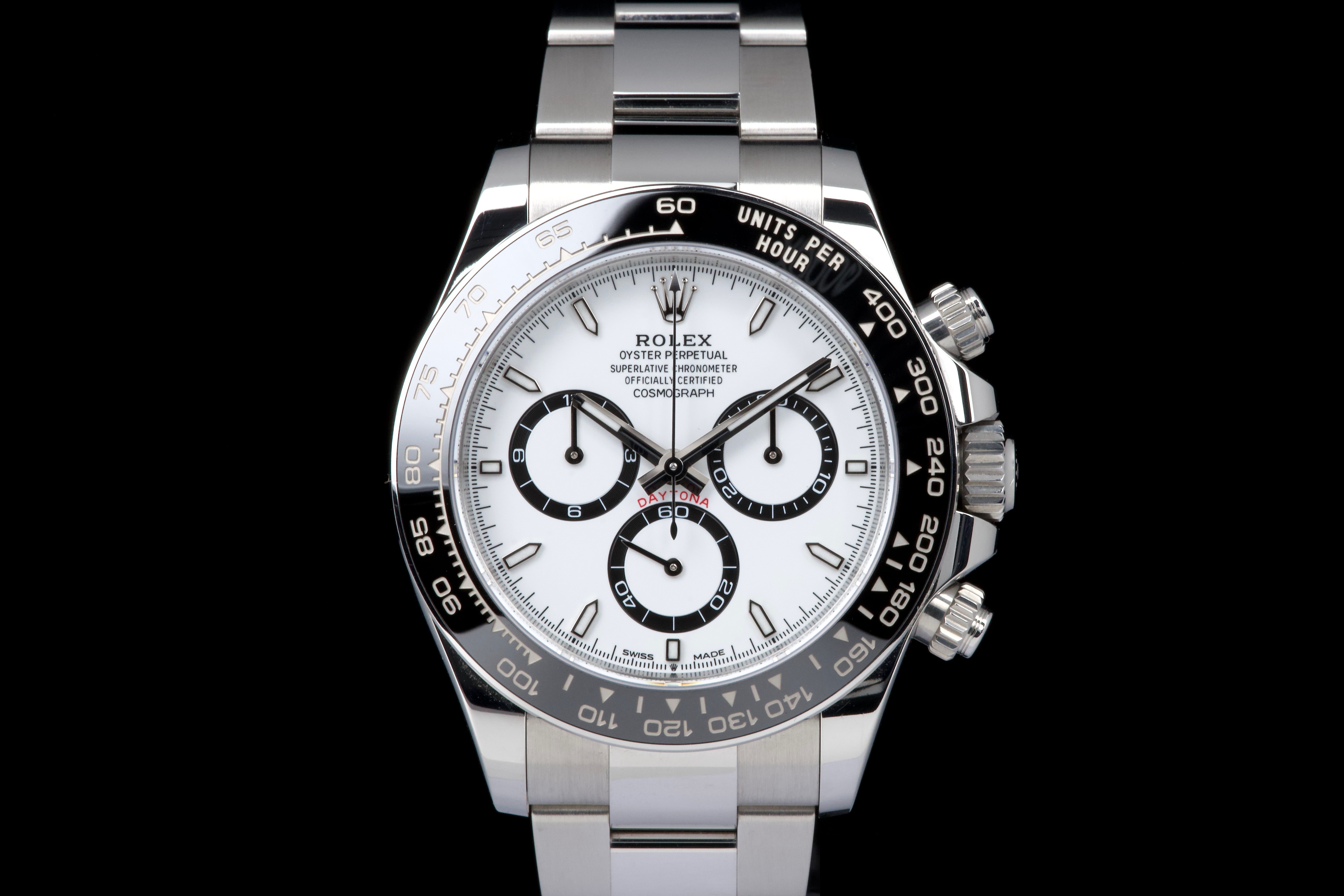 A beautiful example of the new-generation Rolex Cosmograph Daytona 126500LN, featuring the highly sought-after white “Panda” dial with black ceramic Cerachrom bezel. Purchased new in Switzerland by its original owner, this watch remains unpolished and shows only light wear from careful use. The stainless steel case and Oyster bracelet retain their crisp lines and superb proportions. Powered by the latest Rolex caliber 4131, offering a 72-hour power reserve and certified Superlative Chronometer precision. Comes with its original box, warranty card, and accessories, though the Daytona booklet and outer packaging are not included. A superb and honest example of the latest Daytona reference — elegant, precise, and instantly recognizable.