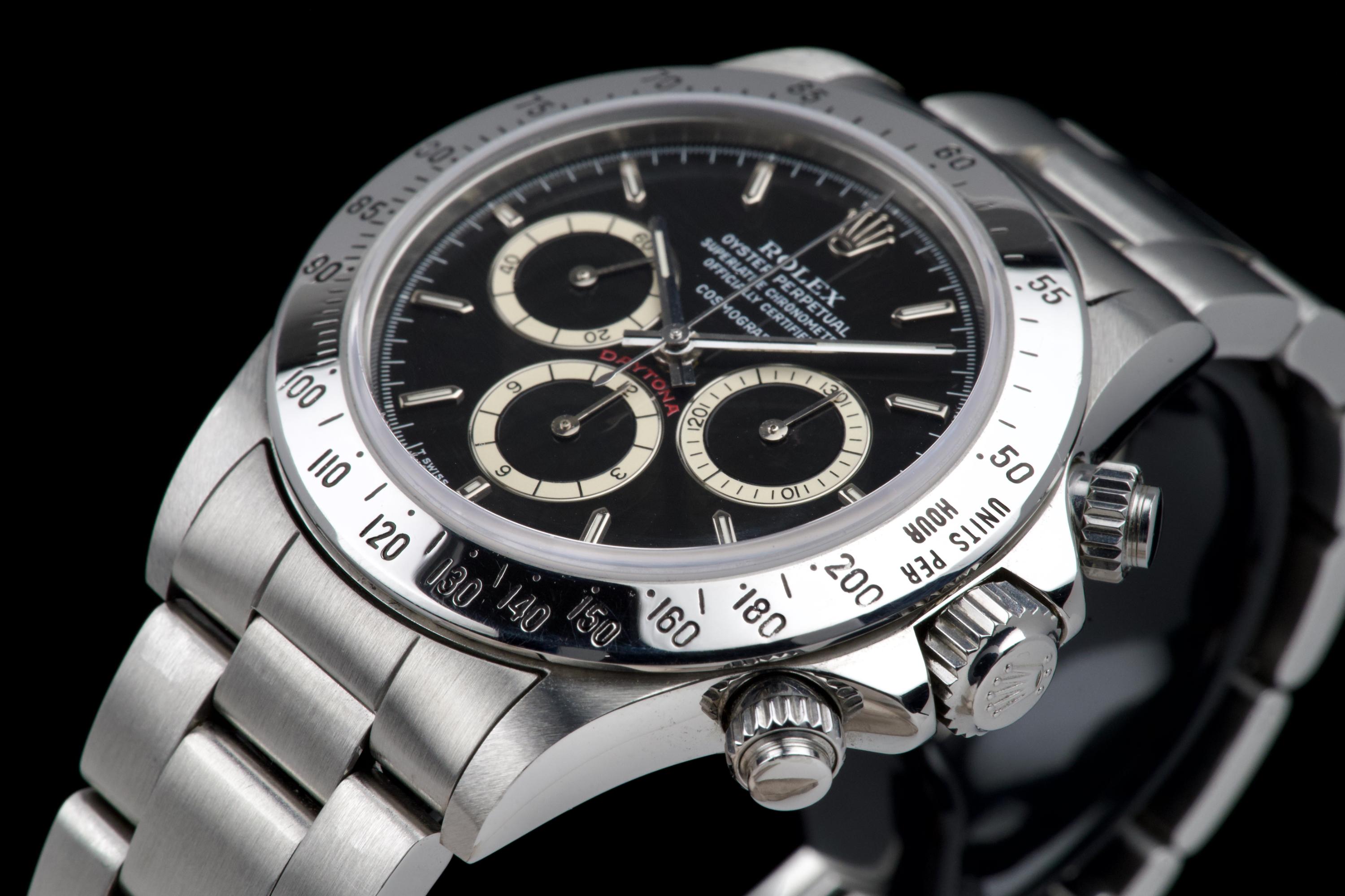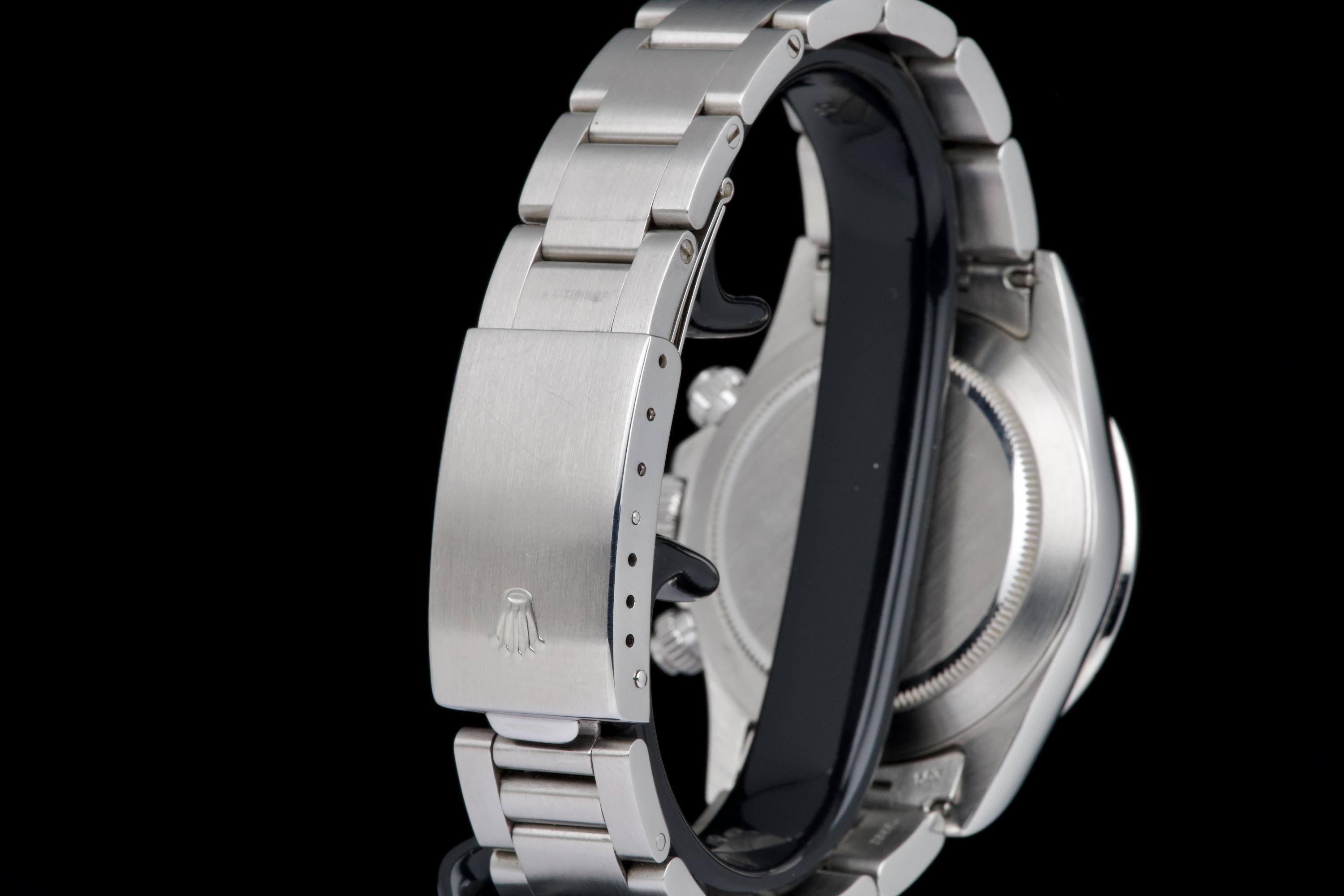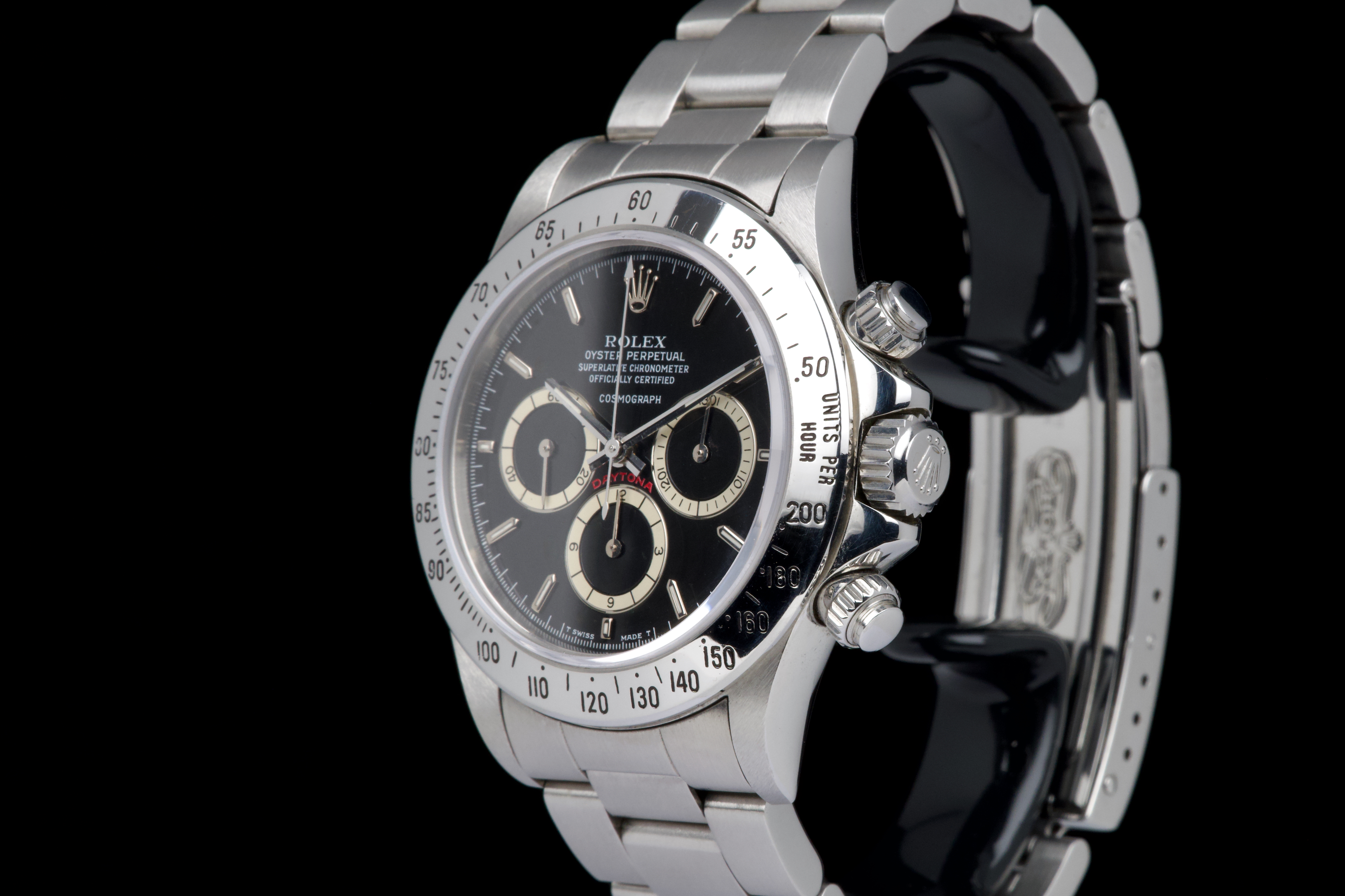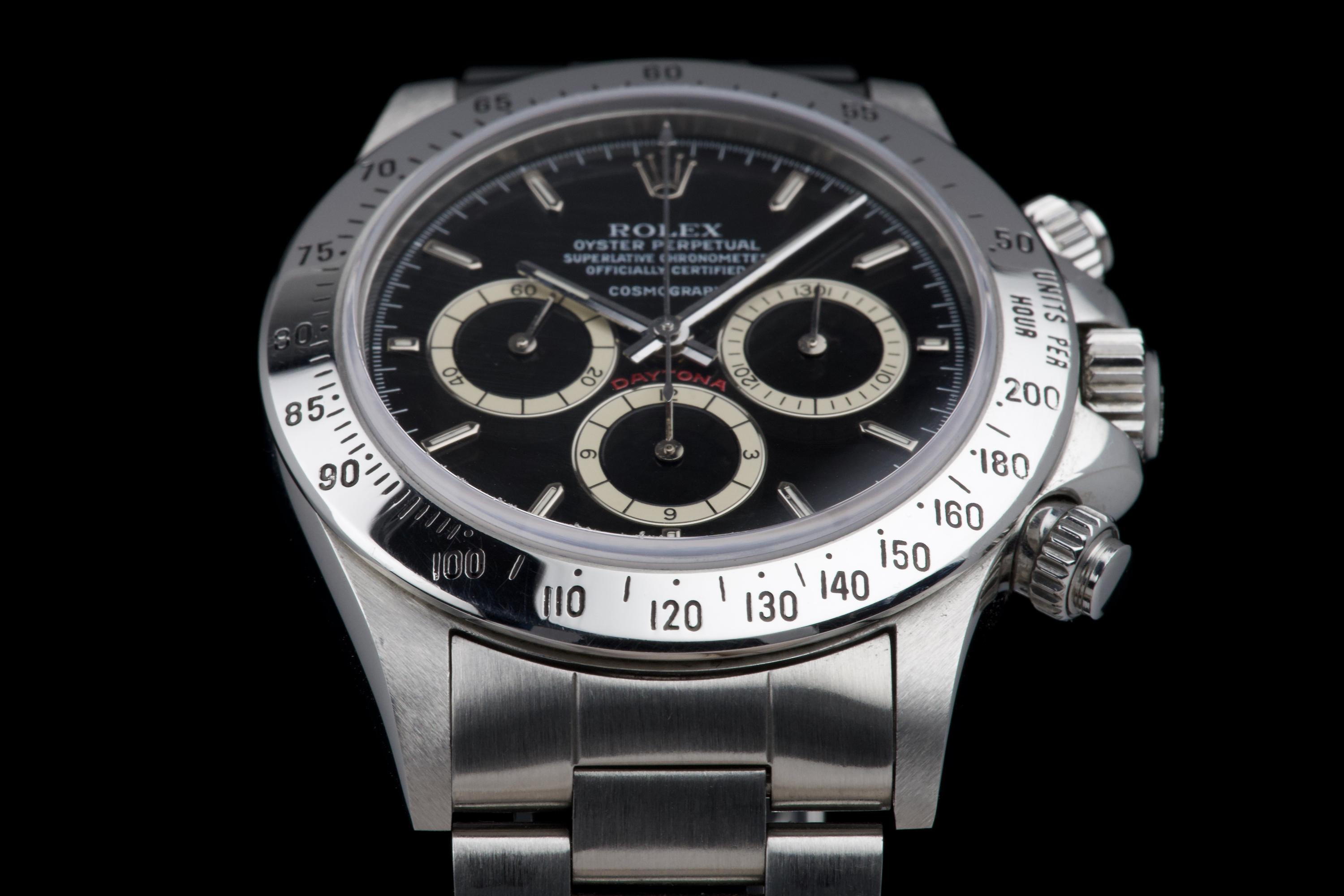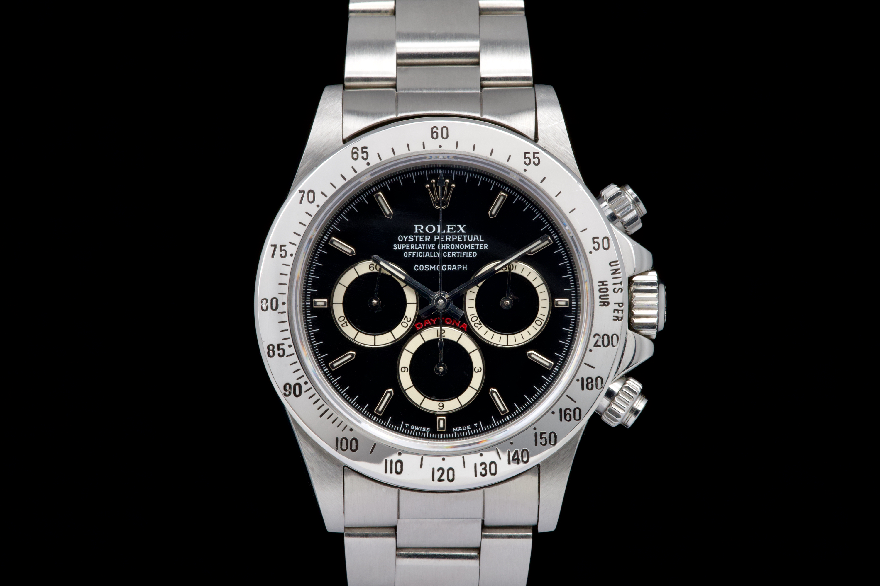 An exceptional early example of the Rolex Cosmograph Daytona reference 16520, featuring the highly sought-after black “Floating” dial, powered by the Zenith-based caliber 4030. The case is sharp and thick, showing only very light signs of past polishing, and retains excellent proportions. The bezel is also in excellent condition, with crisp engravings — the black enamel within the numerals remains strong and vivid. The original black tritium dial is in beautiful condition, with only minor imperfections near the center of the subdials, a common trait on early floating examples. The hands are perfectly matching. Fitted with its original 78360 all-brushed Oyster bracelet, showing minimal stretch, with 503 endlinks and claspcode P6. The serial number R7XXXXX and reference engravings between the lugs are deep and perfectly legible, confirming an excellent, well-preserved case. The movement has been checked by our watchmaker and runs perfectly. Comes with the set shown in the pictures. A superb and honest early Daytona “Floating Dial” — rare, crisp, and highly collectible.