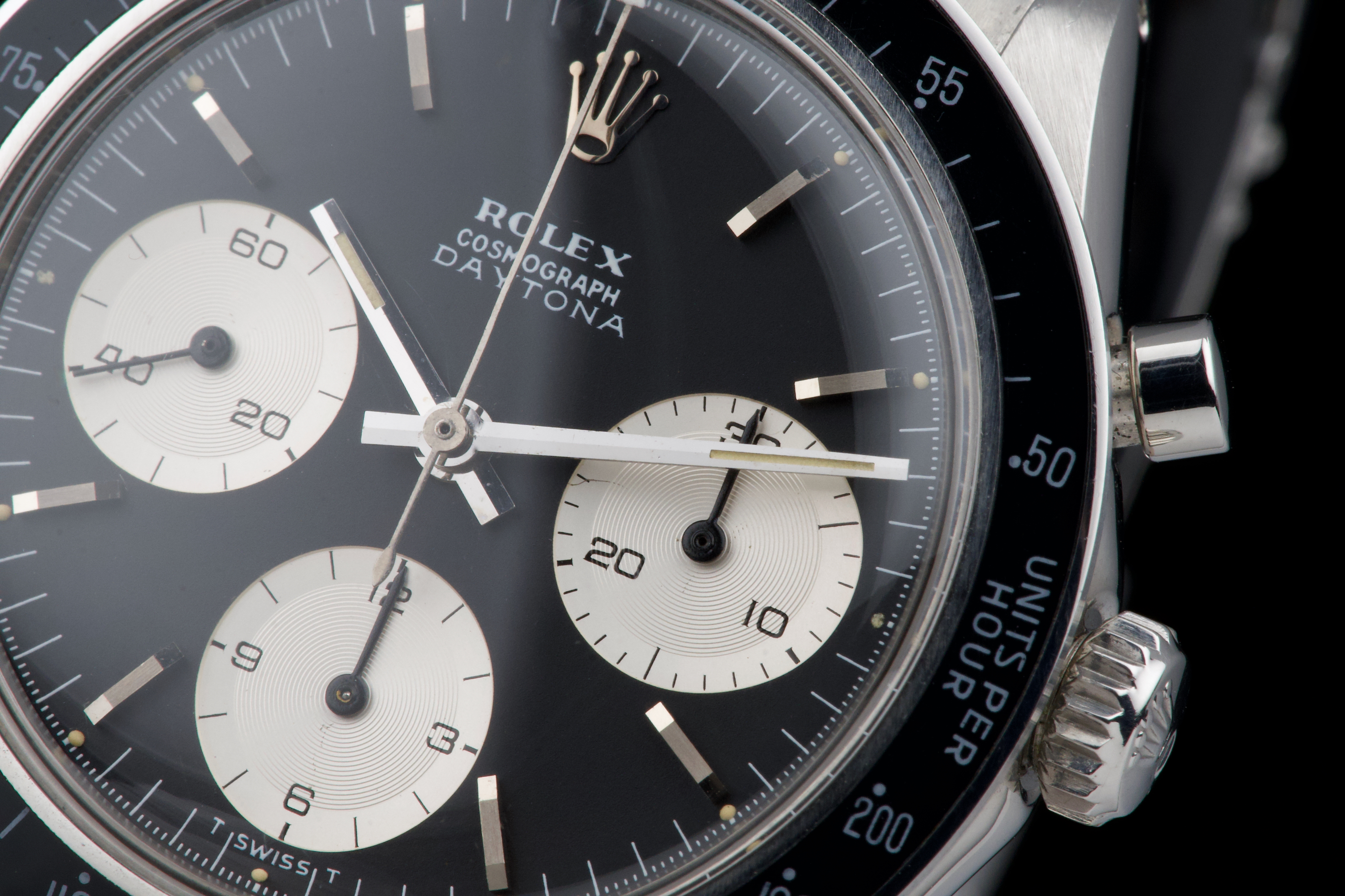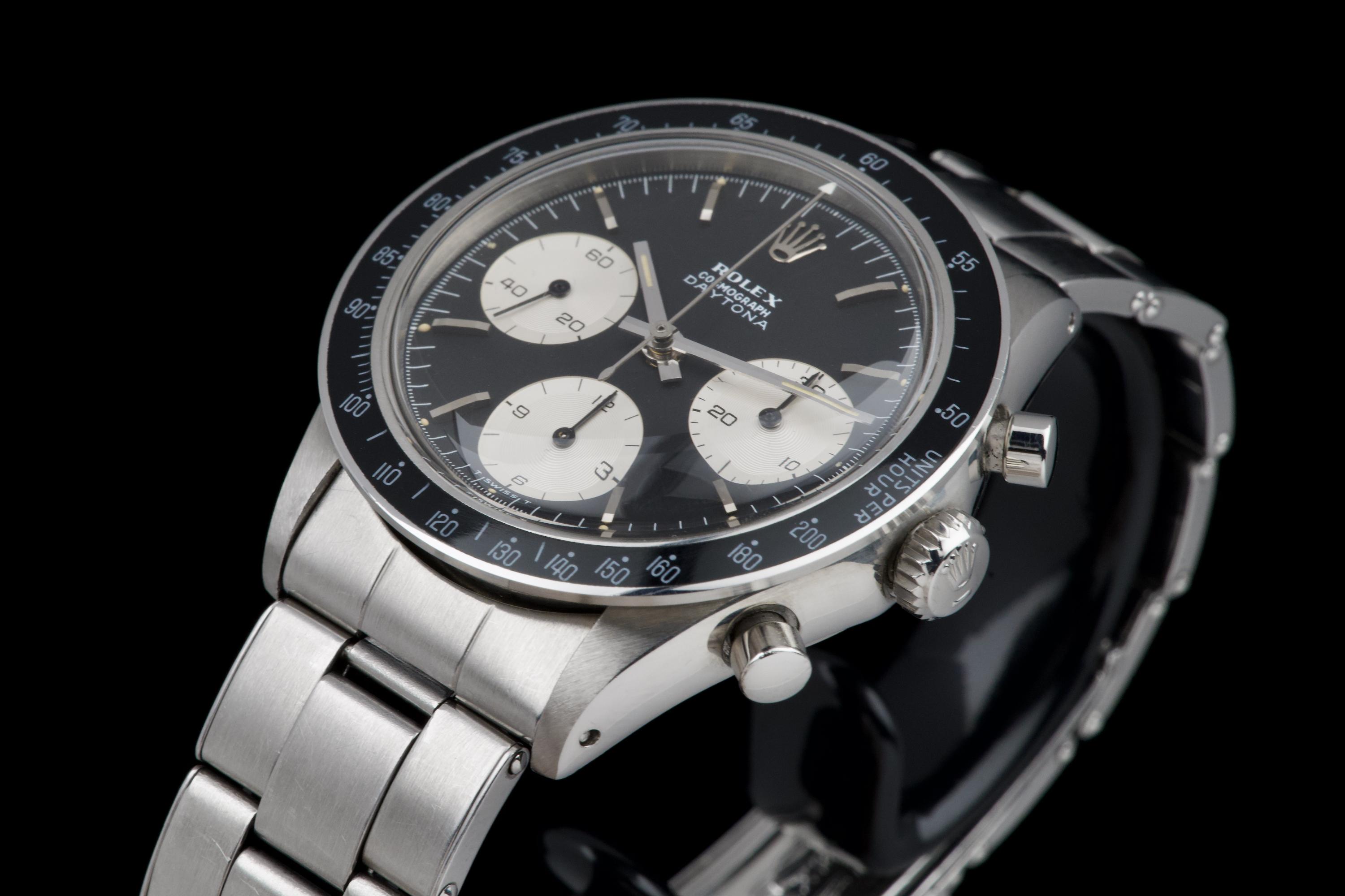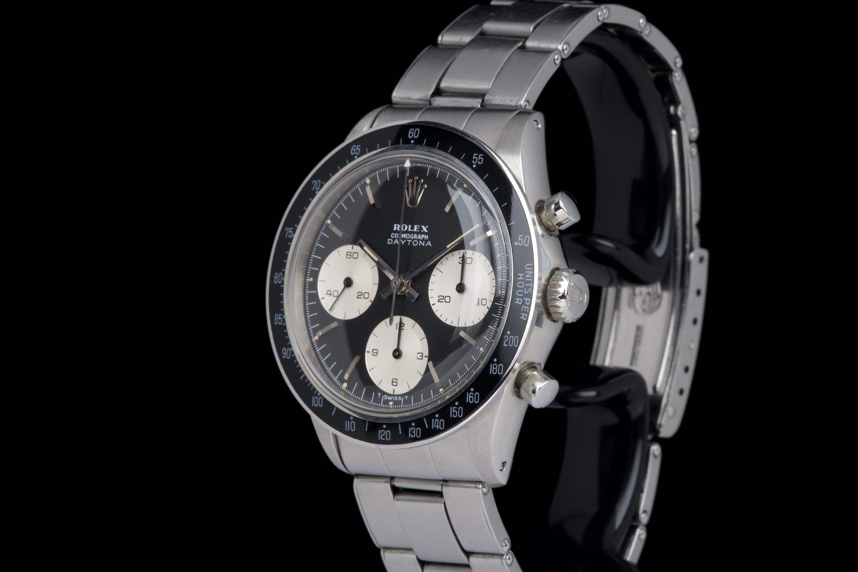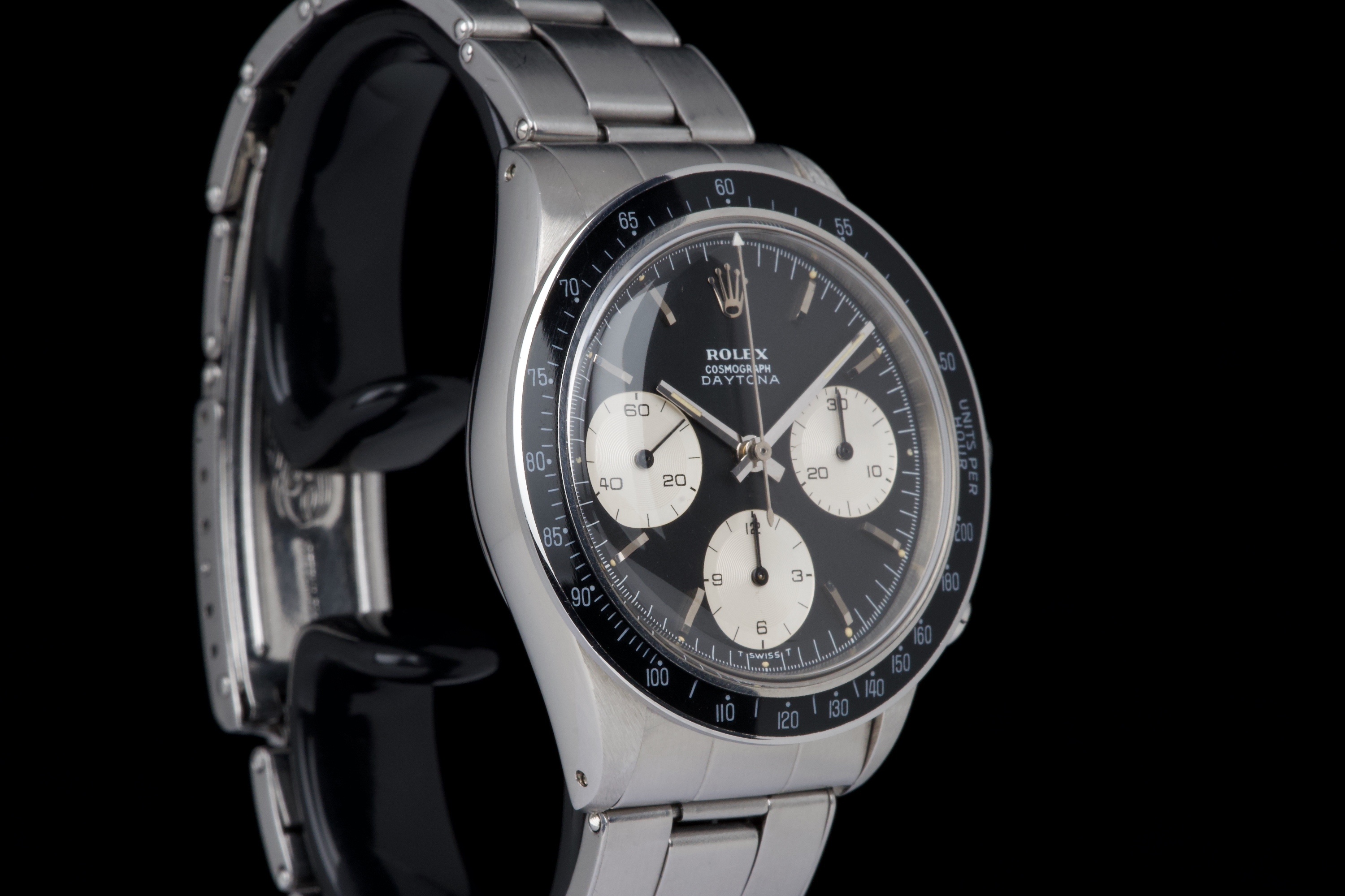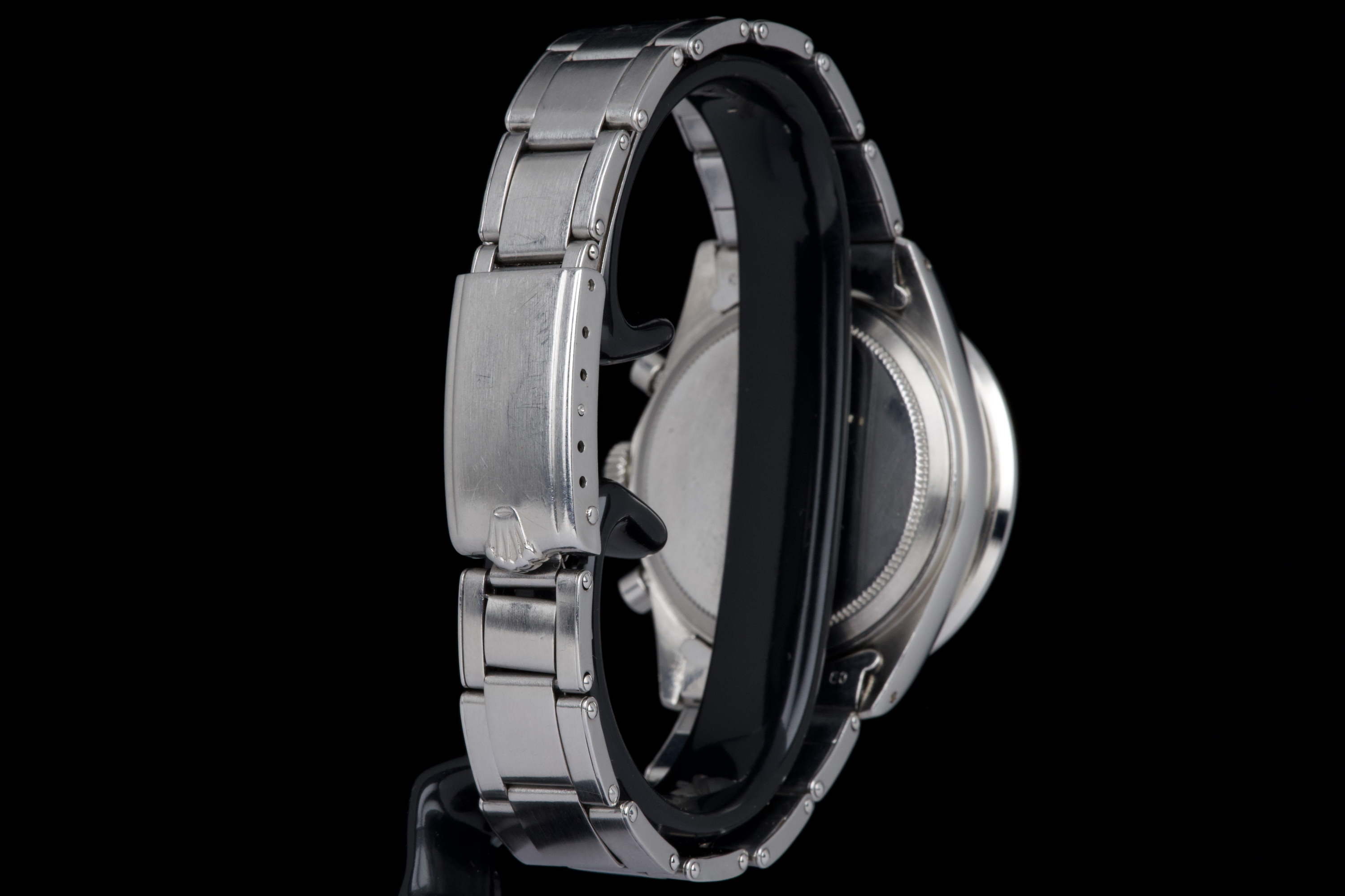 An exceptionally well-preserved and extremely rare example of the Rolex Cosmograph Daytona reference 6241, produced in 1968 and fitted with the coveted black “Big Logo” dial. The dial is in remarkable condition, with only a microscopic mark inside the 3 o’clock subdial, visible under magnification but not to the naked eye. The luminous plots at 3 and 9 o’clock are partially missing — a common and reassuring trait for untouched Daytona dials of this era, confirming that the lume has never been redone. The hands are perfectly matching and in superb condition; under UV light, all luminous material (dial and hands) glows briefly and fades uniformly, exactly as correct vintage tritium should. The original Mark 1 bakelite bezel is outstanding — free of cracks, chips, or notable wear, which is extraordinarily rare for a 1960s Daytona. The stainless-steel case is in extraordinary condition, appearing unpolished; if it was ever polished, it was done with extreme restraint. The serial and reference numbers between the lugs are deep, crisp, and perfectly legible, confirming a beautifully preserved case. The caseback is correctly stamped 6241 and displays two Rolex Geneva service engravings, a very positive sign of proper historical maintenance. Inside, the Valjoux-based Rolex caliber 722 is clean, functioning perfectly, and has been checked by our watchmaker. The watch is fitted with a riveted 7205 bracelet with 60 endlinks, showing very minimal stretch for its age. The clasp is stamped 1.67, consistent with the period. We handle many vintage Daytonas, but this example stands out dramatically. Its combination of pump pushers, black non–Paul Newman Big Logo dial, and mint MK1 bakelite bezel makes it one of the most elegant and desirable vintage chronographs ever produced — a reference 6241 in truly remarkable collector condition.