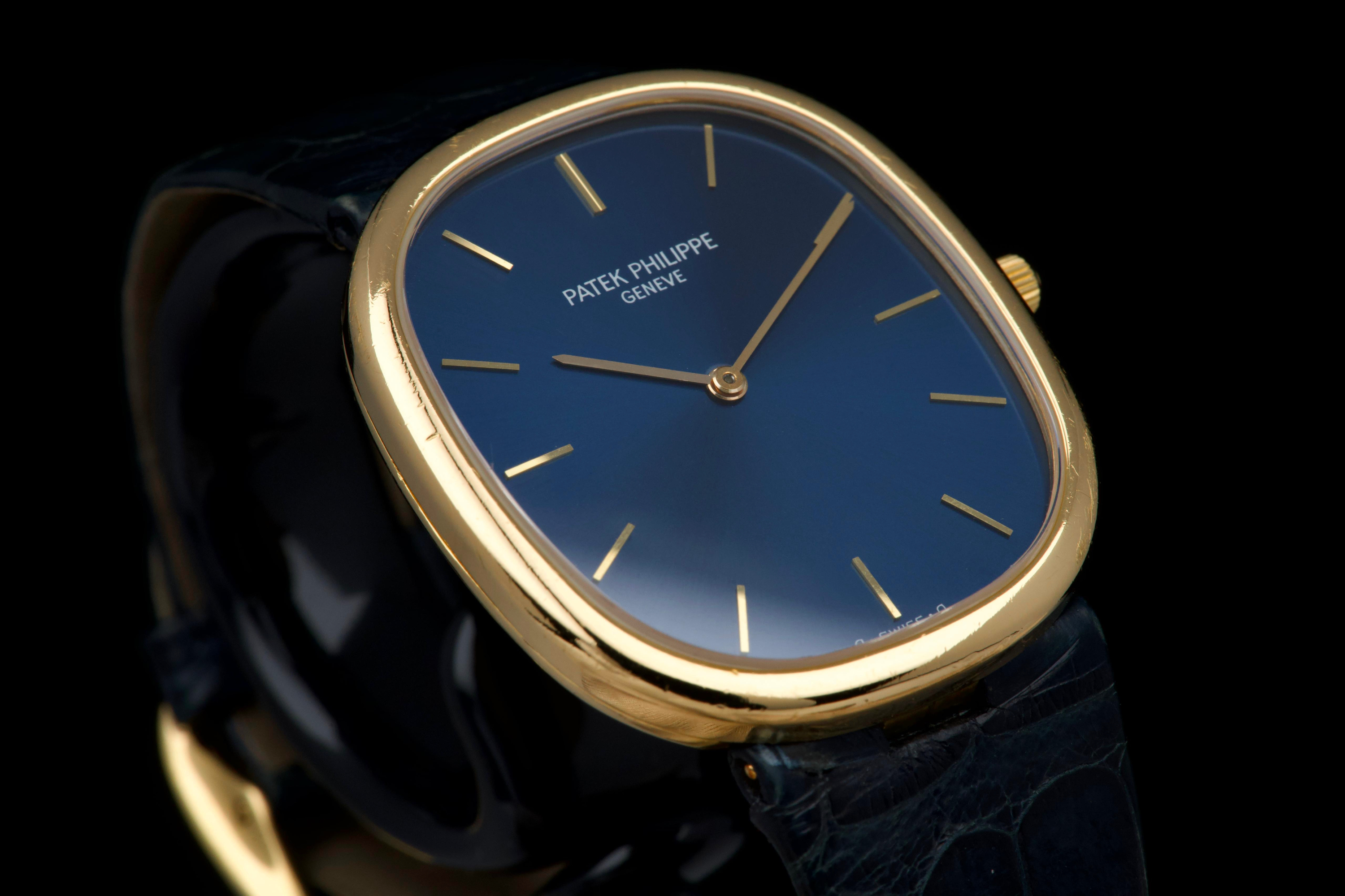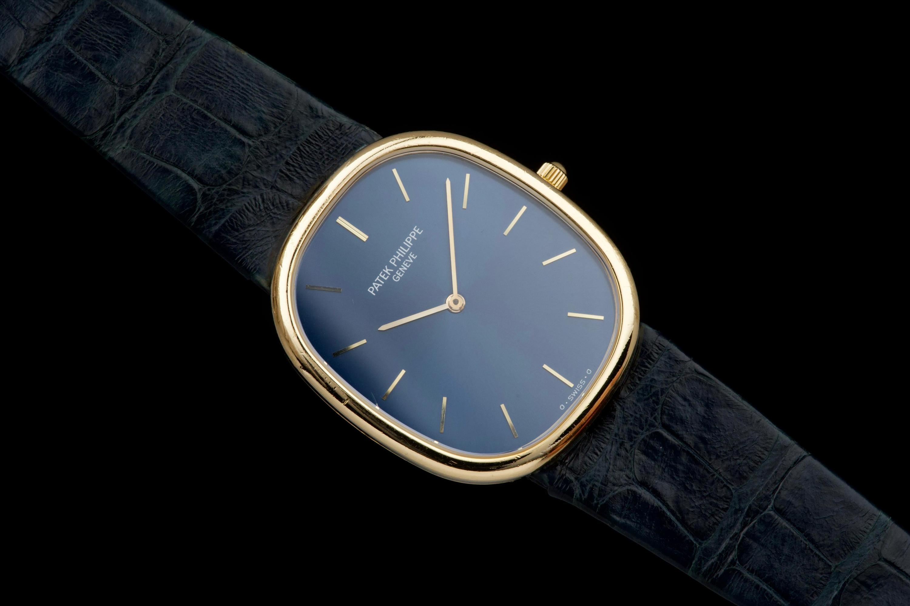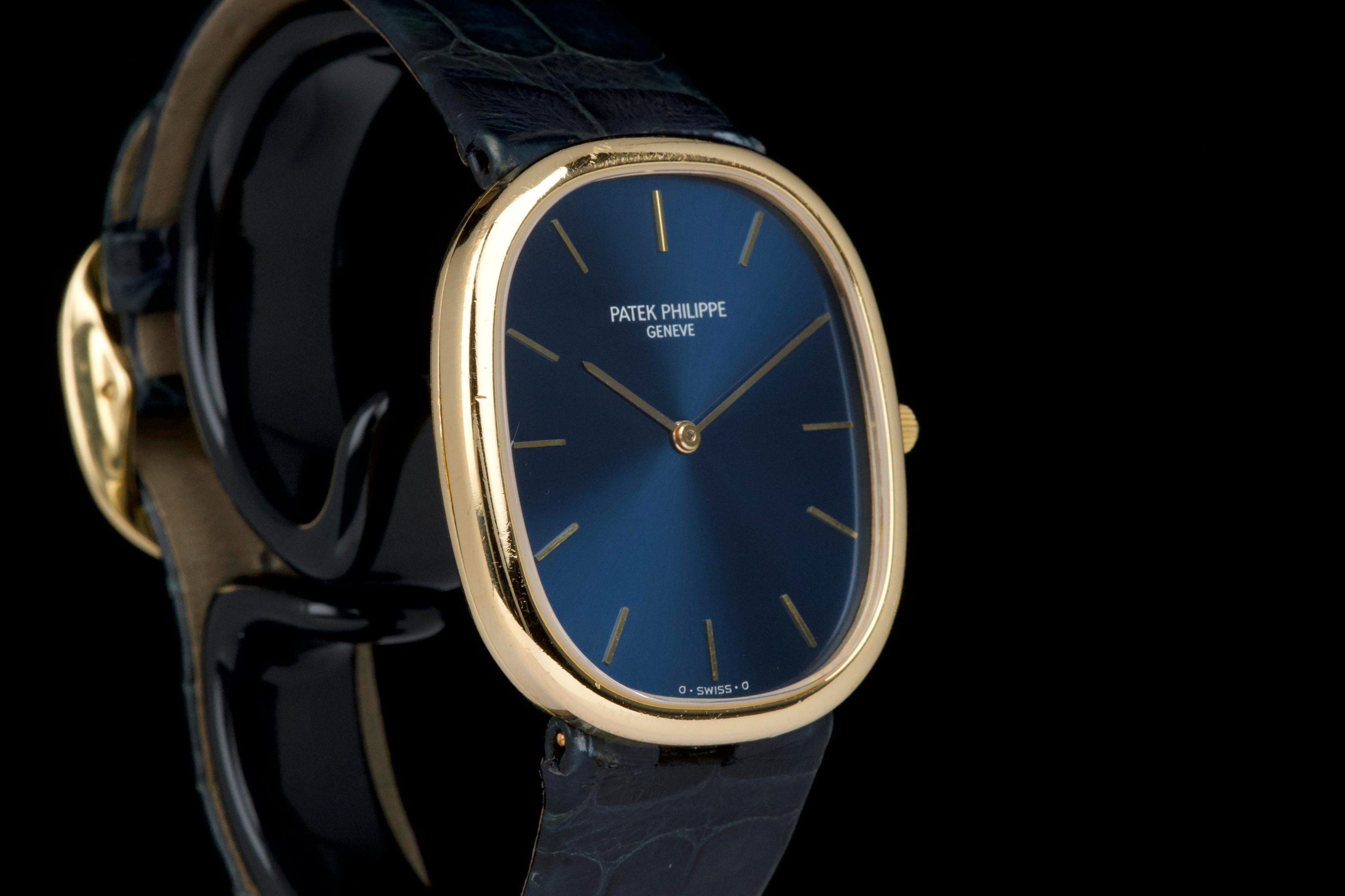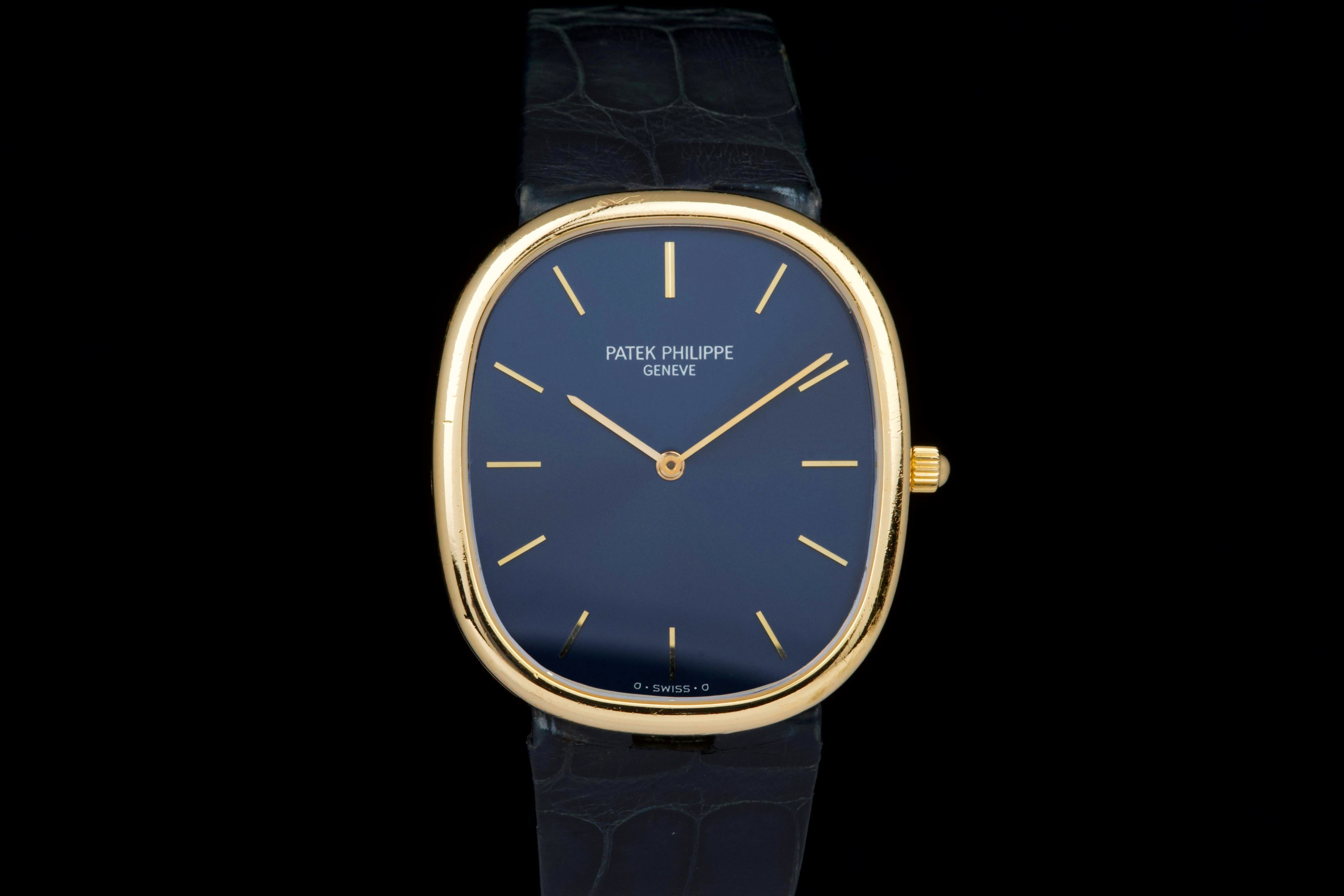 The present Patek Philippe Golden Ellipse reference 3738, executed in yellow gold and dating to the 1980s, is an elegant and honest example of one of the manufacture’s most distinctive and enduring dress watch designs. With its harmonious proportions inspired by the golden ratio, the Ellipse remains a timeless icon within Patek Philippe’s catalogue. This example measures approximately 31 x 35 mm, offering the refined and discreet dimensions characteristic of the period. The case has been polished in the past and is preserved in good overall condition. It displays surface scratches consistent with normal use and age—entirely expected for a watch approaching forty years old. Importantly, the gold hallmarks remain visible on the case, a reassuring indicator of honest wear and preservation. The watch is fitted with a superb sunburst blue dial, which is preserved in perfect condition and remains a defining highlight of the piece. The hands match beautifully, creating a harmonious and well-balanced aesthetic. The sapphire crystal shows a small chip at approximately 9 o’clock, a minor imperfection that does not detract from the overall presentation. The watch is fitted with a navy blue Patek Philippe crocodile leather strap, paired with an original-style yellow-gold Ellipse ardillon buckle, maintaining correct period coherence. The movement has been fully serviced by our watchmaker and is running accurately at the time of cataloguing. Offered without box or papers, this Golden Ellipse 3838 represents a charming and attractively priced opportunity to acquire a classic Patek Philippe dress watch from the 1980s—combining a flawless original dial, recent servicing, and the timeless elegance that defines the Ellipse line.