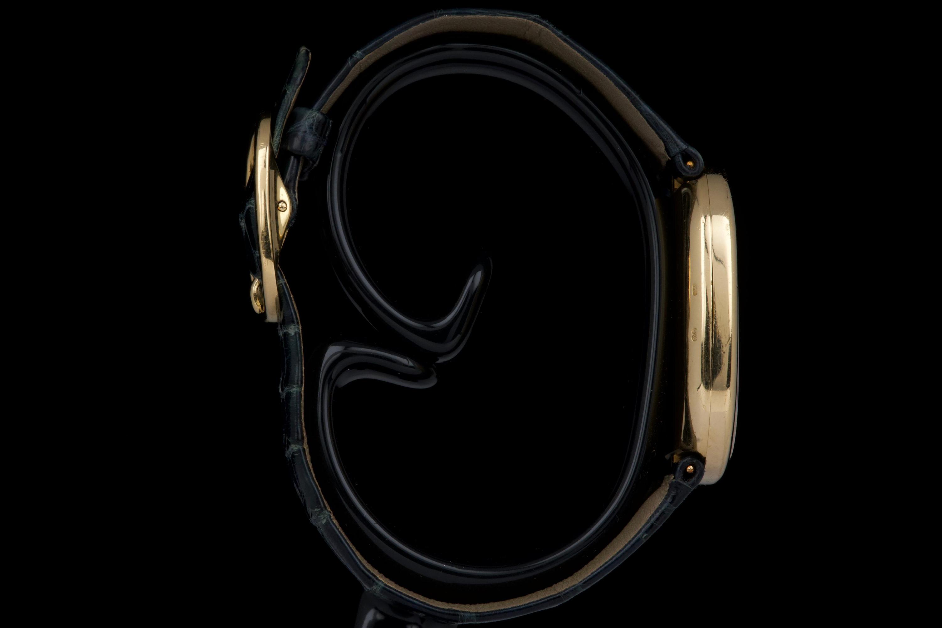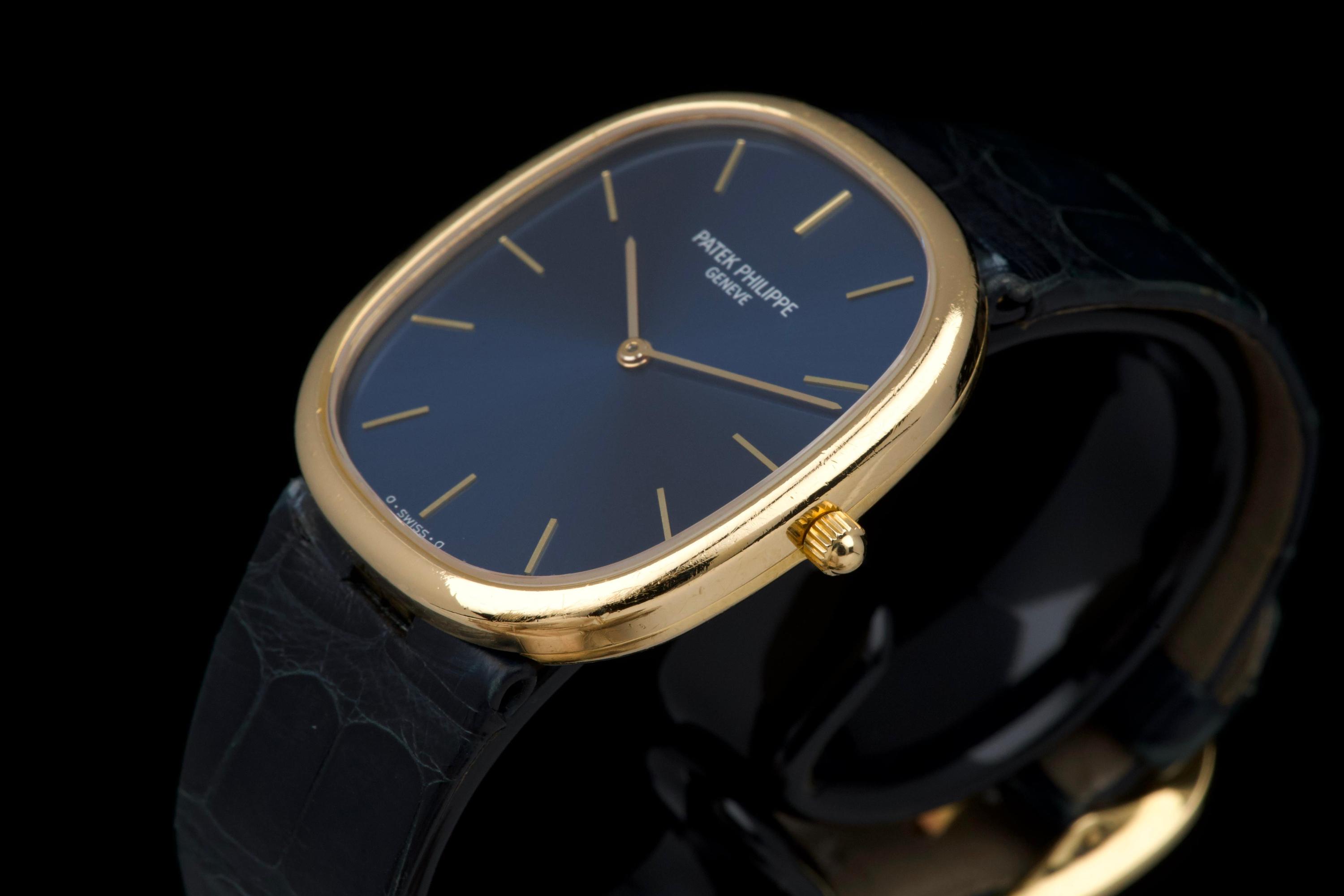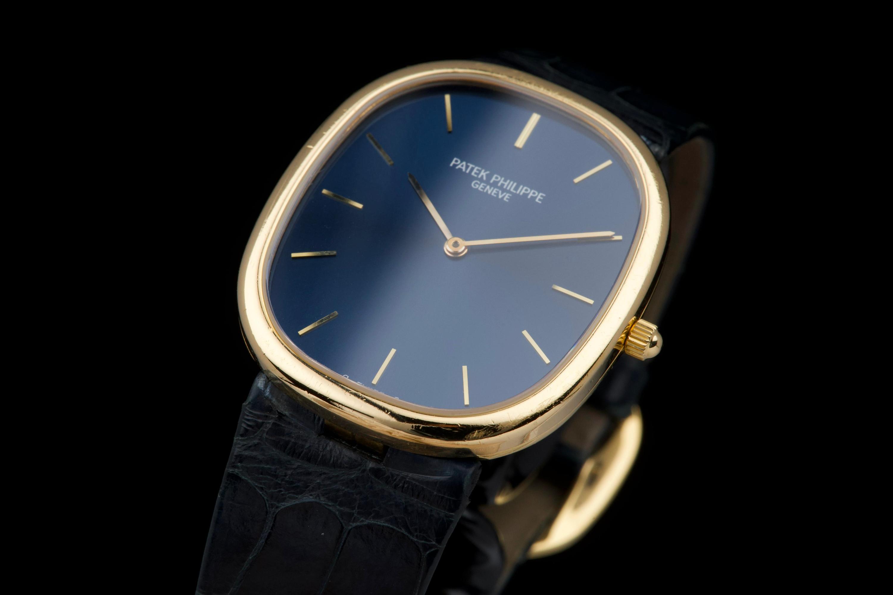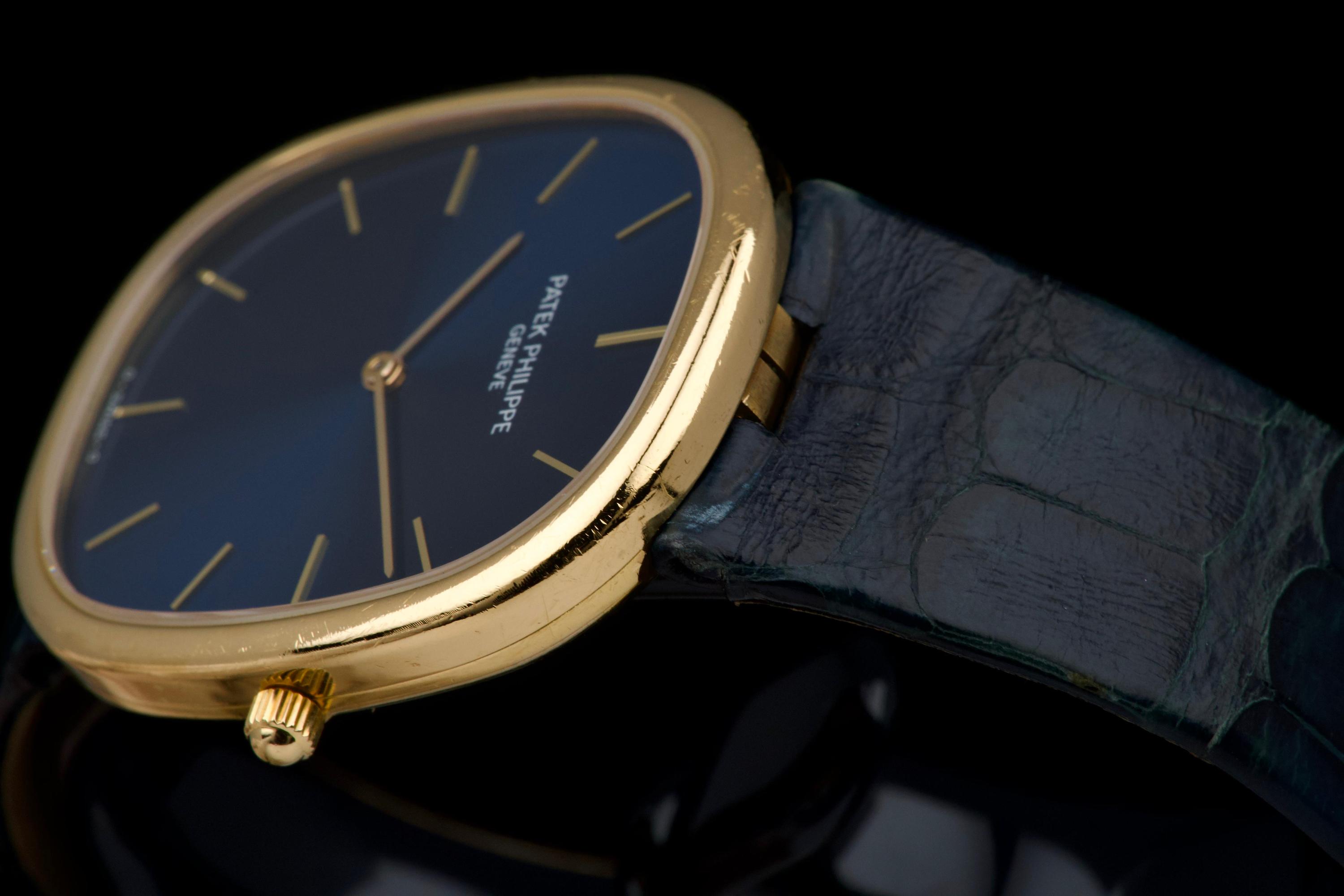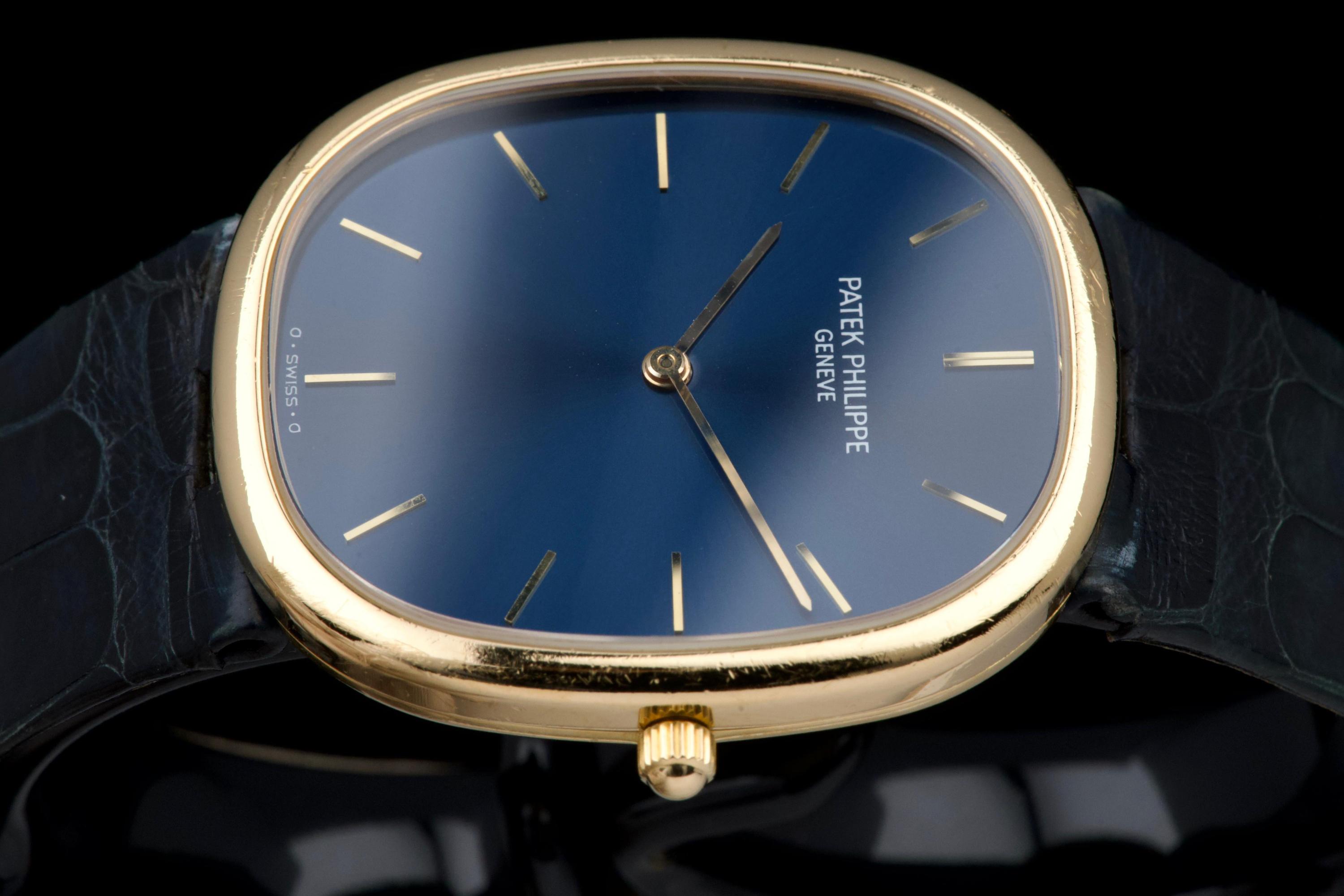 The present Patek Philippe Golden Ellipse reference 3738, executed in yellow gold and dating to the 1980s, is an elegant and honest example of one of the manufacture’s most distinctive and enduring dress watch designs. With its harmonious proportions inspired by the golden ratio, the Ellipse remains a timeless icon within Patek Philippe’s catalogue. This example measures approximately 31 x 35 mm, offering the refined and discreet dimensions characteristic of the period. The case has been polished in the past and is preserved in good overall condition. It displays surface scratches consistent with normal use and age—entirely expected for a watch approaching forty years old. Importantly, the gold hallmarks remain visible on the case, a reassuring indicator of honest wear and preservation. The watch is fitted with a superb sunburst blue dial, which is preserved in perfect condition and remains a defining highlight of the piece. The hands match beautifully, creating a harmonious and well-balanced aesthetic. The sapphire crystal shows a small chip at approximately 9 o’clock, a minor imperfection that does not detract from the overall presentation. The watch is fitted with a navy blue Patek Philippe crocodile leather strap, paired with an original-style yellow-gold Ellipse ardillon buckle, maintaining correct period coherence. The movement has been fully serviced by our watchmaker and is running accurately at the time of cataloguing. Offered without box or papers, this Golden Ellipse 3838 represents a charming and attractively priced opportunity to acquire a classic Patek Philippe dress watch from the 1980s—combining a flawless original dial, recent servicing, and the timeless elegance that defines the Ellipse line.