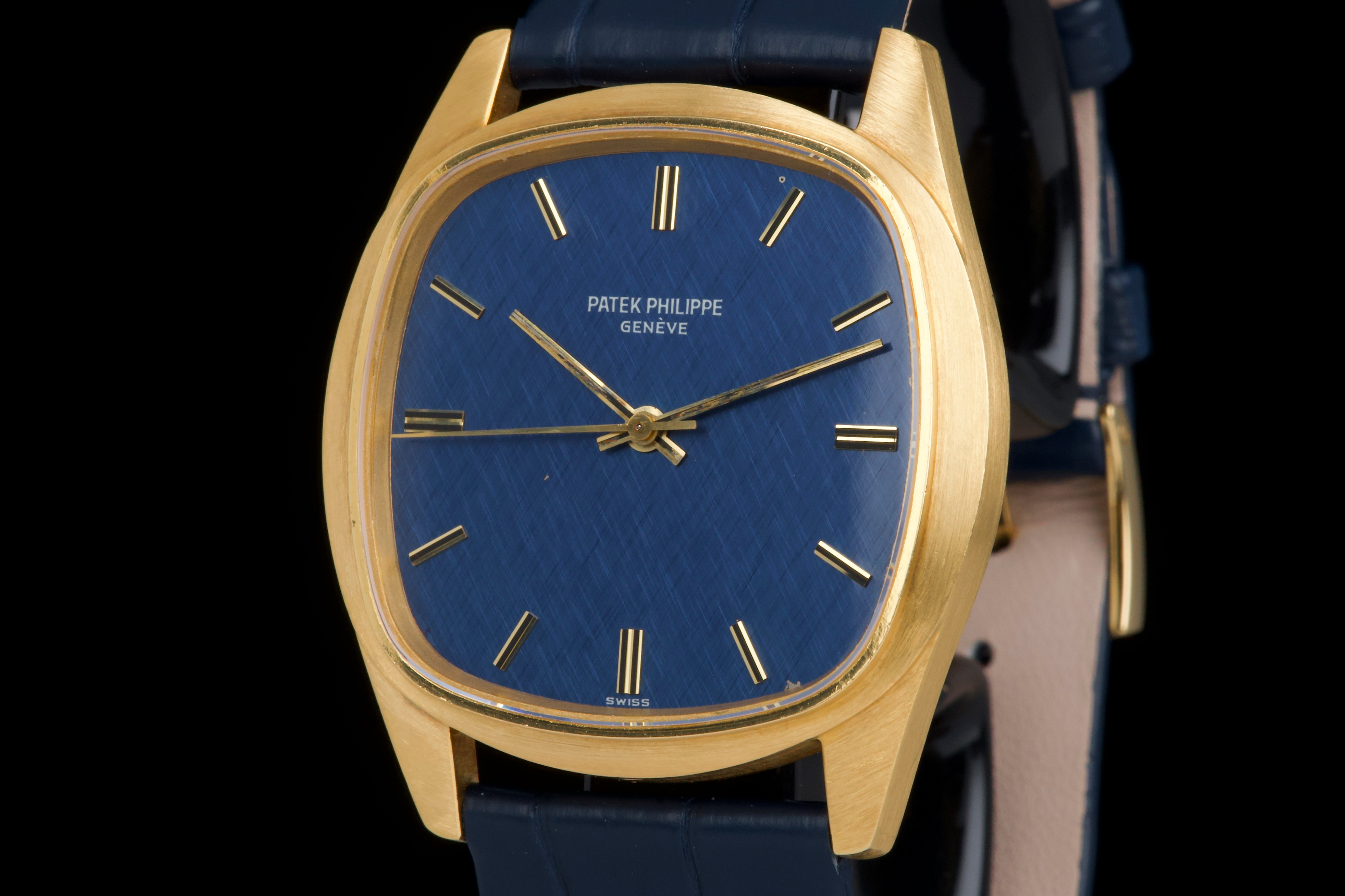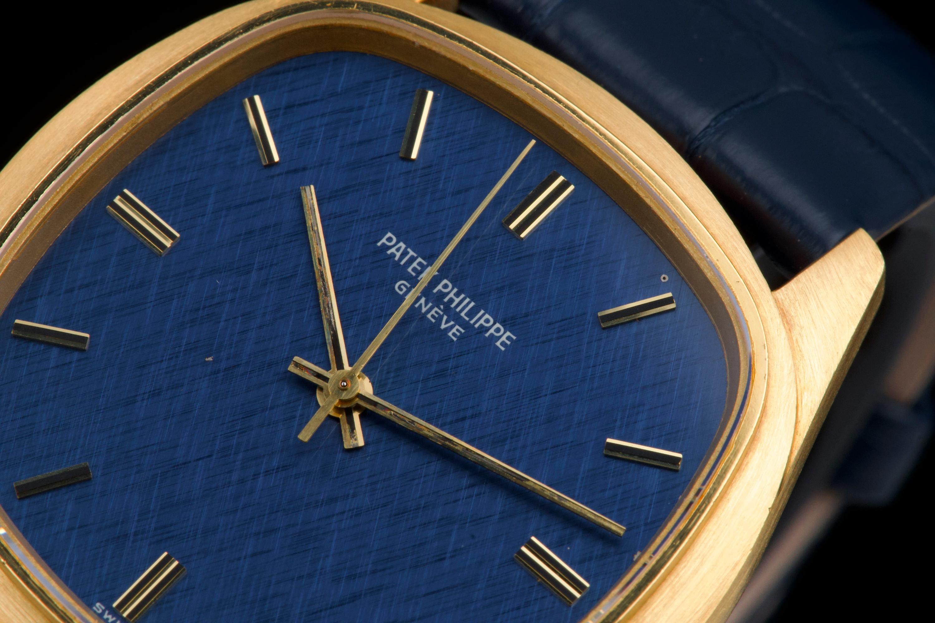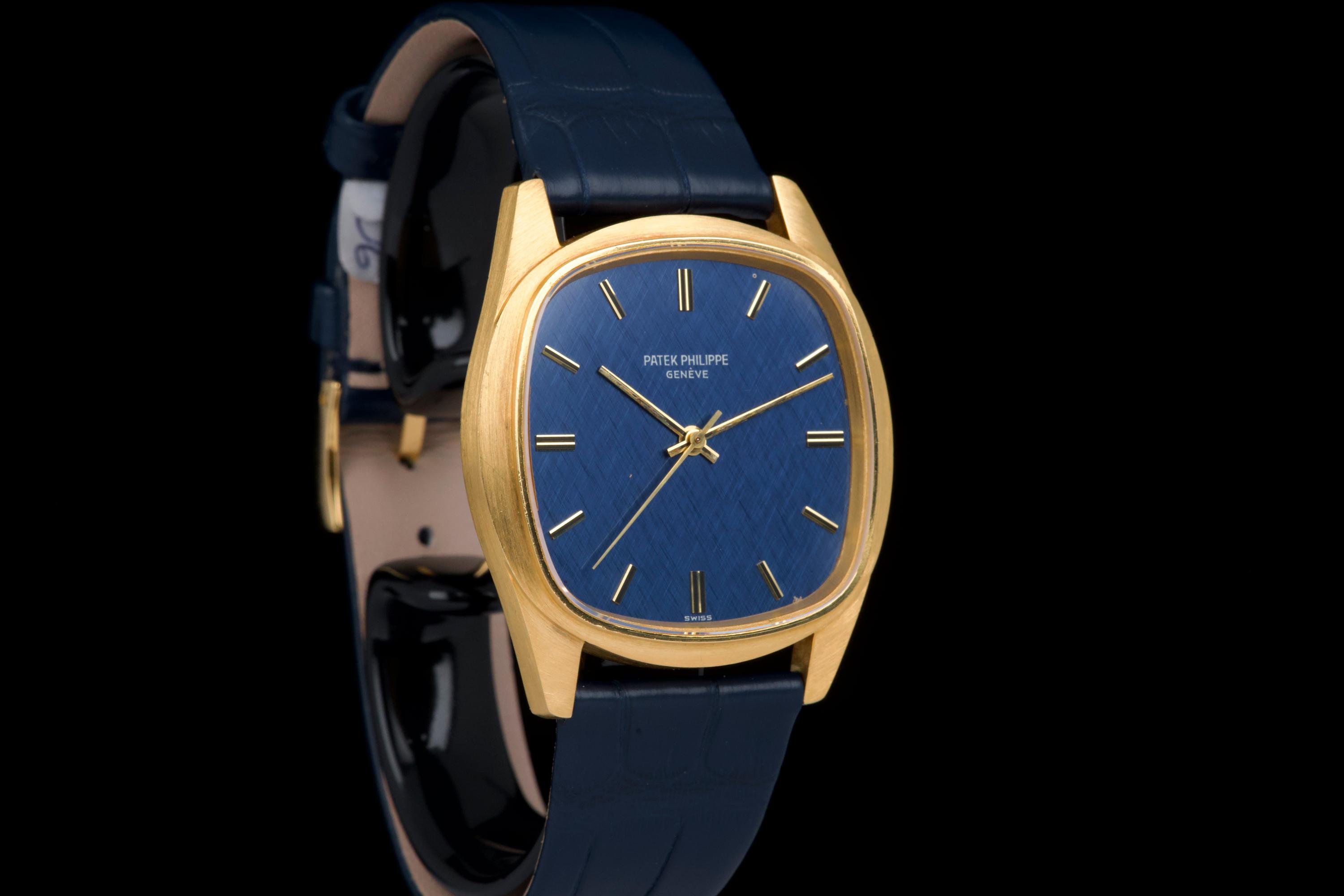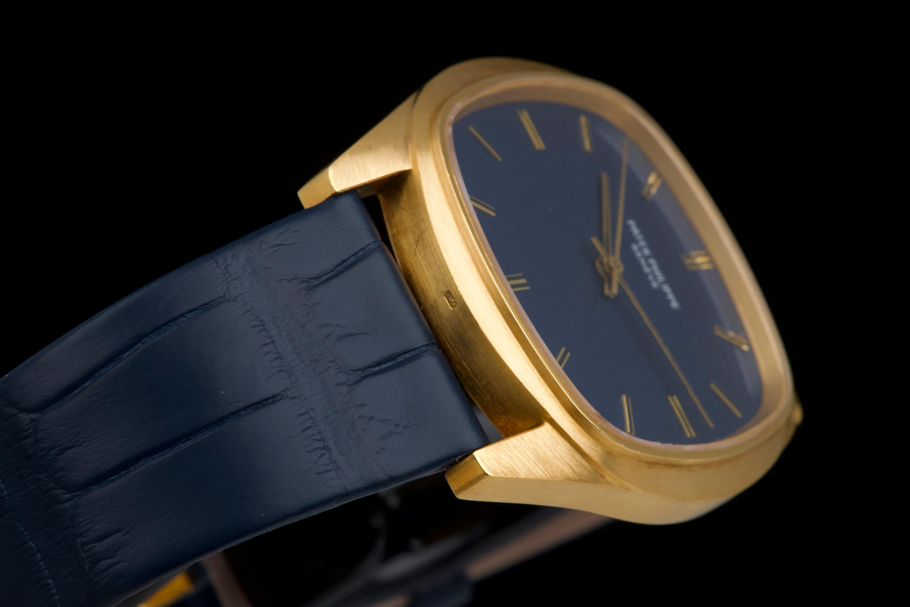 A rare and attractive yellow gold “square” version of the Golden Ellipse, reference 3585J, in superb overall condition. The 36 mm case — considered oversized for the period (mid 70's) — shows extremely light, if any, signs of polishing and retains excellent proportions and sharp edges. The original blue linen-textured dial is beautifully preserved, with some small paint flaws typical for this reference. The original hands remain in good condition, though the central black paint has mostly faded. The crystal is perfect. The watch comes with documentation from Patek Philippe Japan dated 2025 for the purchase of a new yellow gold buckle and strap, along with a Patek service box. The movement was recently serviced by an independent watchmaker and is running well. A superb and wearable large-size Golden Ellipse, rare in this square-shaped configuration, offering excellent wrist presence and vintage charm.