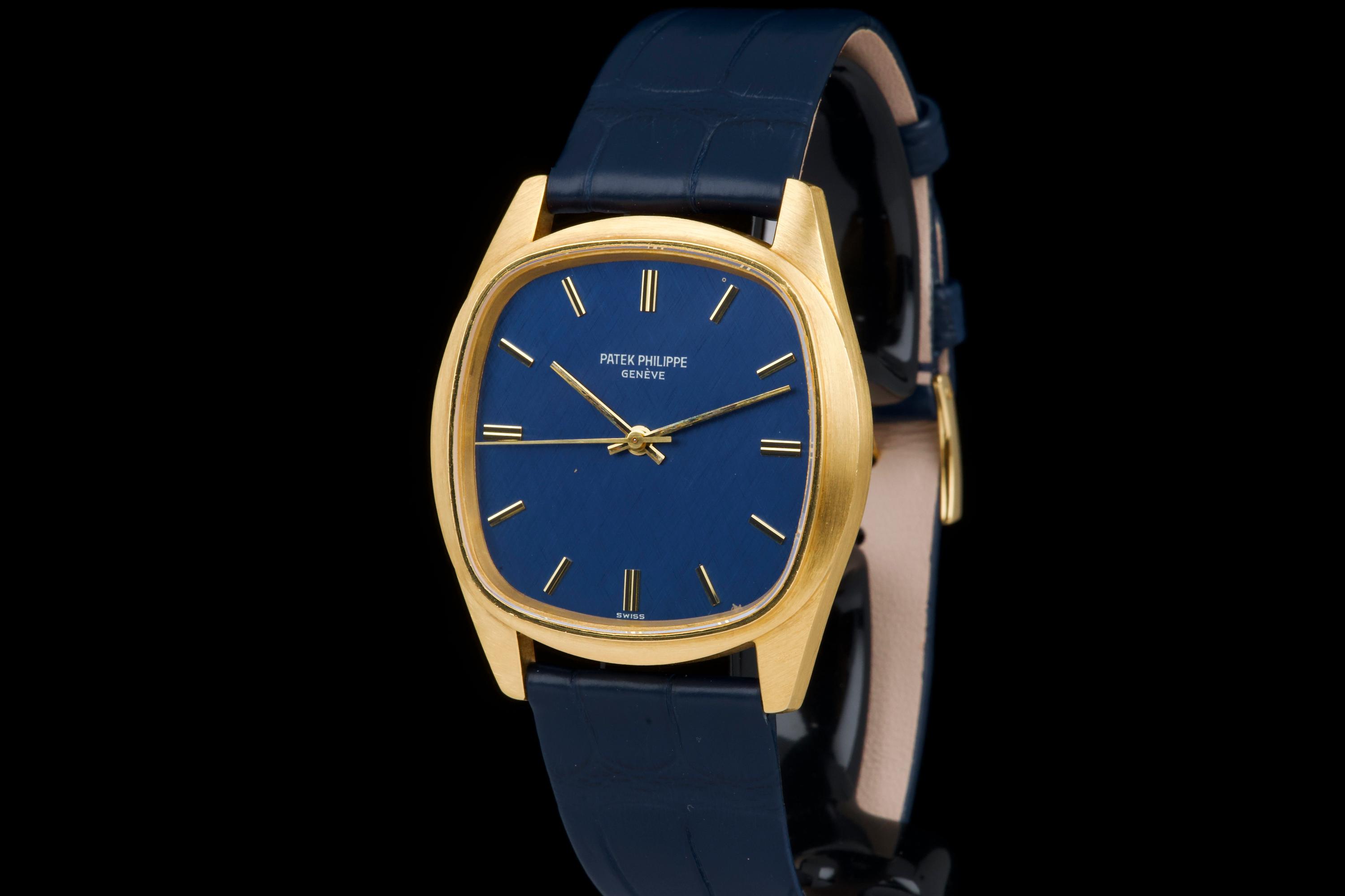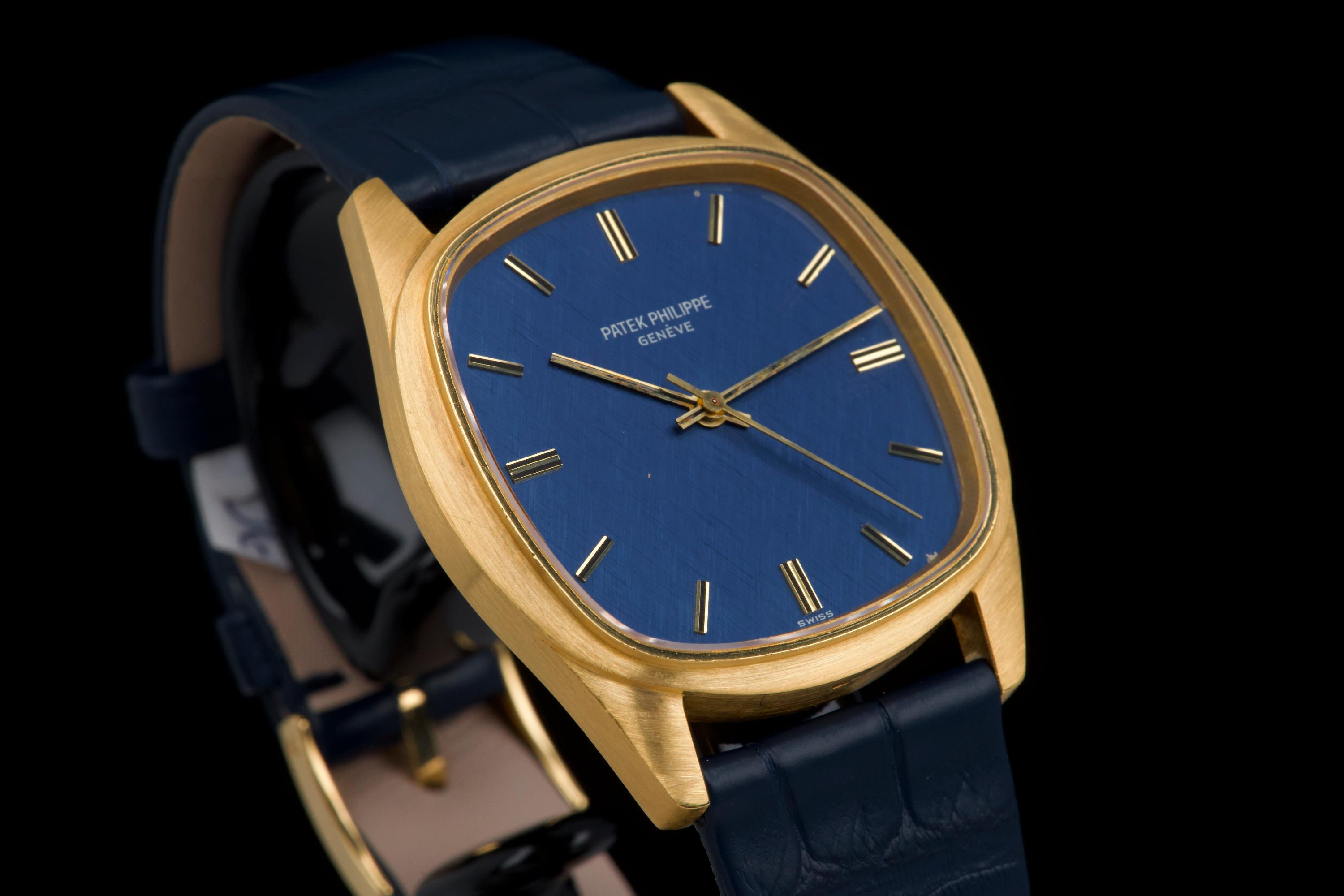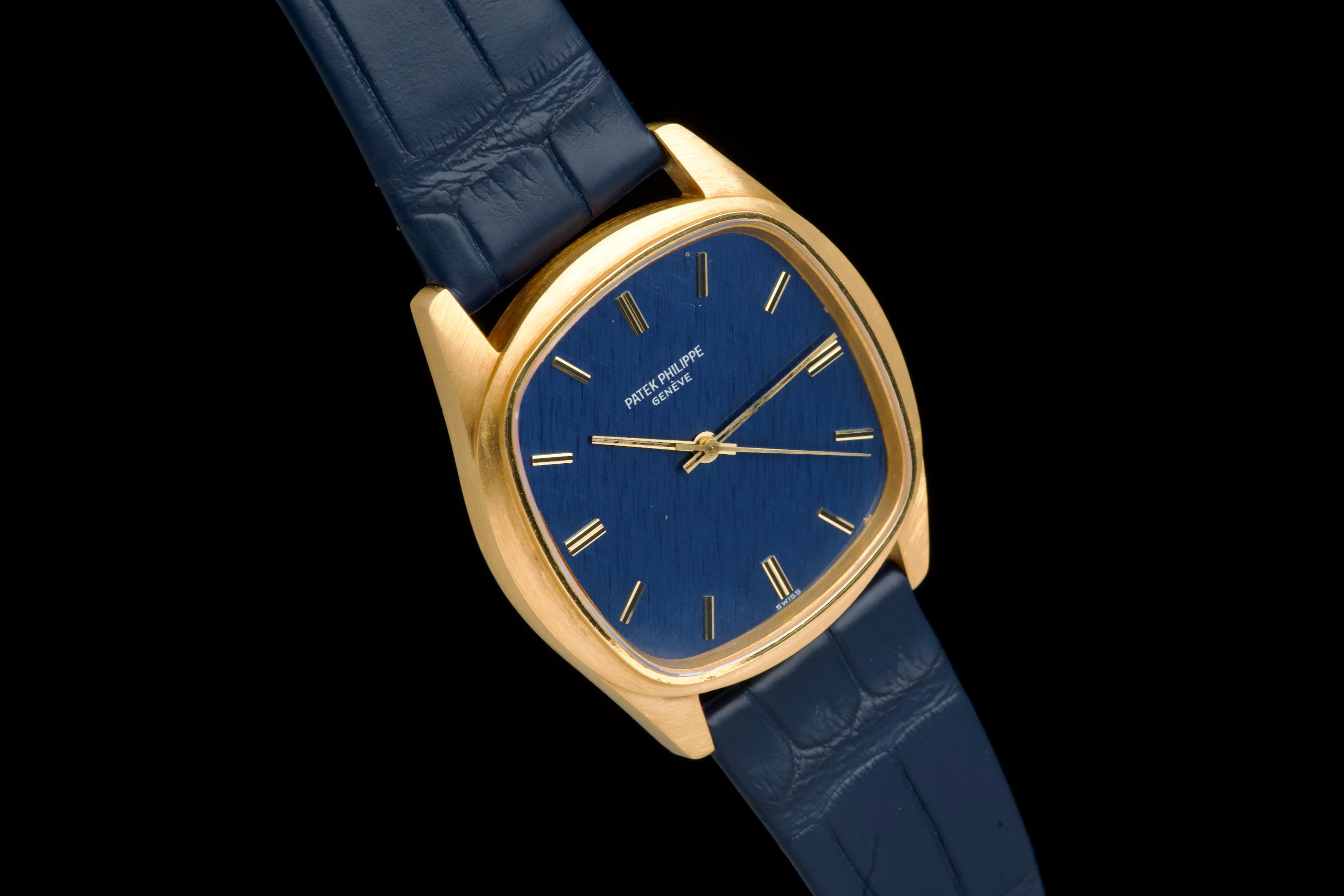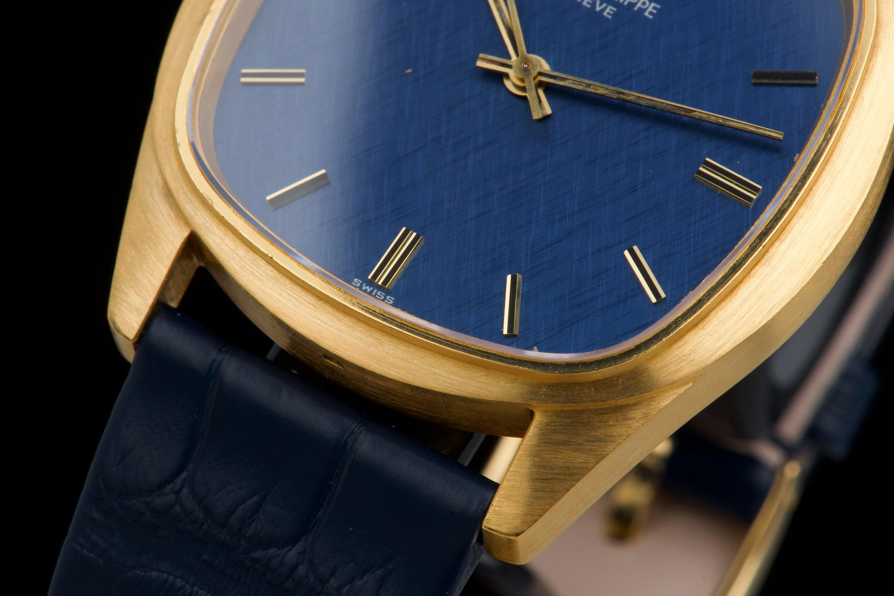 A rare and attractive yellow gold “square” version of the Golden Ellipse, reference 3585J, in superb overall condition. The 36 mm case — considered oversized for the period (mid 70's) — shows extremely light, if any, signs of polishing and retains excellent proportions and sharp edges. The original blue linen-textured dial is beautifully preserved, with some small paint flaws typical for this reference. The original hands remain in good condition, though the central black paint has mostly faded. The crystal is perfect. The watch comes with documentation from Patek Philippe Japan dated 2025 for the purchase of a new yellow gold buckle and strap, along with a Patek service box. The movement was recently serviced by an independent watchmaker and is running well. A superb and wearable large-size Golden Ellipse, rare in this square-shaped configuration, offering excellent wrist presence and vintage charm.