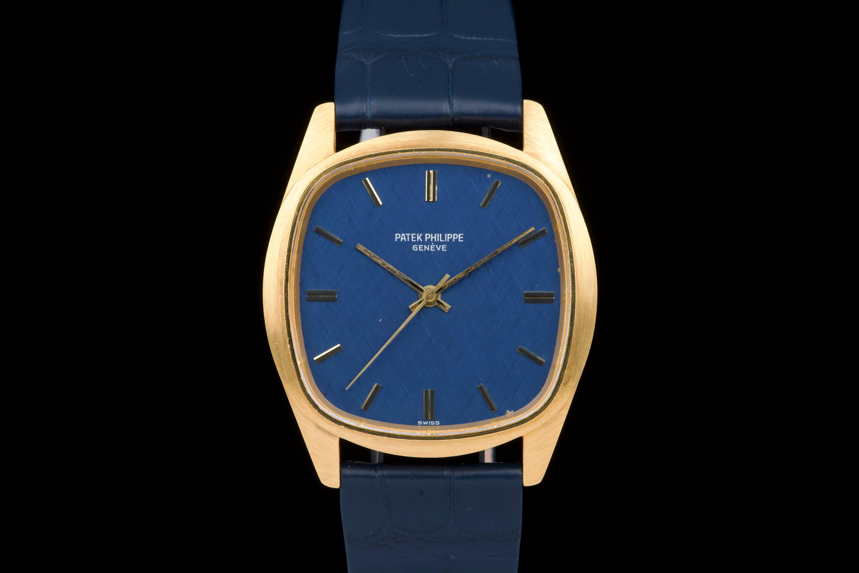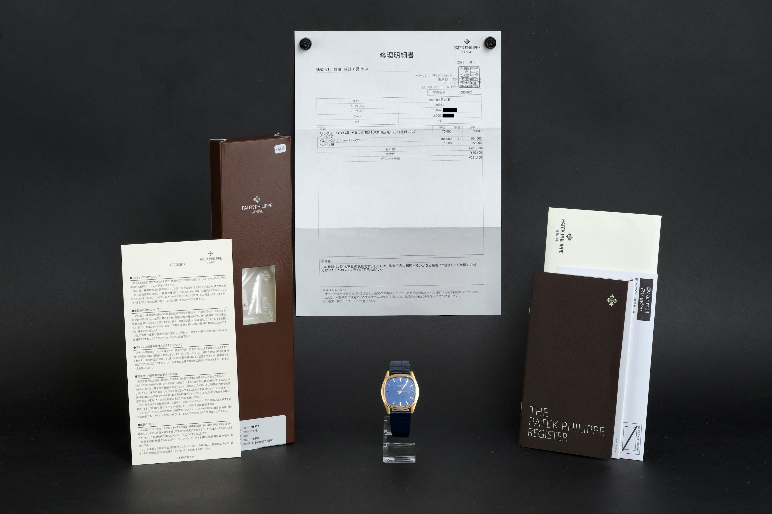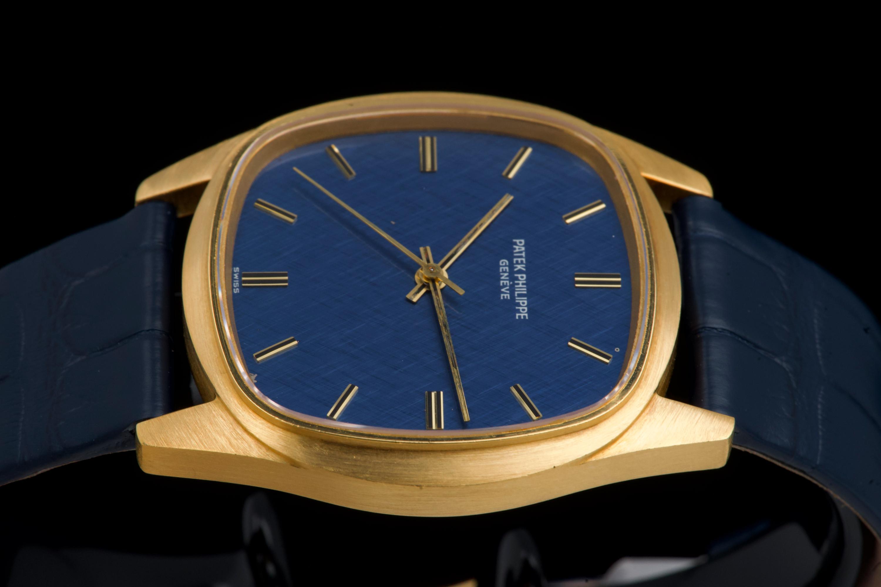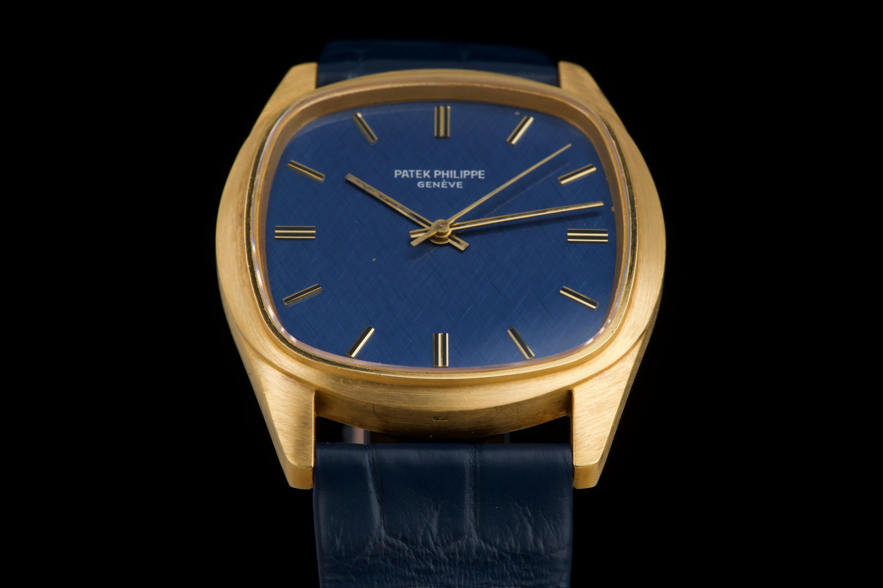A rare and attractive yellow gold “square” version of the Golden Ellipse, reference 3585J, in superb overall condition. The 36 mm case — considered oversized for the period (mid 70's) — shows extremely light, if any, signs of polishing and retains excellent proportions and sharp edges. The original blue linen-textured dial is beautifully preserved, with some small paint flaws typical for this reference. The original hands remain in good condition, though the central black paint has mostly faded. The crystal is perfect. The watch comes with documentation from Patek Philippe Japan dated 2025 for the purchase of a new yellow gold buckle and strap, along with a Patek service box. The movement was recently serviced by an independent watchmaker and is running well. A superb and wearable large-size Golden Ellipse, rare in this square-shaped configuration, offering excellent wrist presence and vintage charm.