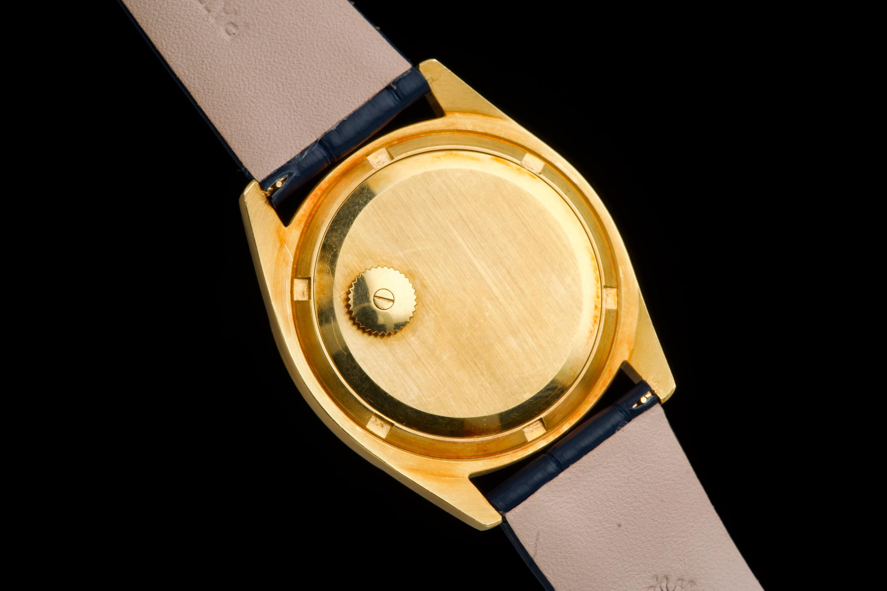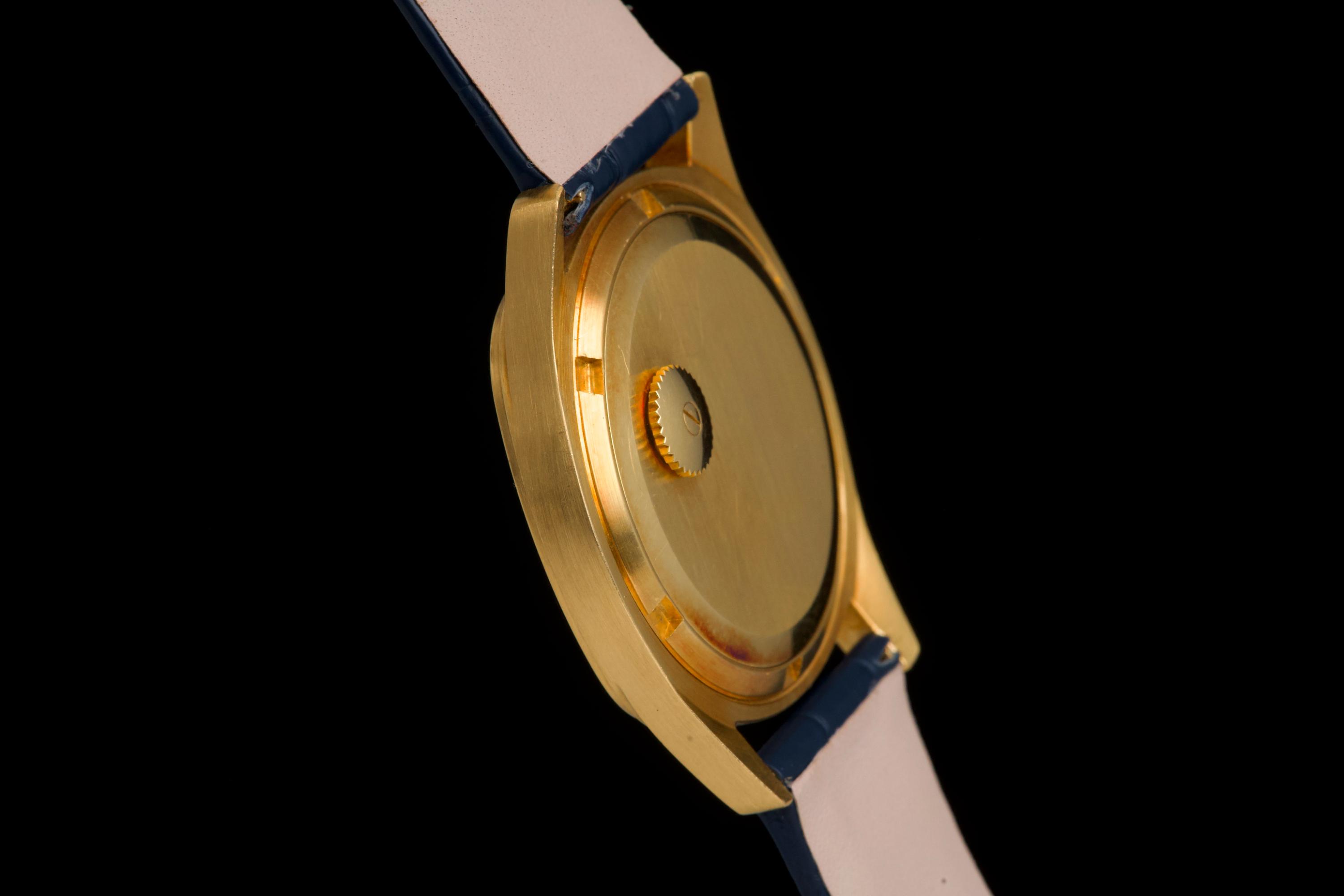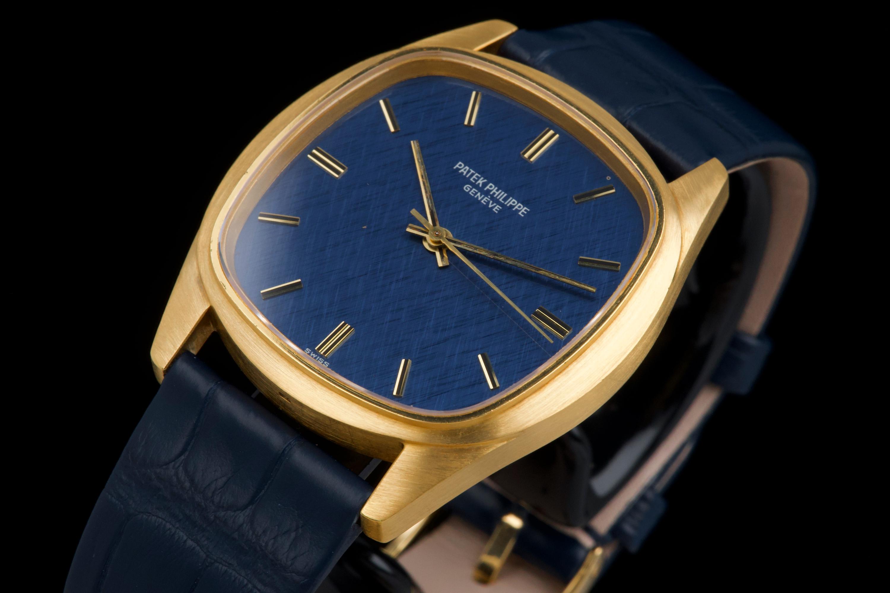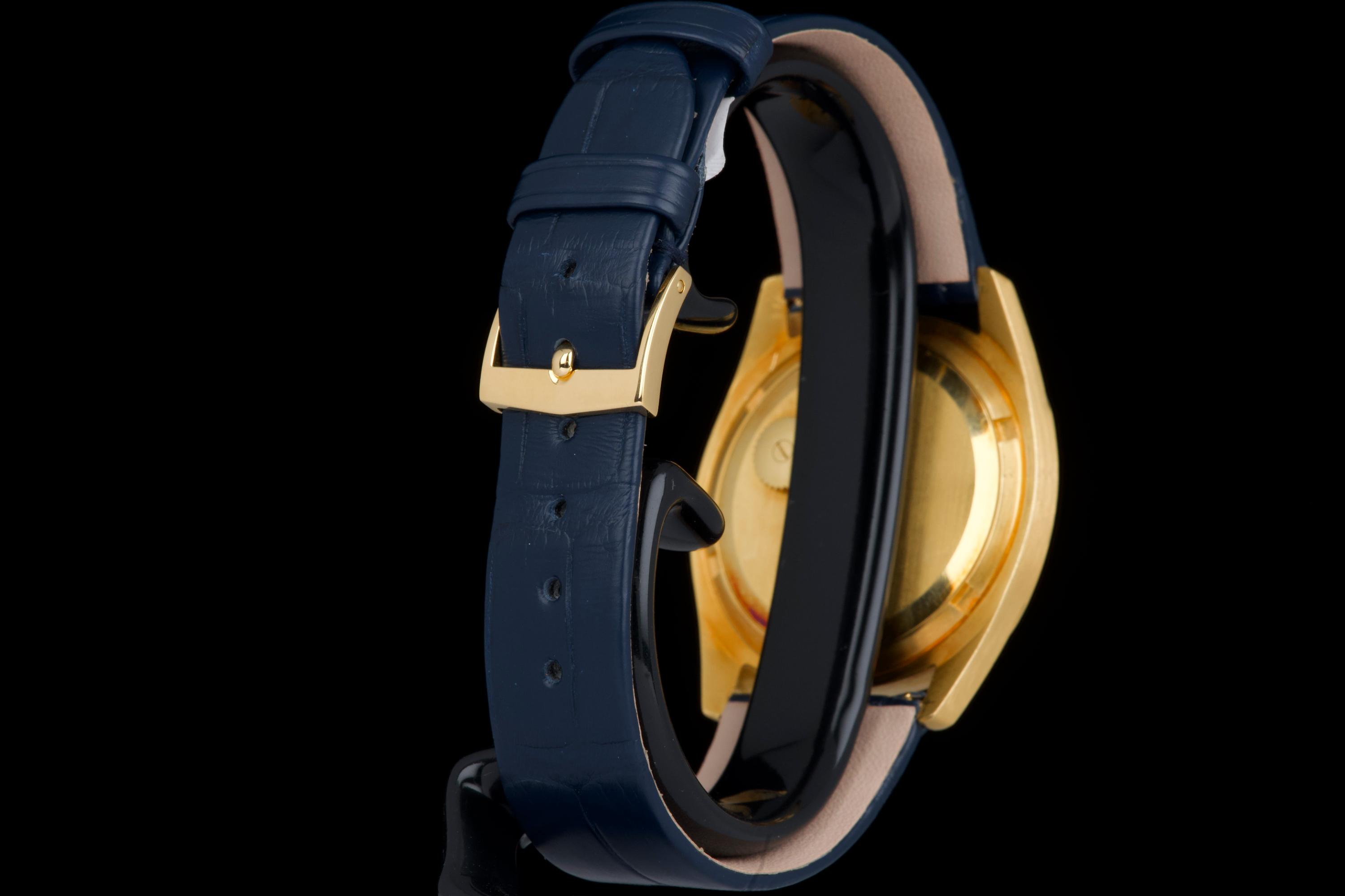 A rare and attractive yellow gold “square” version of the Golden Ellipse, reference 3585J, in superb overall condition. The 36 mm case — considered oversized for the period (mid 70's) — shows extremely light, if any, signs of polishing and retains excellent proportions and sharp edges. The original blue linen-textured dial is beautifully preserved, with some small paint flaws typical for this reference. The original hands remain in good condition, though the central black paint has mostly faded. The crystal is perfect. The watch comes with documentation from Patek Philippe Japan dated 2025 for the purchase of a new yellow gold buckle and strap, along with a Patek service box. The movement was recently serviced by an independent watchmaker and is running well. A superb and wearable large-size Golden Ellipse, rare in this square-shaped configuration, offering excellent wrist presence and vintage charm.