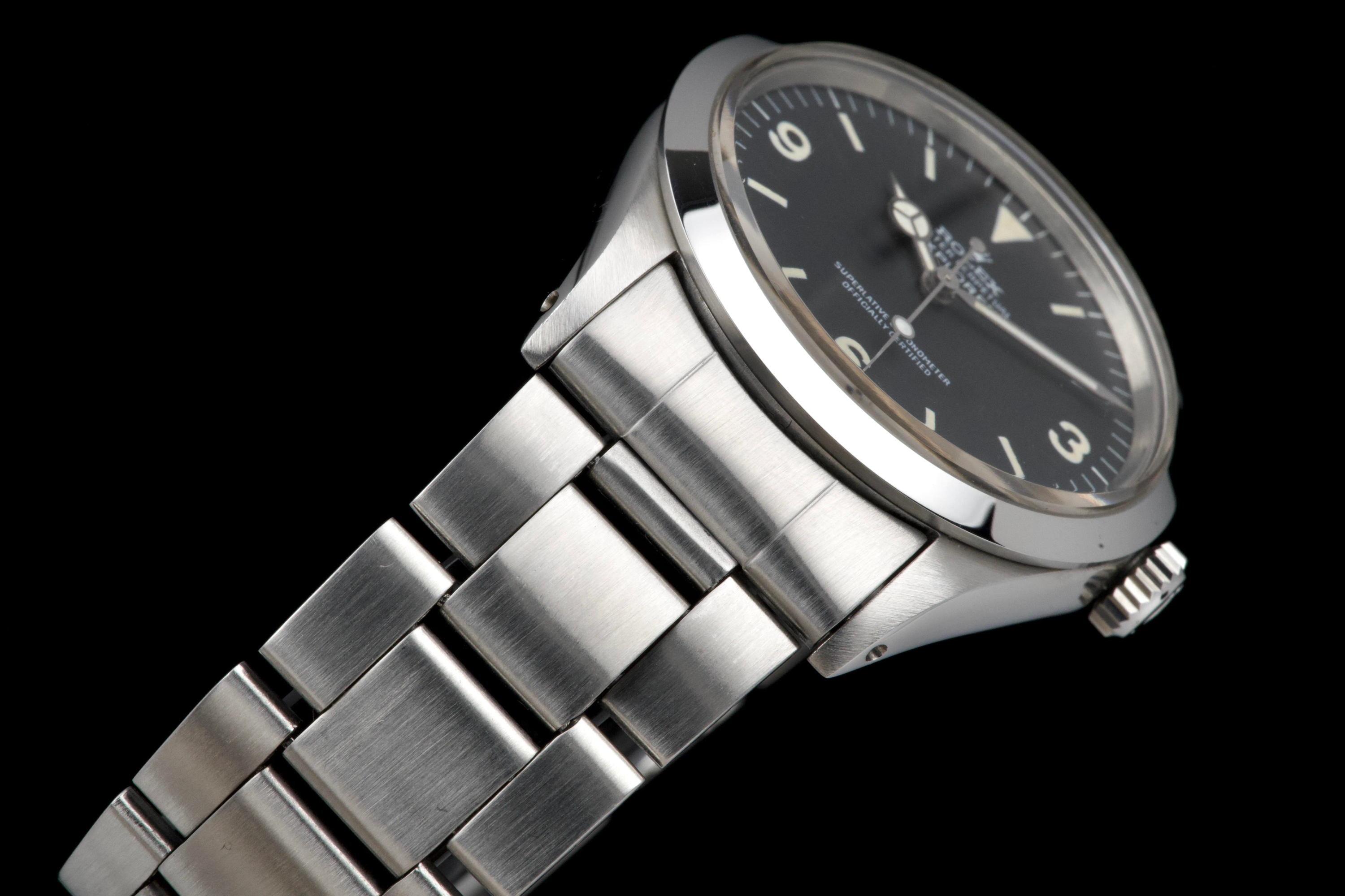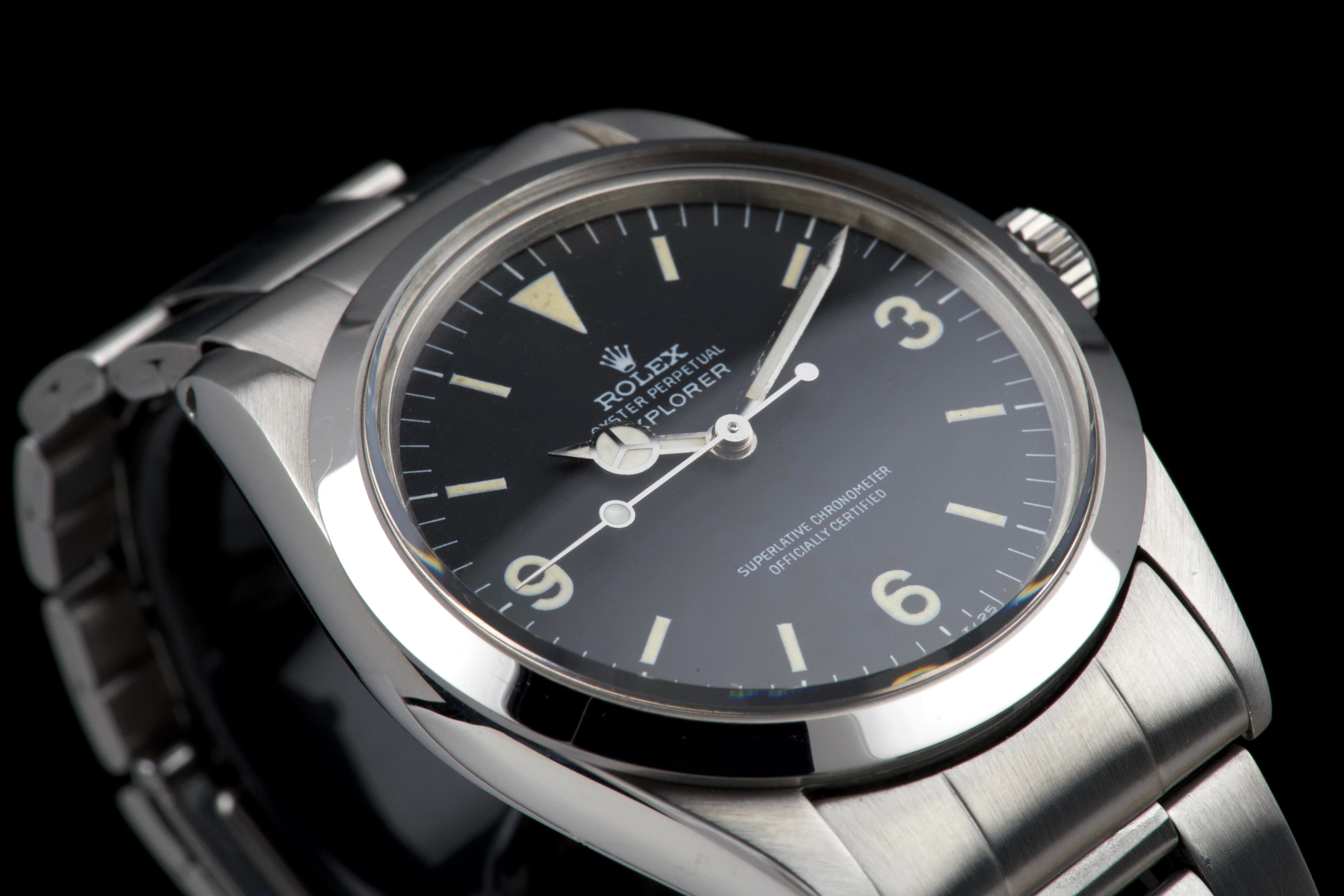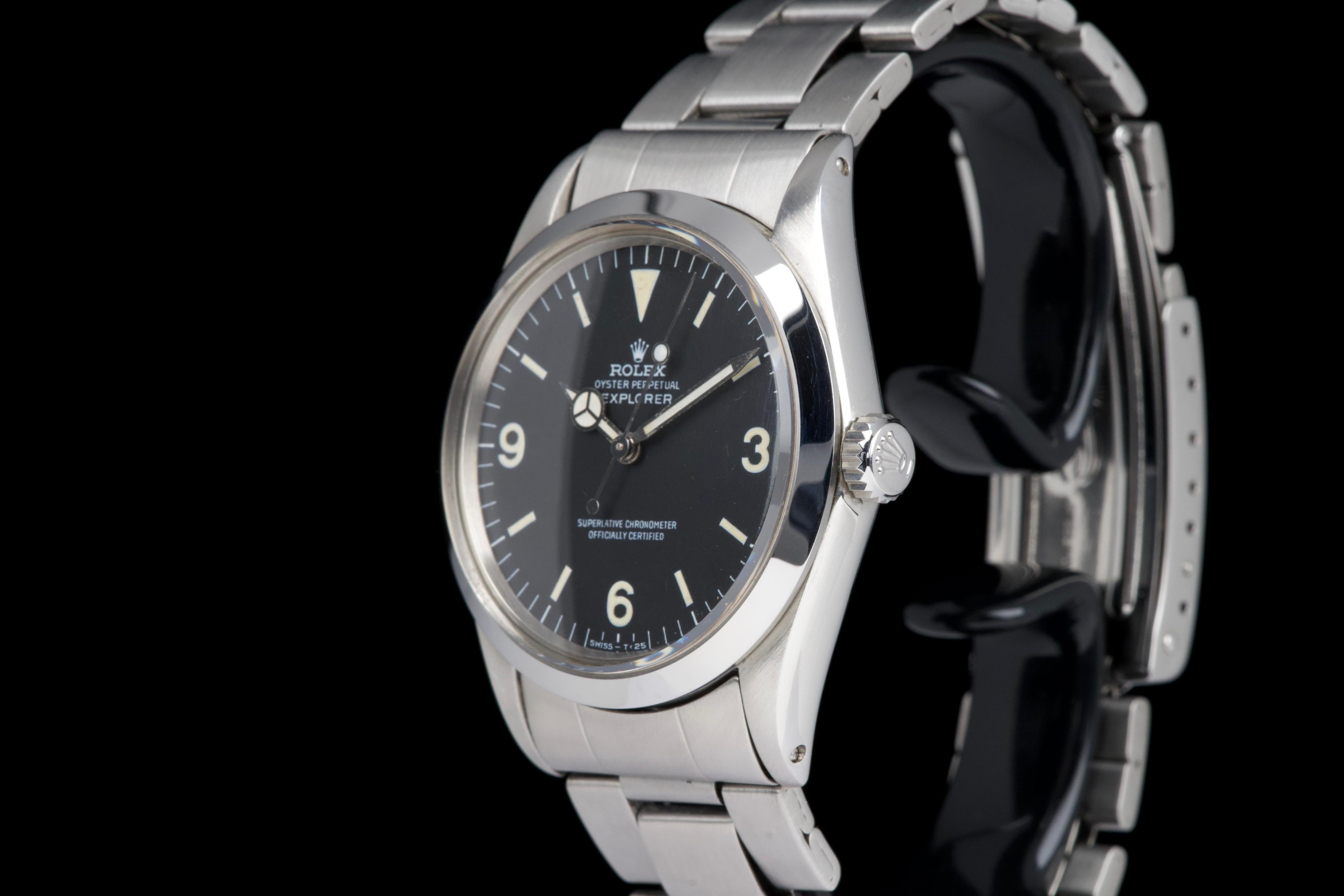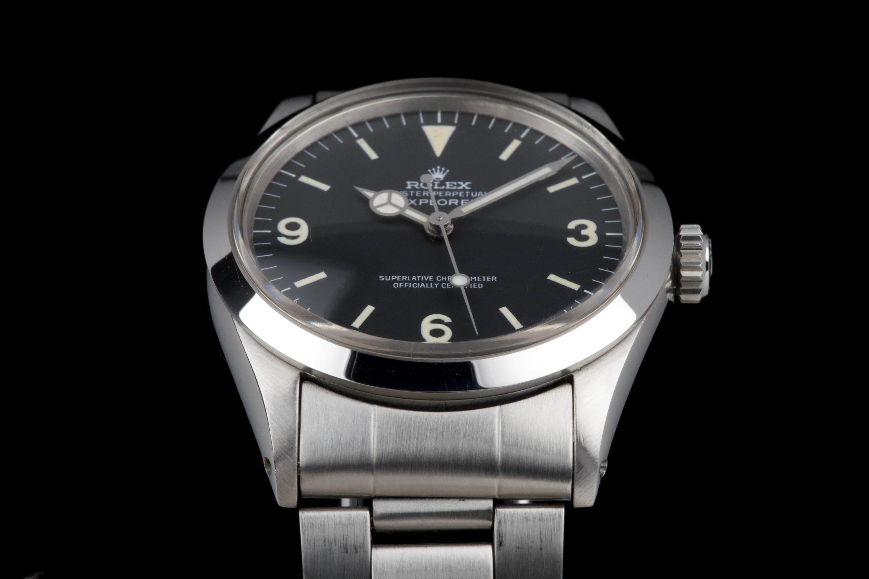 The present Rolex Explorer reference 1016, bearing the serial number 3480XXX and dating to 1972, is a highly attractive and honest example of this iconic 36 mm tool watch. The stainless-steel case has been polished in the past and shows light wear consistent with careful use, while retaining pleasing proportions and a flat, well-defined bezel. The serial and reference numbers between the lugs remain clearly legible, and the caseback is correctly stamped “1.72,” in line with the production period. The watch is fitted with a particularly appealing tritium Mk1 “frog foot” dial, preserved in very fine condition. The luminous material on the hour markers and the signature 3/6/9 numerals has aged to a warm, slightly creamy patina, giving the watch a beautifully balanced and period-correct appearance. The original hour and minute hands remain intact and match the dial well. The seconds hand is a later service replacement with luminova. Inside, the watch is powered by the Rolex calibre 1570, which has been checked by our watchmaker and is functioning correctly at the time of cataloguing. The watch is paired with its original folded Oyster bracelet reference 7836 with 358 endlinks. The bracelet shows noticeable stretch, entirely normal and expected for a bracelet of this age. The clasp is not date-stamped, a detail often encountered on early 1970s Rolex bracelets. With its attractive Mk1 “frog foot” dial, correct early 1970s configuration, strong case details, and honest overall condition, this Explorer 1016 represents a compelling opportunity to acquire a classic Rolex sports watch that perfectly embodies the understated and utilitarian spirit of the model.