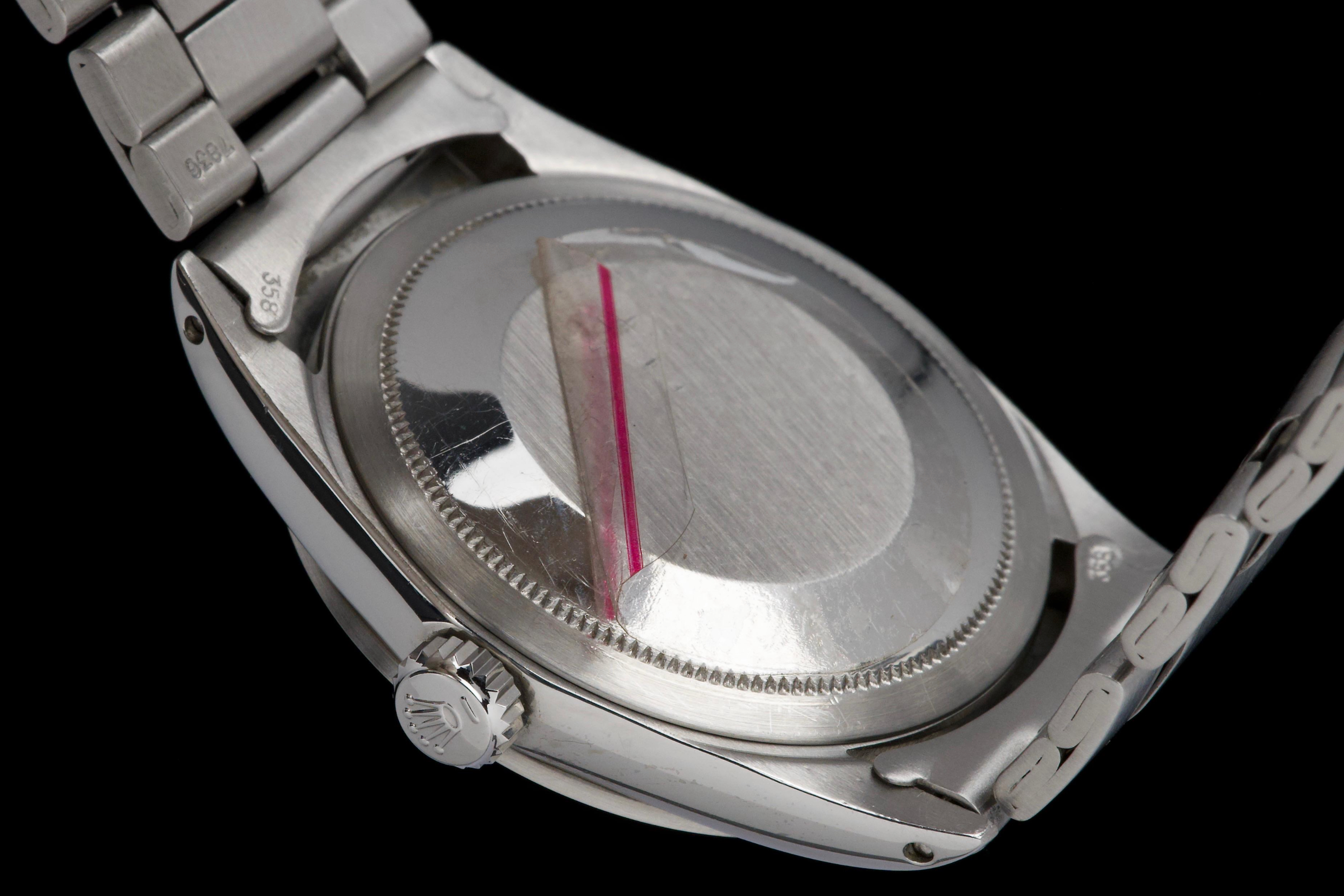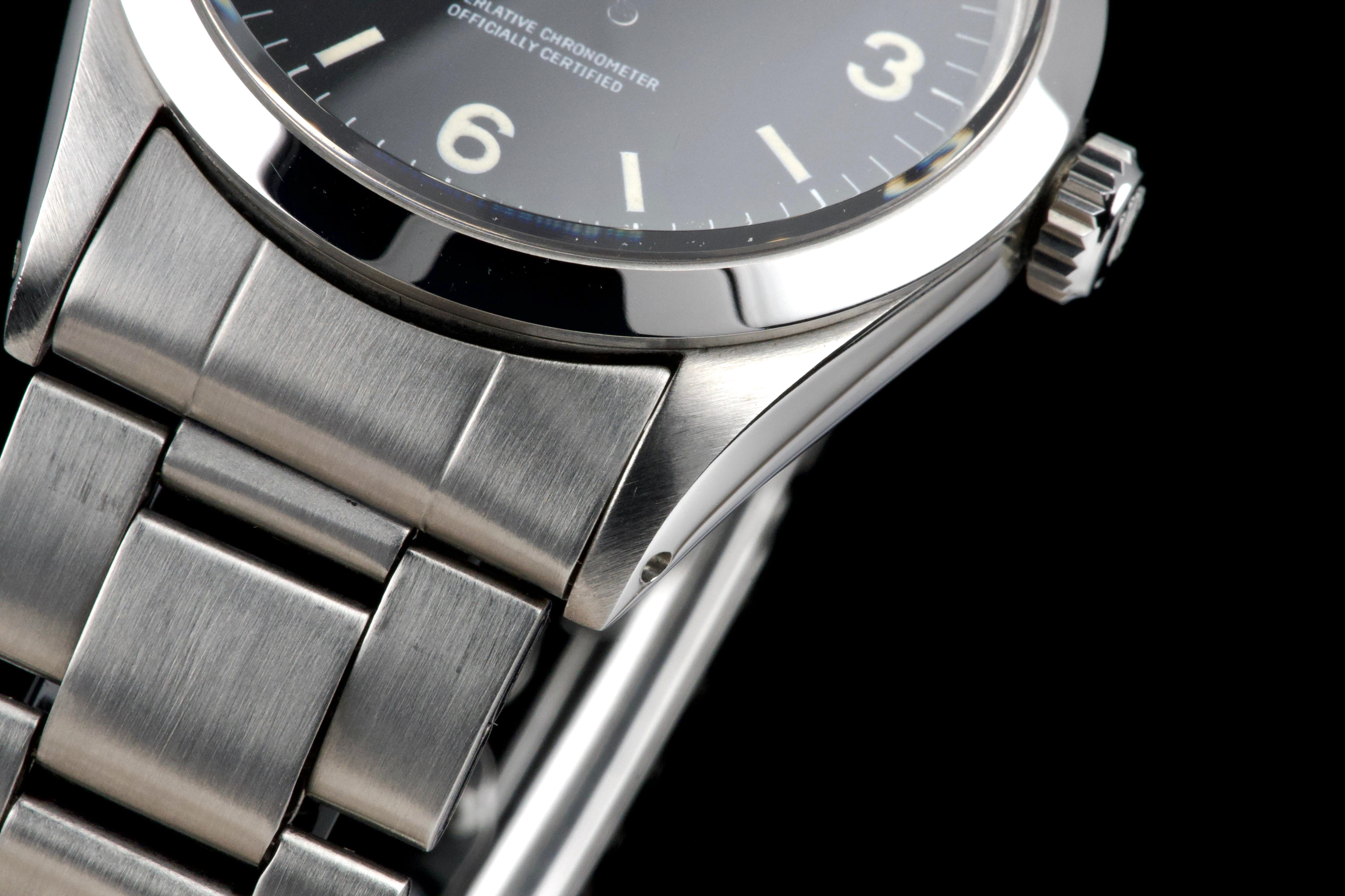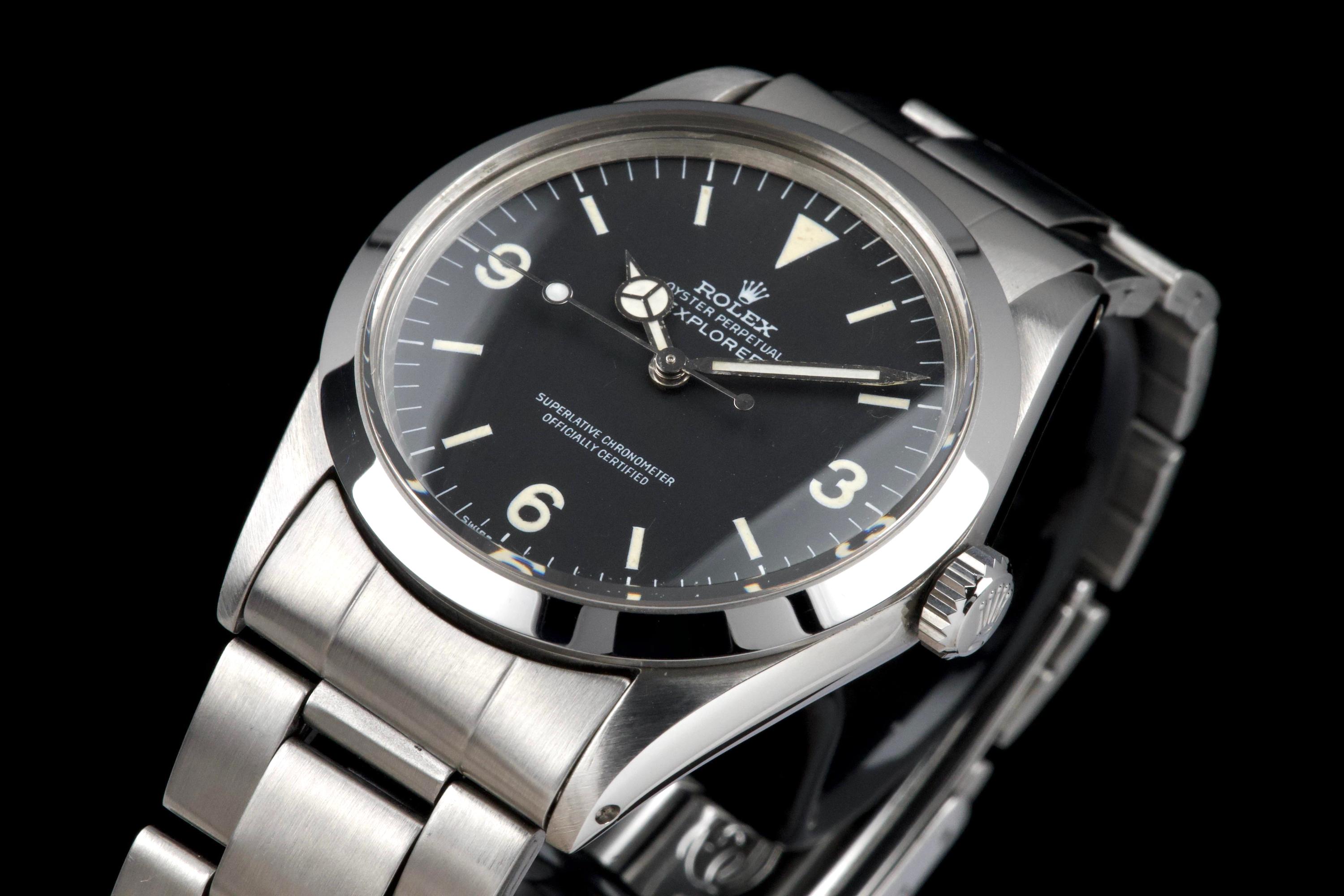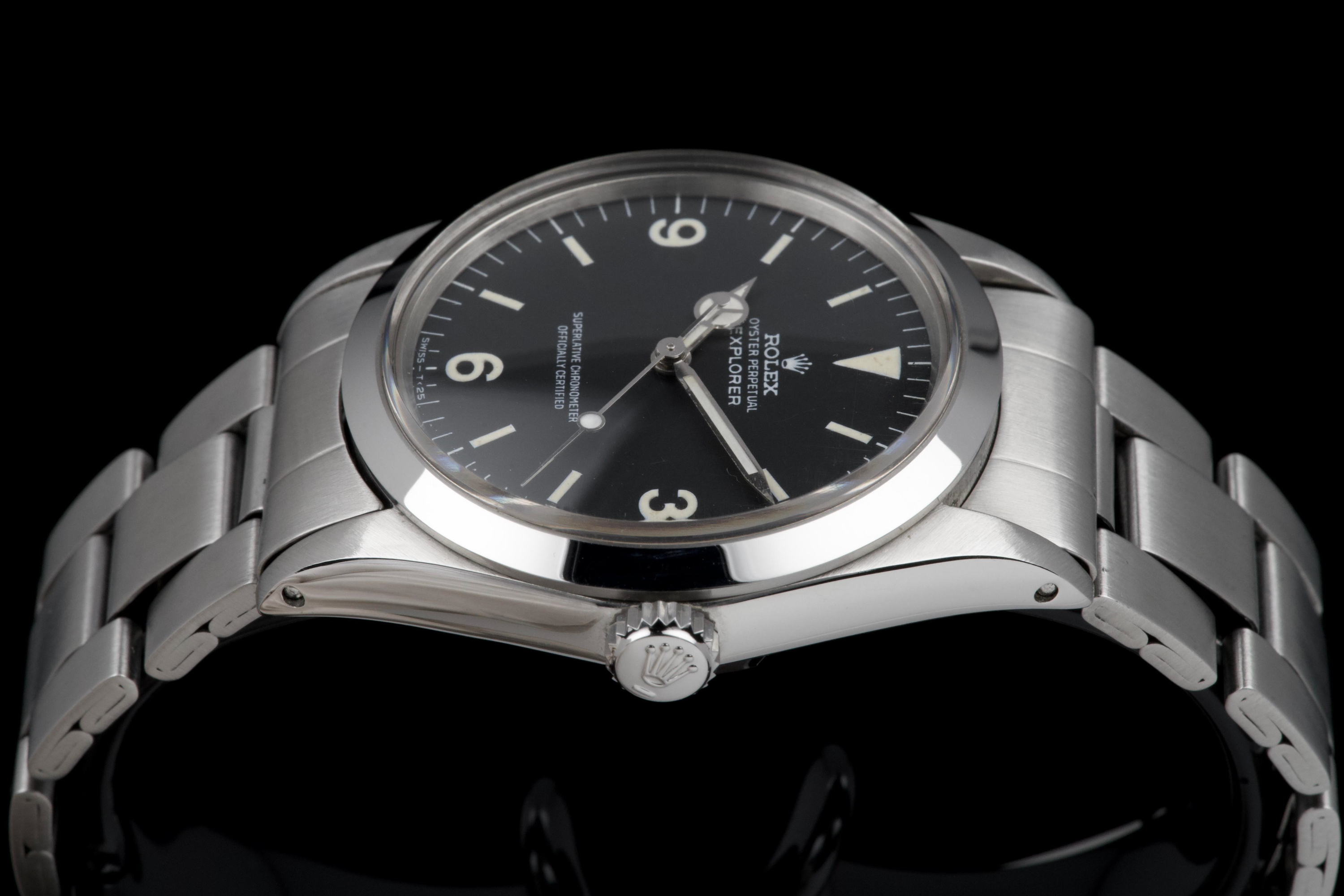 The present Rolex Explorer reference 1016, bearing the serial number 3480XXX and dating to 1972, is a highly attractive and honest example of this iconic 36 mm tool watch. The stainless-steel case has been polished in the past and shows light wear consistent with careful use, while retaining pleasing proportions and a flat, well-defined bezel. The serial and reference numbers between the lugs remain clearly legible, and the caseback is correctly stamped “1.72,” in line with the production period. The watch is fitted with a particularly appealing tritium Mk1 “frog foot” dial, preserved in very fine condition. The luminous material on the hour markers and the signature 3/6/9 numerals has aged to a warm, slightly creamy patina, giving the watch a beautifully balanced and period-correct appearance. The original hour and minute hands remain intact and match the dial well. The seconds hand is a later service replacement with luminova. Inside, the watch is powered by the Rolex calibre 1570, which has been checked by our watchmaker and is functioning correctly at the time of cataloguing. The watch is paired with its original folded Oyster bracelet reference 7836 with 358 endlinks. The bracelet shows noticeable stretch, entirely normal and expected for a bracelet of this age. The clasp is not date-stamped, a detail often encountered on early 1970s Rolex bracelets. With its attractive Mk1 “frog foot” dial, correct early 1970s configuration, strong case details, and honest overall condition, this Explorer 1016 represents a compelling opportunity to acquire a classic Rolex sports watch that perfectly embodies the understated and utilitarian spirit of the model.