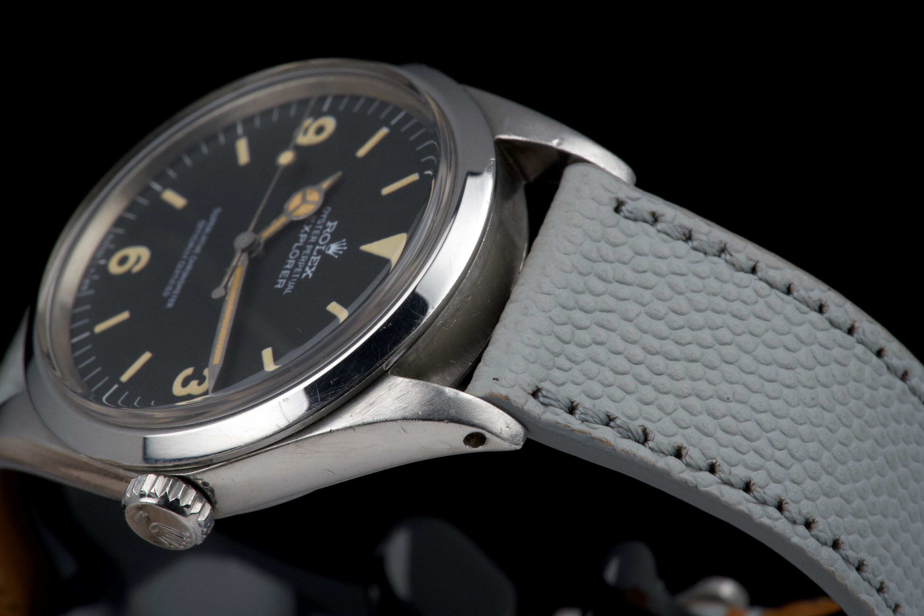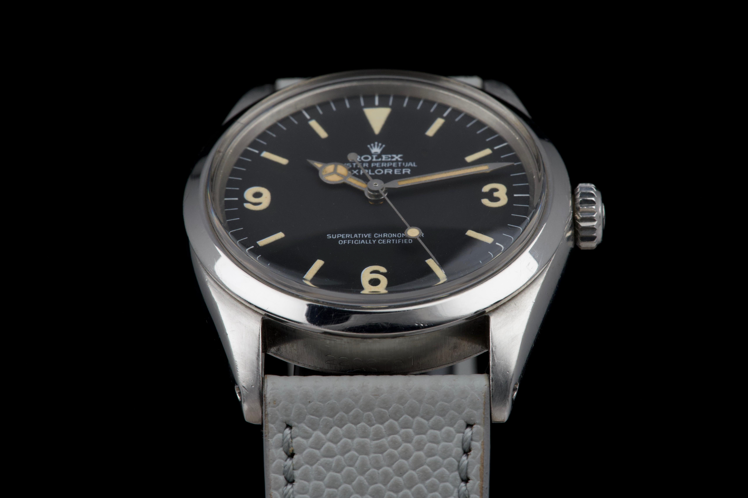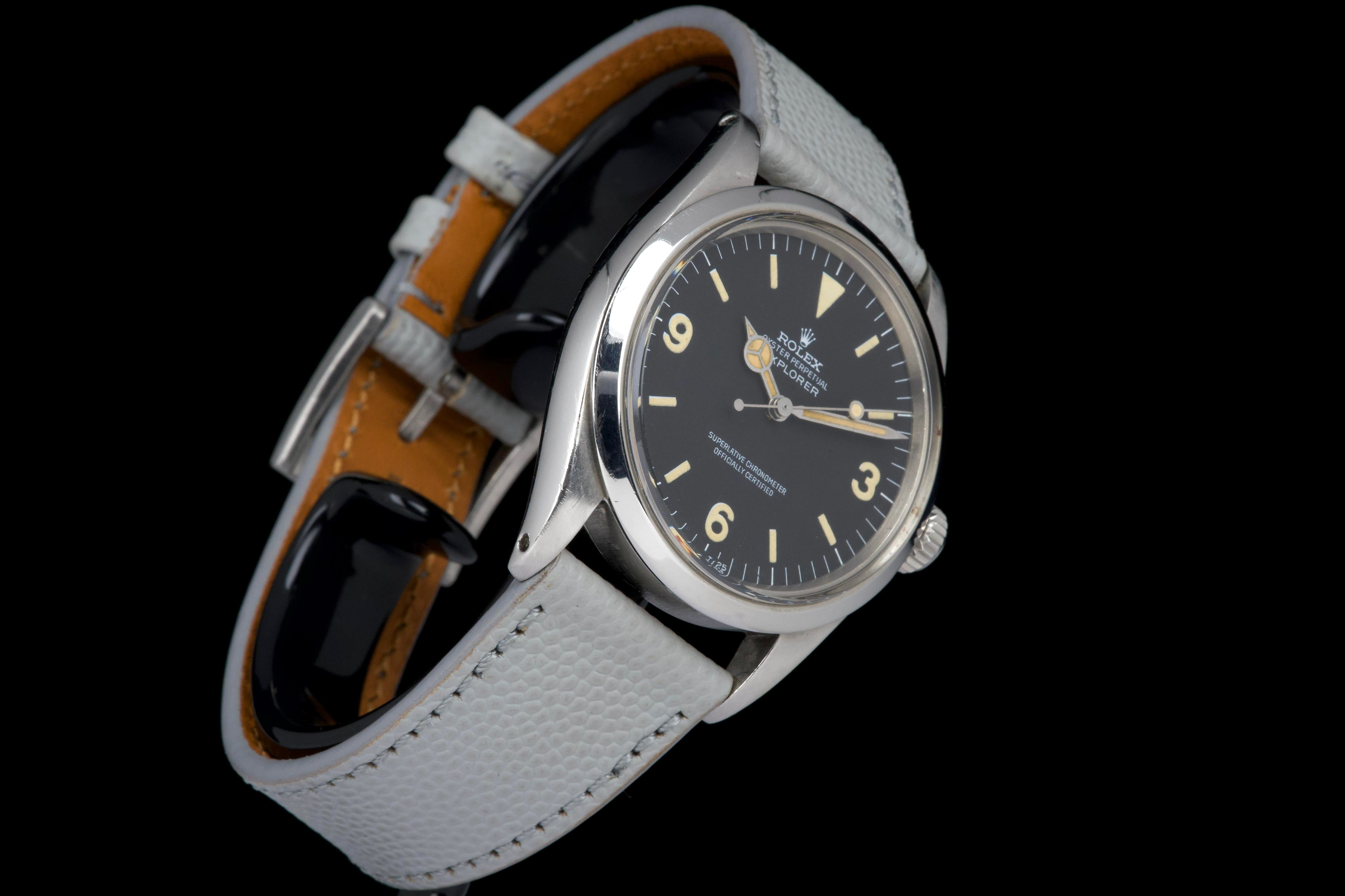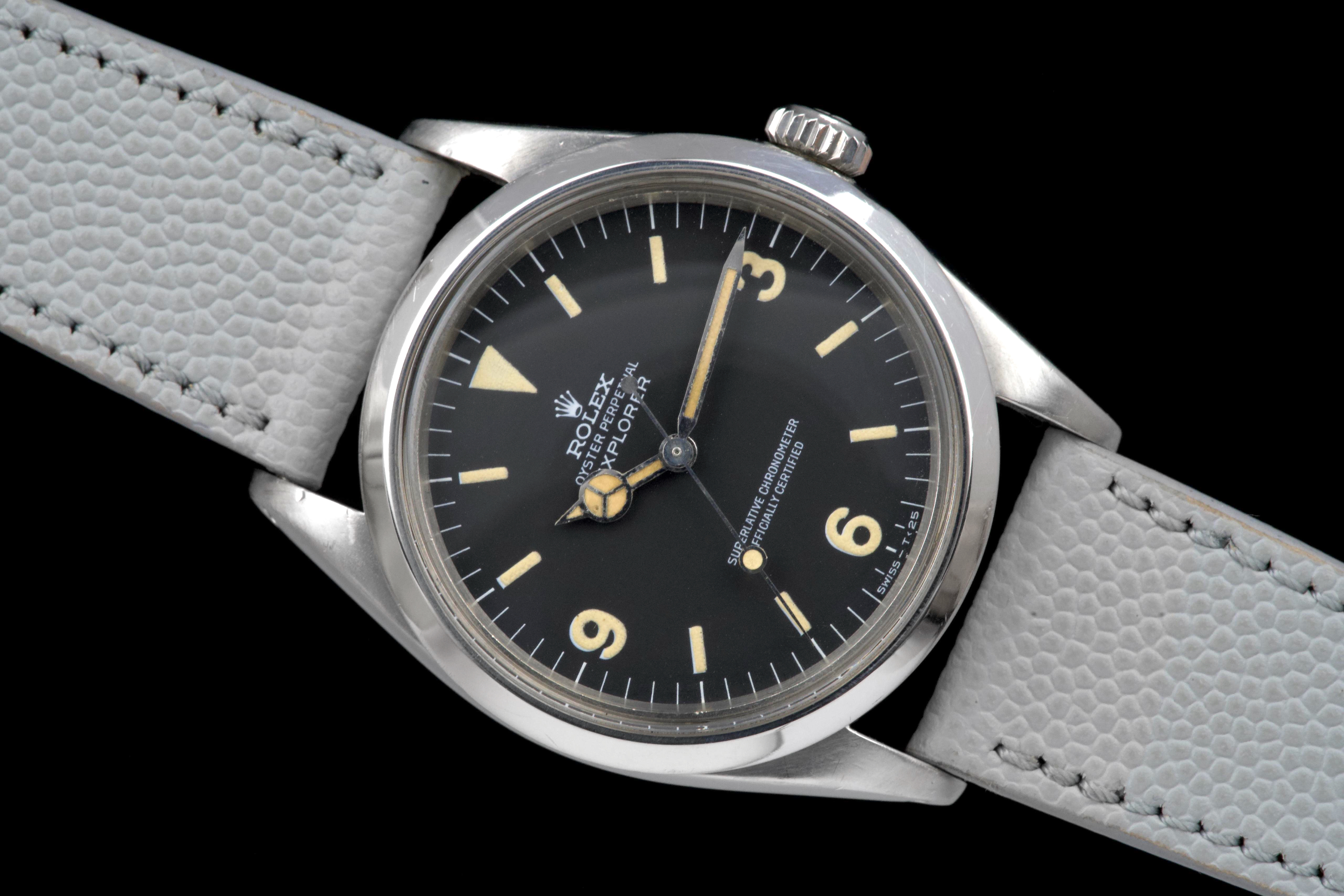 The present Rolex Explorer reference 1016 Mk I, dating to 1969 and bearing the serial number 220XXX, is a highly attractive and honest example of this iconic 36 mm tool watch, preserved with strong originality and desirable early features. The stainless-steel case has been polished in the past and shows light wear consistent with careful use, while retaining pleasing proportions and definition. The serial and reference numbers between the lugs remain crisp and well defined, and the caseback is correctly stamped “II.69,” firmly anchoring the watch within its production period. The watch is fitted with an original Mk I “Frog Foot” tritium dial, preserved in excellent condition. The luminous material on the hour markers has aged to a warm vanilla patina, giving the dial a beautifully balanced and period-correct appearance. The hands are original tritium and have aged a few shades darker than the dial, a natural and frequently observed trait that adds character without detracting from the overall harmony of the watch. Powering the watch is the Rolex calibre 1570, which has been serviced by our watchmaker and is running perfectly at the time of cataloguing. The watch is presented on a grained leather strap (non-Rolex); no steel bracelet accompanies the watch. With its desirable Mk I Frog Foot dial, correct late-1960s configuration, strong case details, and freshly serviced movement, this Explorer 1016 represents a compelling opportunity to acquire a classic Rolex sports watch that epitomizes the understated, utilitarian spirit of the model.