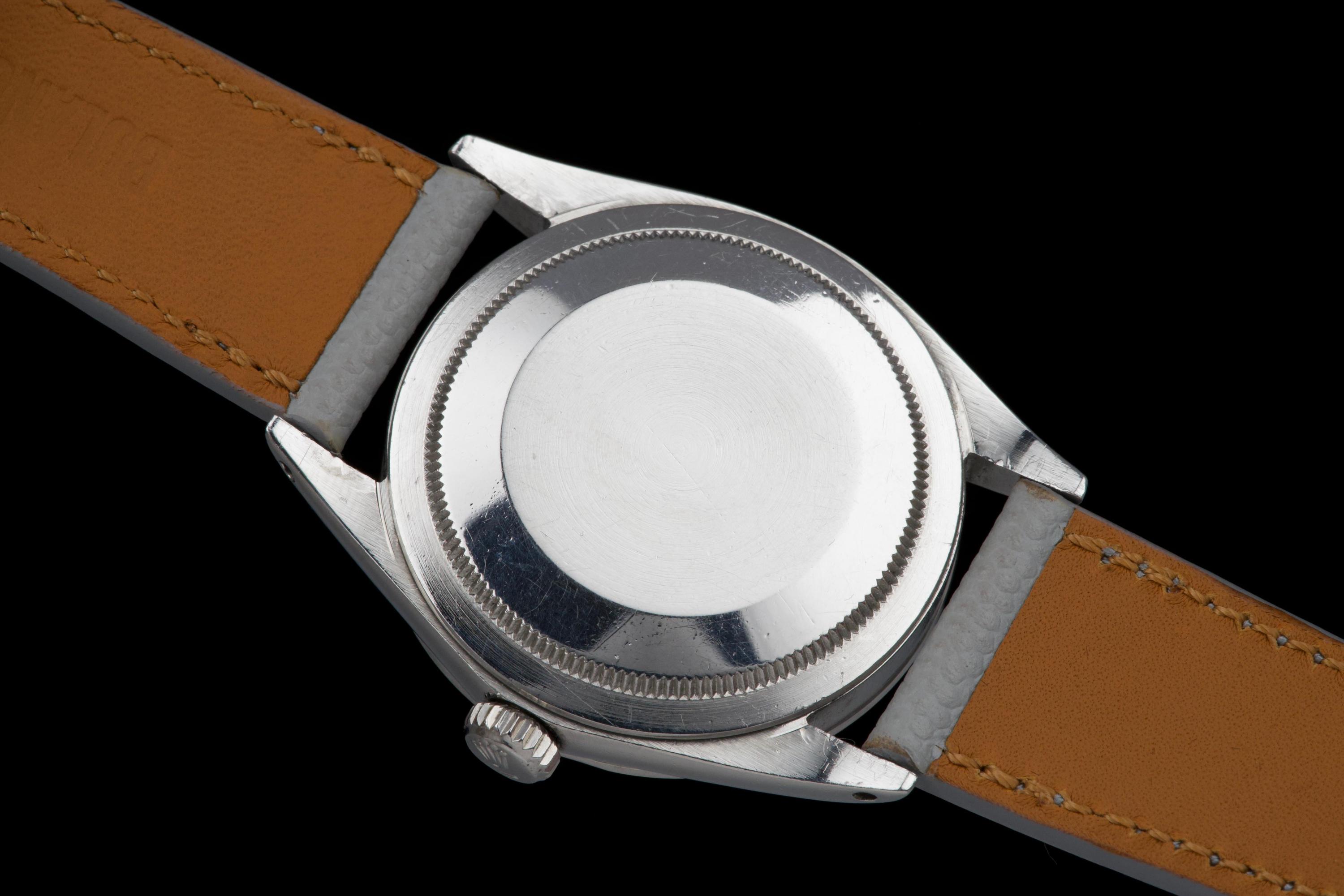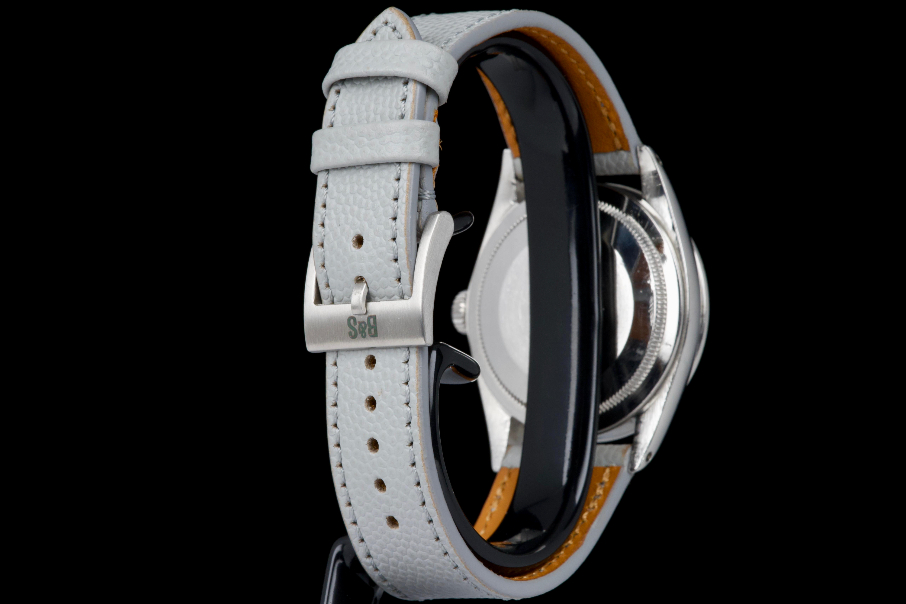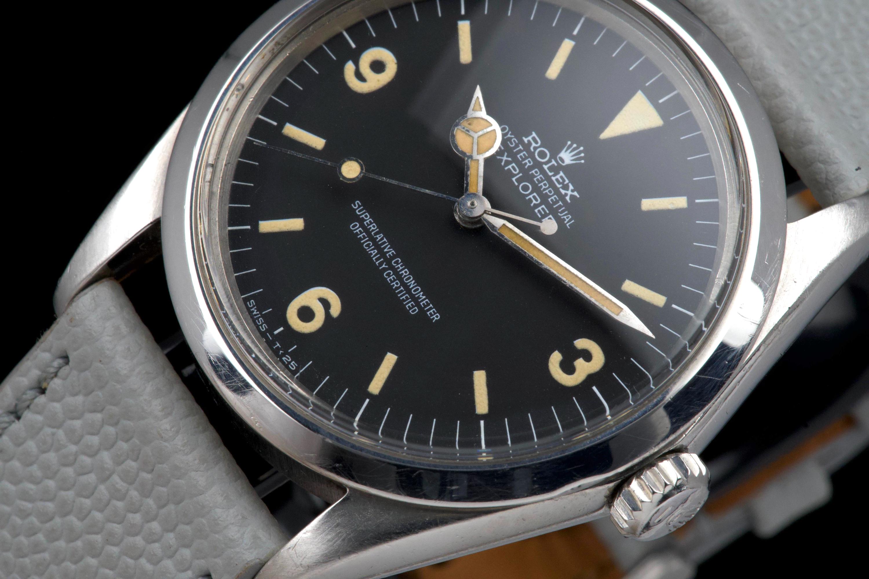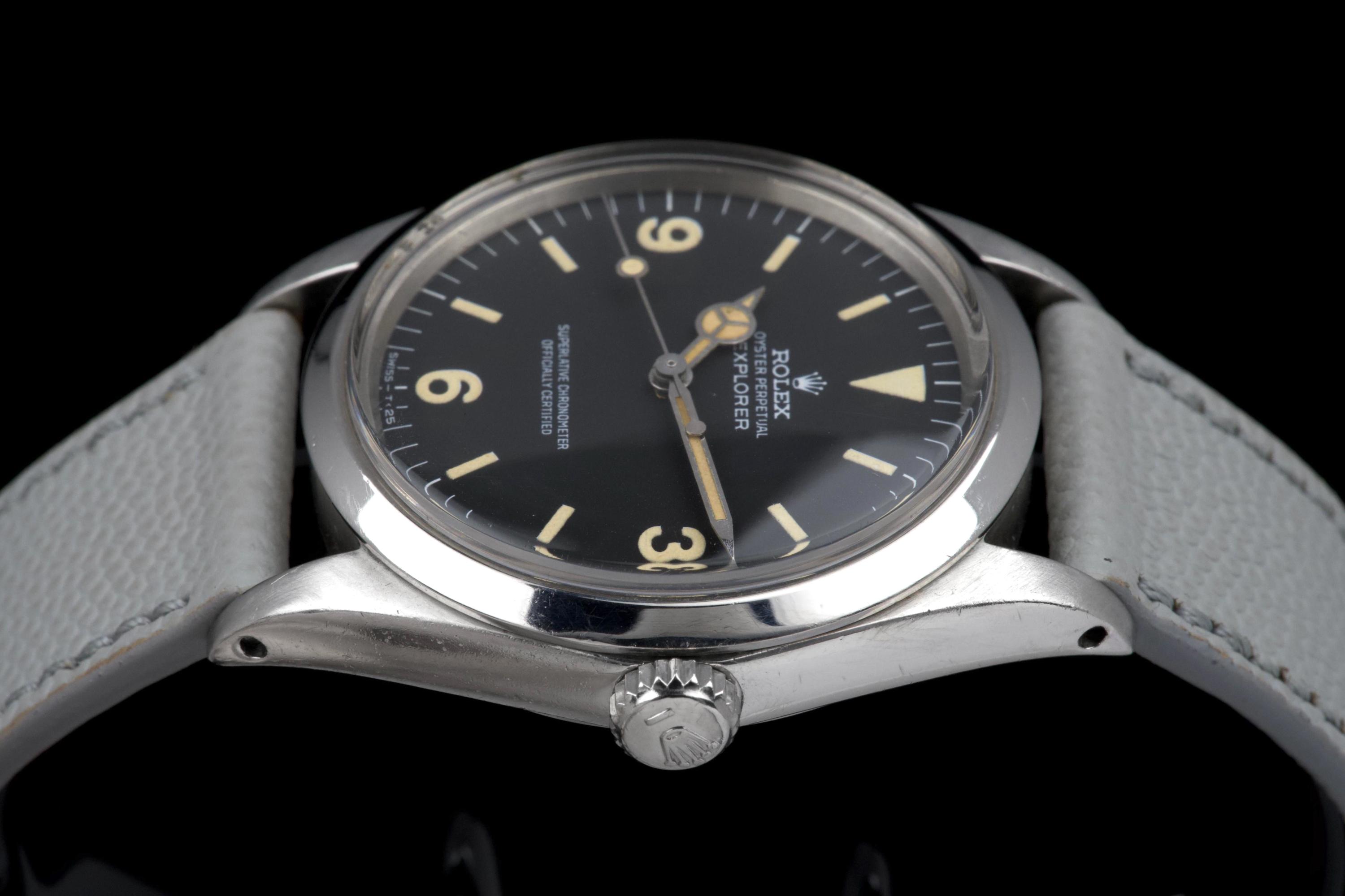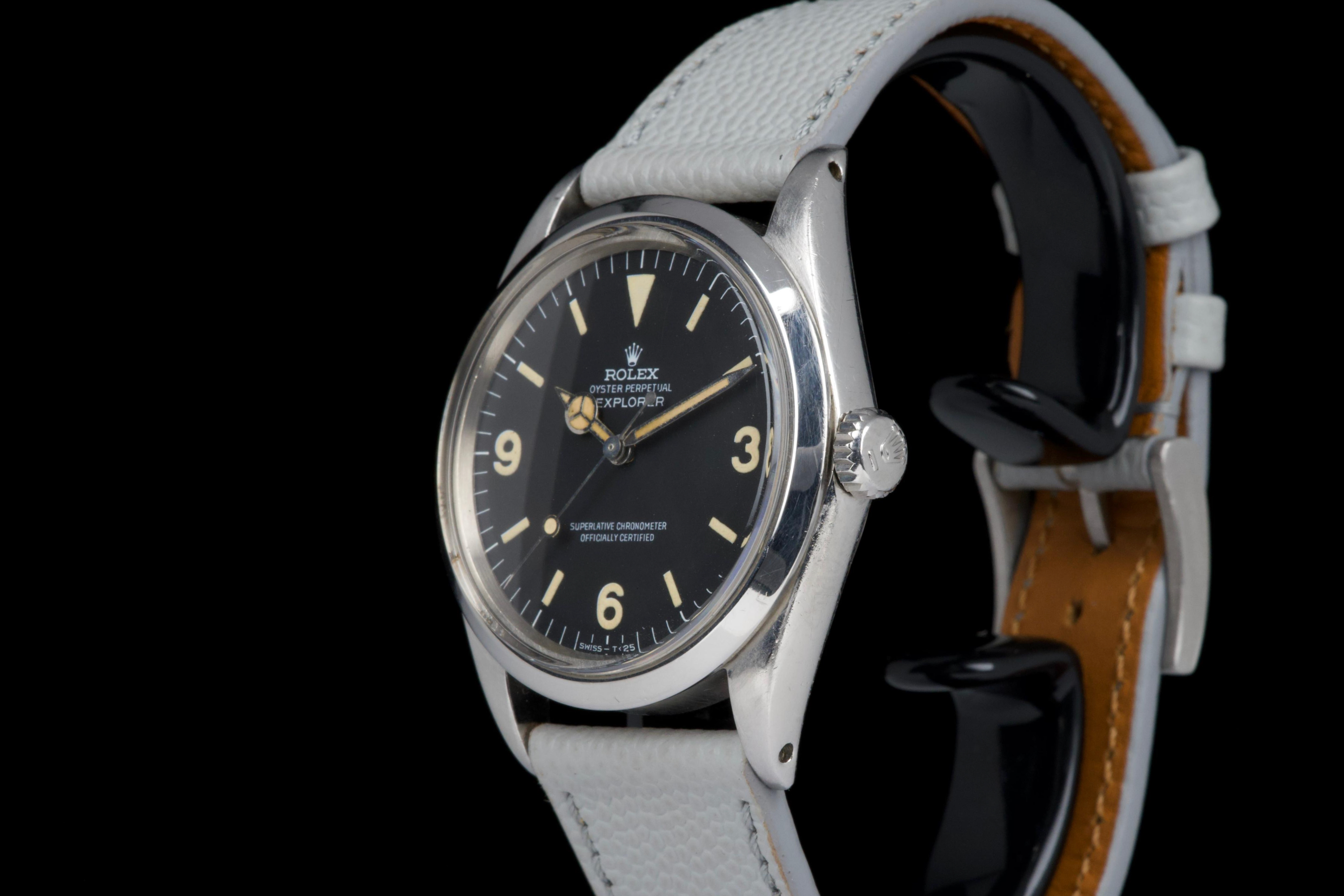 The present Rolex Explorer reference 1016 Mk I, dating to 1969 and bearing the serial number 220XXX, is a highly attractive and honest example of this iconic 36 mm tool watch, preserved with strong originality and desirable early features. The stainless-steel case has been polished in the past and shows light wear consistent with careful use, while retaining pleasing proportions and definition. The serial and reference numbers between the lugs remain crisp and well defined, and the caseback is correctly stamped “II.69,” firmly anchoring the watch within its production period. The watch is fitted with an original Mk I “Frog Foot” tritium dial, preserved in excellent condition. The luminous material on the hour markers has aged to a warm vanilla patina, giving the dial a beautifully balanced and period-correct appearance. The hands are original tritium and have aged a few shades darker than the dial, a natural and frequently observed trait that adds character without detracting from the overall harmony of the watch. Powering the watch is the Rolex calibre 1570, which has been serviced by our watchmaker and is running perfectly at the time of cataloguing. The watch is presented on a grained leather strap (non-Rolex); no steel bracelet accompanies the watch. With its desirable Mk I Frog Foot dial, correct late-1960s configuration, strong case details, and freshly serviced movement, this Explorer 1016 represents a compelling opportunity to acquire a classic Rolex sports watch that epitomizes the understated, utilitarian spirit of the model.