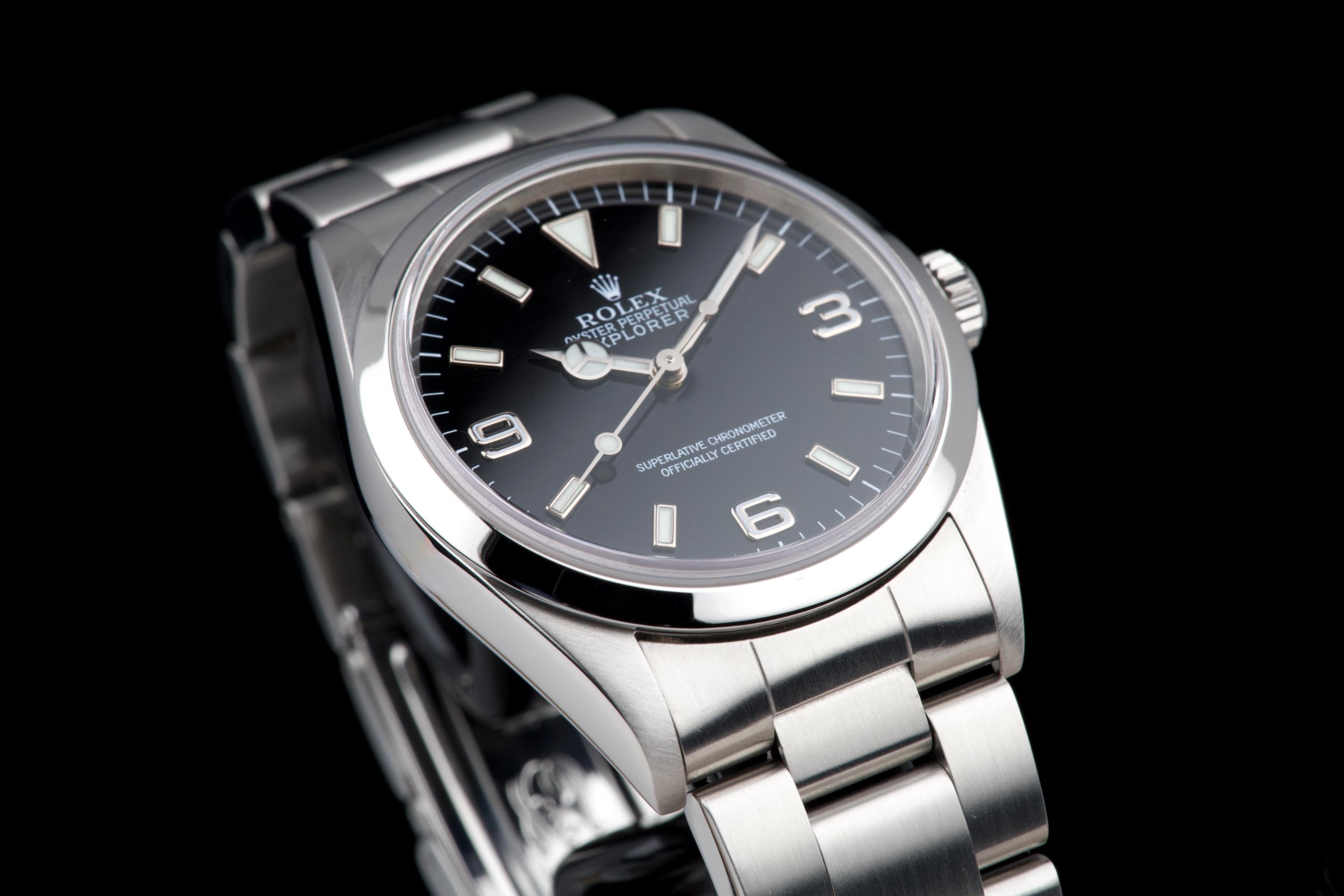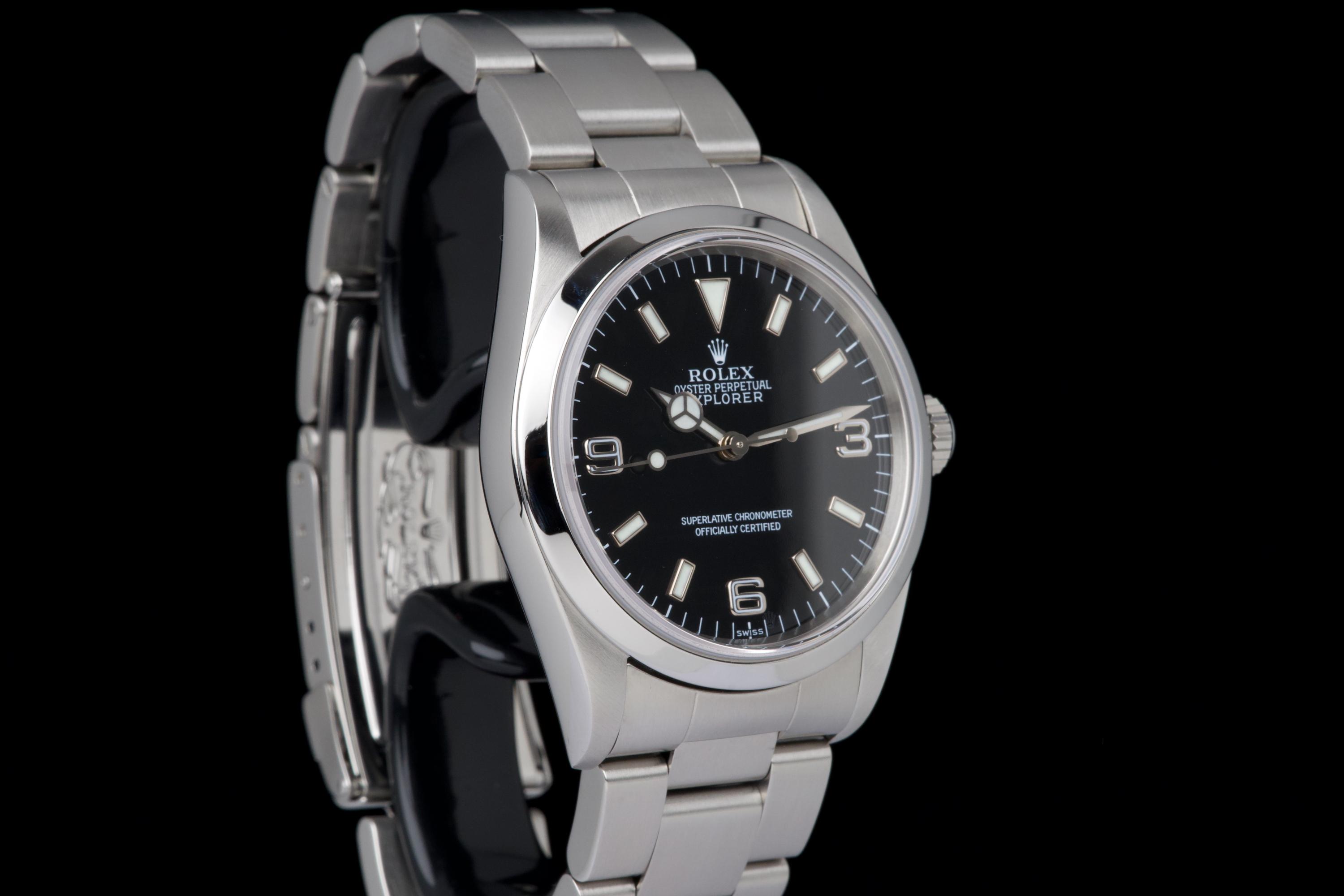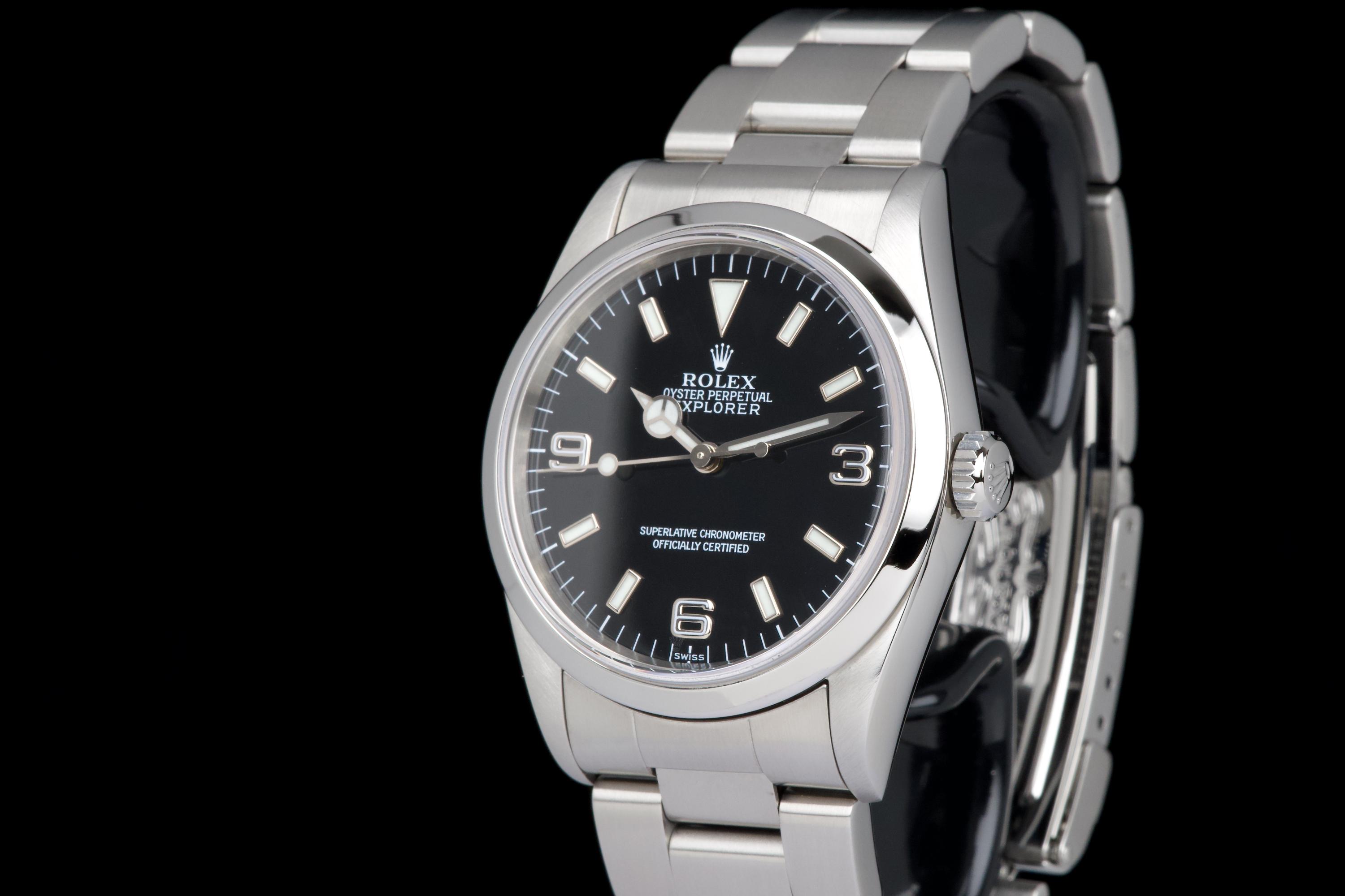 A beautiful example of the Rolex Explorer I reference 14270, featuring the rare transitional “Swiss Only” luminova dial, produced for a very short period in the late 1990s. Originally sold in 1999, this watch no longer retains its original box and papers but was officially sold by Bucherer as a Certified Pre-Owned (CPO) piece in 2021. It therefore comes with the Bucherer leather presentation box and Bucherer CPO international warranty card. The stainless steel case has been polished in the past and remains in perfect condition, with crisp lines and minimal wear. The black “Swiss Only” dial and matching luminova hands are flawless, displaying strong contrast and perfect printing. The original Oyster bracelet reference 78790 with 558B endlinks is in excellent condition, showing minimal stretch, claspcode X11. The automatic movement has been fully checked by our watchmaker and is running perfectly. A superb example of the transitional Explorer 14270 “Swiss Only,” combining perfect aesthetics, originality, and recent Bucherer CPO provenance — one of the most collectible configurations of the late 1990s Explorer I.