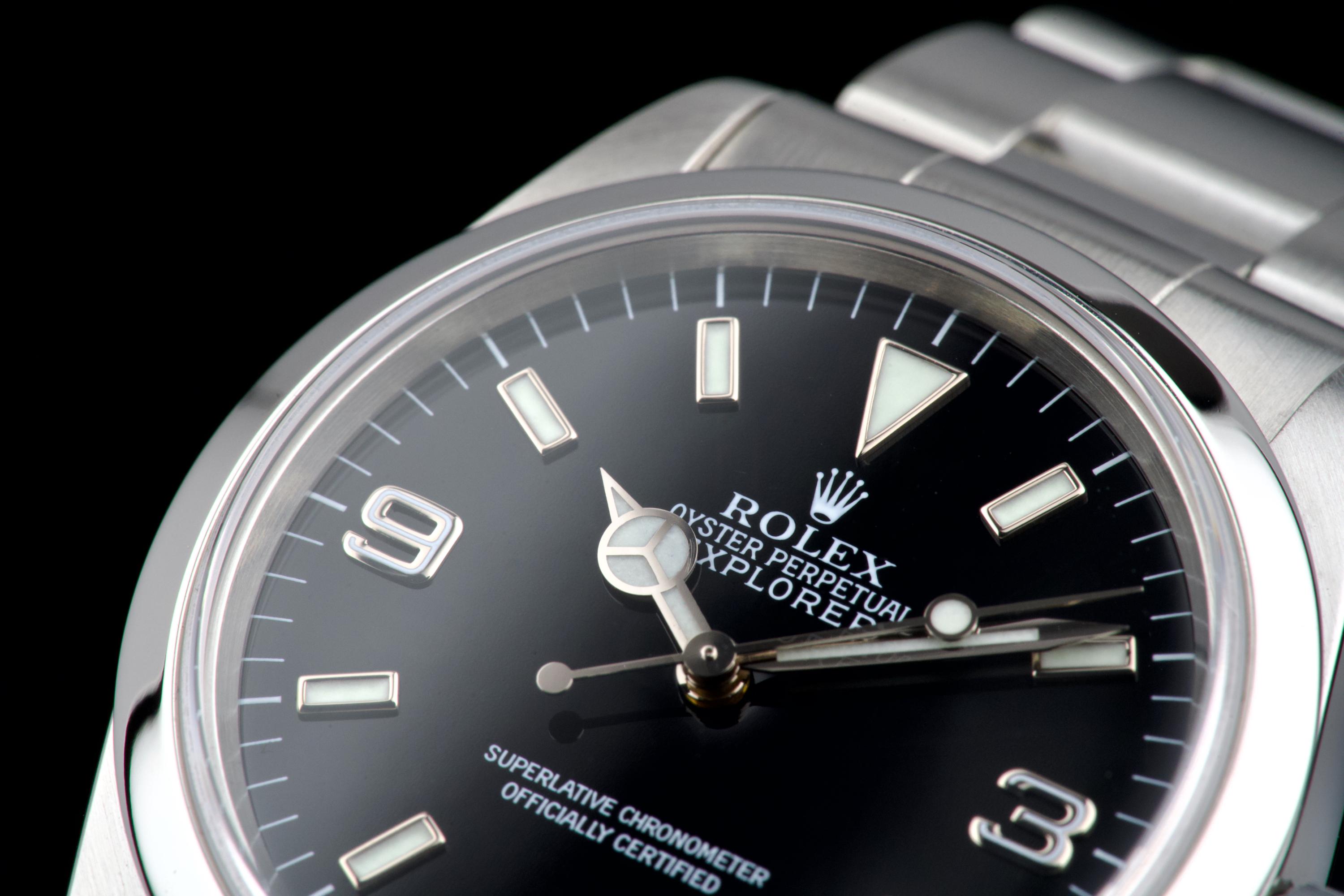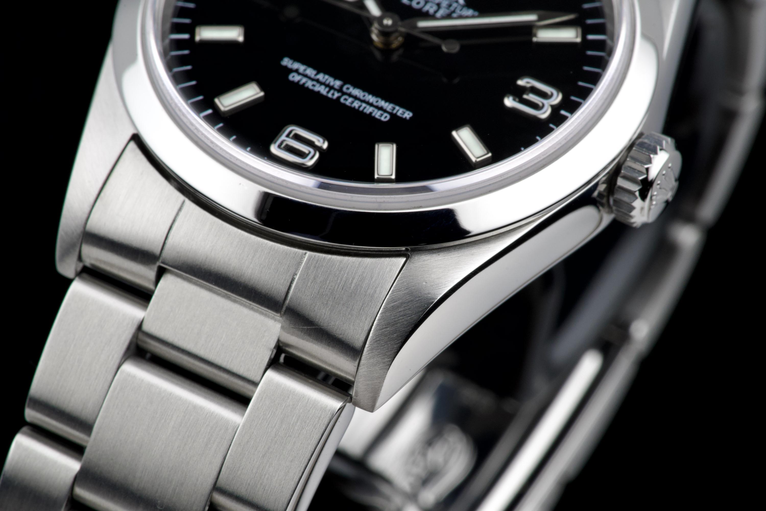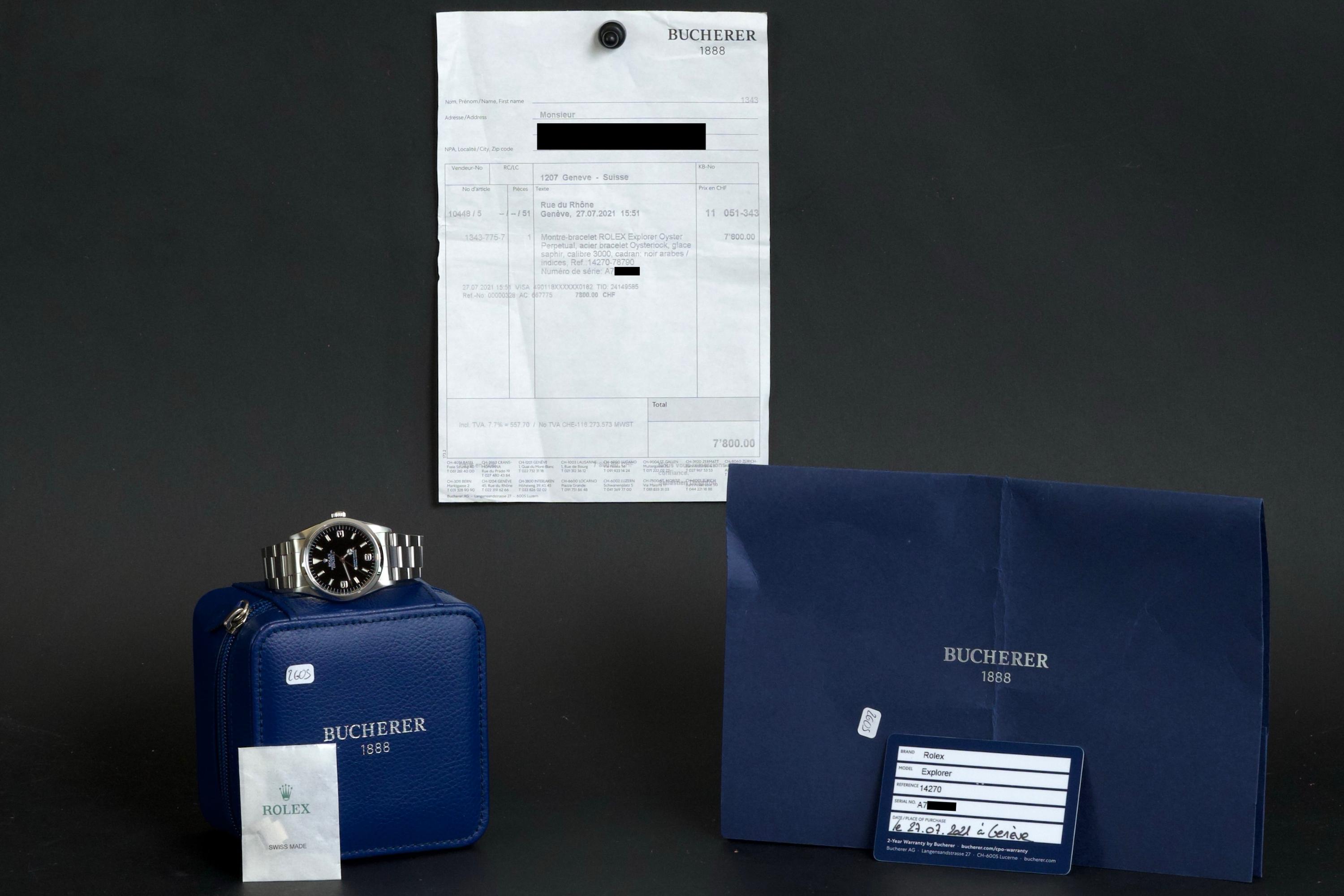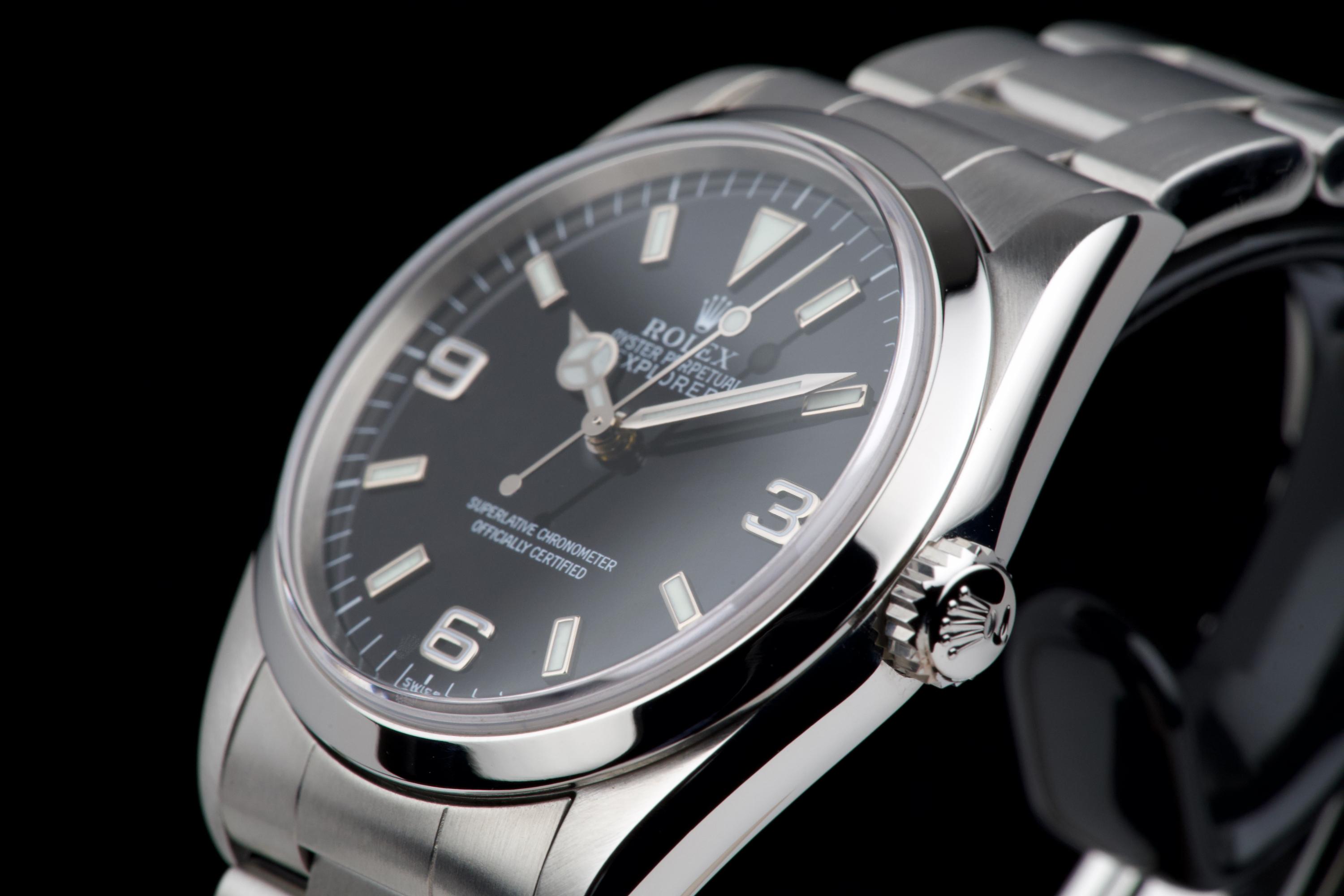 A beautiful example of the Rolex Explorer I reference 14270, featuring the rare transitional “Swiss Only” luminova dial, produced for a very short period in the late 1990s. Originally sold in 1999, this watch no longer retains its original box and papers but was officially sold by Bucherer as a Certified Pre-Owned (CPO) piece in 2021. It therefore comes with the Bucherer leather presentation box and Bucherer CPO international warranty card. The stainless steel case has been polished in the past and remains in perfect condition, with crisp lines and minimal wear. The black “Swiss Only” dial and matching luminova hands are flawless, displaying strong contrast and perfect printing. The original Oyster bracelet reference 78790 with 558B endlinks is in excellent condition, showing minimal stretch, claspcode X11. The automatic movement has been fully checked by our watchmaker and is running perfectly. A superb example of the transitional Explorer 14270 “Swiss Only,” combining perfect aesthetics, originality, and recent Bucherer CPO provenance — one of the most collectible configurations of the late 1990s Explorer I.