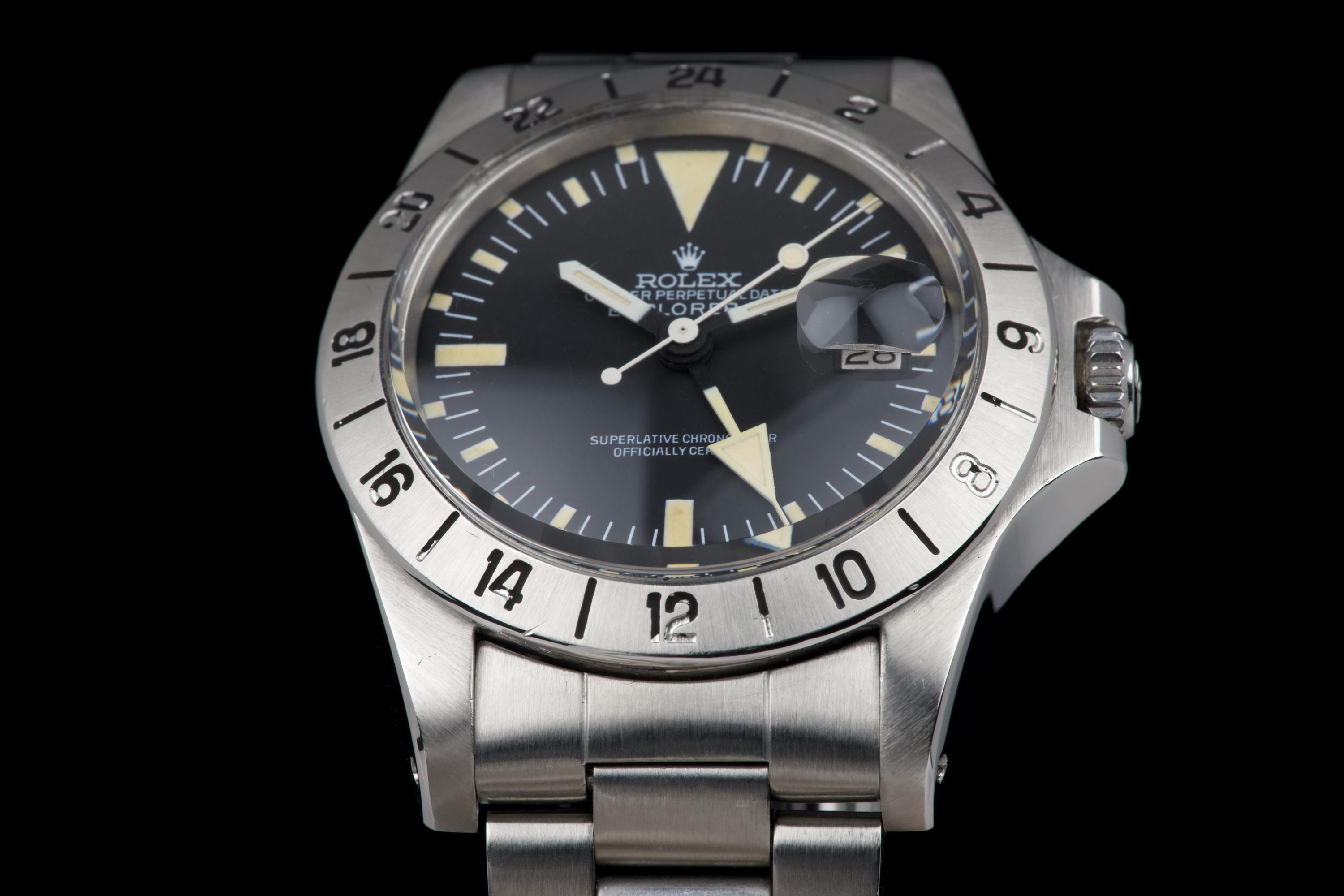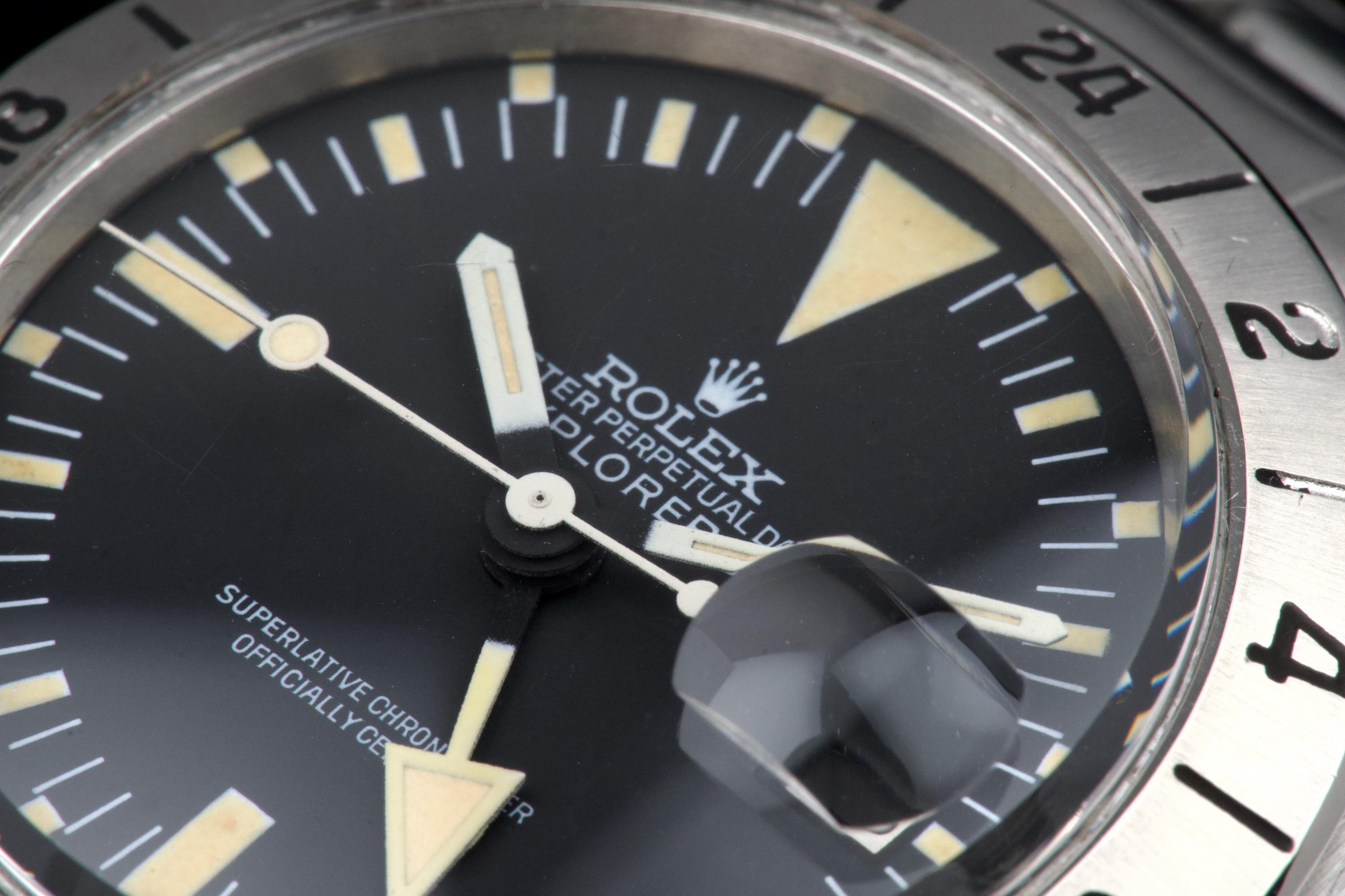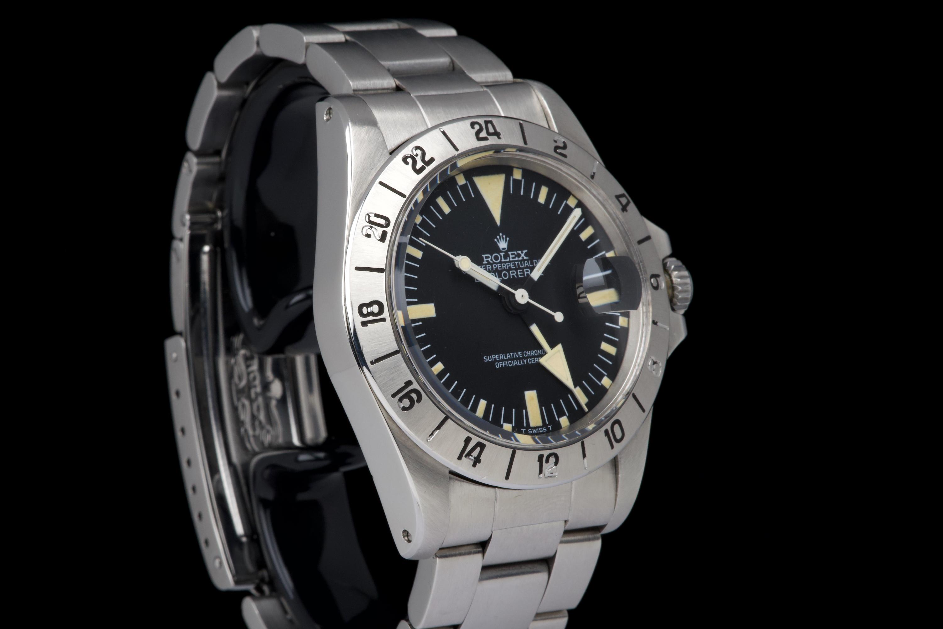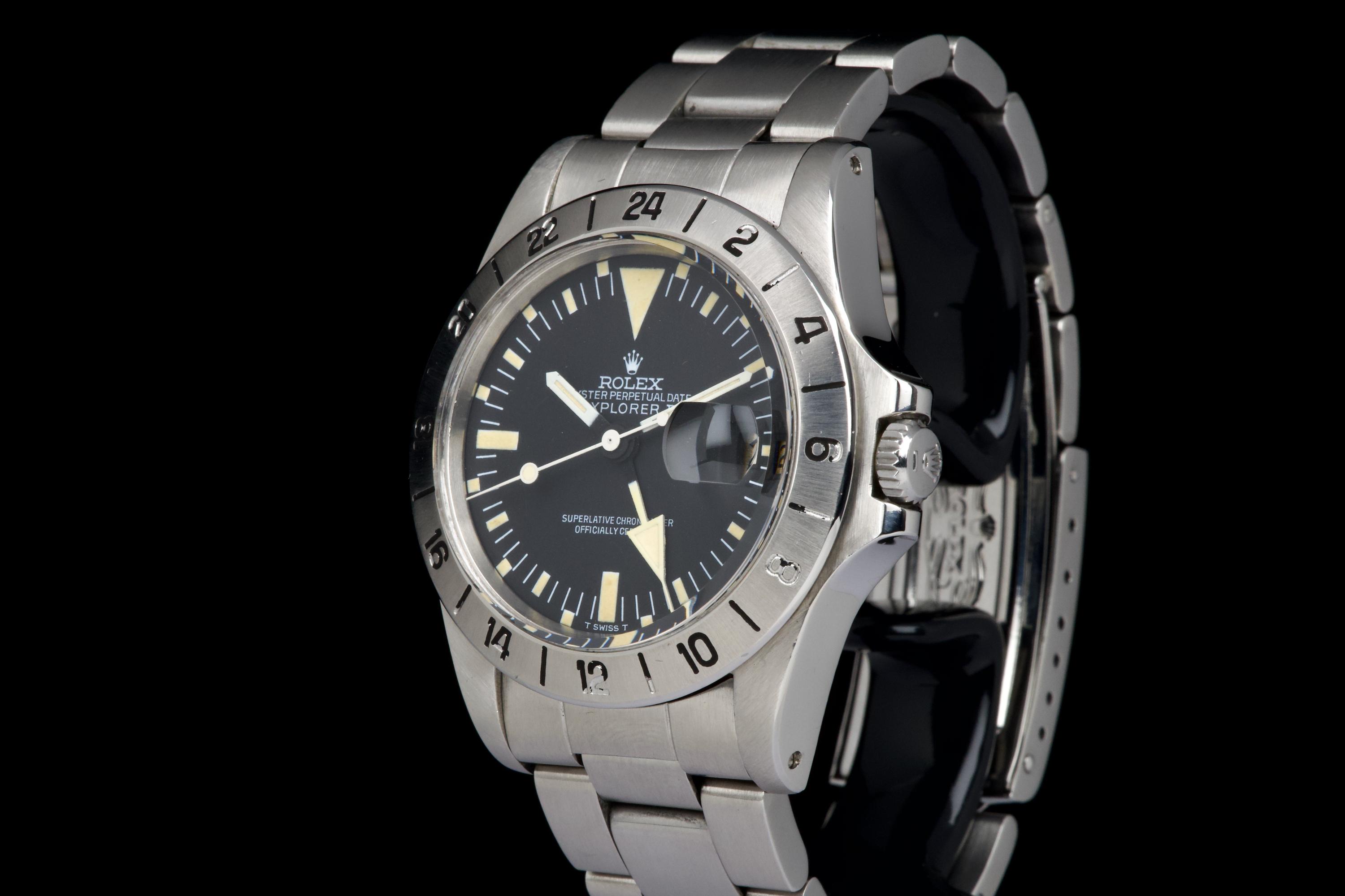 The present Rolex Explorer II reference 1655 “Albino” Mk II is an exceptionally attractive and well-preserved example of one of Rolex’s most charismatic tool watches. Produced in 1974 and sold in 1981, this watch is offered here as a complete full set, an increasingly rare level of completeness for this reference. The stainless-steel case has just returned from polishing and presents in excellent overall condition, retaining strong proportions and a crisp profile. The watch is fitted with its original Mk II matte dial, preserved in outstanding condition and displaying a beautiful, even patina, perfectly matched by the hands. The defining feature of this example is the original white “Albino” Explorer hand, a highly distinctive and sought-after characteristic of early Explorer II references. The original Mk II fixed steel bezel remains in excellent condition overall, with the black engraved numerals showing light wear and minor fading in places, entirely consistent with age and careful use. The watch is fitted with its original Oyster bracelet reference 78360 with 580 endlinks. The bracelet remains in excellent condition and shows only light stretch from use, consistent with careful wear. The clasp bears the code “VB.” Mechanically, the watch is in perfect working condition at the time of cataloguing, although no service history accompanies the watch. Delivered with a highly complete and desirable set of accessories, the watch includes its original box, outer packaging, original leather document holder, period booklets, and original punched warranty papers issued in Venezuela. Combining early production, a correct and attractive Mk II configuration, the sought-after “Albino” Explorer hand, excellent overall condition, and outstanding completeness, this Explorer II 1655 represents a compelling opportunity to acquire a landmark Rolex tool watch with exceptional character and provenance.
