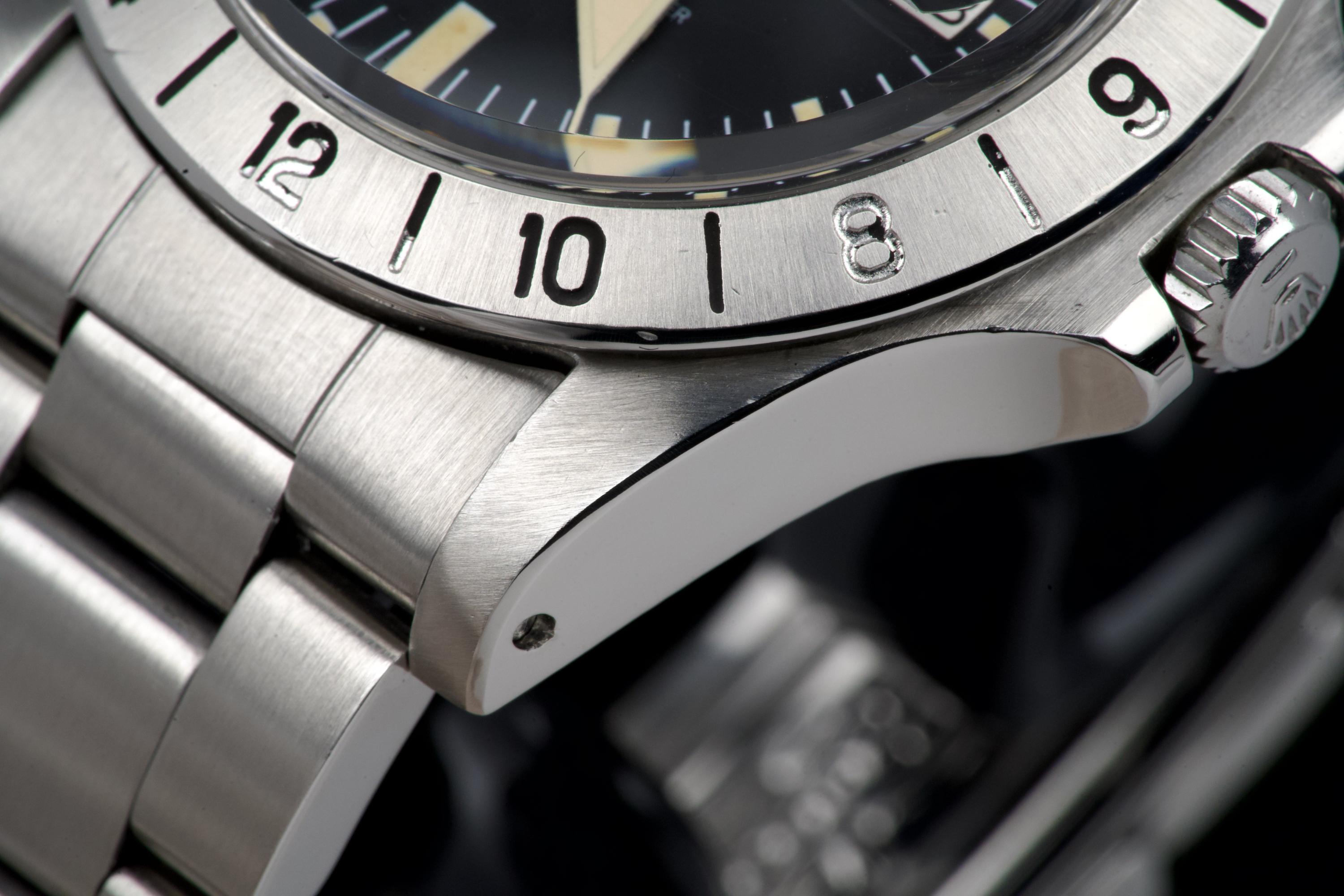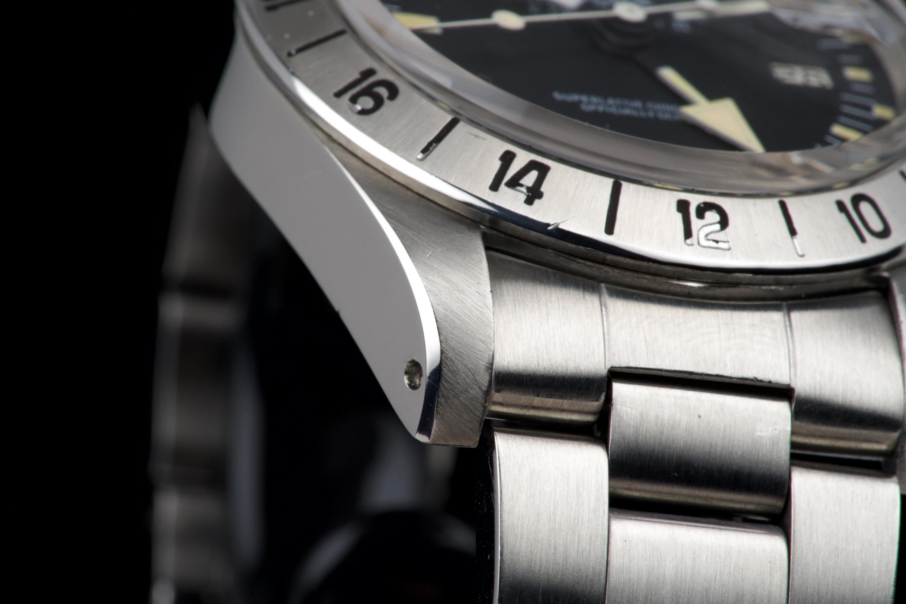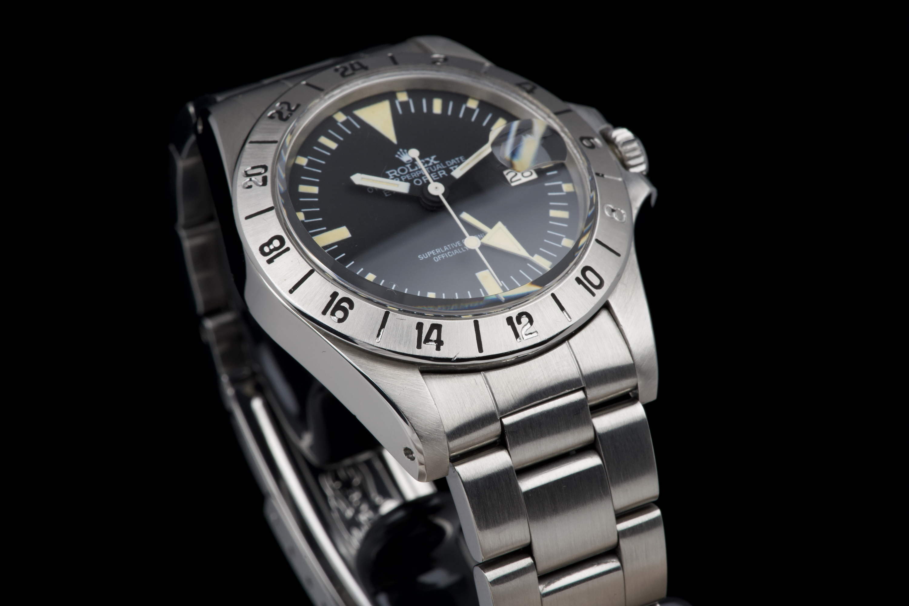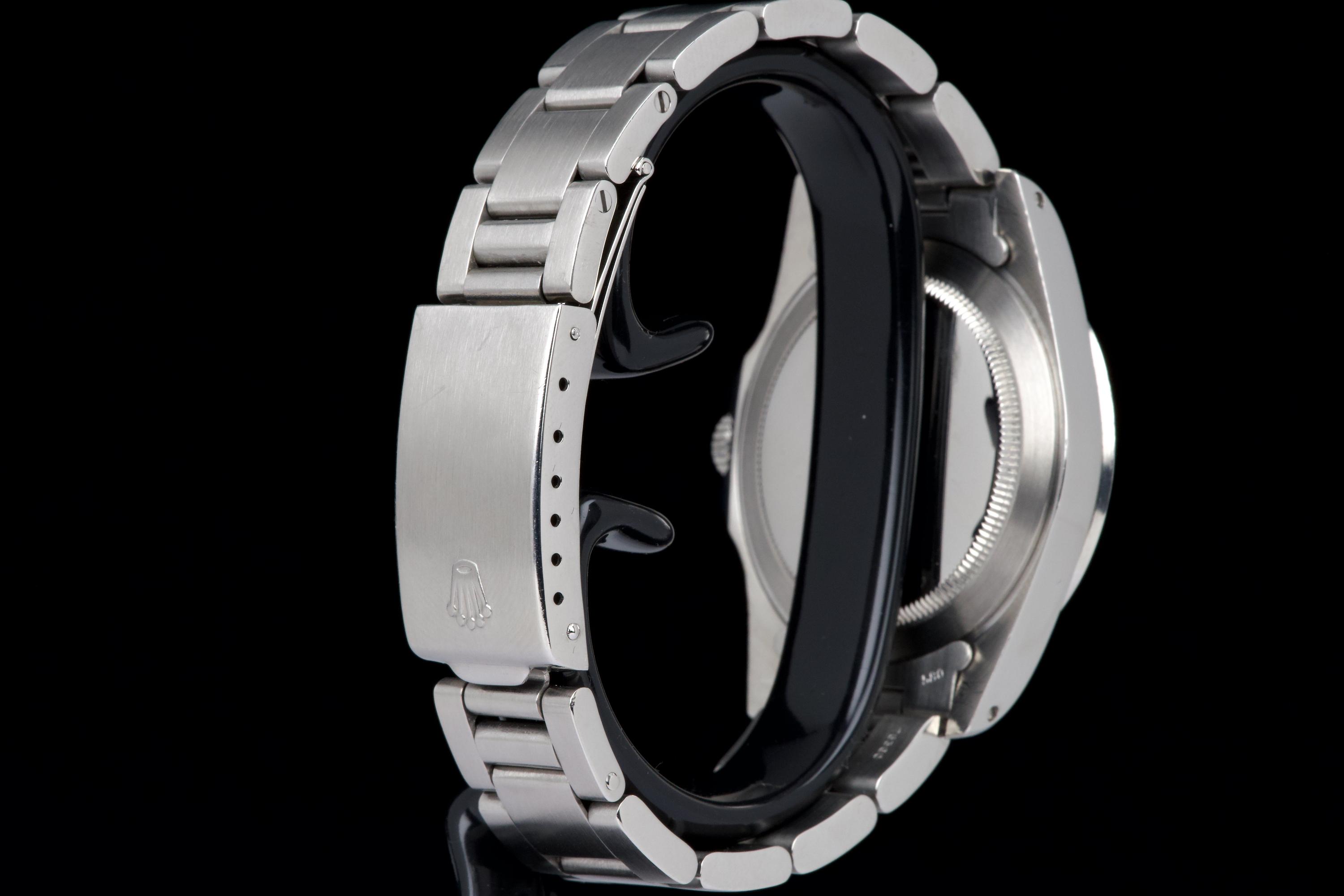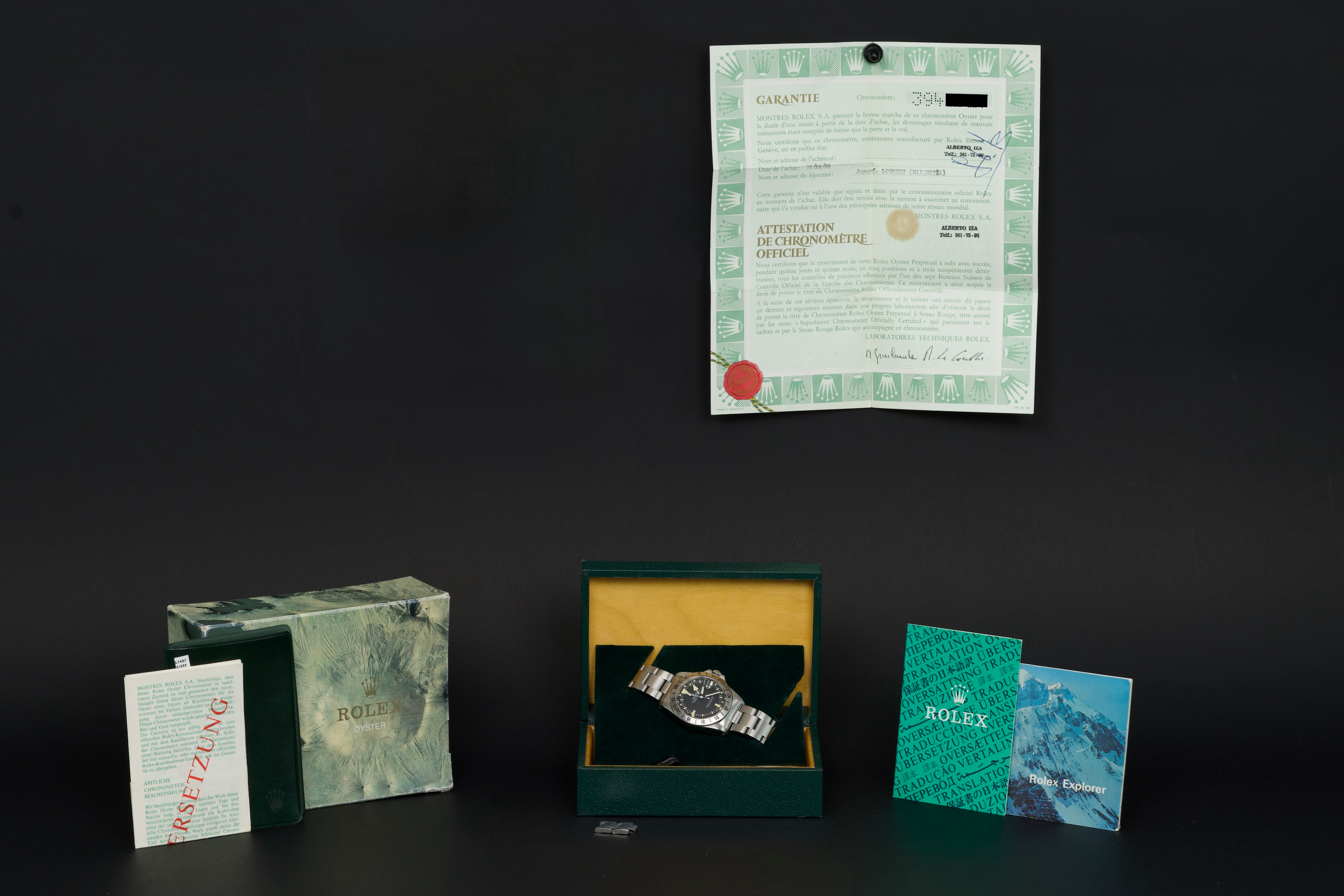 The present Rolex Explorer II reference 1655 “Albino” Mk II is an exceptionally attractive and well-preserved example of one of Rolex’s most charismatic tool watches. Produced in 1974 and sold in 1981, this watch is offered here as a complete full set, an increasingly rare level of completeness for this reference. The stainless-steel case has just returned from polishing and presents in excellent overall condition, retaining strong proportions and a crisp profile. The watch is fitted with its original Mk II matte dial, preserved in outstanding condition and displaying a beautiful, even patina, perfectly matched by the hands. The defining feature of this example is the original white “Albino” Explorer hand, a highly distinctive and sought-after characteristic of early Explorer II references. The original Mk II fixed steel bezel remains in excellent condition overall, with the black engraved numerals showing light wear and minor fading in places, entirely consistent with age and careful use. The watch is fitted with its original Oyster bracelet reference 78360 with 580 endlinks. The bracelet remains in excellent condition and shows only light stretch from use, consistent with careful wear. The clasp bears the code “VB.” Mechanically, the watch is in perfect working condition at the time of cataloguing, although no service history accompanies the watch. Delivered with a highly complete and desirable set of accessories, the watch includes its original box, outer packaging, original leather document holder, period booklets, and original punched warranty papers issued in Venezuela. Combining early production, a correct and attractive Mk II configuration, the sought-after “Albino” Explorer hand, excellent overall condition, and outstanding completeness, this Explorer II 1655 represents a compelling opportunity to acquire a landmark Rolex tool watch with exceptional character and provenance.